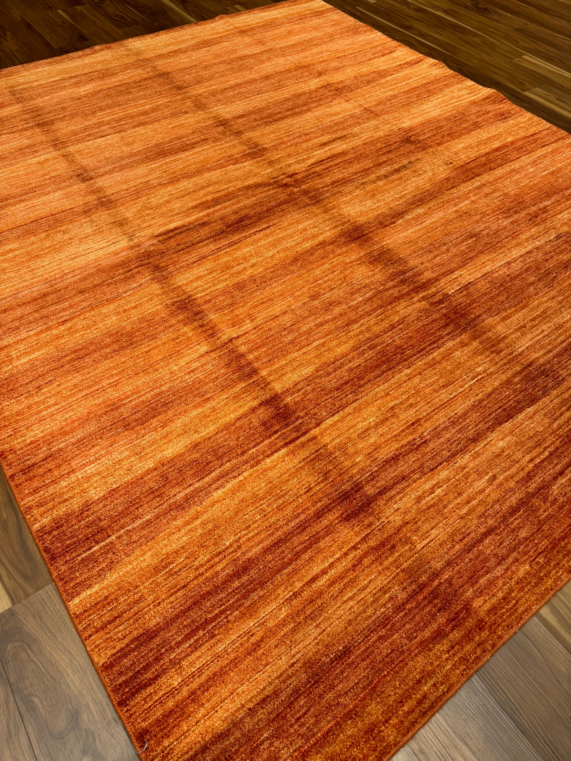 This Modern Linear Pattern rug is a perfect blend of contemporary design and traditional craftsmanship. Made from the finest wool, it features a subtle linear pattern with varying shades of rust and burnt orange that create a warm, inviting atmosphere. The plush texture and durable material make it ideal for any room seeking a touch of modern elegance. Its minimalistic pattern allows it to complement a variety of decors without overwhelming them.