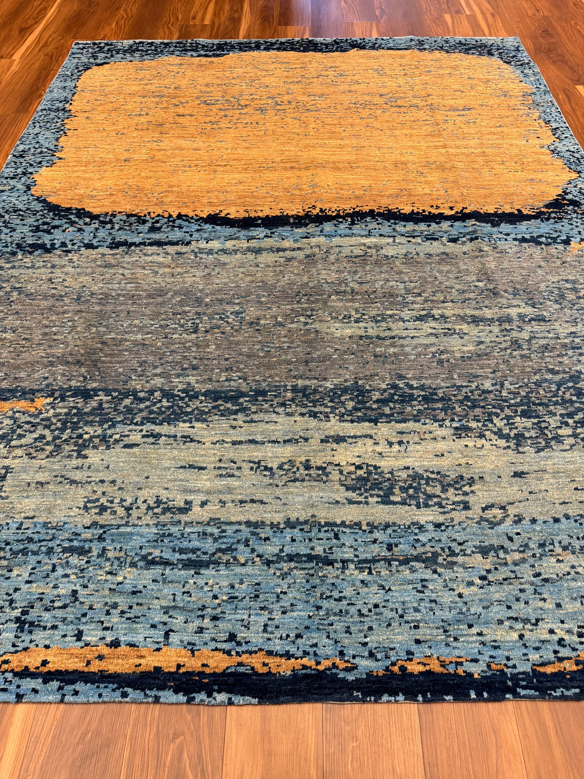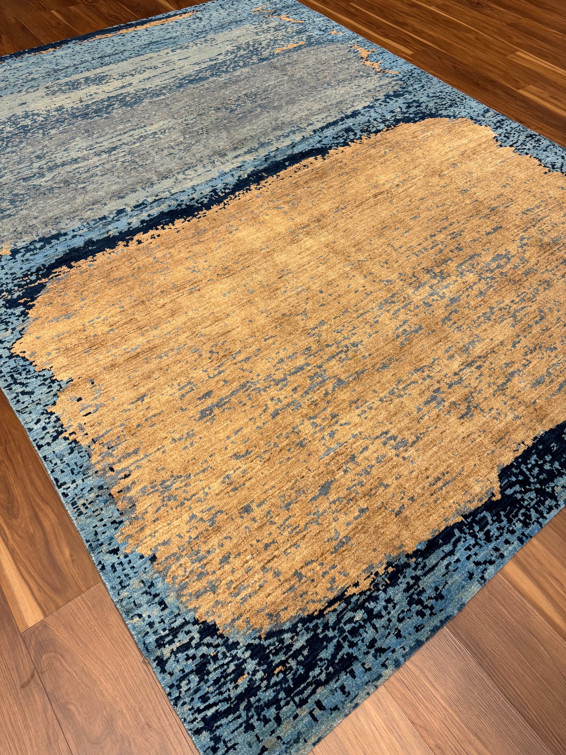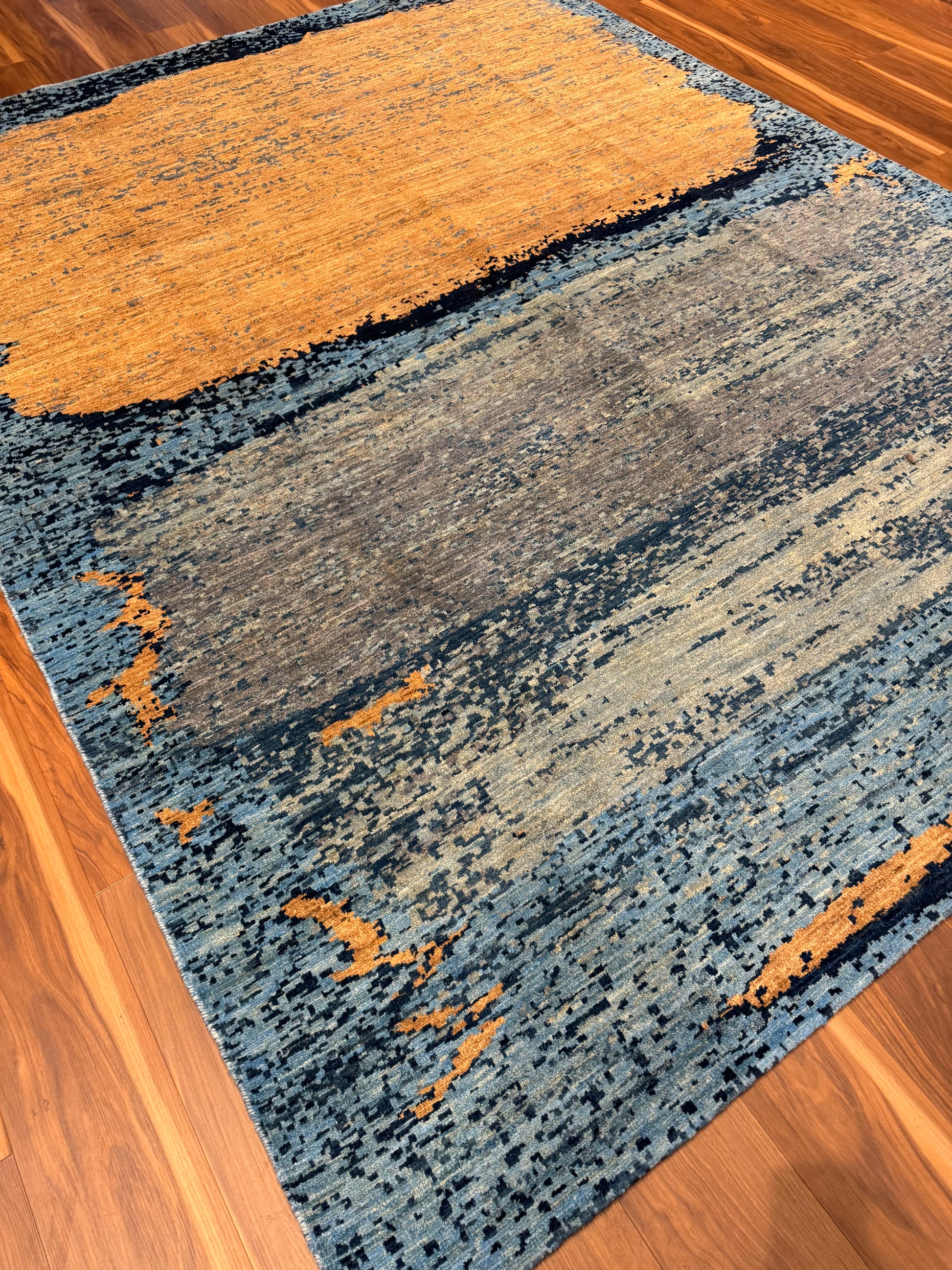 This exquisite Modern Abstract rug boasts a sophisticated design that marries minimalist appeal with a hint of rustic charm. Crafted from high-quality wool, the rug features a compelling abstract motif with worn texture effects, creating an illusion of depth and movement. The contrast between the vibrant orange center and the tranquil blue borders produces a striking visual balance, perfect for a contemporary living space looking to make a statement. This rug promises to be a durable and comfortable addition to any room.