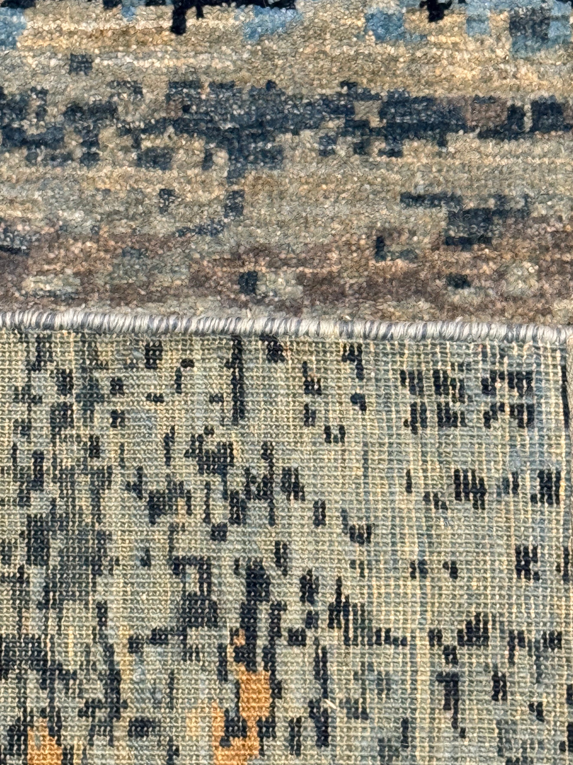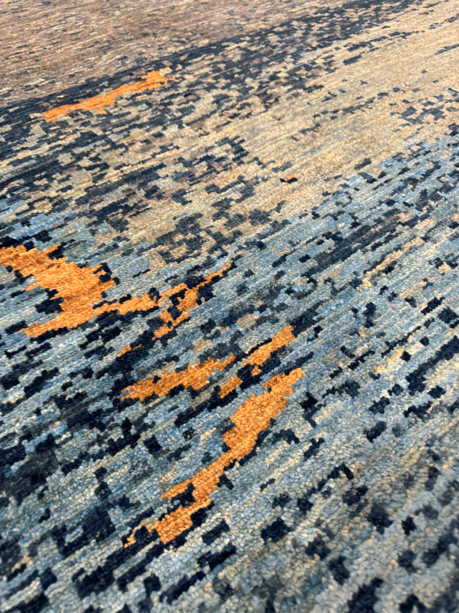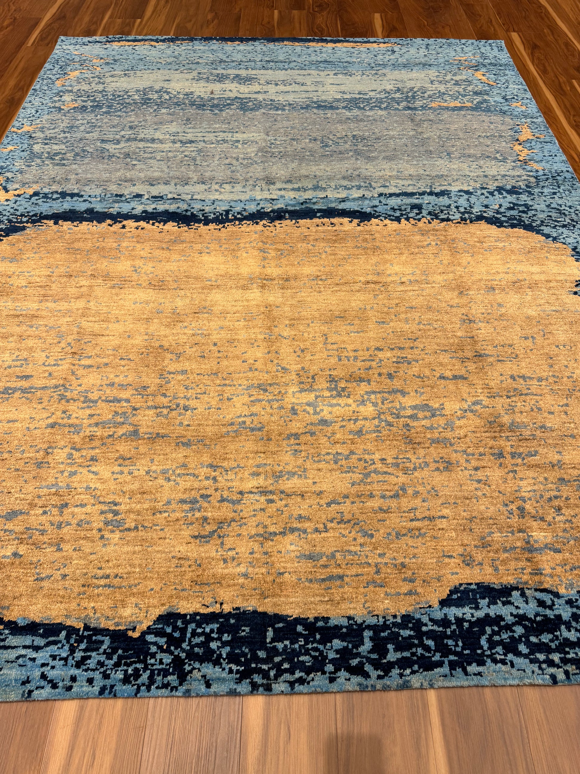 This exquisite Modern Abstract rug boasts a sophisticated design that marries minimalist appeal with a hint of rustic charm. Crafted from high-quality wool, the rug features a compelling abstract motif with worn texture effects, creating an illusion of depth and movement. The contrast between the vibrant orange center and the tranquil blue borders produces a striking visual balance, perfect for a contemporary living space looking to make a statement. This rug promises to be a durable and comfortable addition to any room.