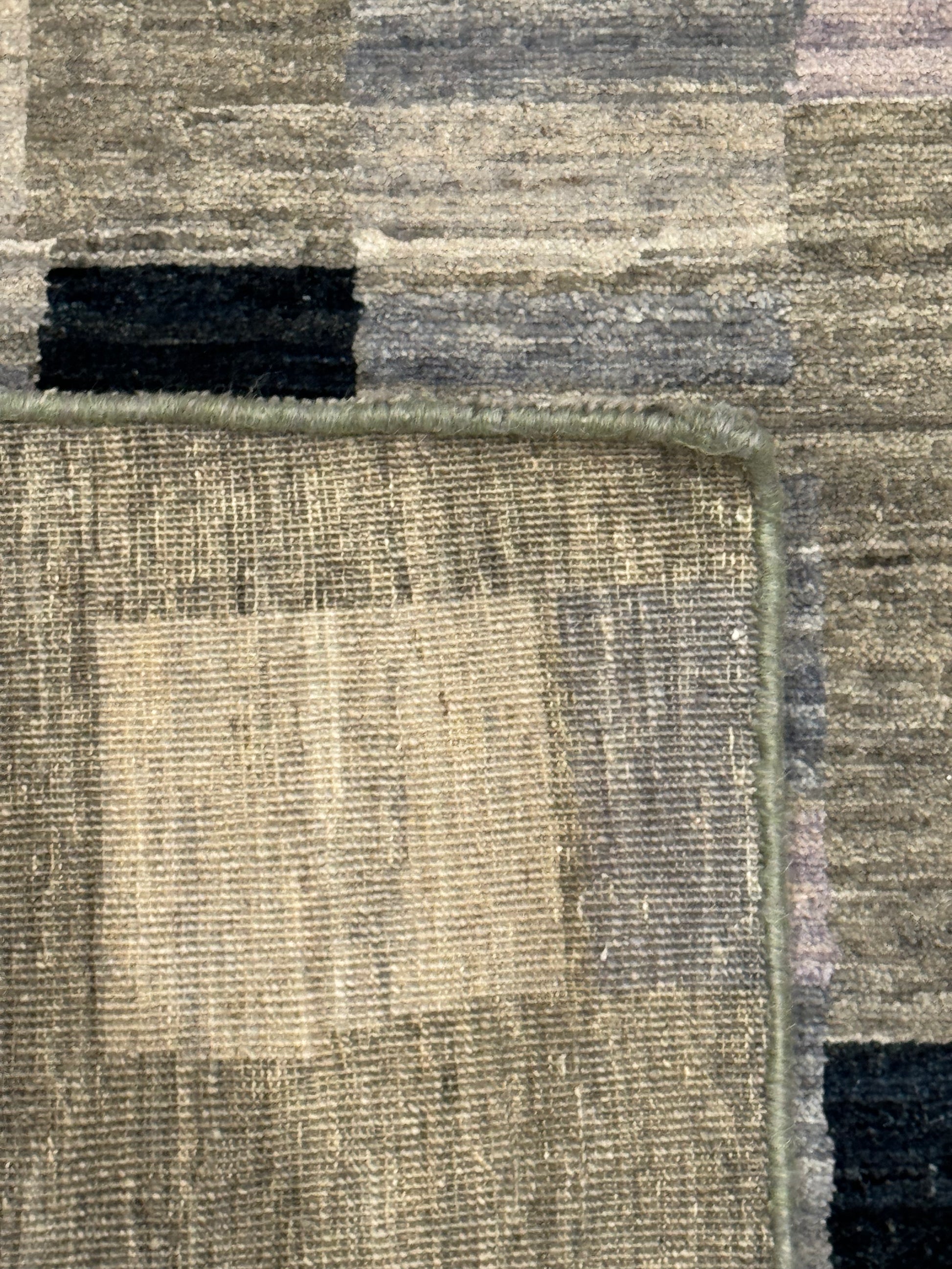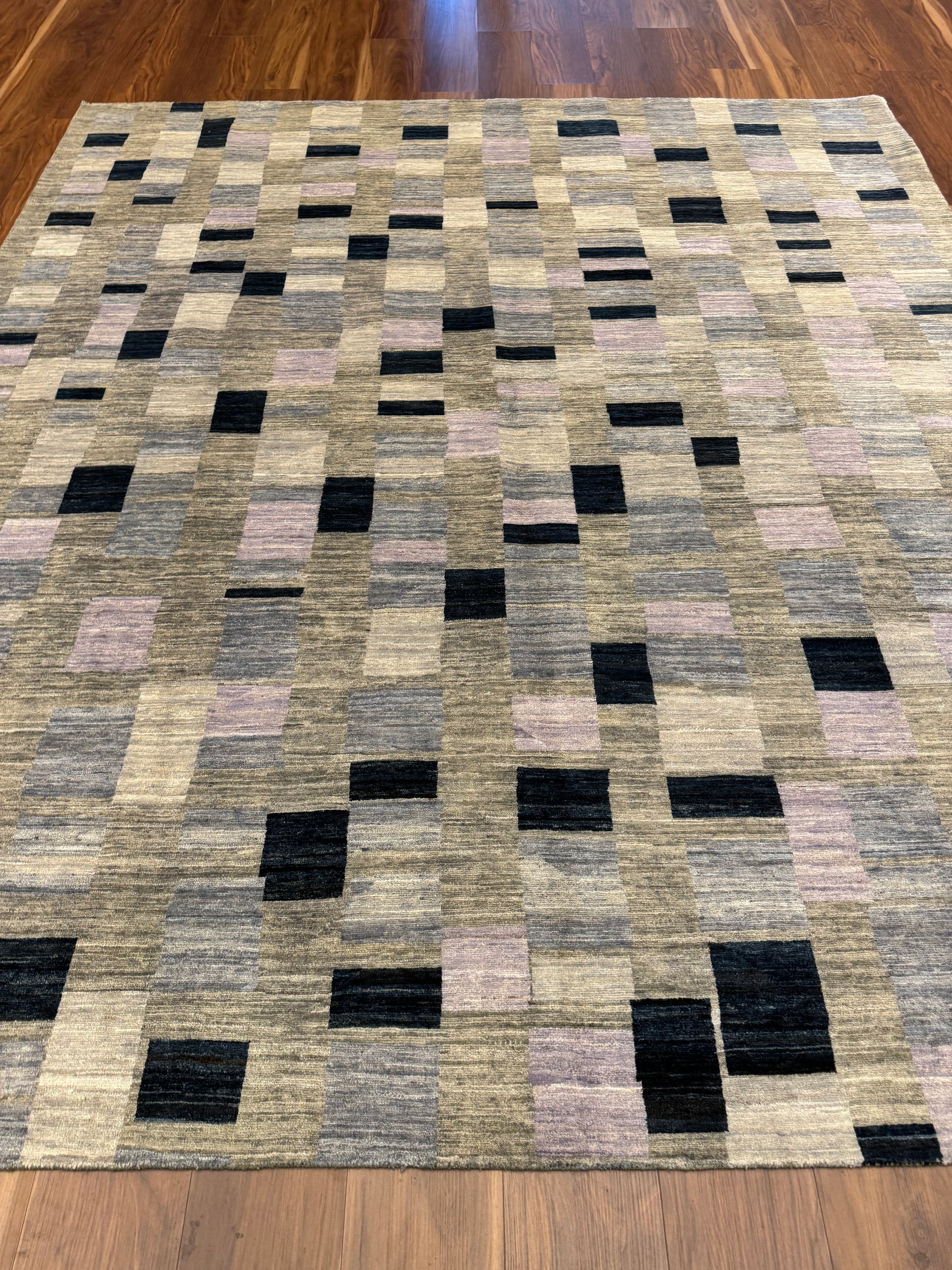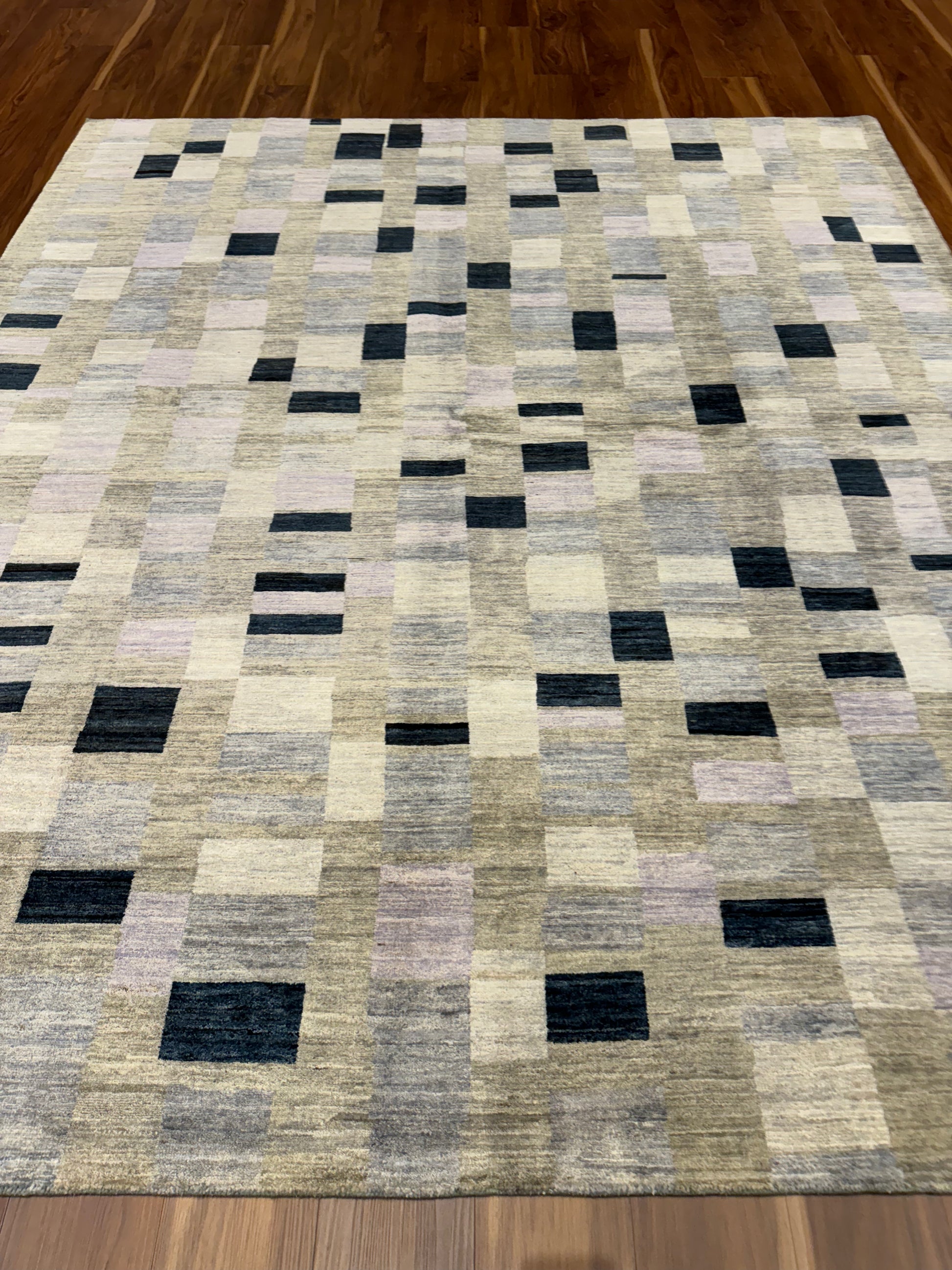 This 'Modern Squares' rug boasts a sophisticated geometric pattern, featuring an array of squares in varying shades of beige and taupe, sharply contrasted by distinct black accents. Ideal for contemporary interiors, this piece is handcrafted from high-quality wool, offering both comfort and durability. The rug's subtle color palette and minimalist design promote a sense of calm and elegance, making it a versatile addition to any living space.