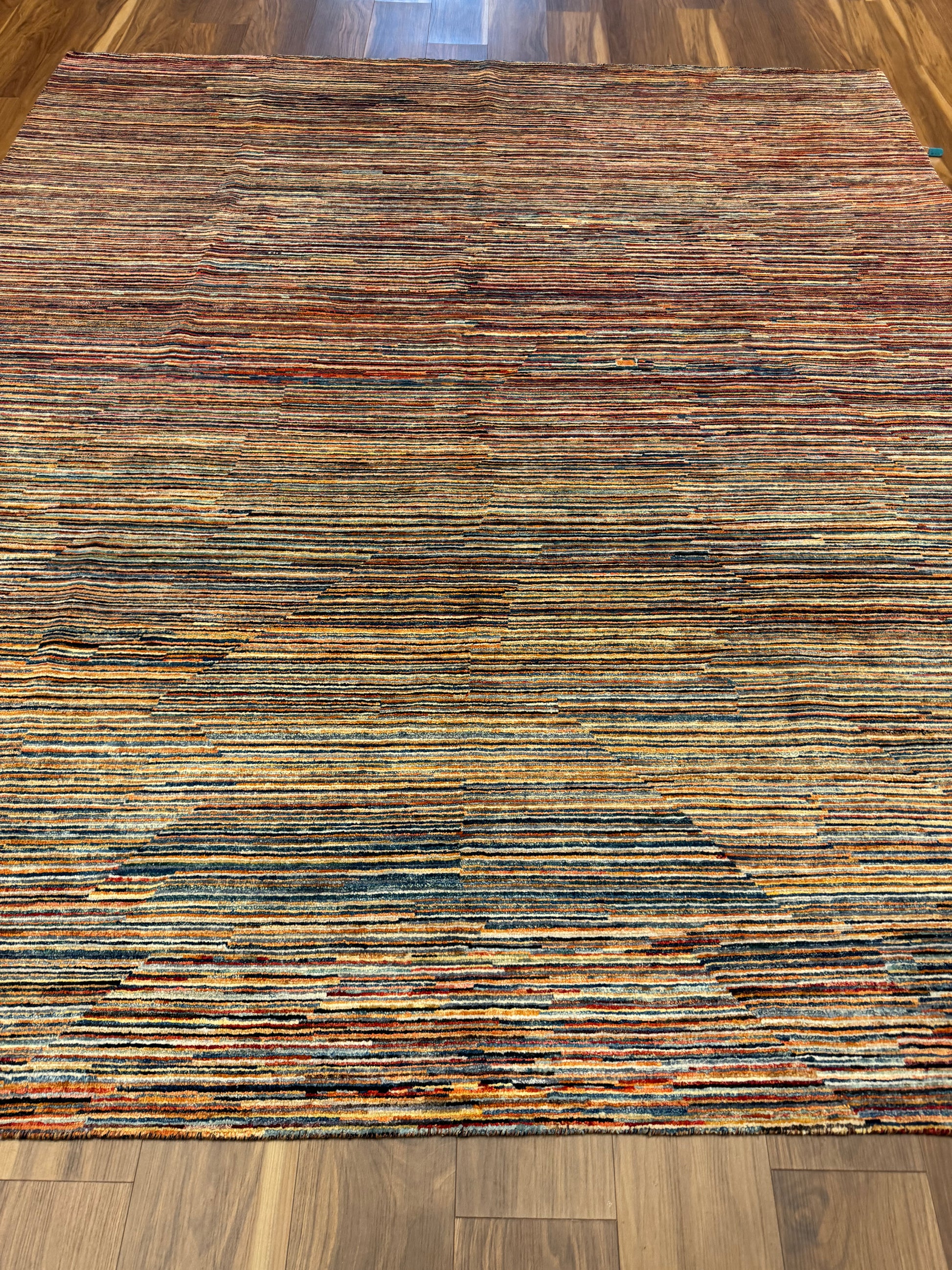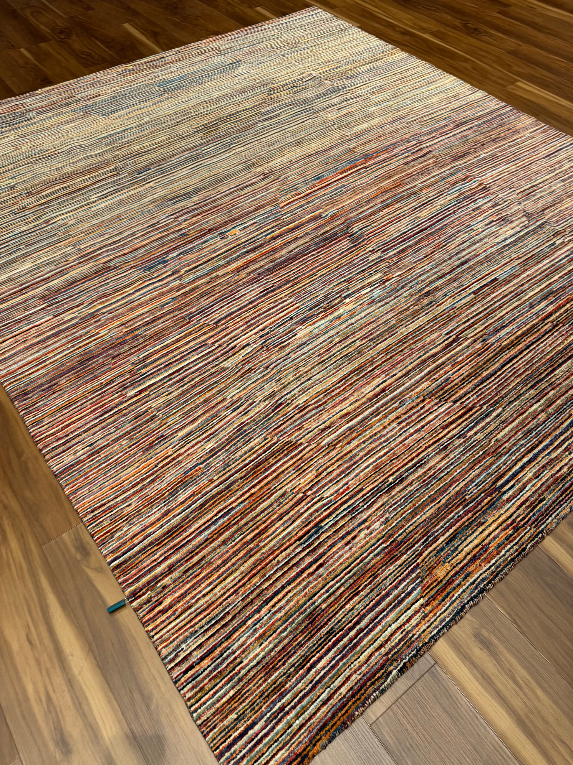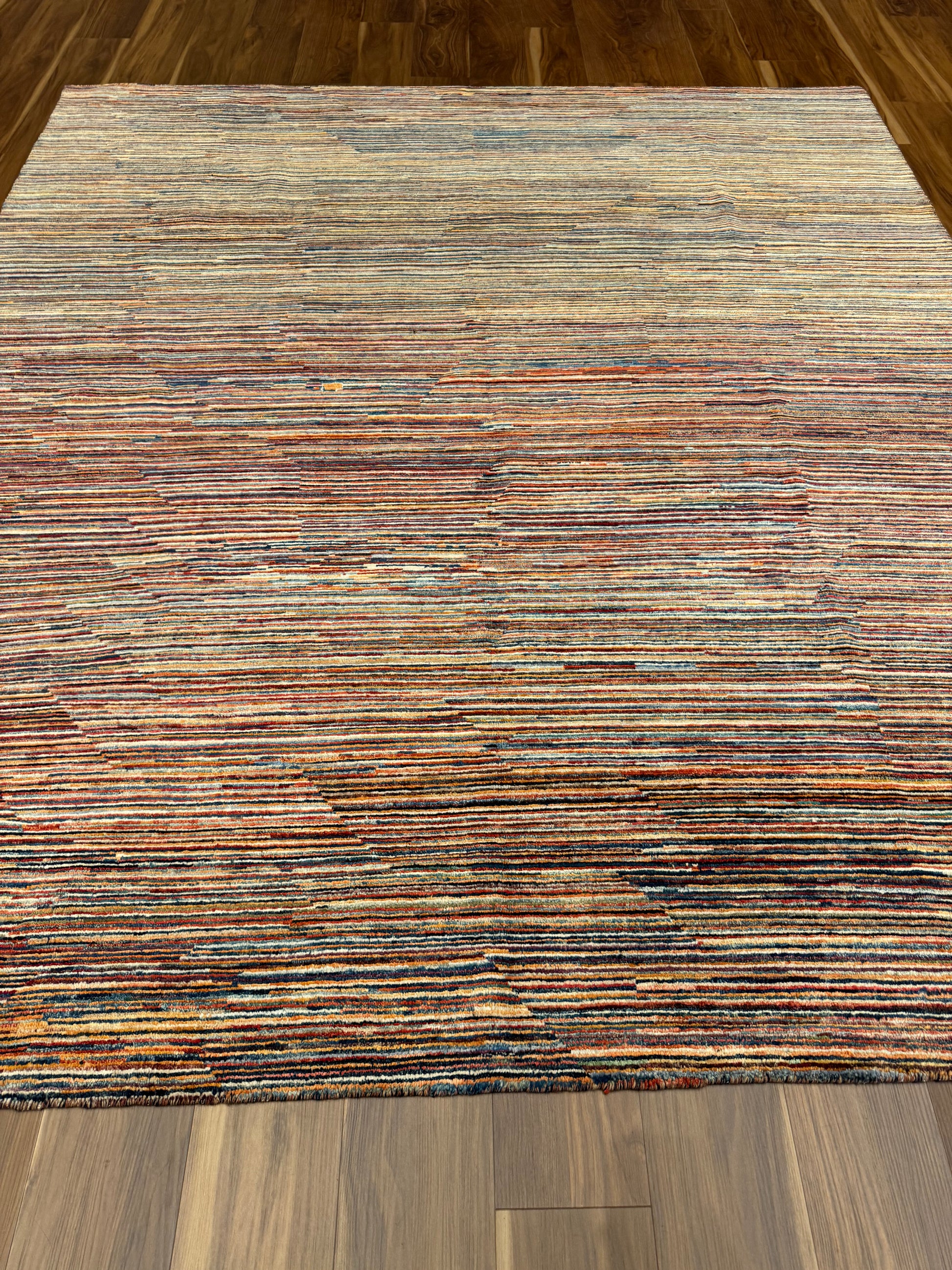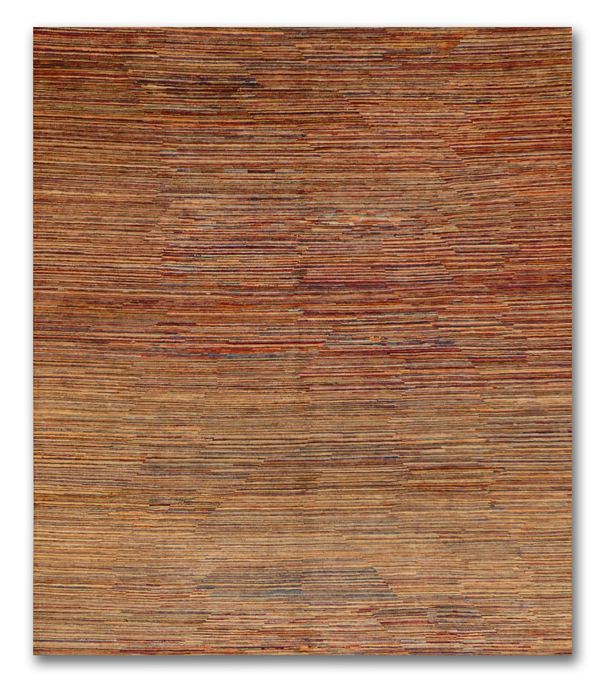 This distinguished modern rug features a rich linear pattern which brings a sense of depth and movement to any space. The warm blend of brown, beige, and rust hues create an inviting atmosphere, while the high-quality wool material ensures both comfort and durability. Its subtle yet sophisticated design complements contemporary interiors, offering a perfect blend of functionality and upscale aesthetics. Ideal for adding a touch of elegance to living rooms, offices, or bedrooms.