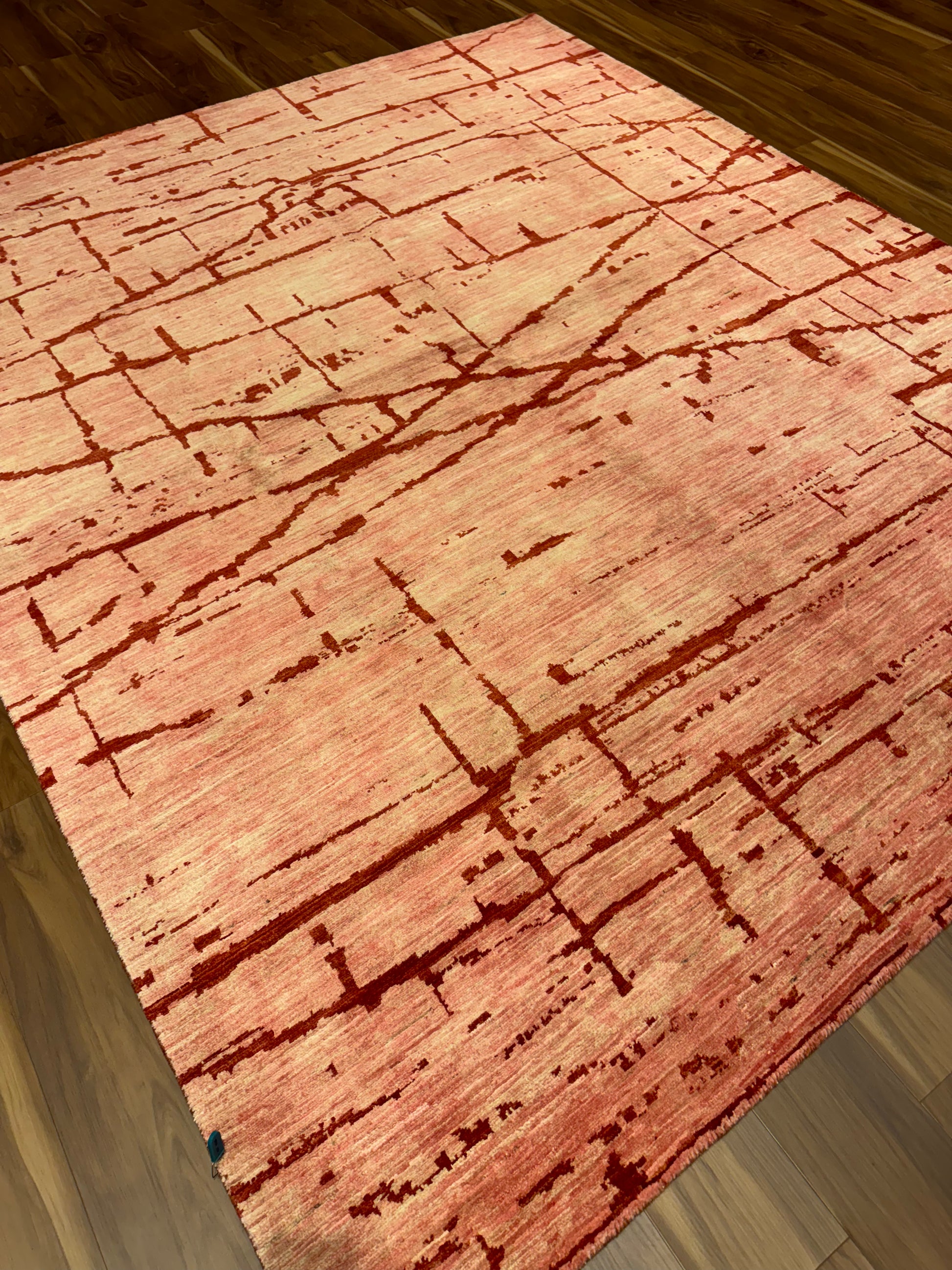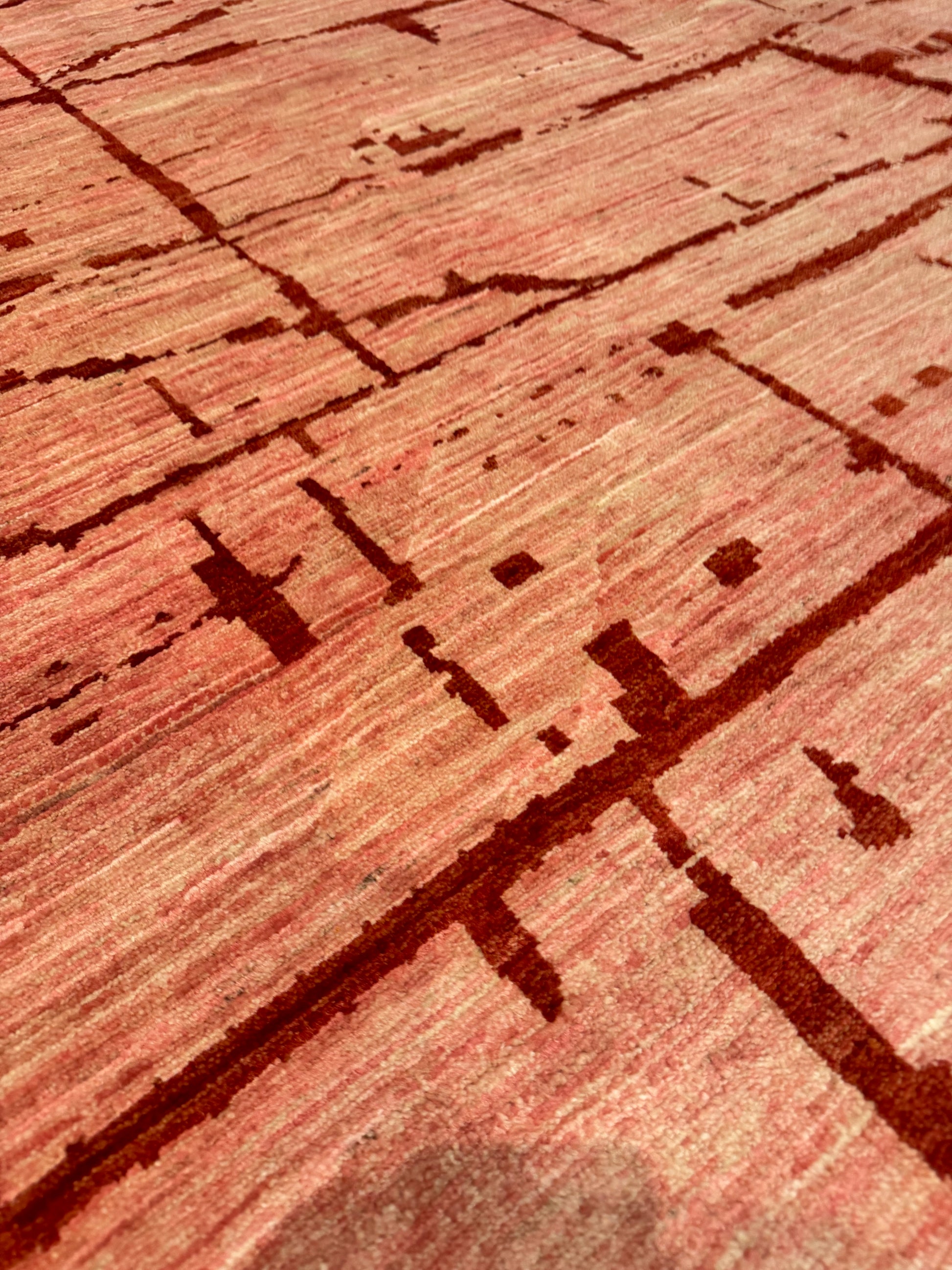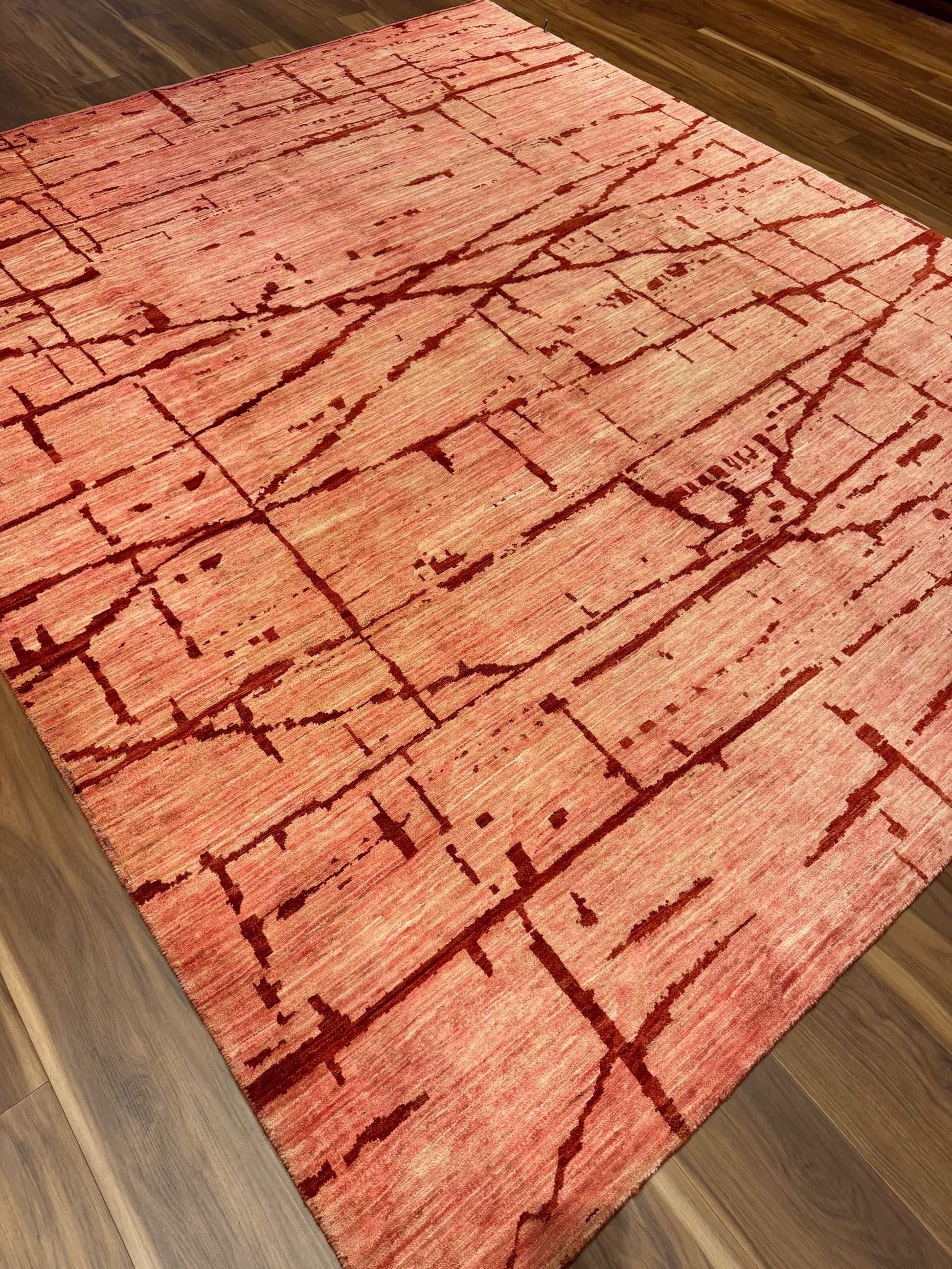 This exquisite rug is a modern take on home decor. Crafted from high-quality wool, it features a sleek pattern that simulates a unique texture reminiscent of a painter’s canvas. The subtle play of coral and peach hues against a creamy background creates a warm and inviting feel, perfect for contemporary interiors. Its durable construction promises enduring beauty and comfort underfoot.