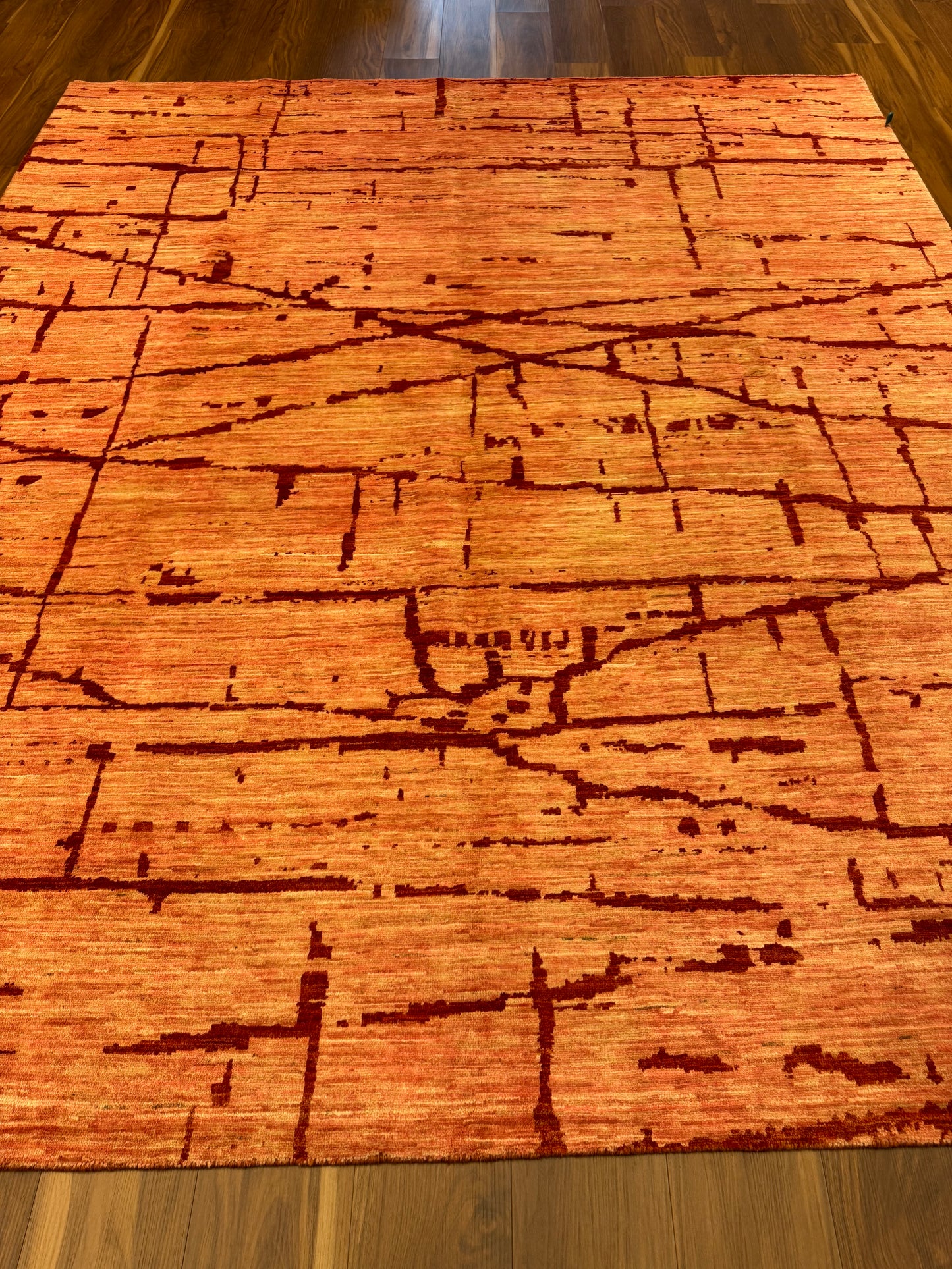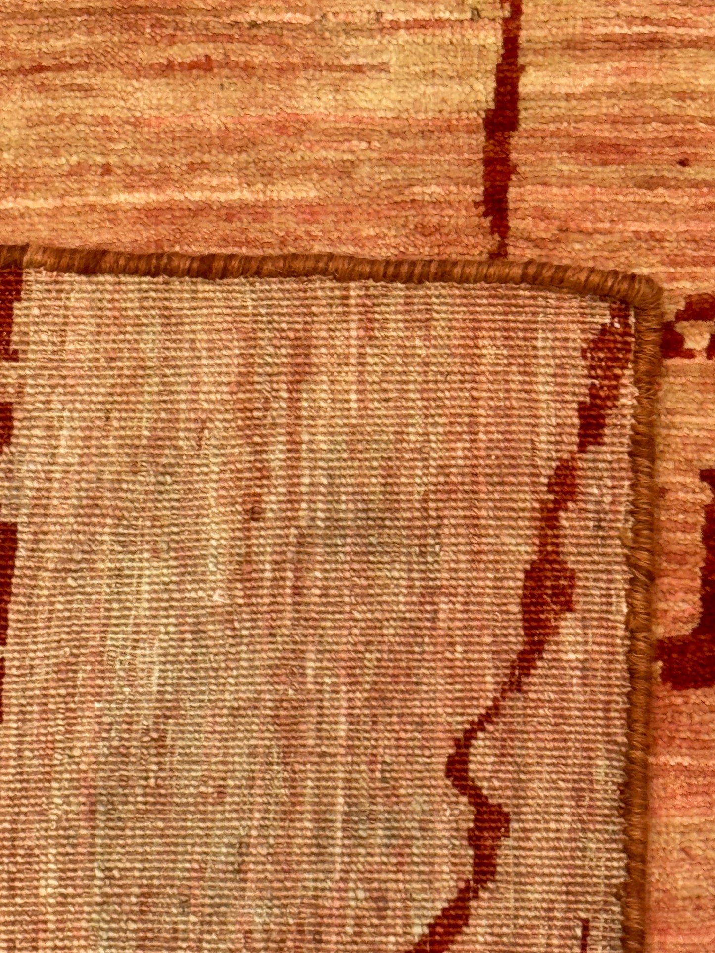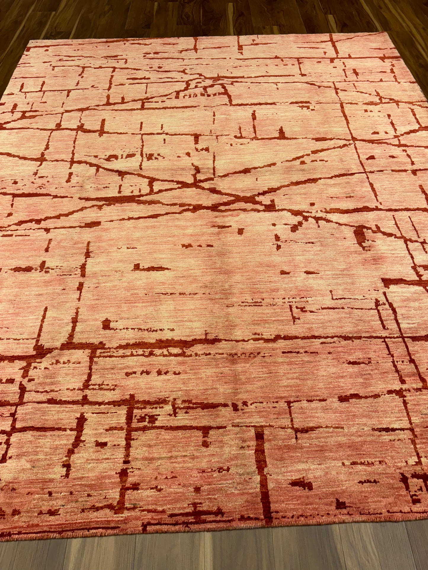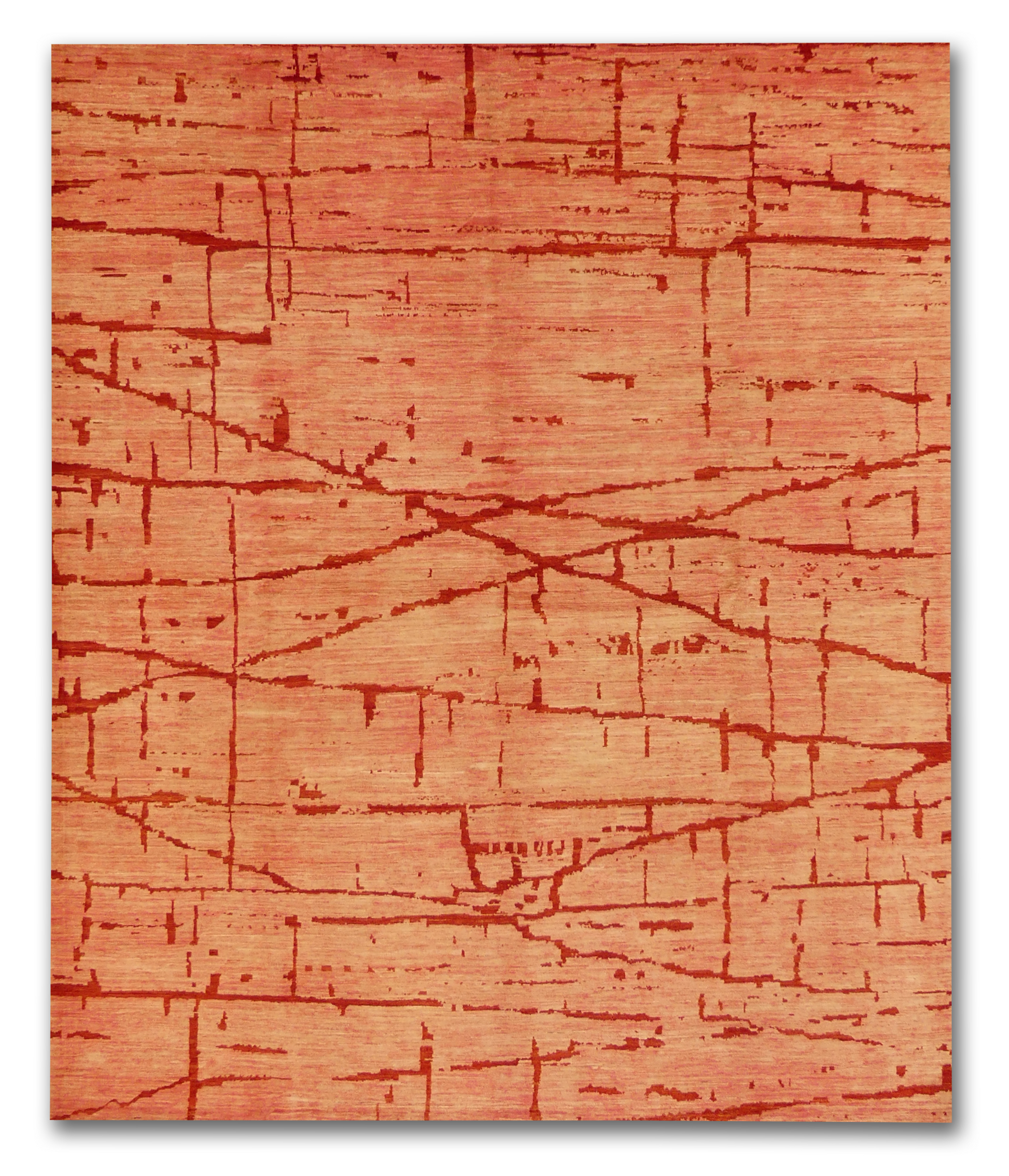 This exquisite rug is a modern take on home decor. Crafted from high-quality wool, it features a sleek pattern that simulates a unique texture reminiscent of a painter’s canvas. The subtle play of coral and peach hues against a creamy background creates a warm and inviting feel, perfect for contemporary interiors. Its durable construction promises enduring beauty and comfort underfoot.