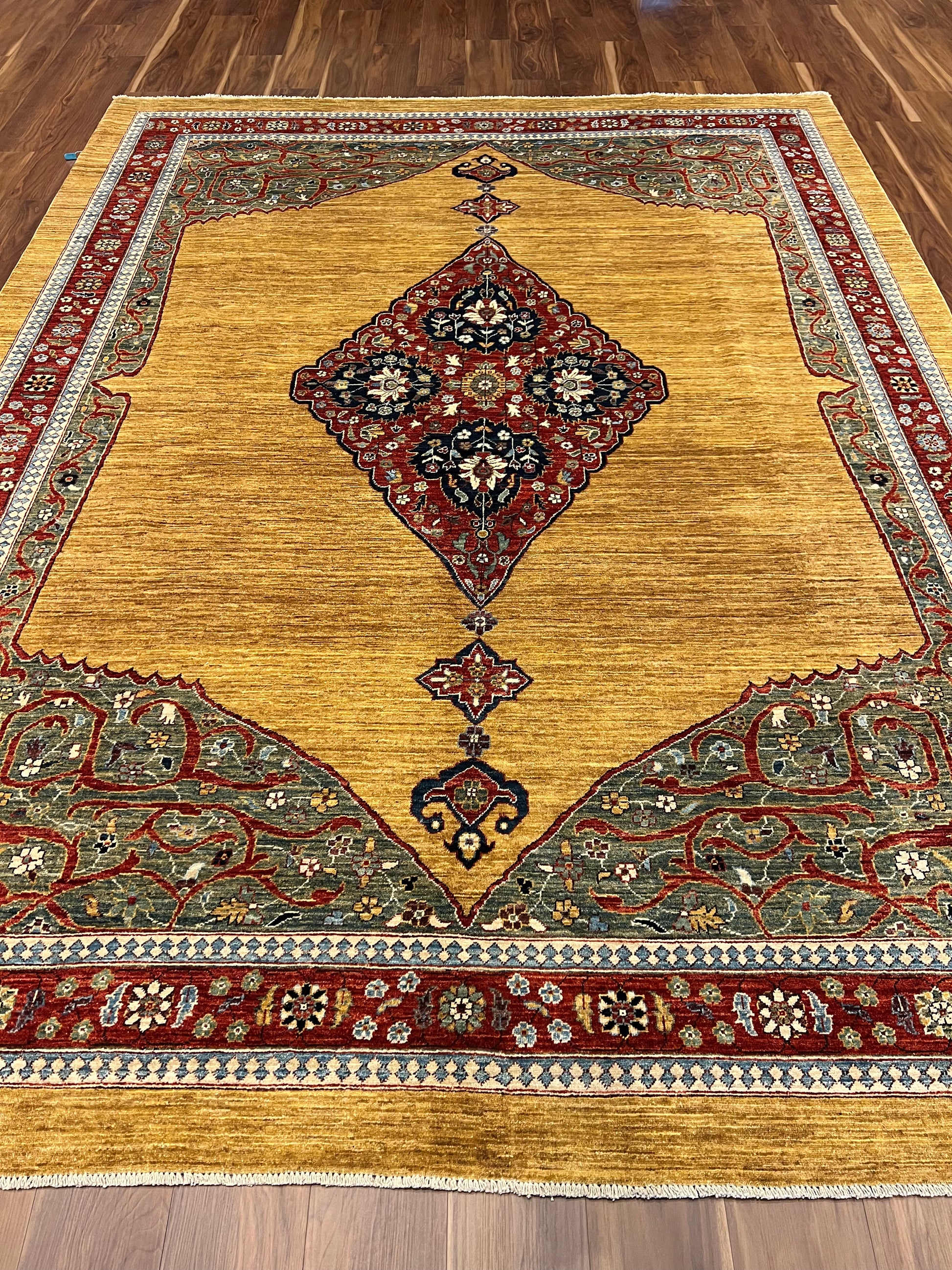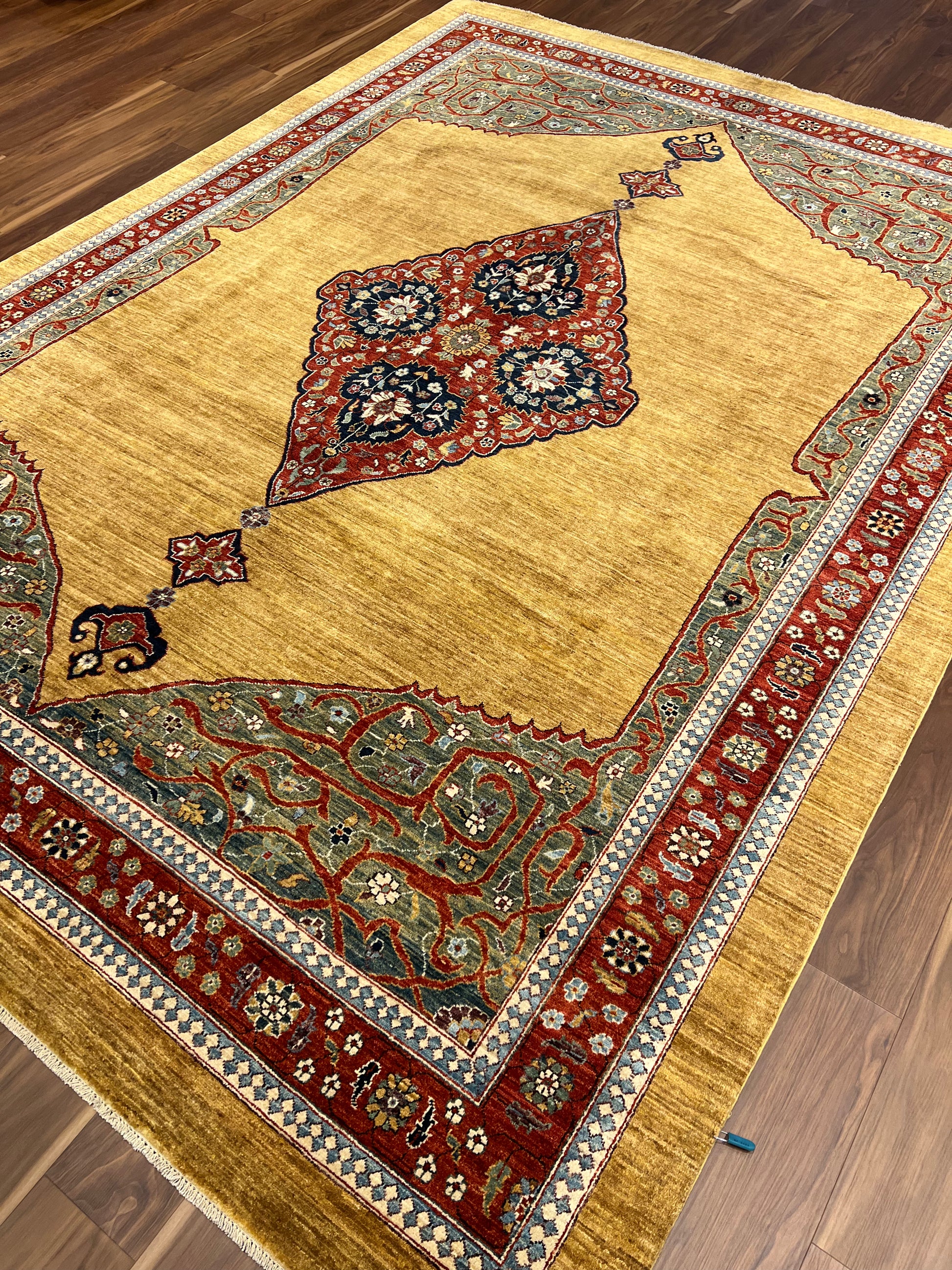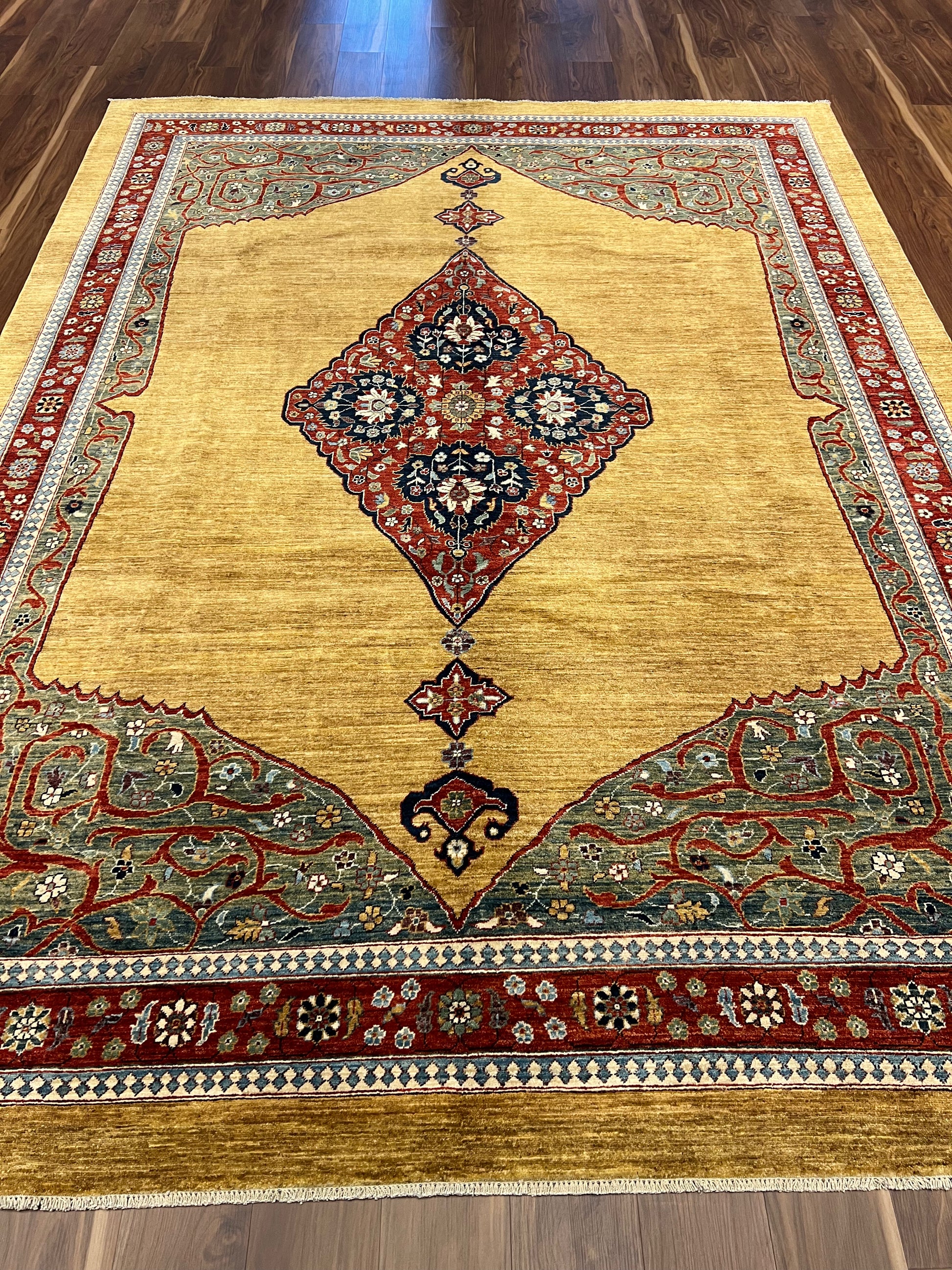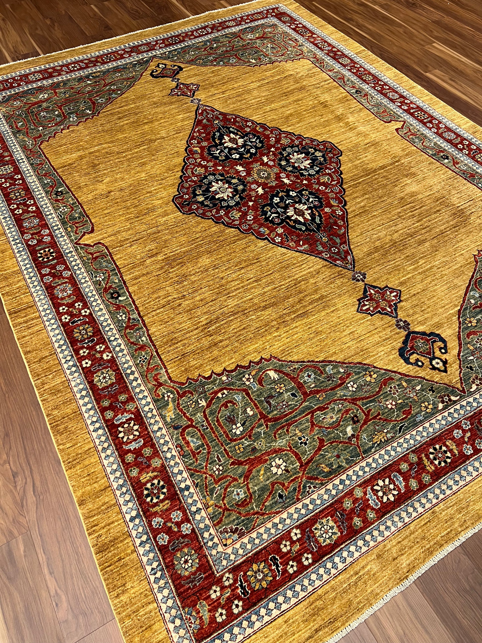 The Mystique Bakshaish rug exudes a sense of grandeur and timeless charm. It features an elegant central diamond-shaped medallion in crimson red, filled with intricate floral motifs, surrounded by a mustard yellow field that accentuates its warm tones. The detailed border showcases complementary colors and traditional designs, adding to its sophisticated allure. This rug is an homage to the rich history of Bakshaish weavings, making it an exceptional piece for collectors and interior enthusiasts seeking a touch of classical elegance in their space.