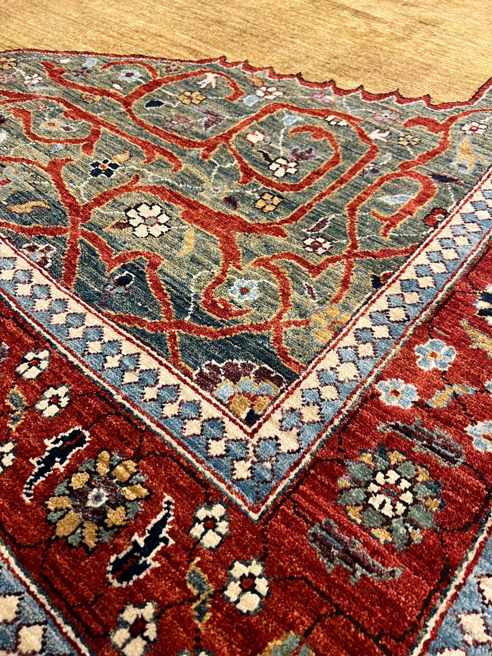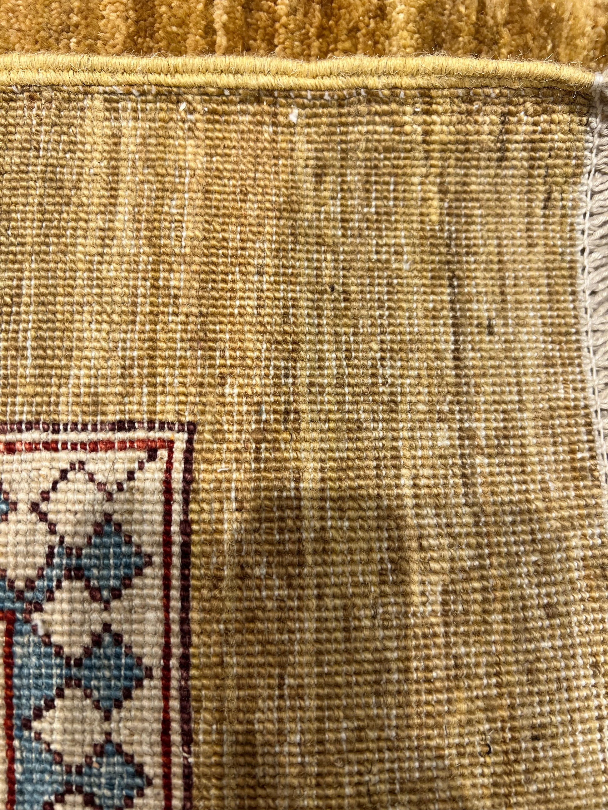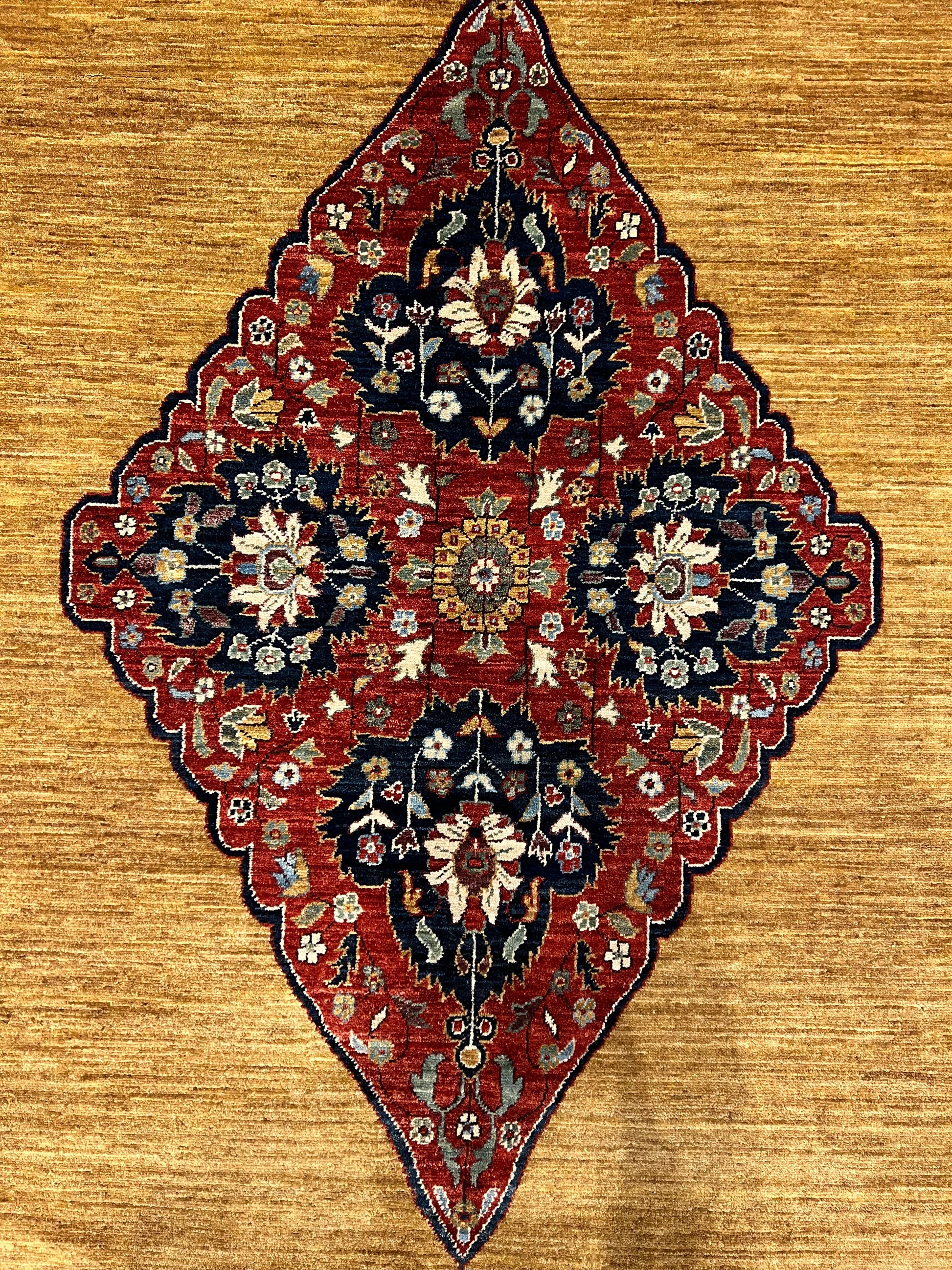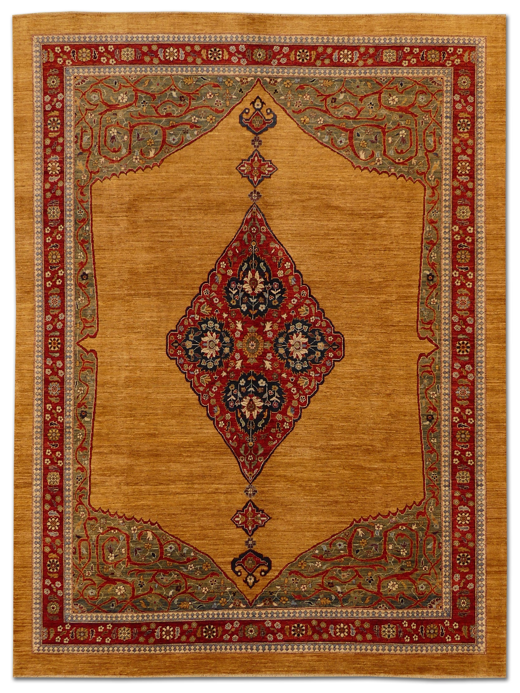 The Mystique Bakshaish rug exudes a sense of grandeur and timeless charm. It features an elegant central diamond-shaped medallion in crimson red, filled with intricate floral motifs, surrounded by a mustard yellow field that accentuates its warm tones. The detailed border showcases complementary colors and traditional designs, adding to its sophisticated allure. This rug is an homage to the rich history of Bakshaish weavings, making it an exceptional piece for collectors and interior enthusiasts seeking a touch of classical elegance in their space.