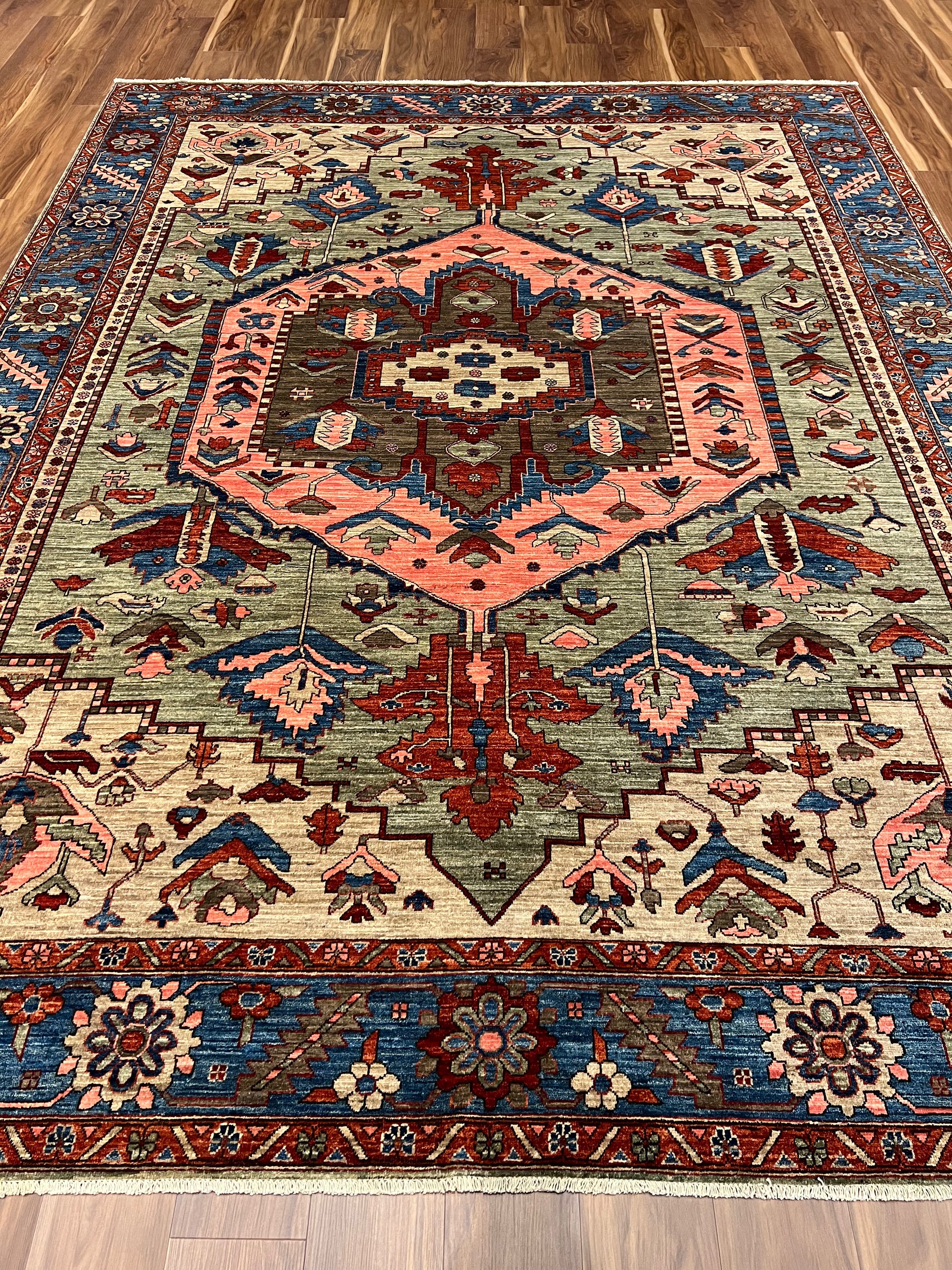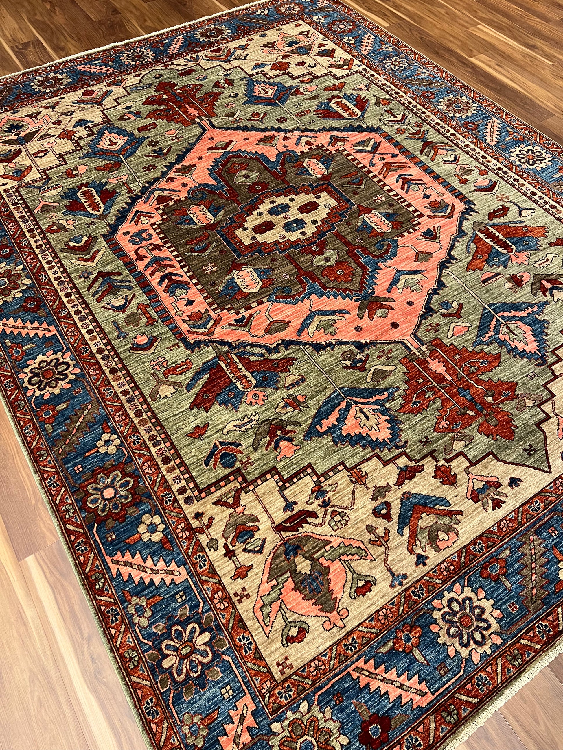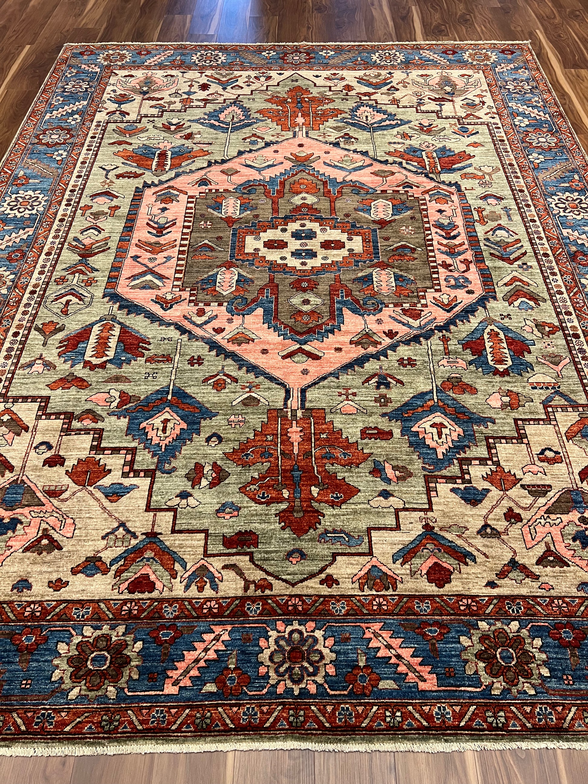 The Mystique Bakshaish rug presents an intricate traditional design with a splendid combination of rust, navy blue, and beige hues. Handcrafted from natural wool, its durable weave offers a luxurious feel underfoot. The central medallion is surrounded by detailed botanical motifs, reflecting a timeless elegance inspired by historic Persian Bakshaish patterns. Perfect for adding warmth and historical character to a living space or dining area.