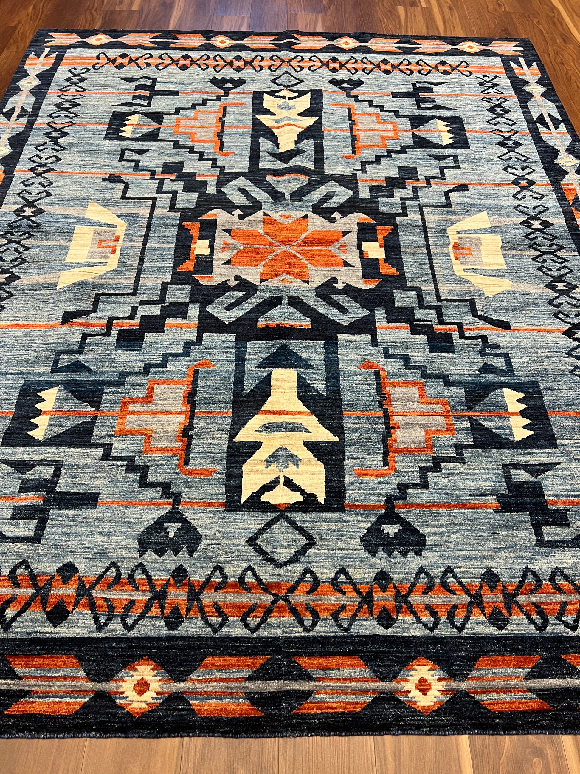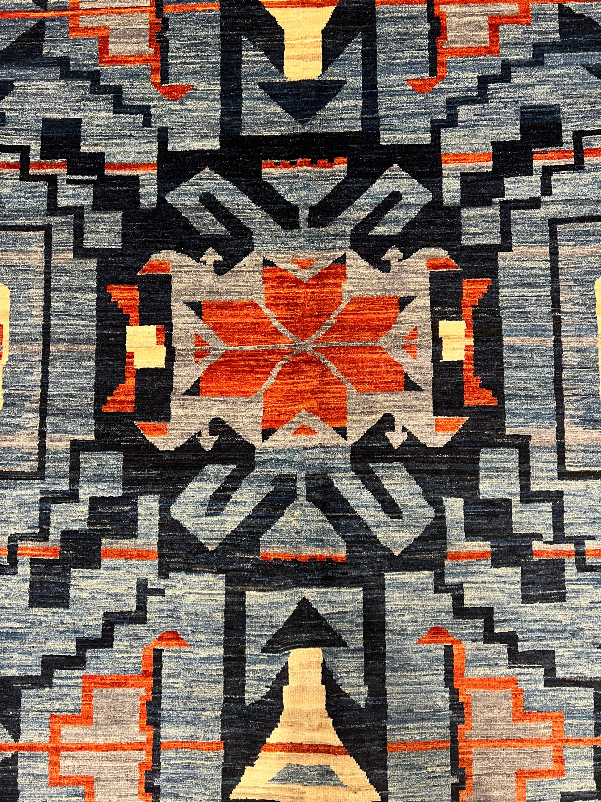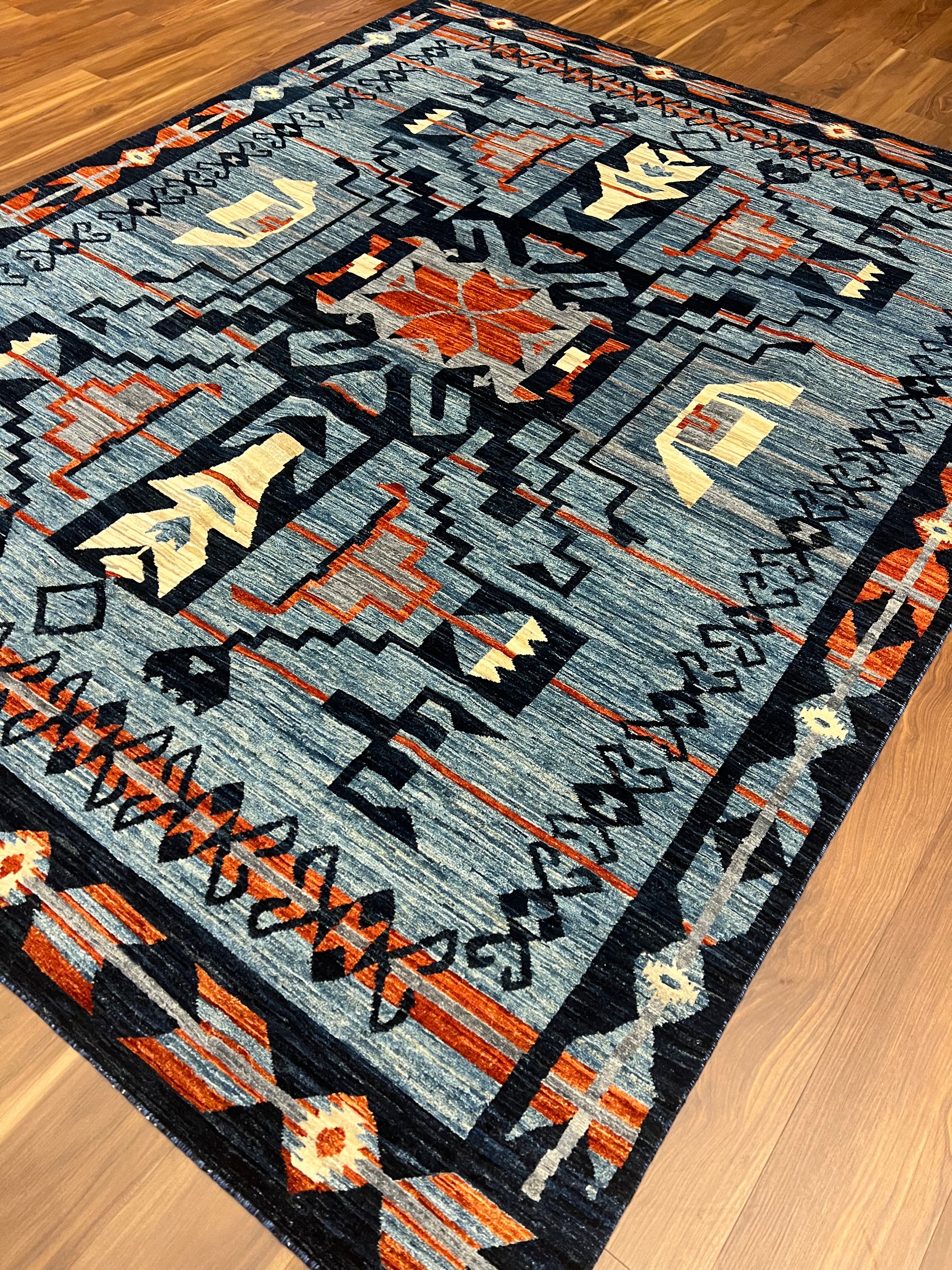 This Navajo Arizona rug captures the spirit of the American Southwest with its intricate geometric designs and earthy colors. Woven from high-quality wool, it features a dynamic assortment of traditional patterns, symbolizing both the natural world and Navajo cultural motifs. Its symmetrical composition and bold contrasts make it a stunning centerpiece for any room, offering both cultural richness and a warm, inviting atmosphere. Perfect for those appreciating artisan craftsmanship and historic artistic expression.