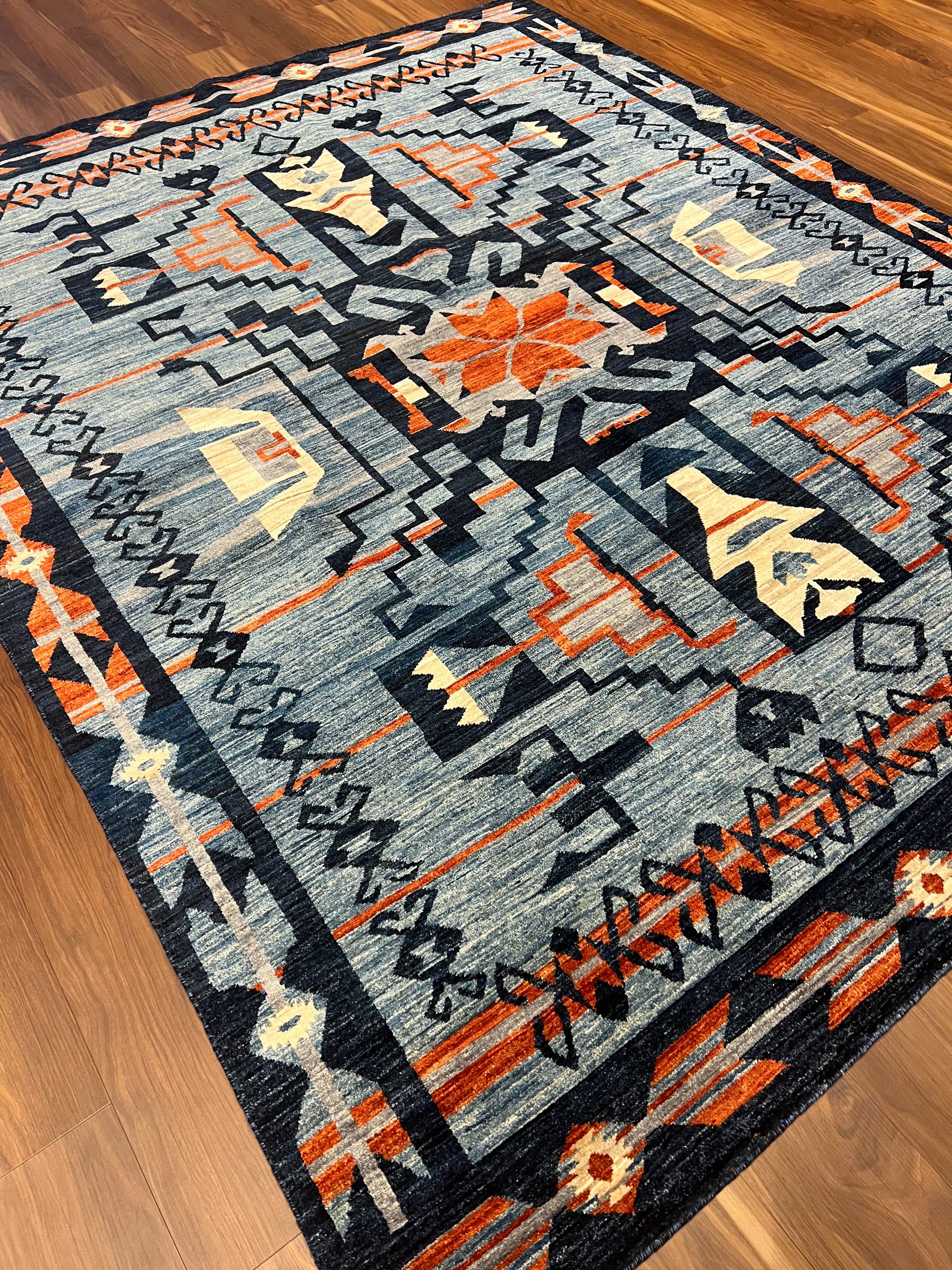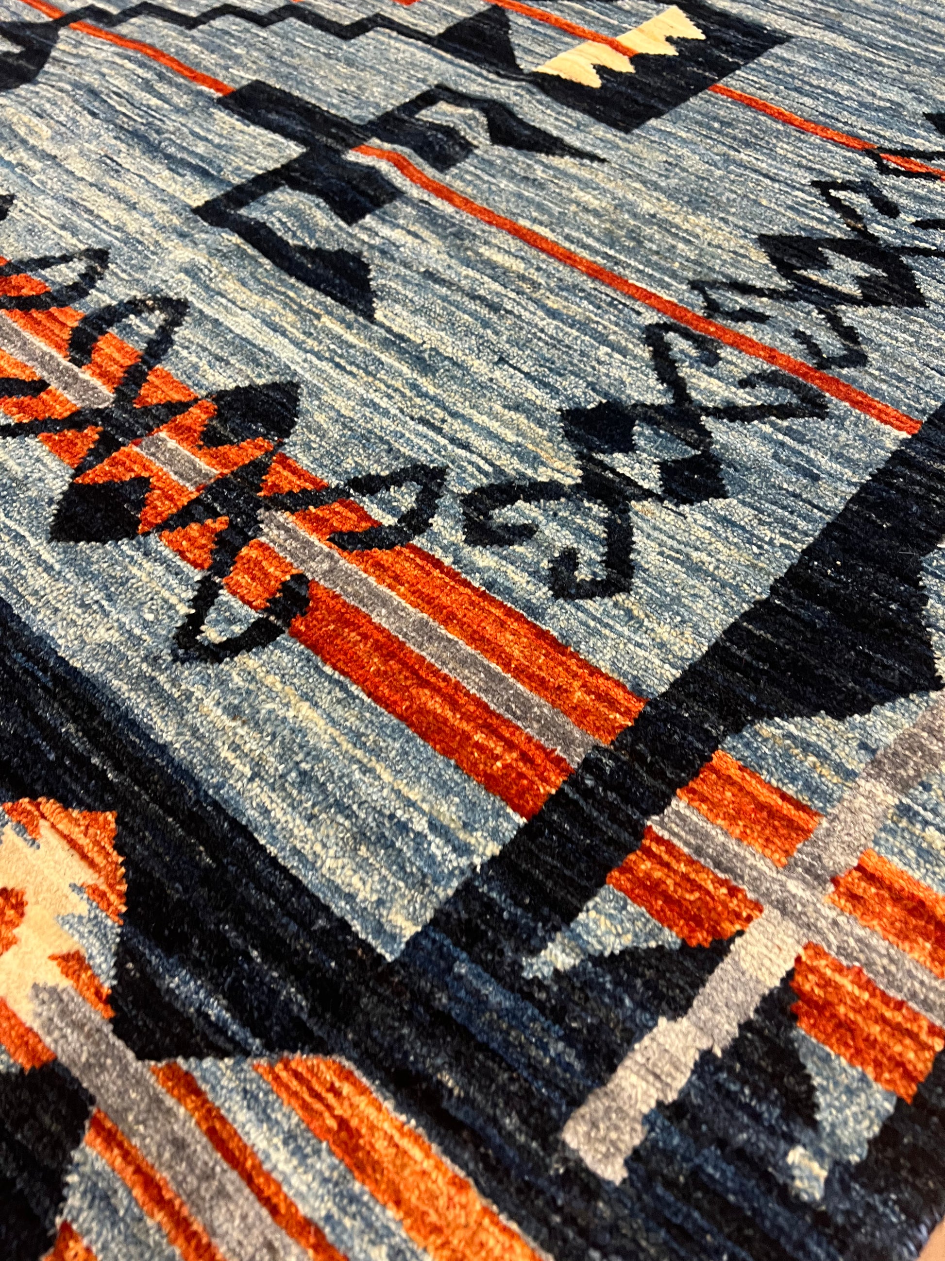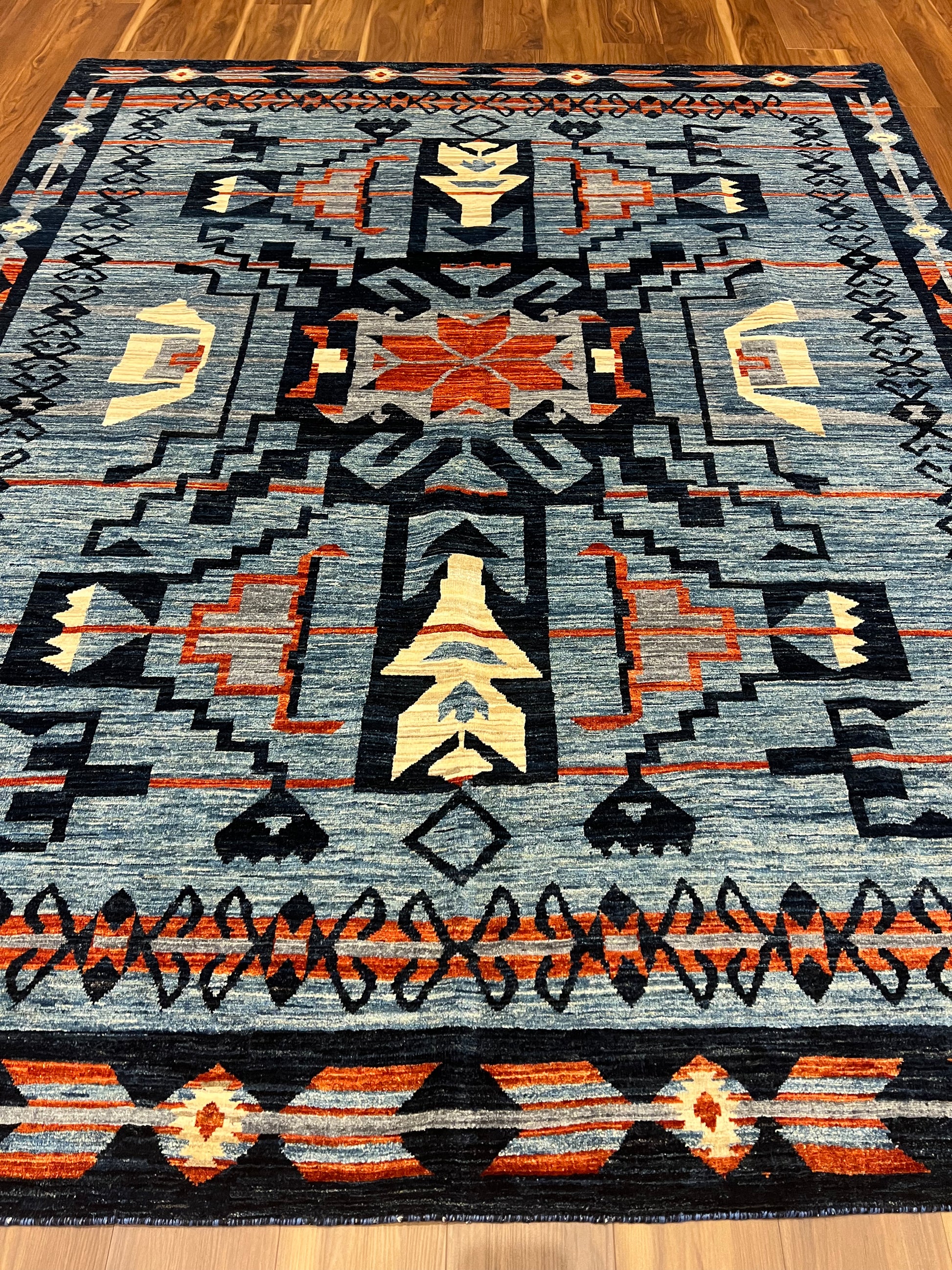 This Navajo Arizona rug captures the spirit of the American Southwest with its intricate geometric designs and earthy colors. Woven from high-quality wool, it features a dynamic assortment of traditional patterns, symbolizing both the natural world and Navajo cultural motifs. Its symmetrical composition and bold contrasts make it a stunning centerpiece for any room, offering both cultural richness and a warm, inviting atmosphere. Perfect for those appreciating artisan craftsmanship and historic artistic expression.