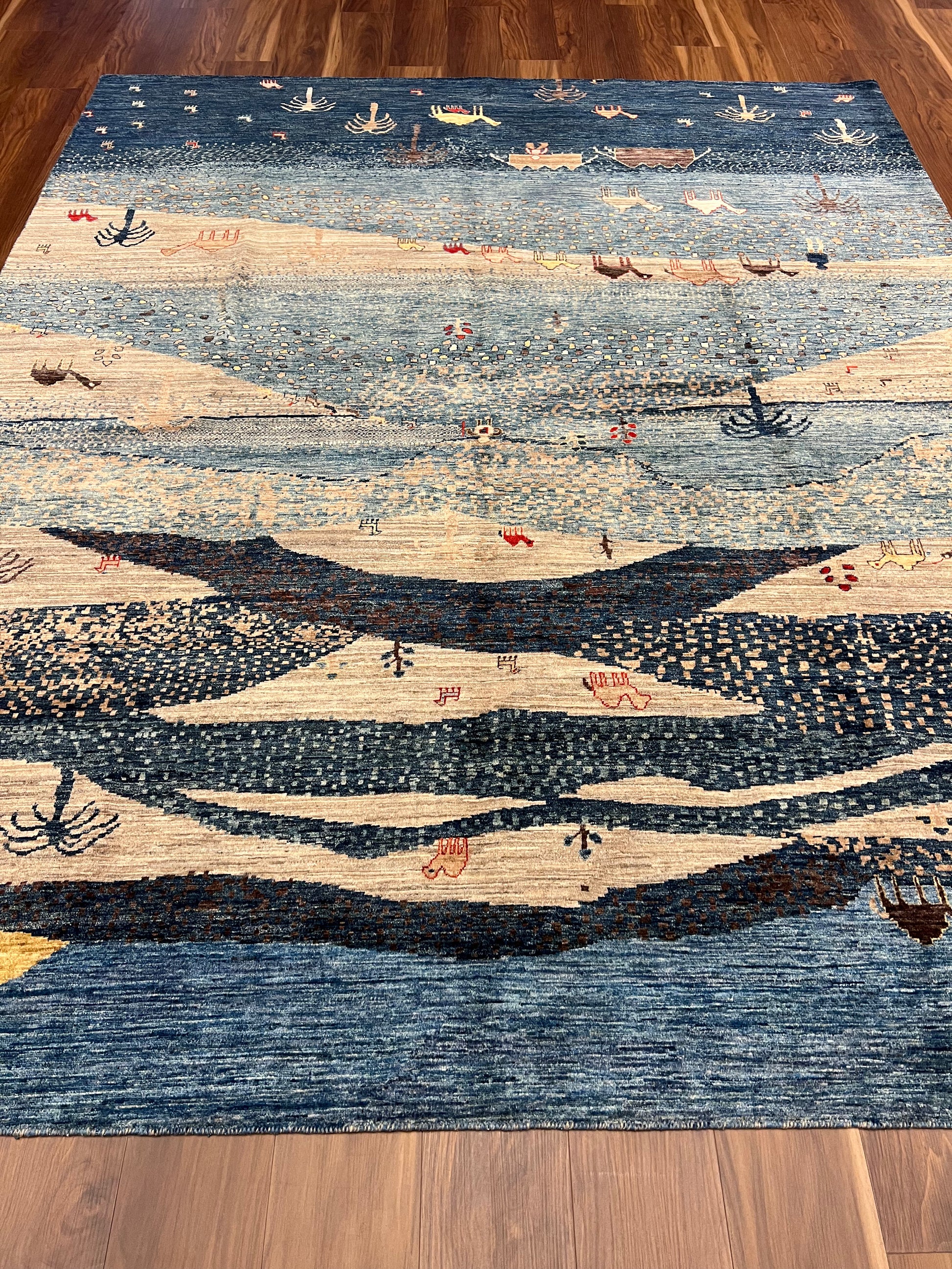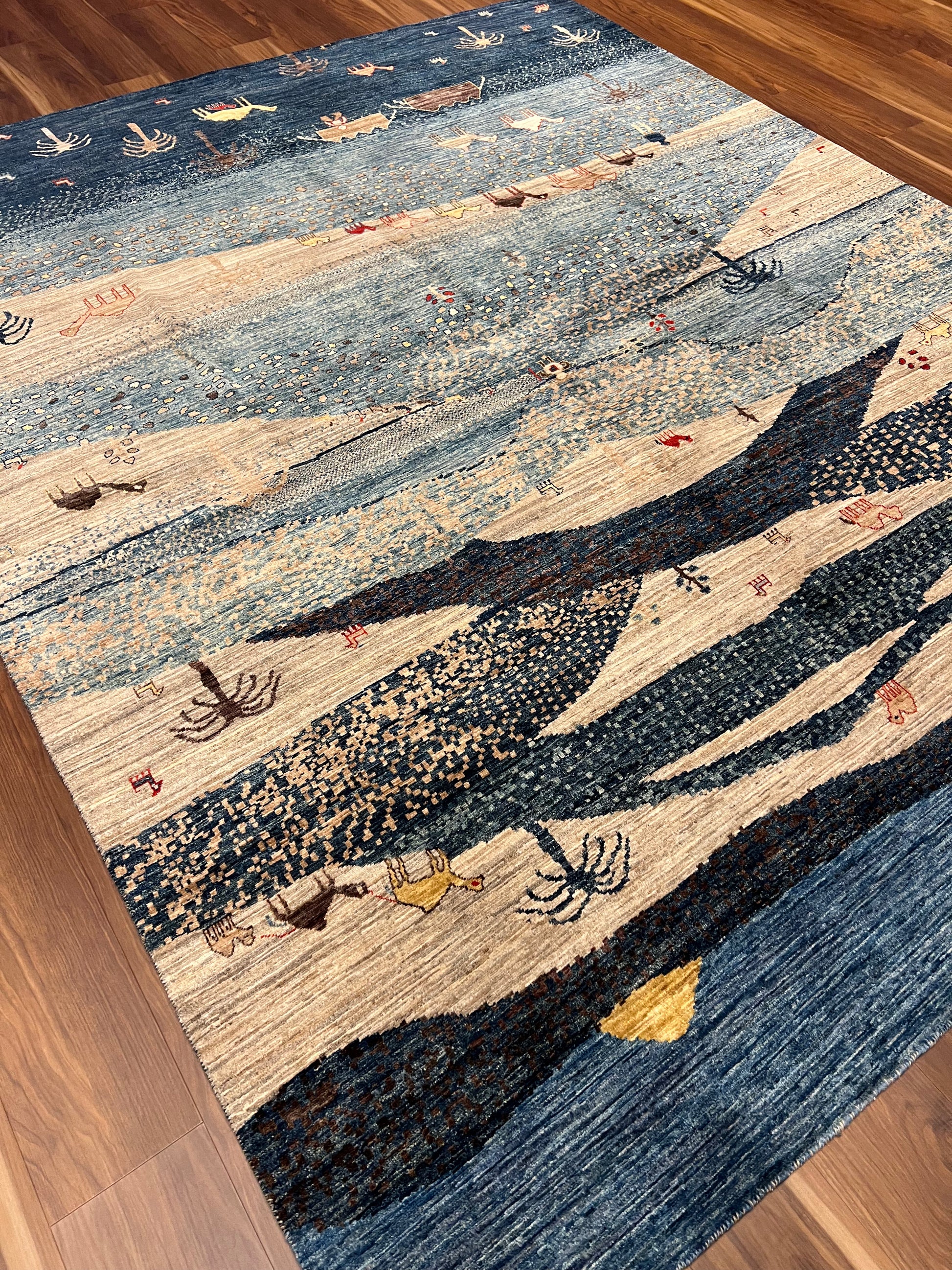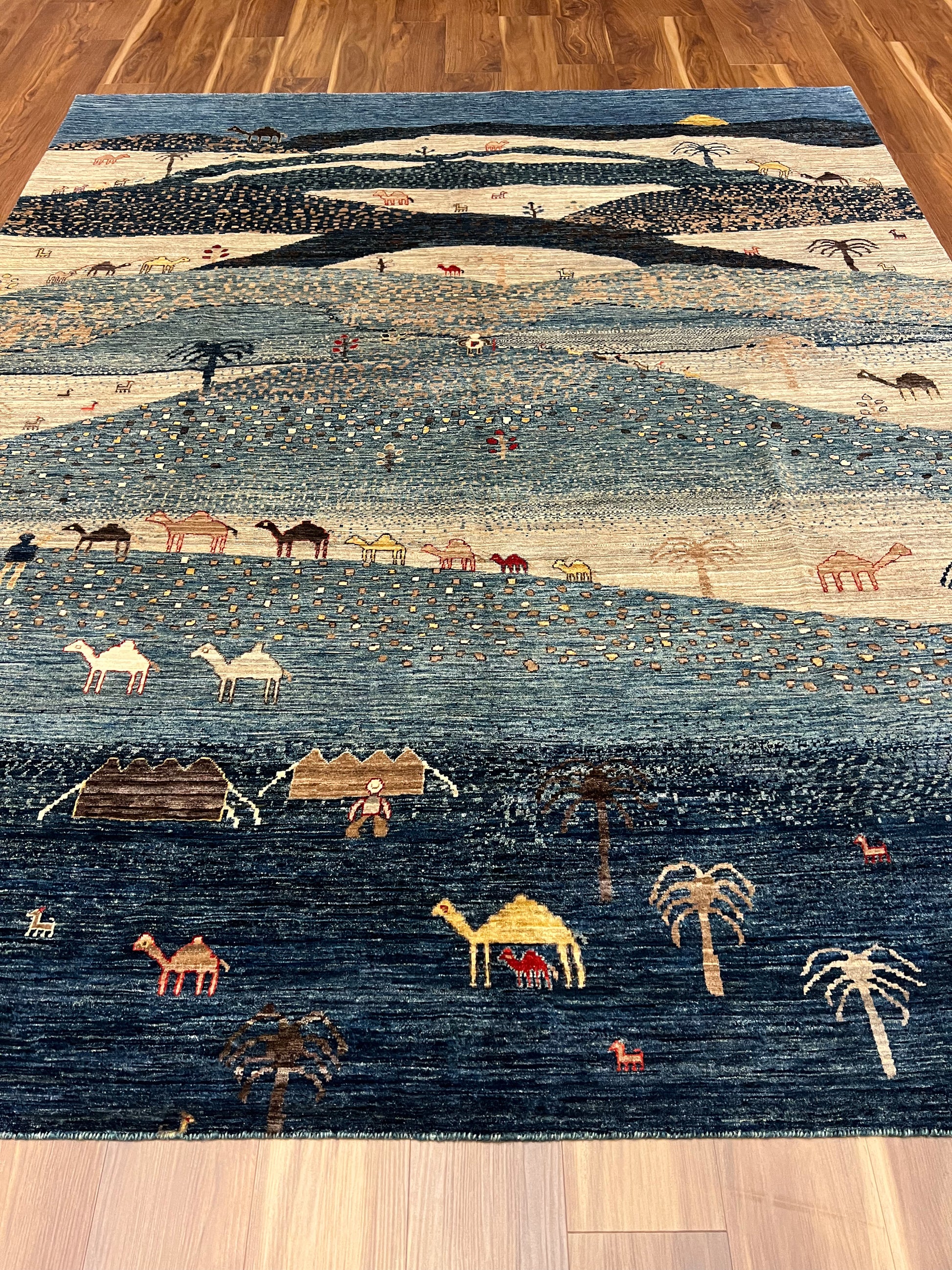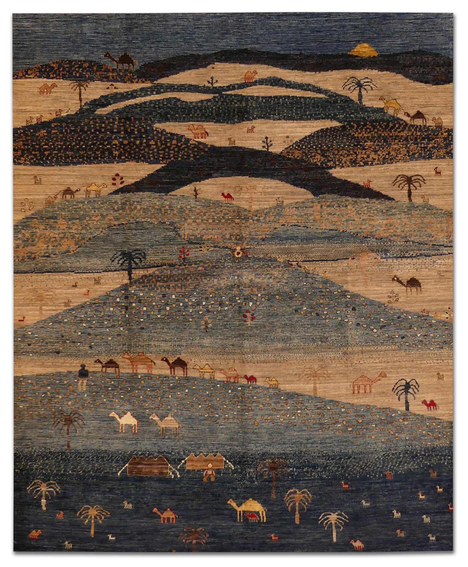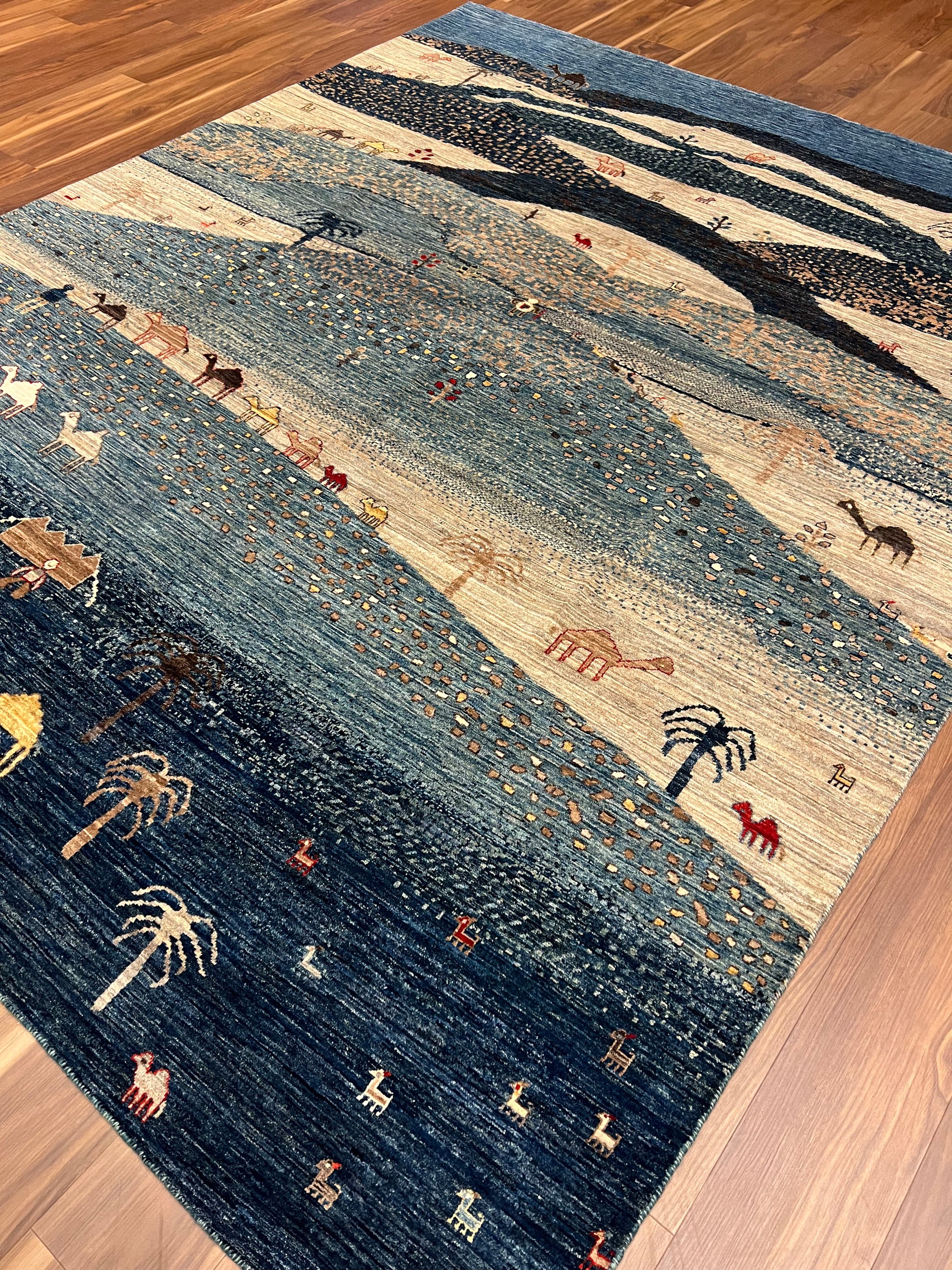 This exquisite Nomadic Gabbeh Lori rug is handwoven with the highest quality wool, showcasing a vivid depiction of pastoral life. The design features a series of rolling hills adorned with animals, trees, and simple village scenes, rendered in rich earthy tones. Its unique charm is attributed to its rustic imagery, infused with a sense of naivety and heartwarming simplicity. Each element is woven with care, speaking to the artistry and tradition of Lori nomadic weavers. This rug would add an authentic and warm touch to any room, inviting conversations and admiration.