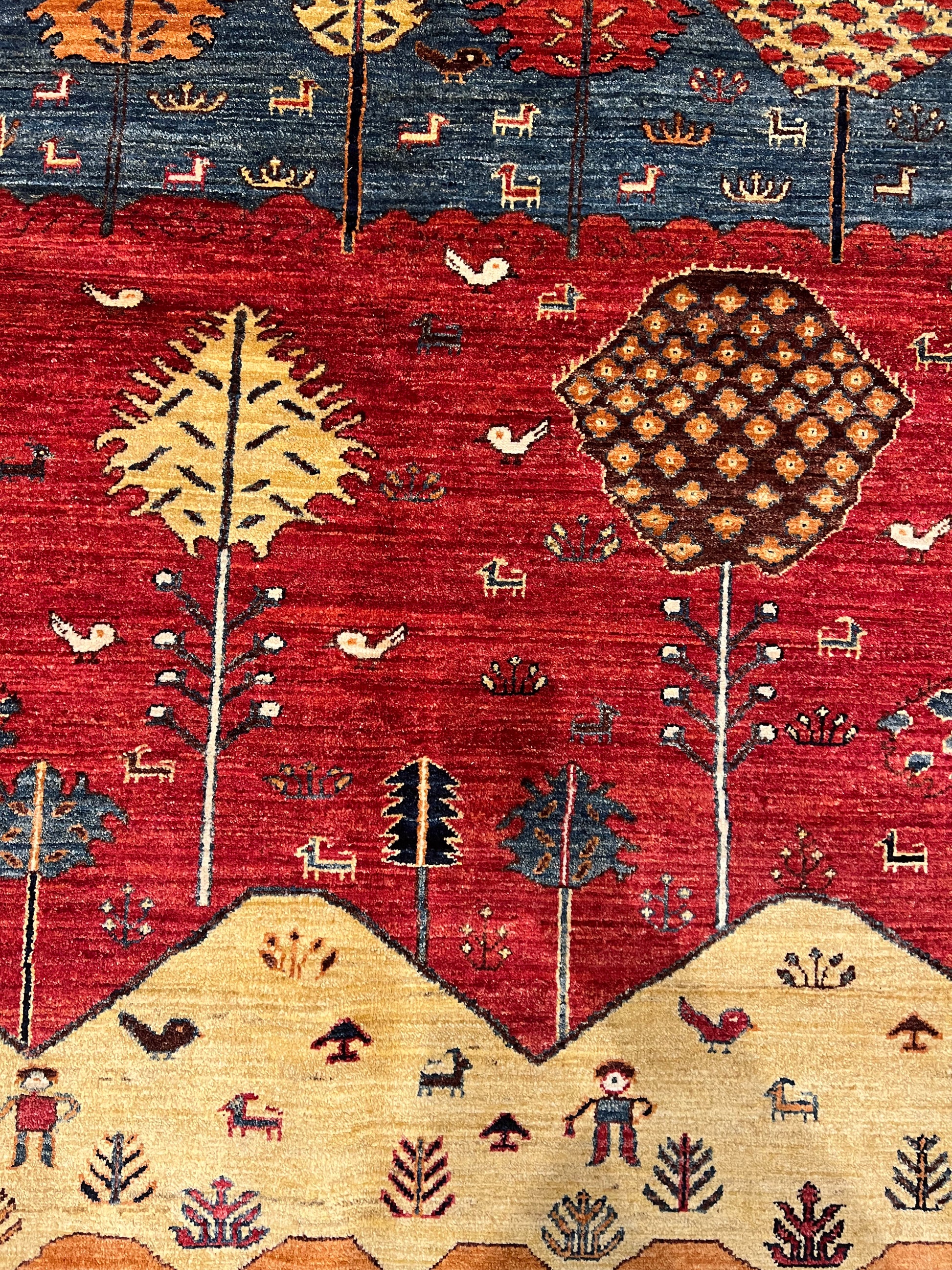 This Nomadic Gabbeh rug is an exquisite piece of handcrafted art. The bold red and tranquil blue hues create a vibrant backdrop for the compelling array of traditional motifs depicted throughout. Inspired by the simplicity and charm of tribal life, the rug is adorned with stylized representations of nature, showing animals and plants, capturing the essence of an untouched wilderness with a whimsical touch. Made of high-quality wool, this piece is both durable and soft underfoot, ideal for bringing warmth and texture to any space.