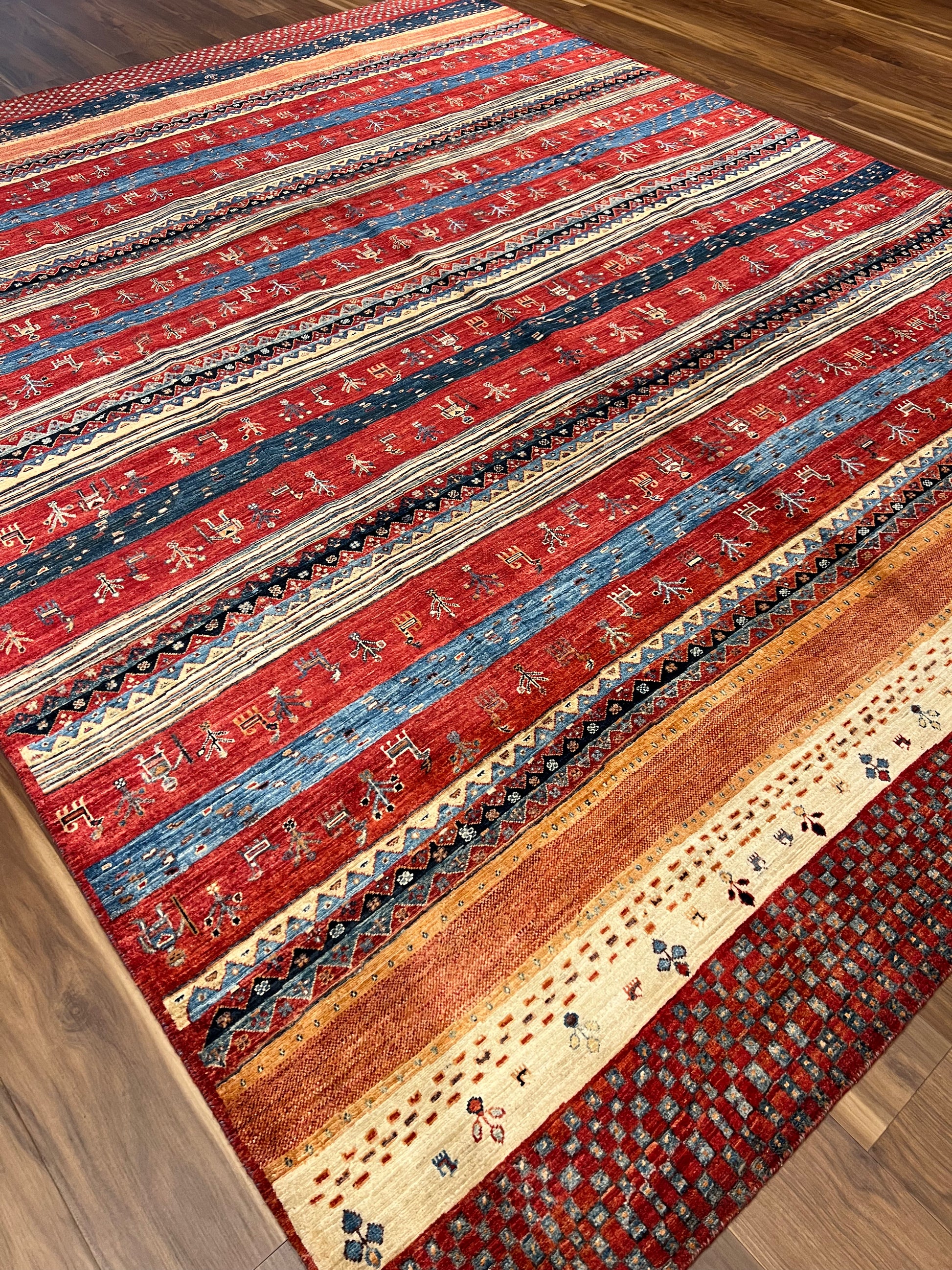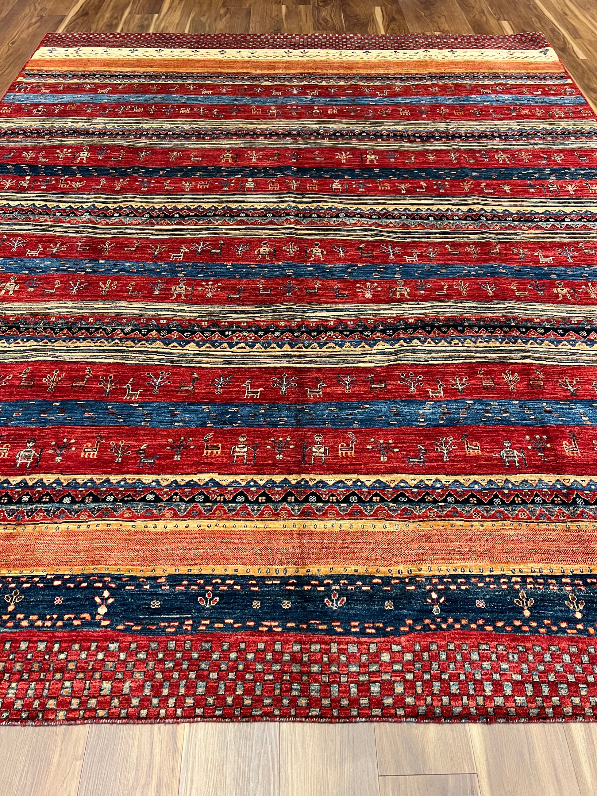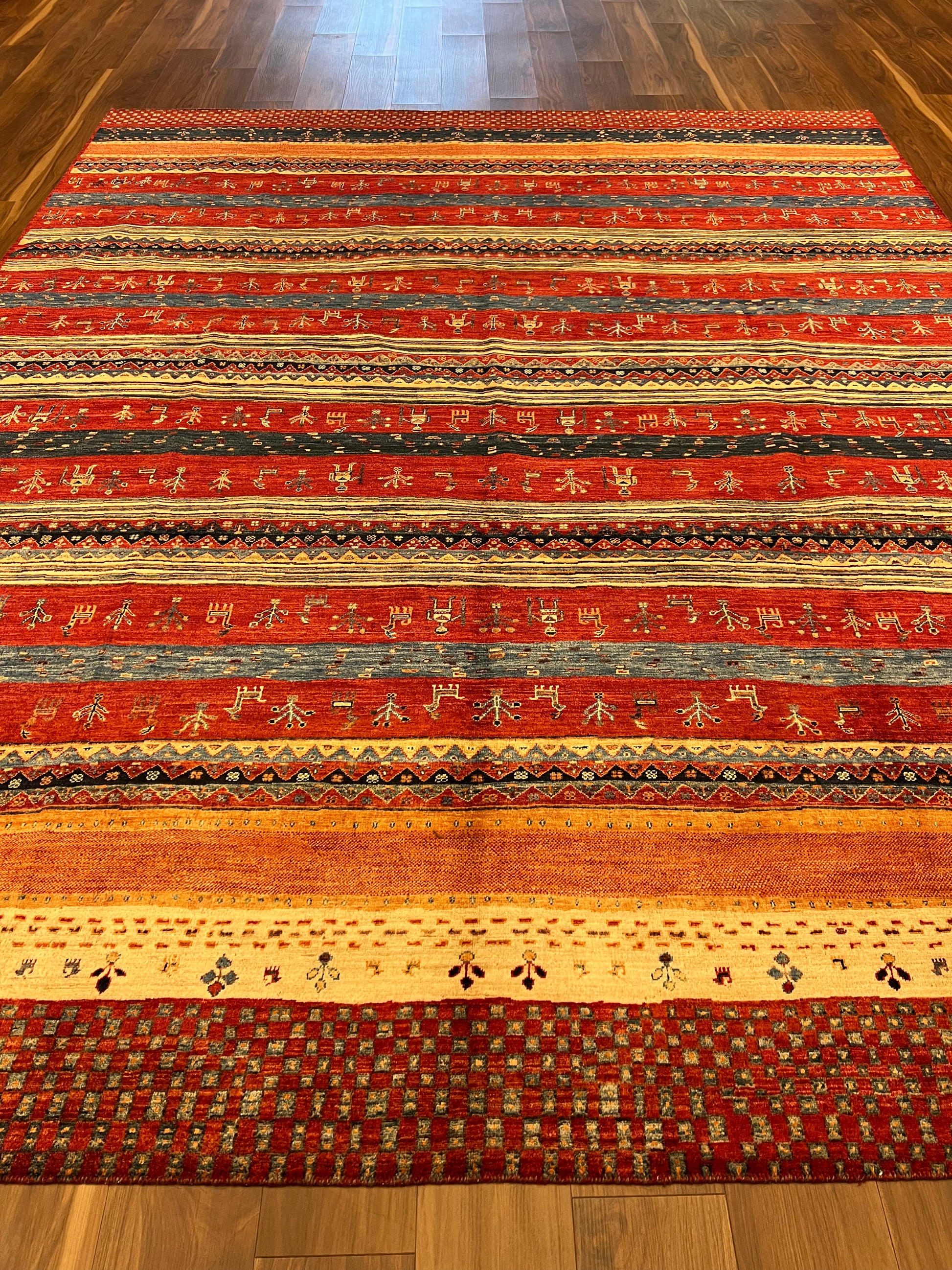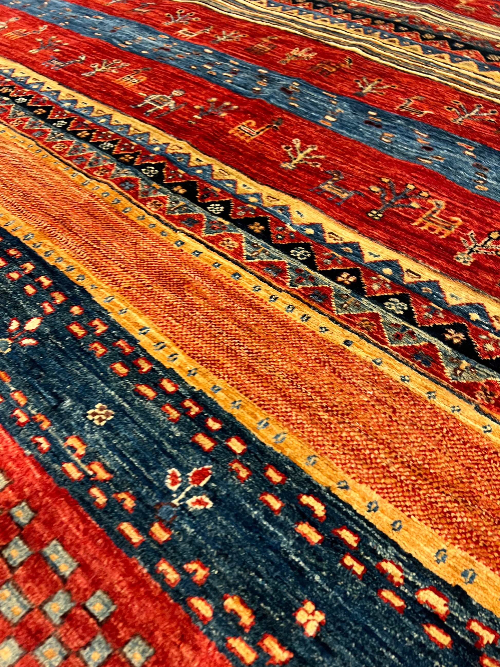 This handcrafted Nomadic Gabbeh rug exudes a timeless charisma, woven with unparalleled skill using high-quality wool. Its rich tapestry of red, orange, and earthy tones is enlivened by splashes of vibrant blue, creating a warm and inviting ambiance. Intricate tribal patterns, including animal and human-like figures, traverse the rug in horizontal bands, invoking a sense of ancient storytelling and cultural heritage. Suitable for both modern and traditional settings, this piece promises to bring a touch of nomadic spirit and artisanal craftsmanship to any living space.