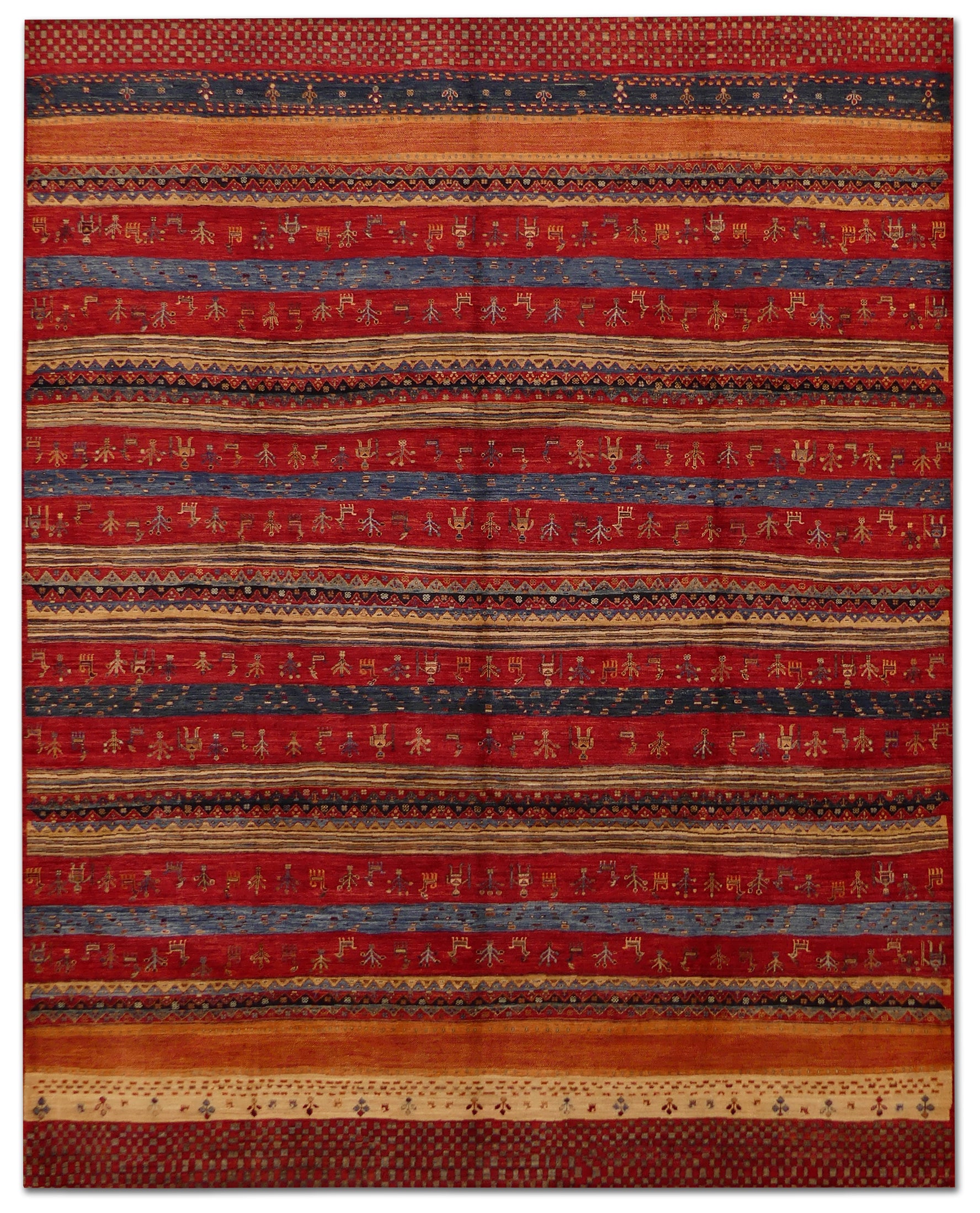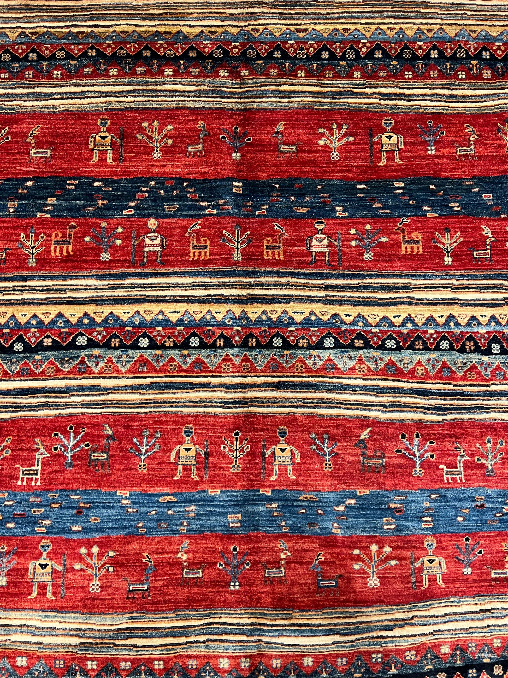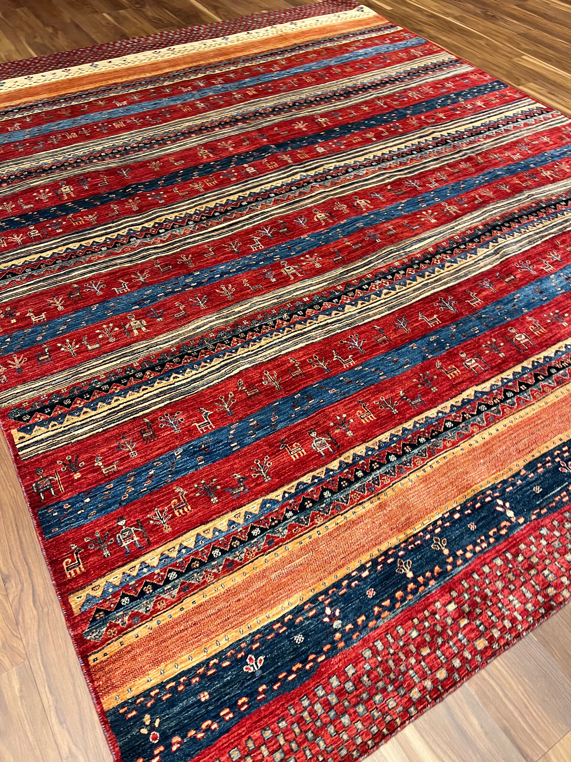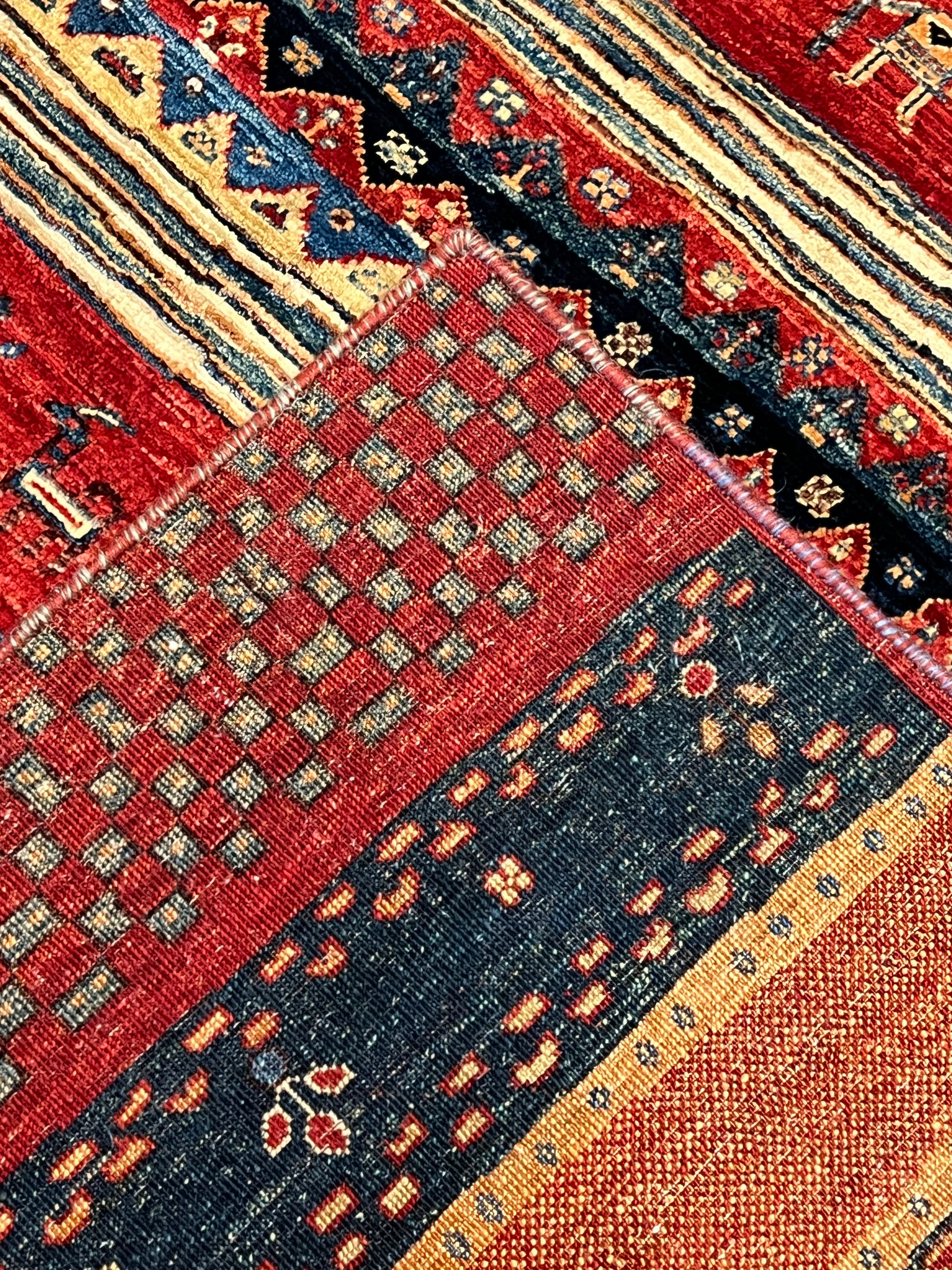 This handcrafted Nomadic Gabbeh rug exudes a timeless charisma, woven with unparalleled skill using high-quality wool. Its rich tapestry of red, orange, and earthy tones is enlivened by splashes of vibrant blue, creating a warm and inviting ambiance. Intricate tribal patterns, including animal and human-like figures, traverse the rug in horizontal bands, invoking a sense of ancient storytelling and cultural heritage. Suitable for both modern and traditional settings, this piece promises to bring a touch of nomadic spirit and artisanal craftsmanship to any living space.