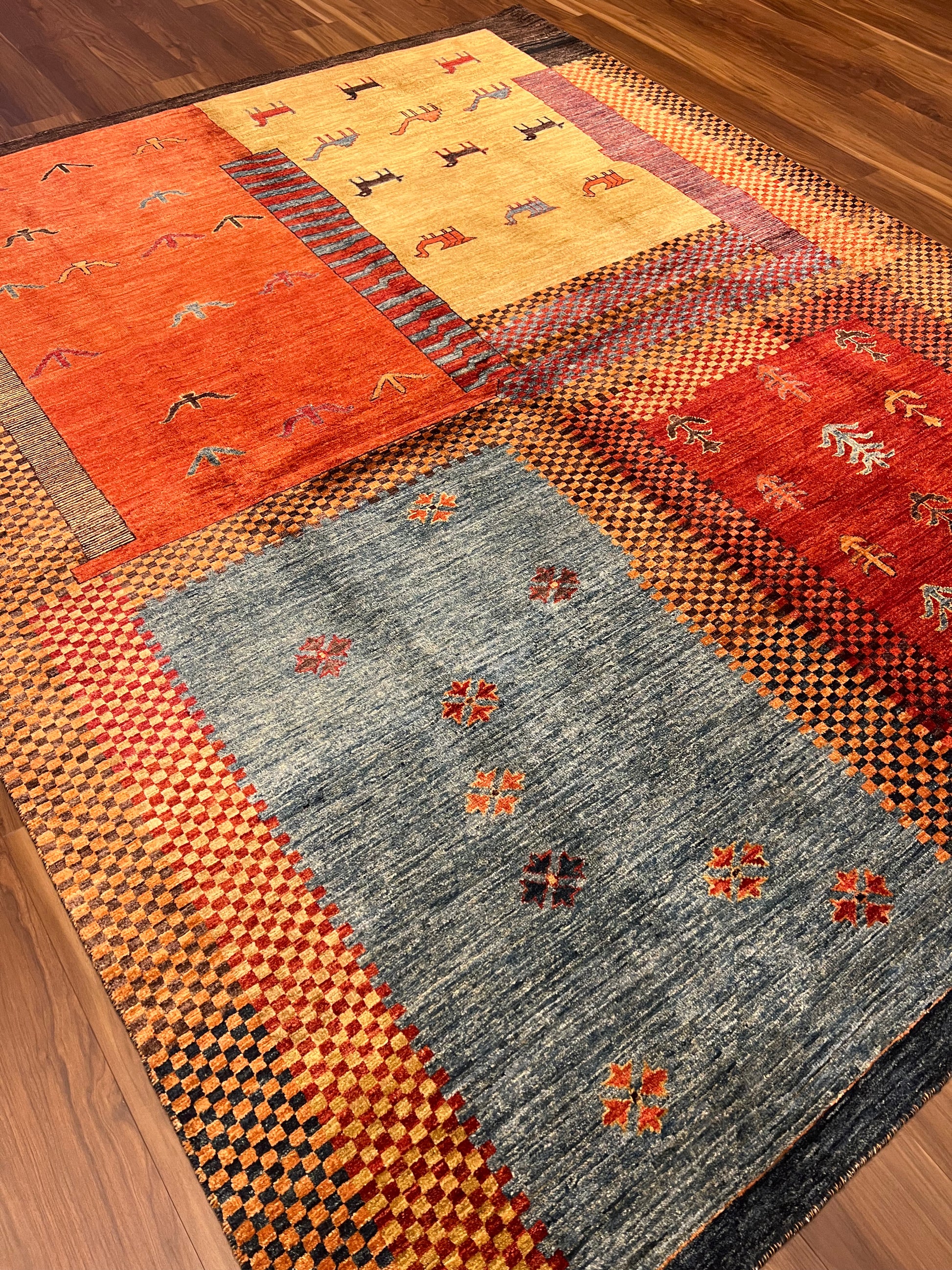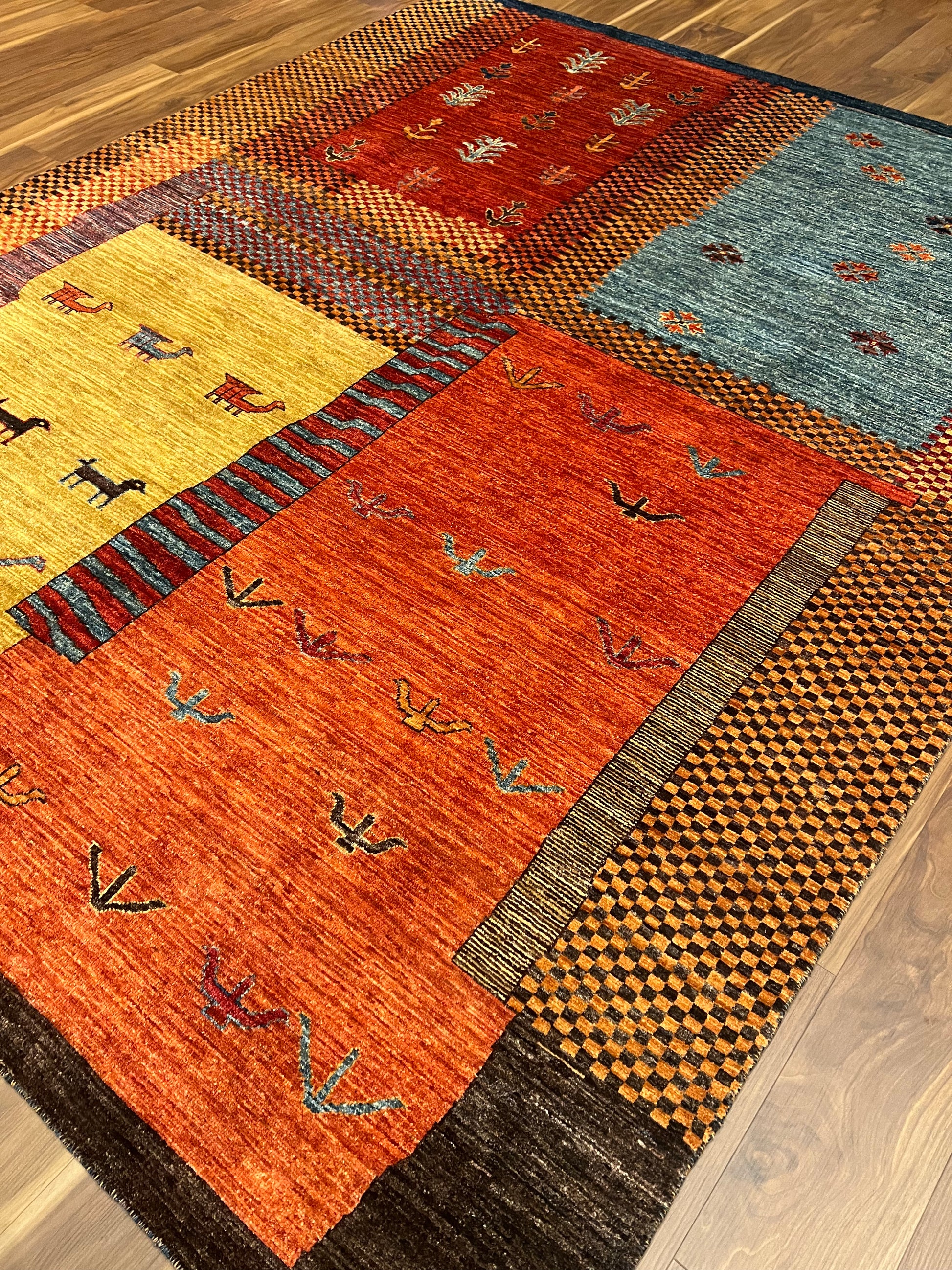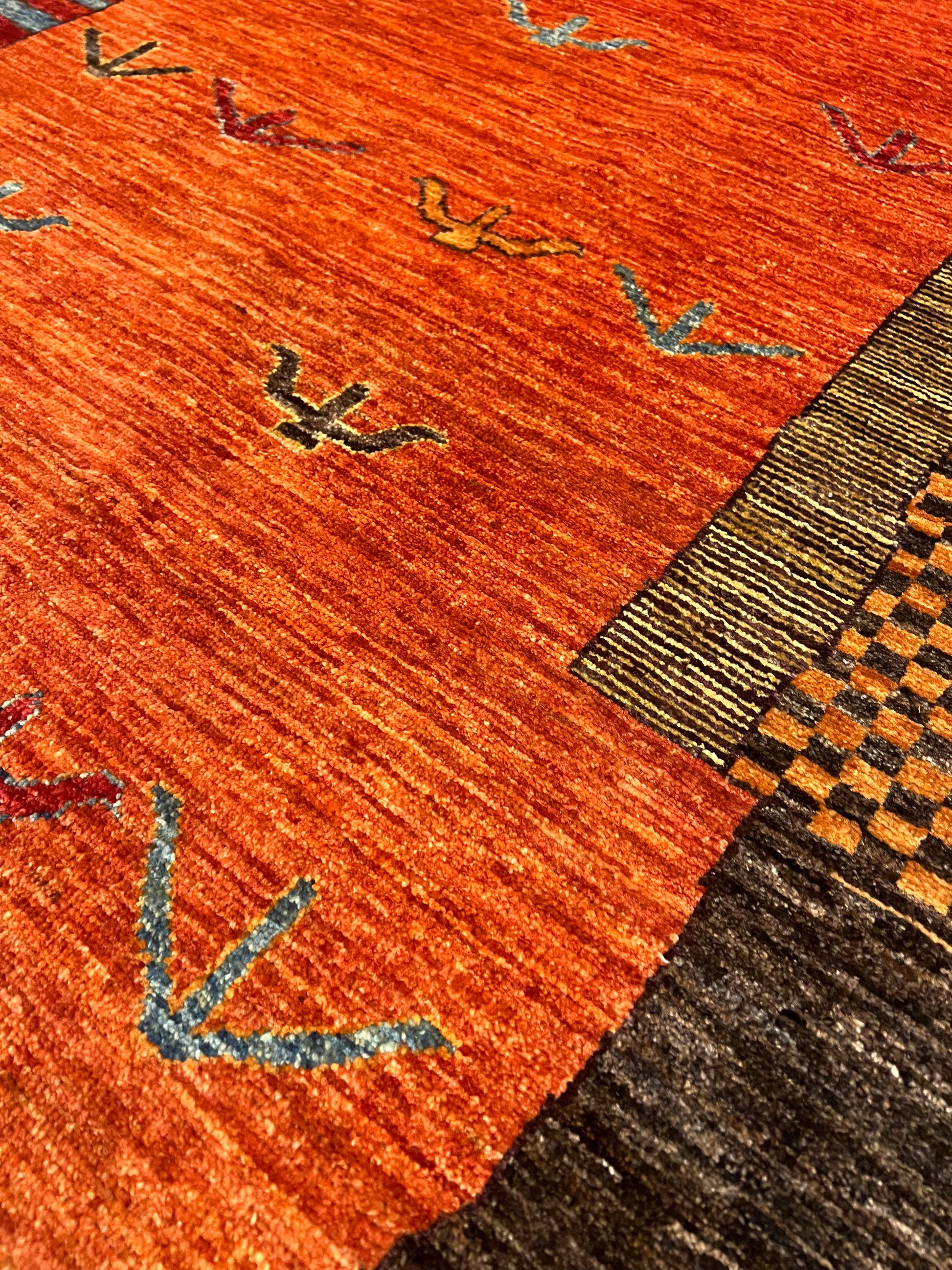 This exquisite Nomadic Gabbeh rug showcases the timeless artistry of traditional hand-weaving techniques. The piece is a symphony of warm tones, where earthy oranges and reds complement subtle blues and beiges. Drawing inspiration from the nomadic tribes, this rug features simple yet evocative animal and plant motifs, mirroring the connection between nature and the weaver's lifestyle. Its robust wool composition ensures both warmth and durability. Ideal for adding a touch of rustic charm to a room, this rug is a celebration of cultural heritage and artisanal craftsmanship.