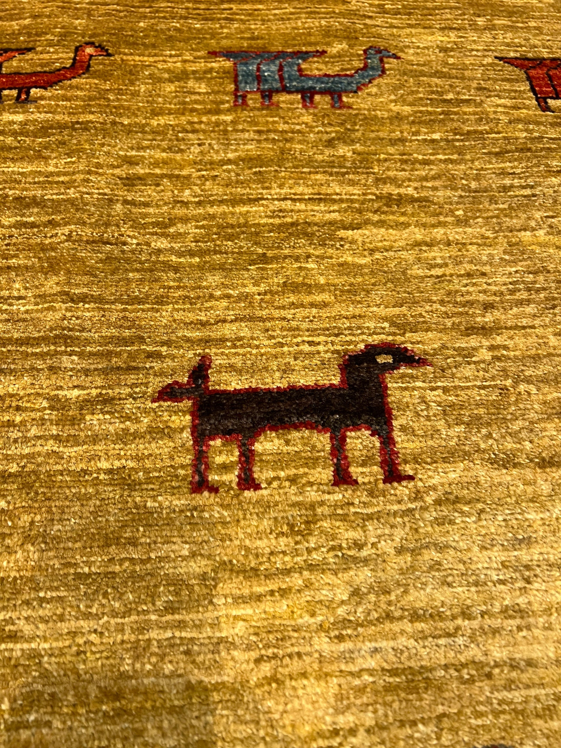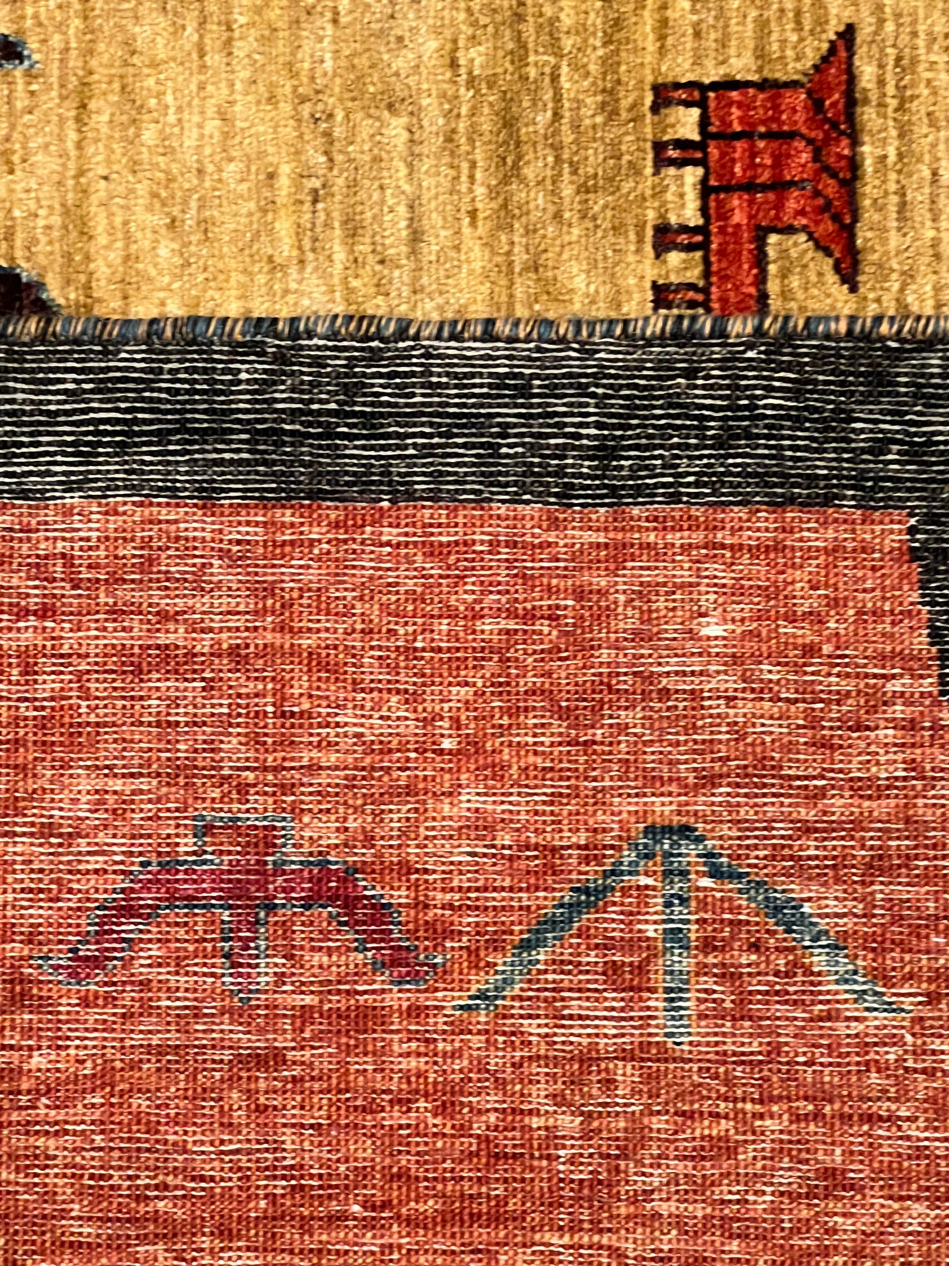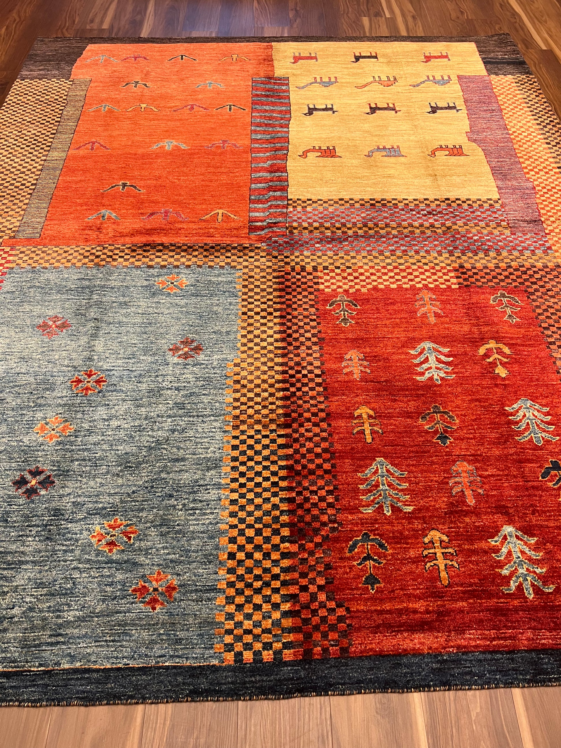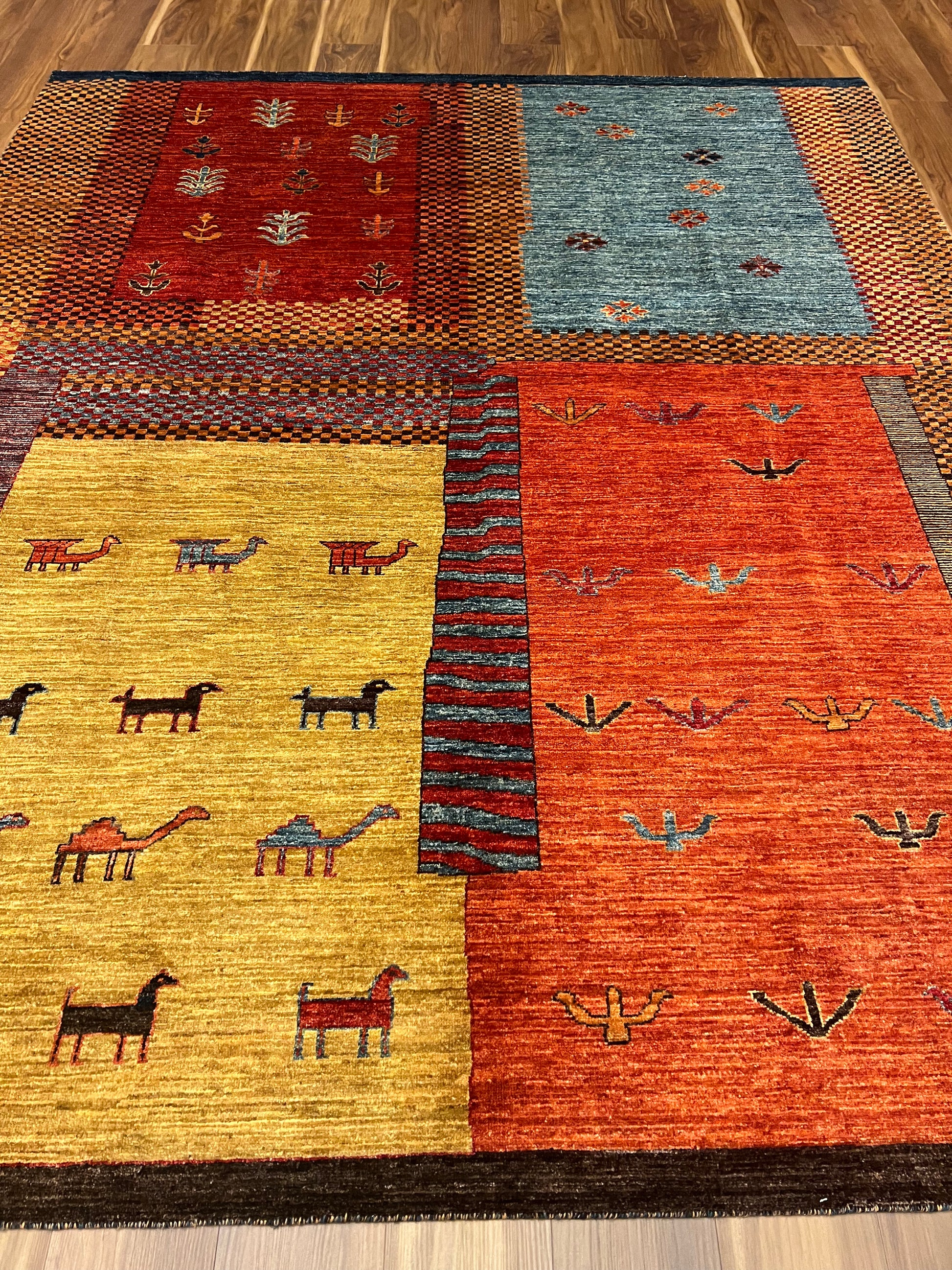 This exquisite Nomadic Gabbeh rug showcases the timeless artistry of traditional hand-weaving techniques. The piece is a symphony of warm tones, where earthy oranges and reds complement subtle blues and beiges. Drawing inspiration from the nomadic tribes, this rug features simple yet evocative animal and plant motifs, mirroring the connection between nature and the weaver's lifestyle. Its robust wool composition ensures both warmth and durability. Ideal for adding a touch of rustic charm to a room, this rug is a celebration of cultural heritage and artisanal craftsmanship.