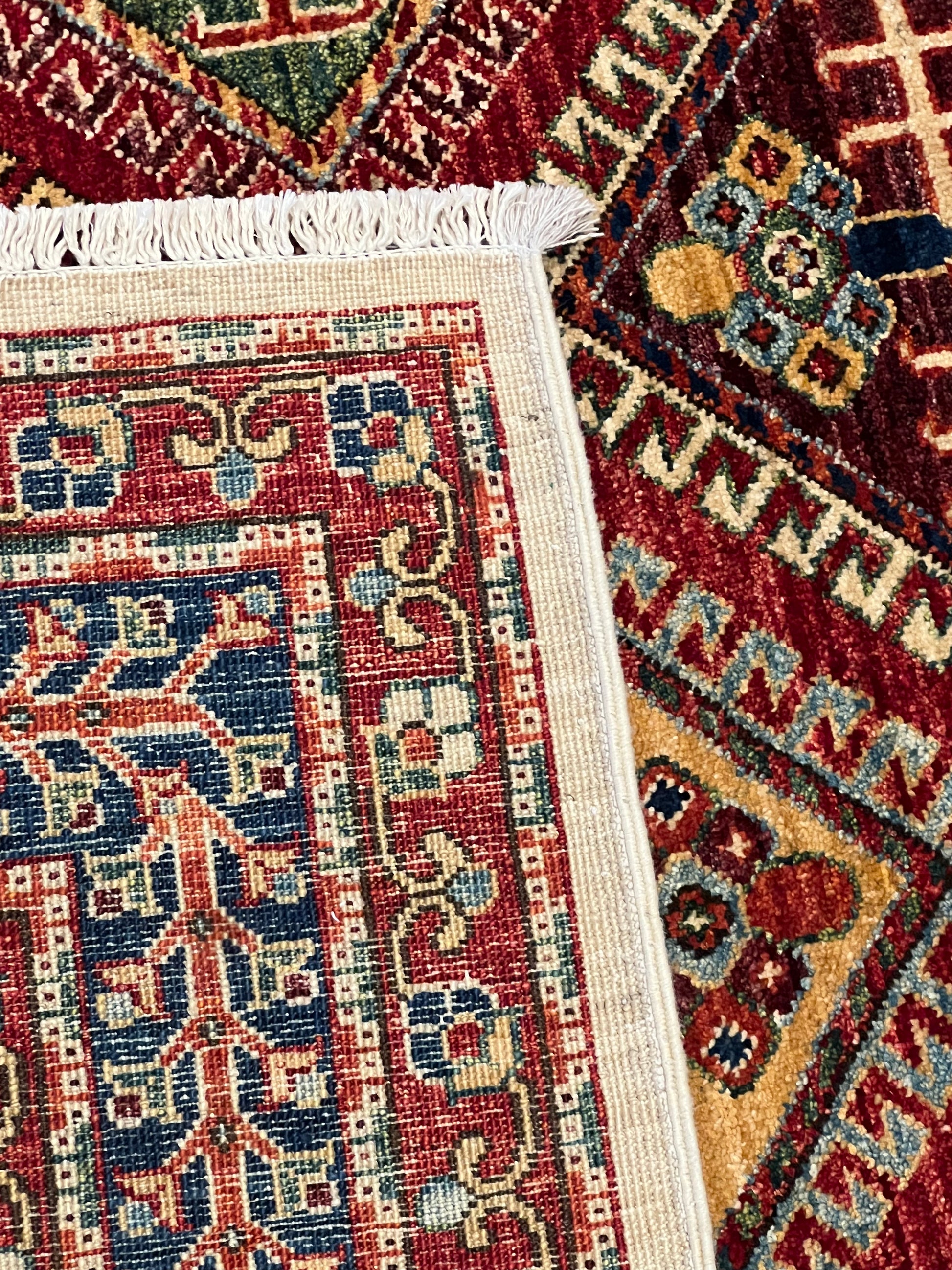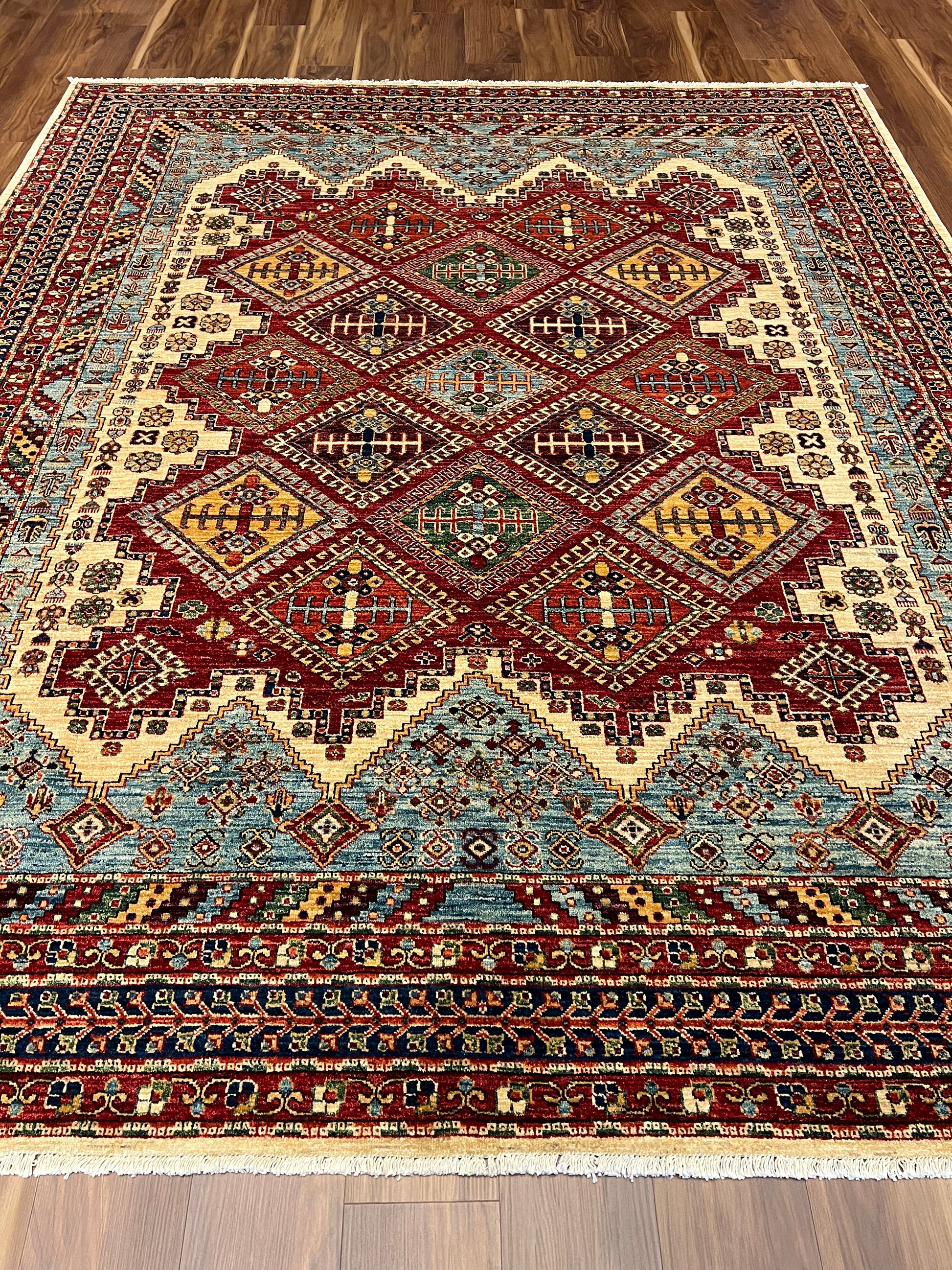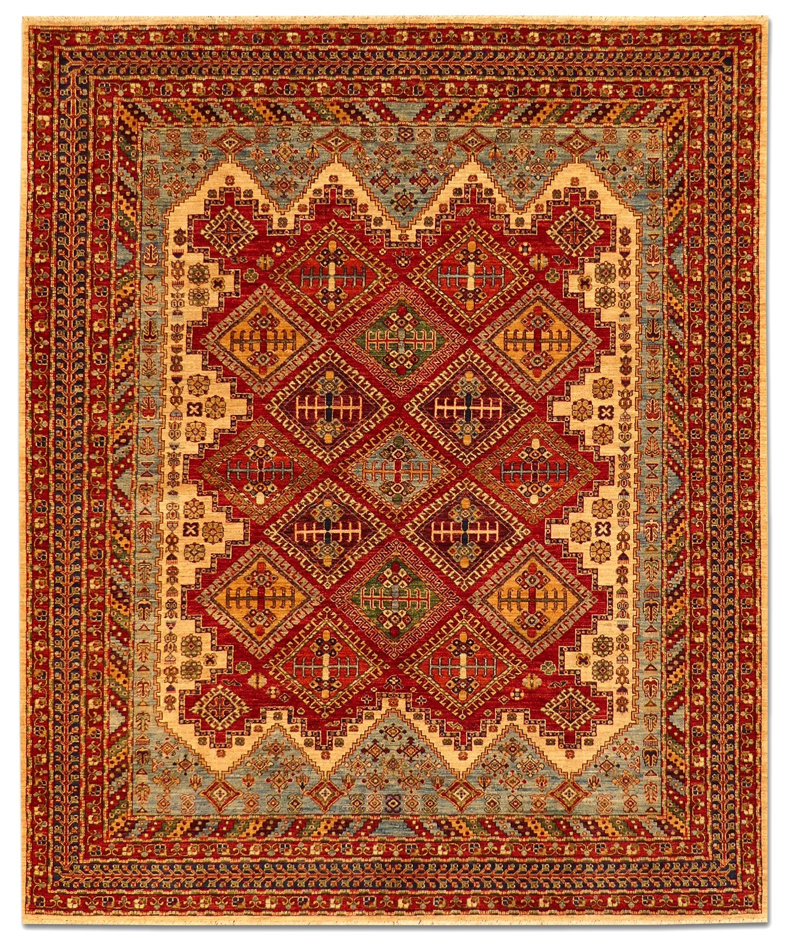 The Nomadic rug showcases a stunning traditional design that harks back to age-old weaving techniques of nomadic tribes. Woven from high-quality wool, it promises durability and comfort. The symmetrical pattern offers a harmonious blend of geometric shapes, accentuated by a rich palette of red, beige, and subtle hints of blue. This rug will bring warmth and cultural richness to any space, making it a timeless centerpiece.