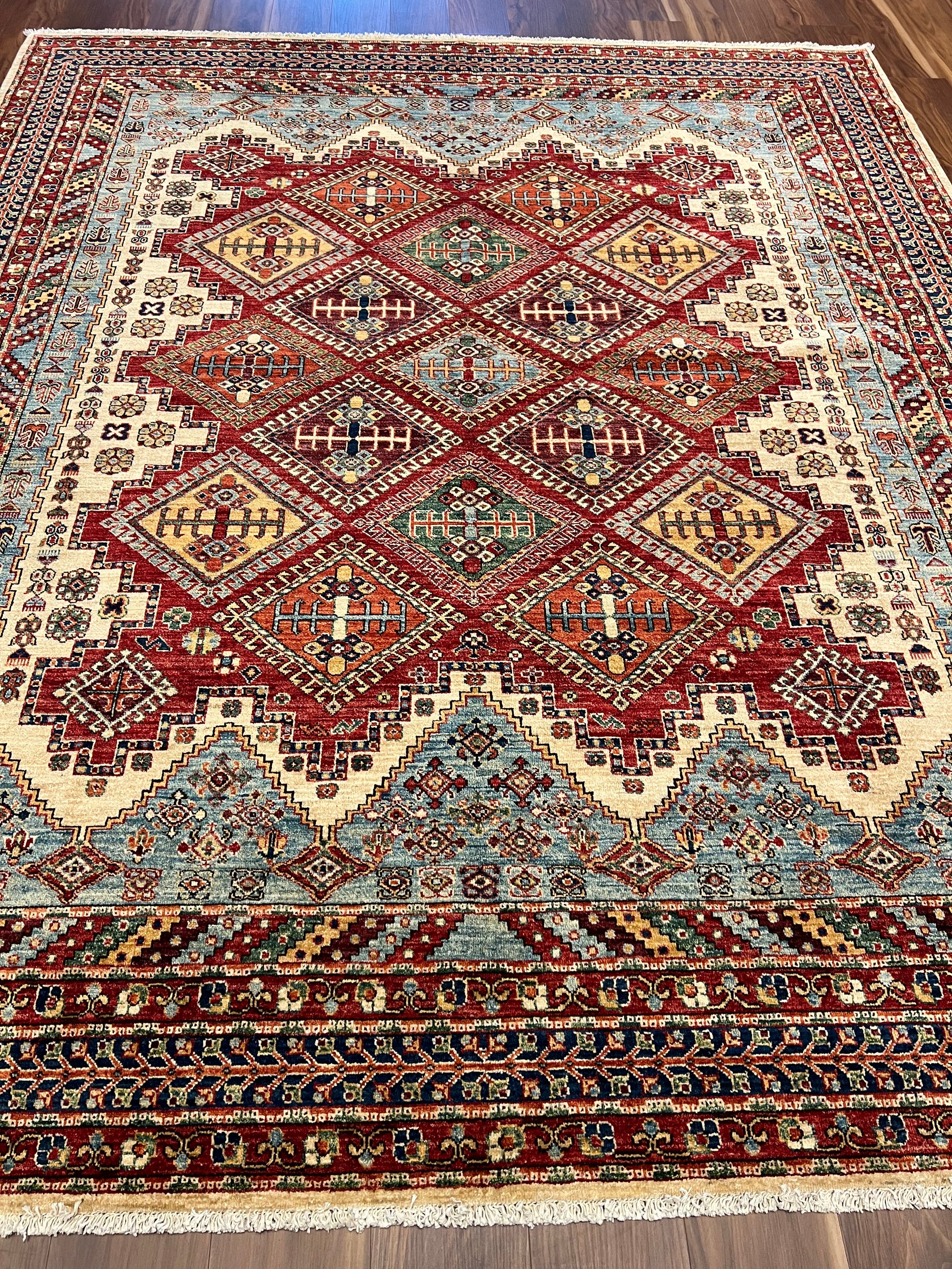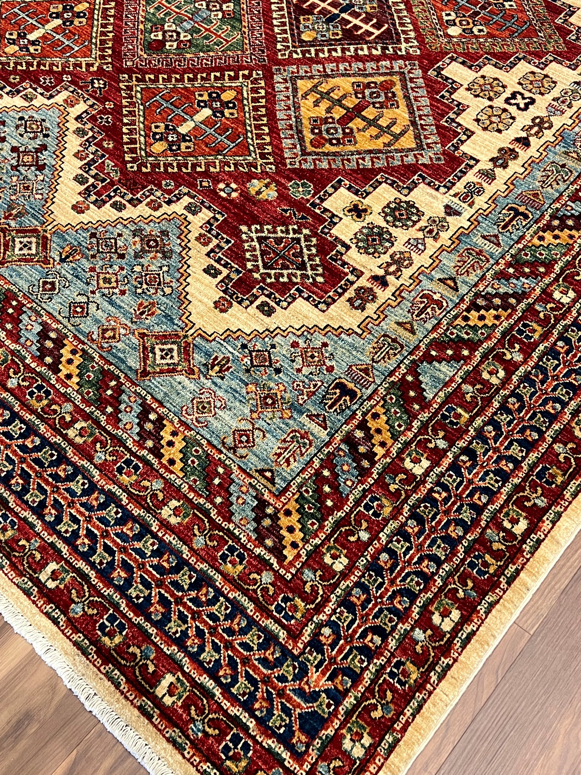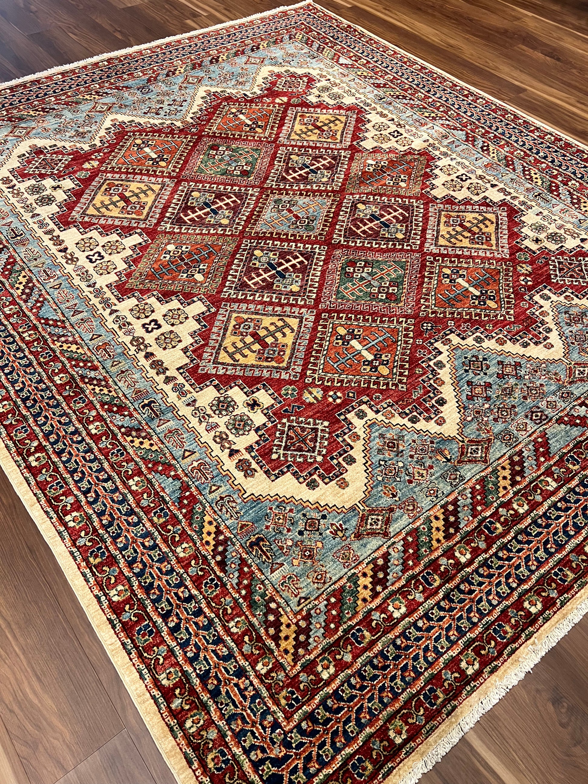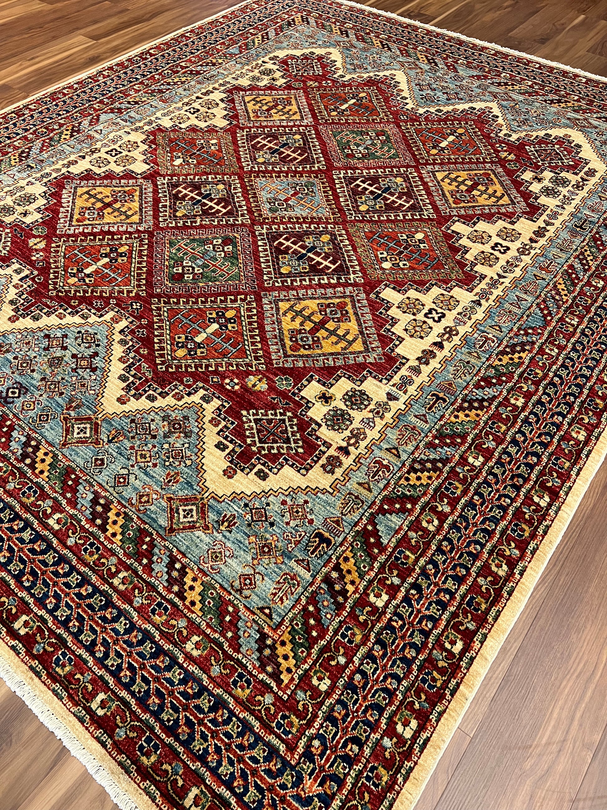 The Nomadic rug showcases a stunning traditional design that harks back to age-old weaving techniques of nomadic tribes. Woven from high-quality wool, it promises durability and comfort. The symmetrical pattern offers a harmonious blend of geometric shapes, accentuated by a rich palette of red, beige, and subtle hints of blue. This rug will bring warmth and cultural richness to any space, making it a timeless centerpiece.