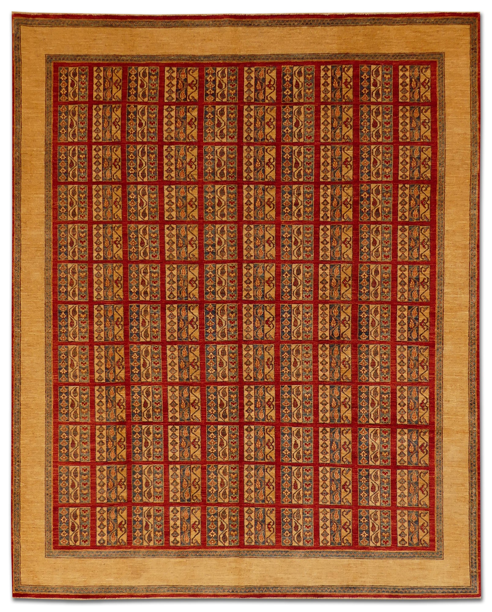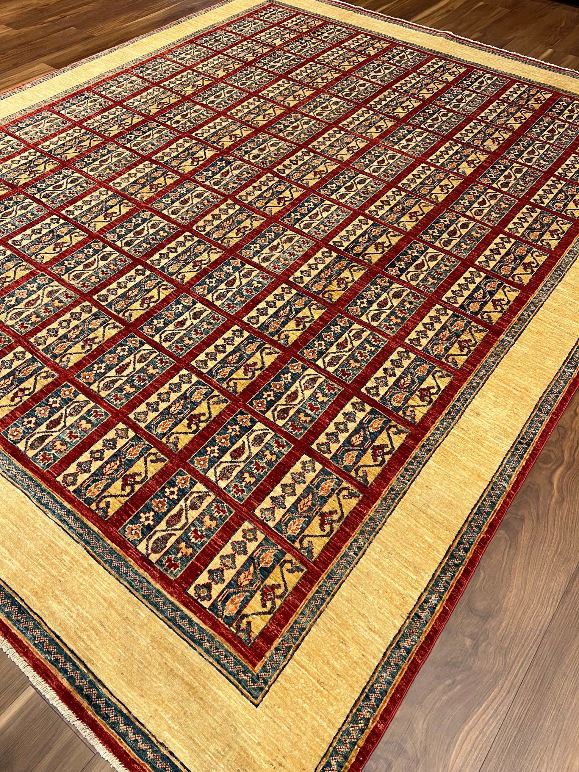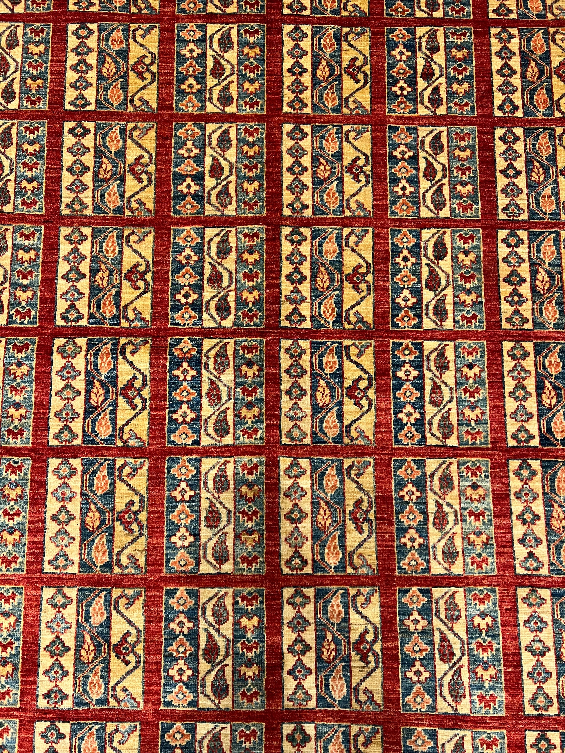 This exquisite Nomadic Shahel Sal rug is an epitome of traditional craftsmanship. Woven by skilled artisans, it features a distinguished geometric pattern complemented by floral motifs inside each repeating panel, juxtaposed against a vibrant red field. The intricate design and rich colors reflect a timeless aesthetic that pays homage to nomadic heritage. The robust wool material ensures durability, promising a long-standing addition to any space. Exuding elegance and cultural richness, this rug is an ideal choice for collectors and enthusiasts of classic decor.