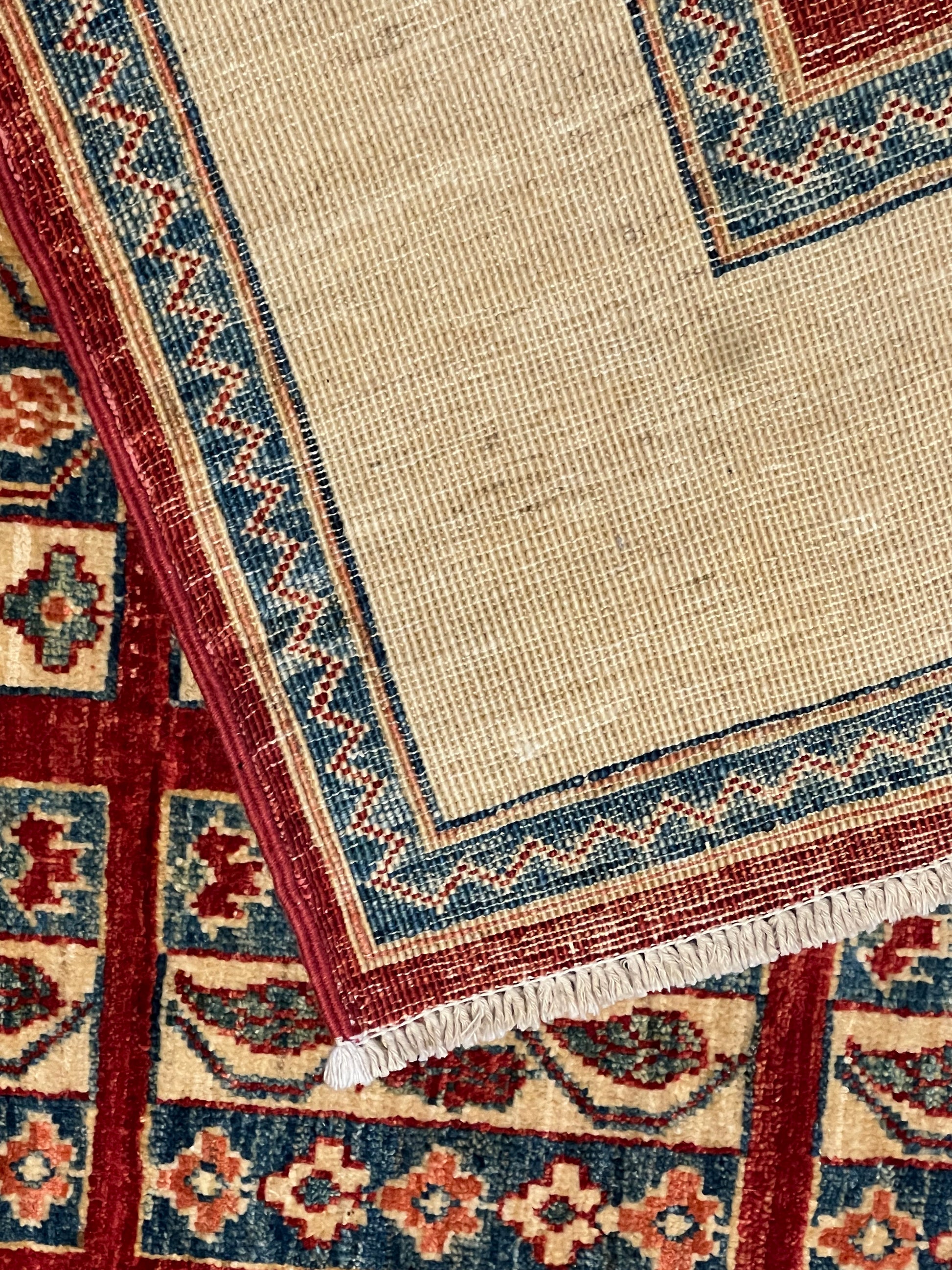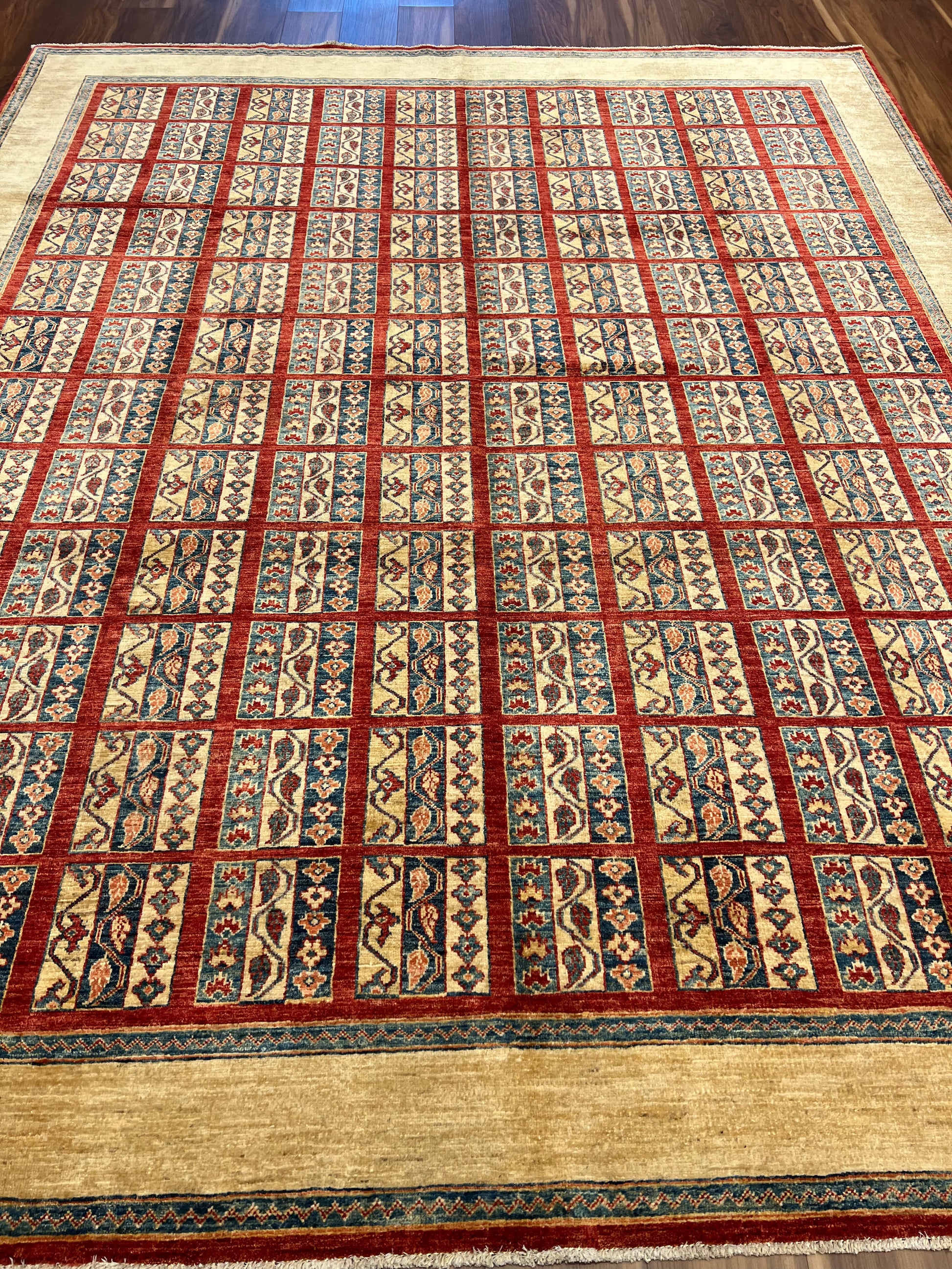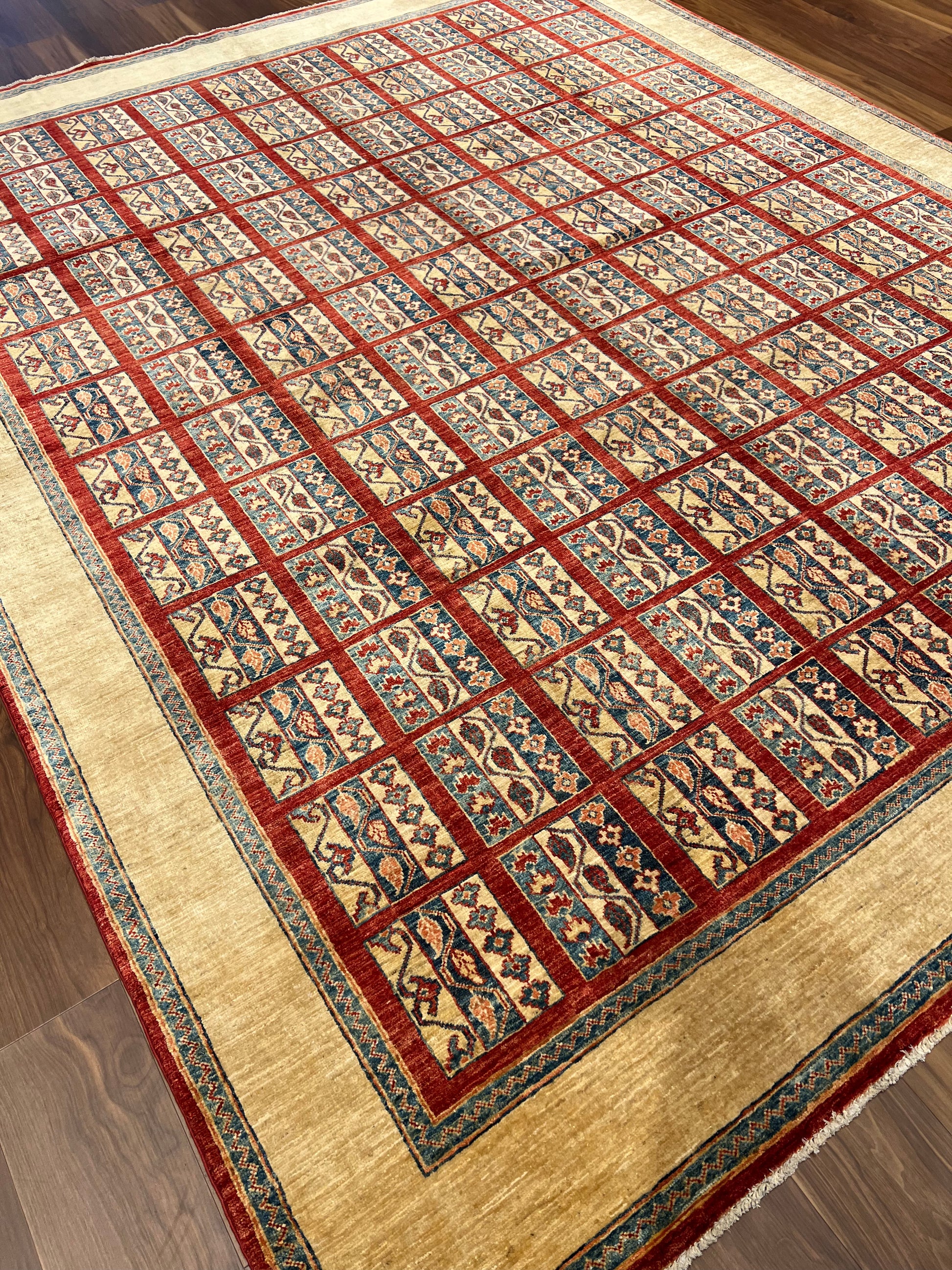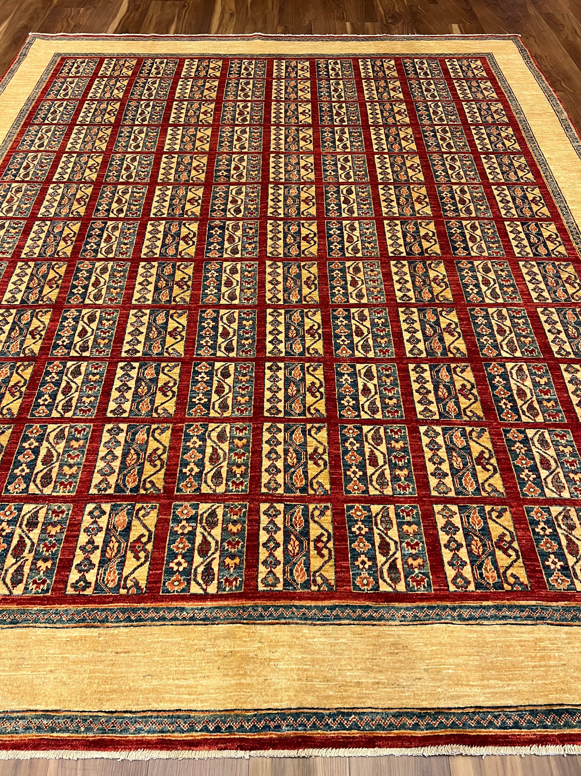 This exquisite Nomadic Shahel Sal rug is an epitome of traditional craftsmanship. Woven by skilled artisans, it features a distinguished geometric pattern complemented by floral motifs inside each repeating panel, juxtaposed against a vibrant red field. The intricate design and rich colors reflect a timeless aesthetic that pays homage to nomadic heritage. The robust wool material ensures durability, promising a long-standing addition to any space. Exuding elegance and cultural richness, this rug is an ideal choice for collectors and enthusiasts of classic decor.