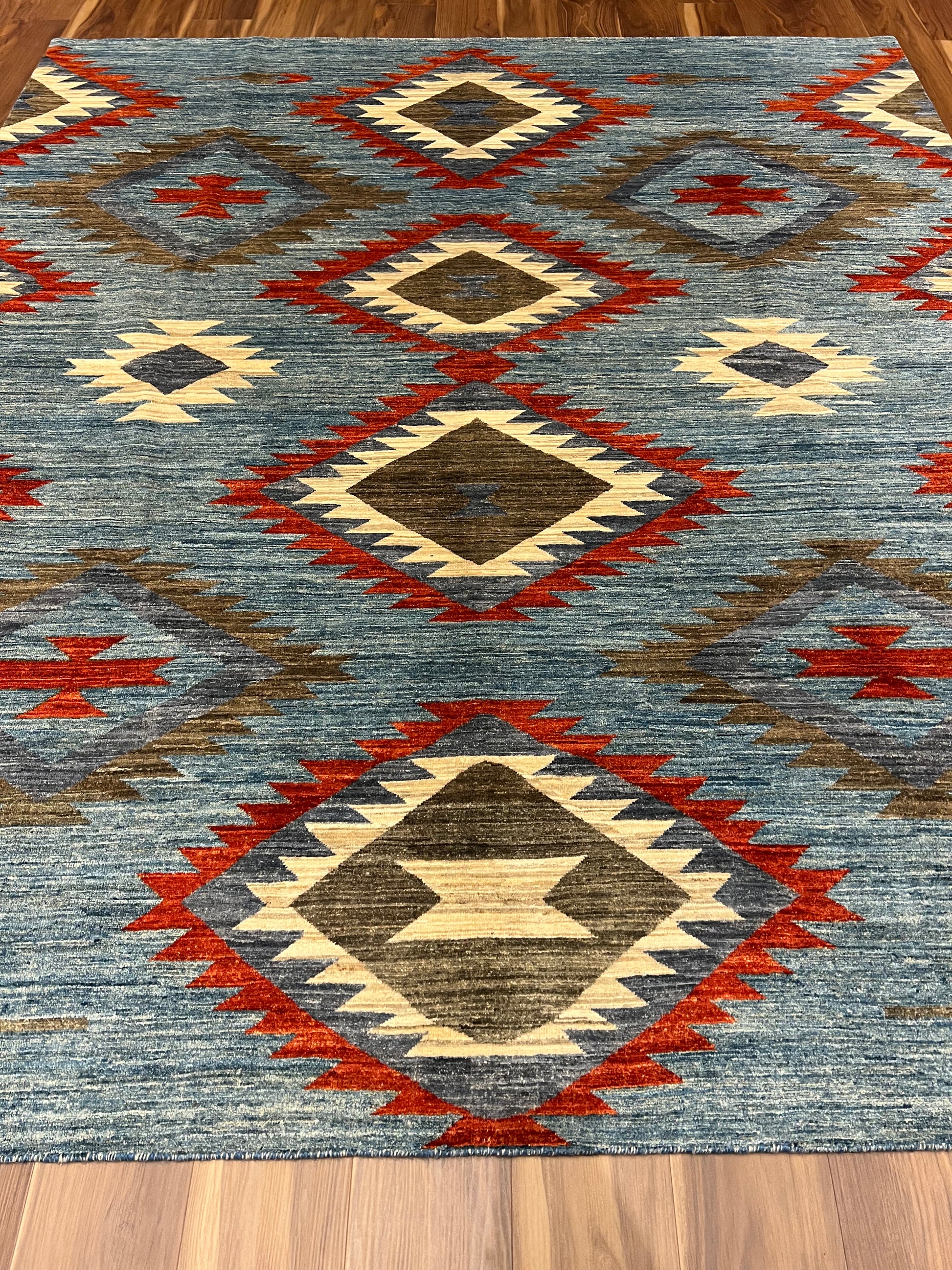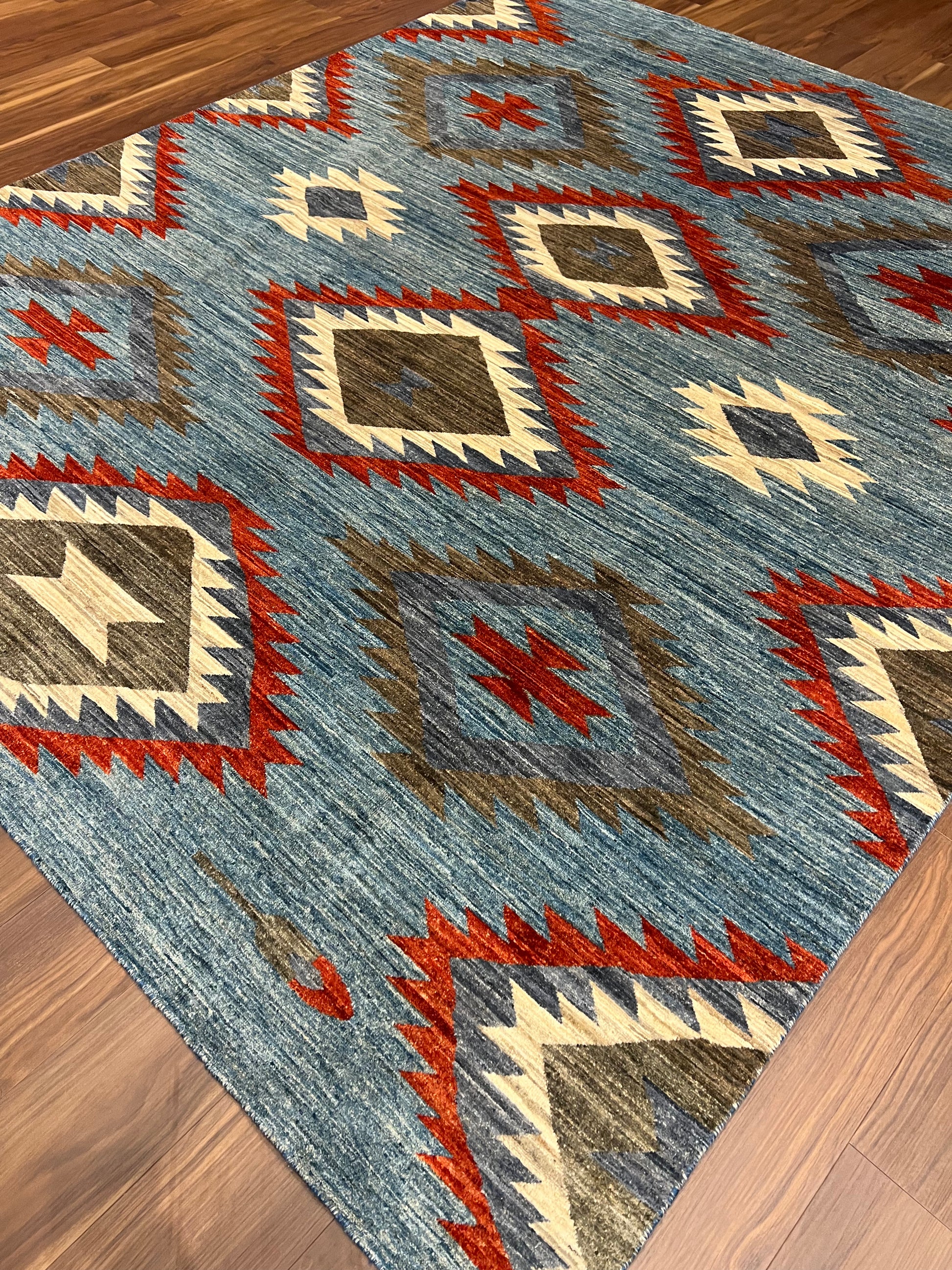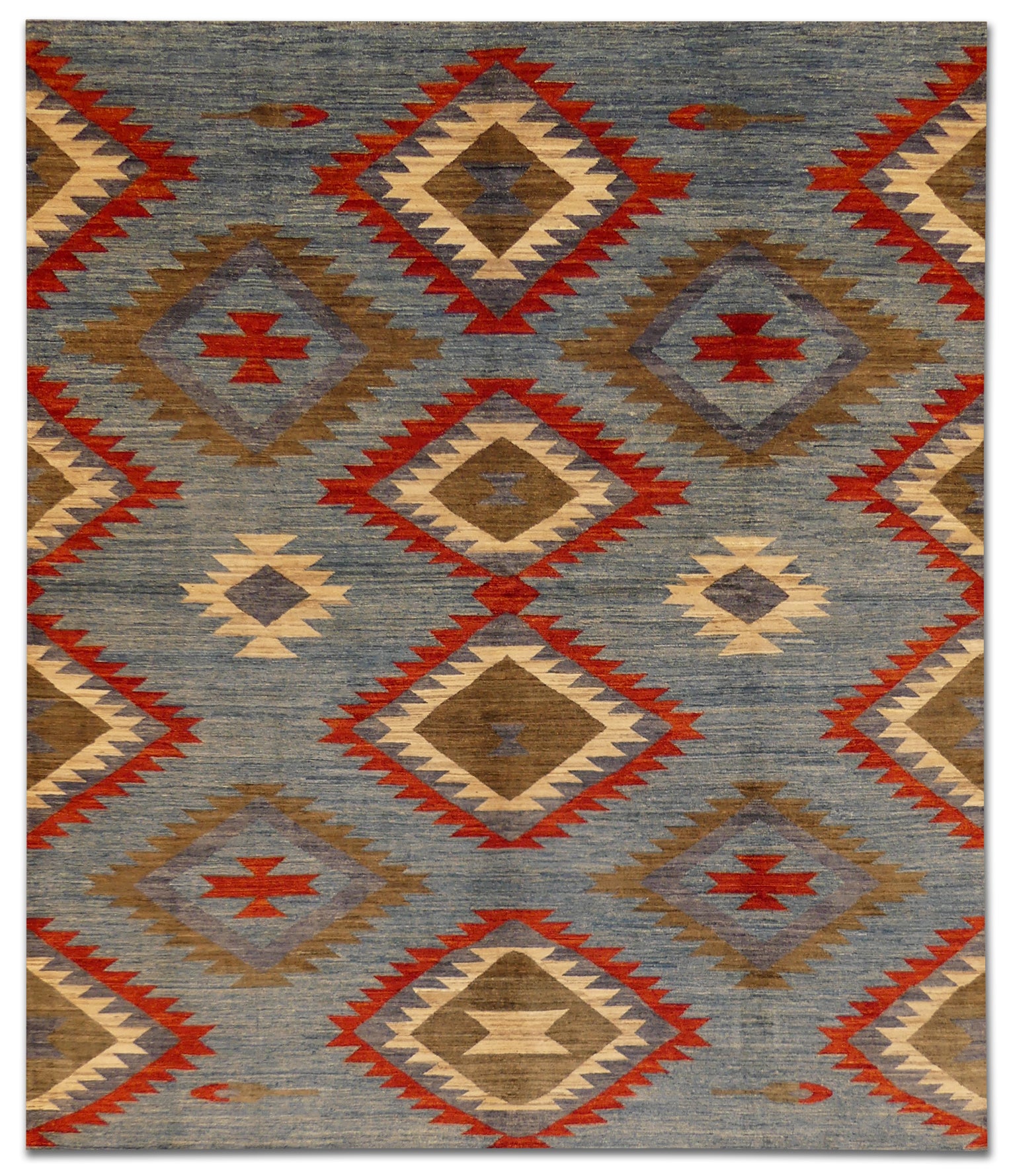 This exquisite Novajo rug showcases a unique Southwestern style that embodies both tradition and modernity. The wool material ensures durability and comfort. Patterned with diamonds and other geometric shapes, this piece radiates warmth through its earthy tones and vibrant red accents, making it an ideal addition to any room seeking a touch of rustic elegance.
