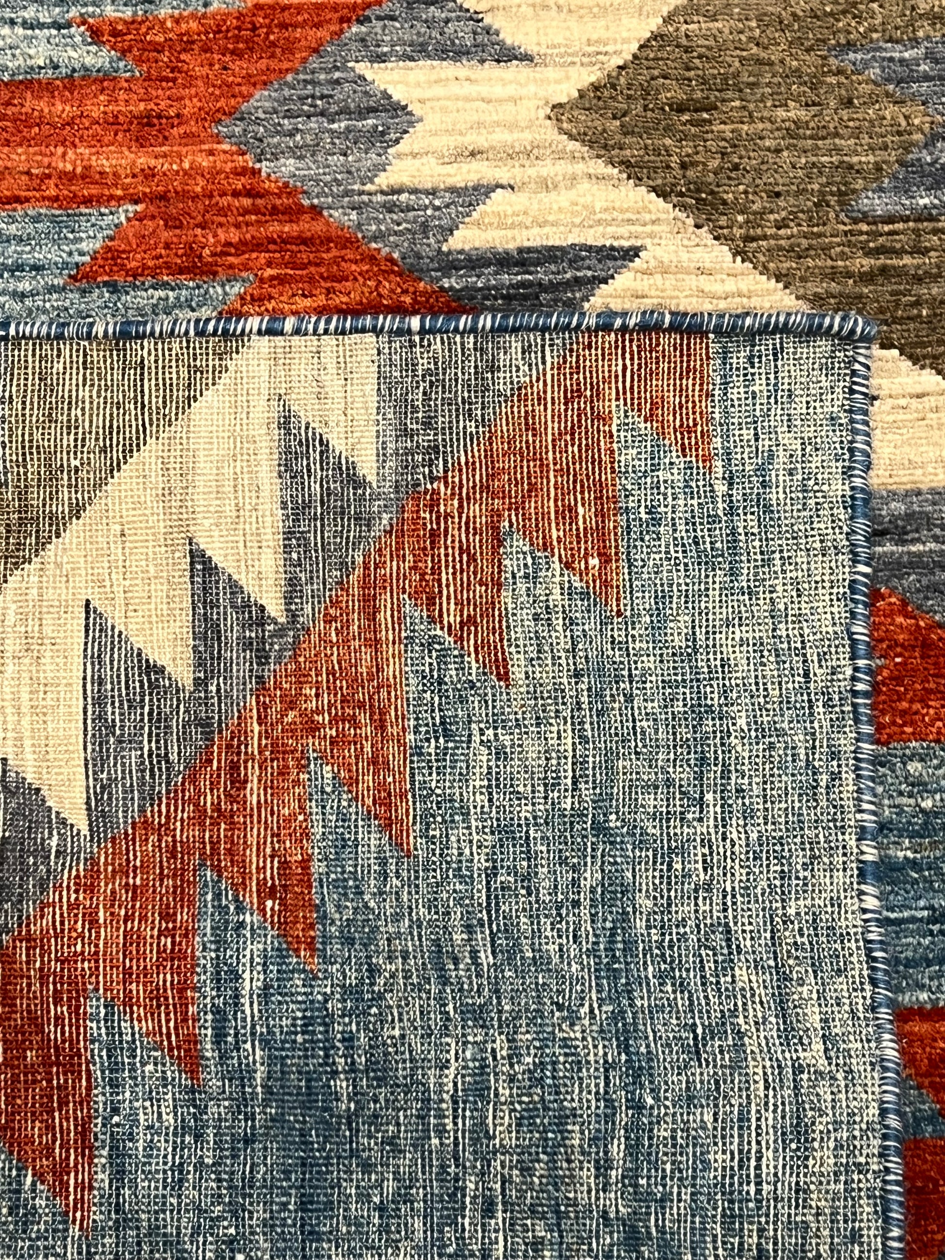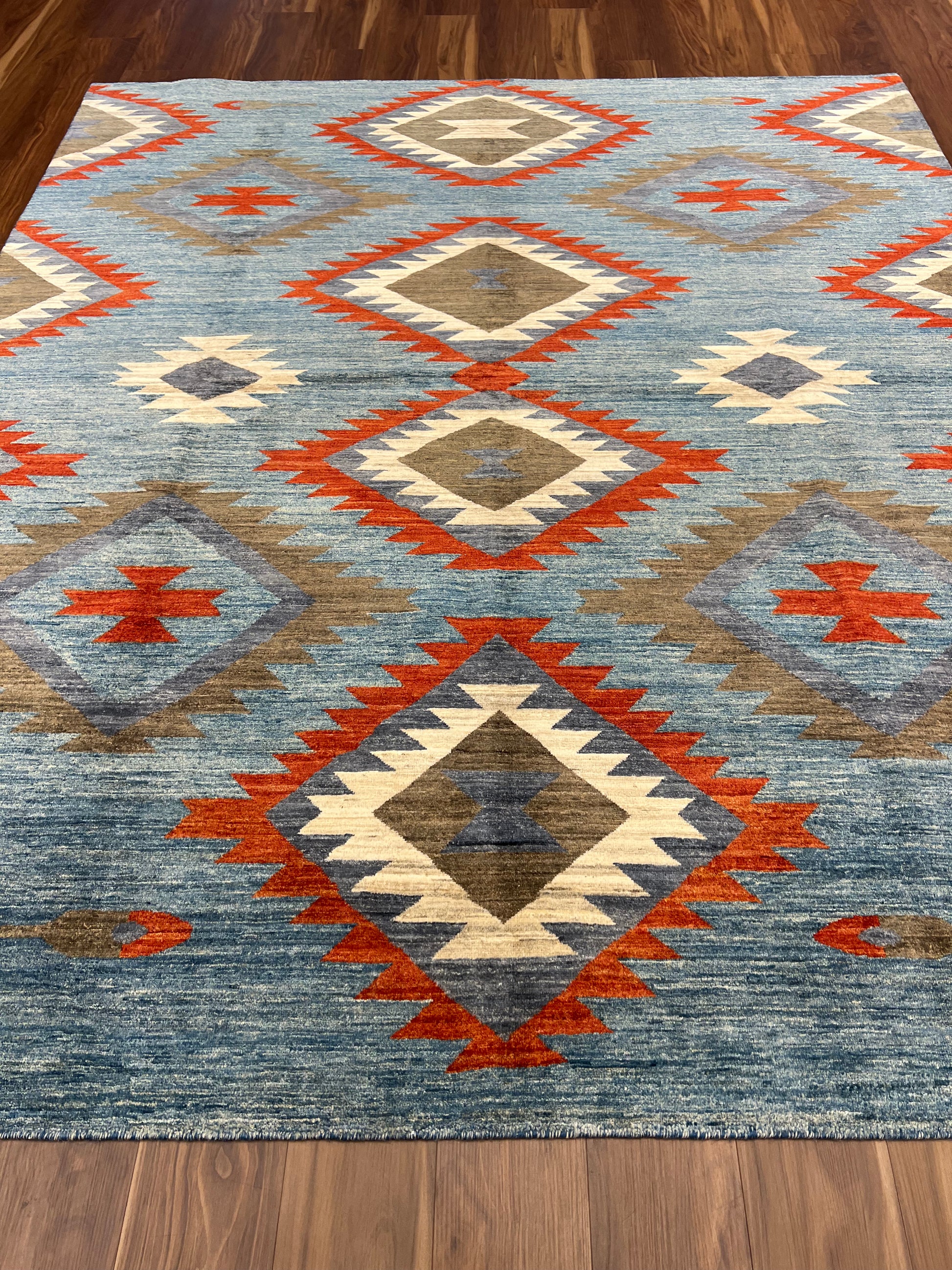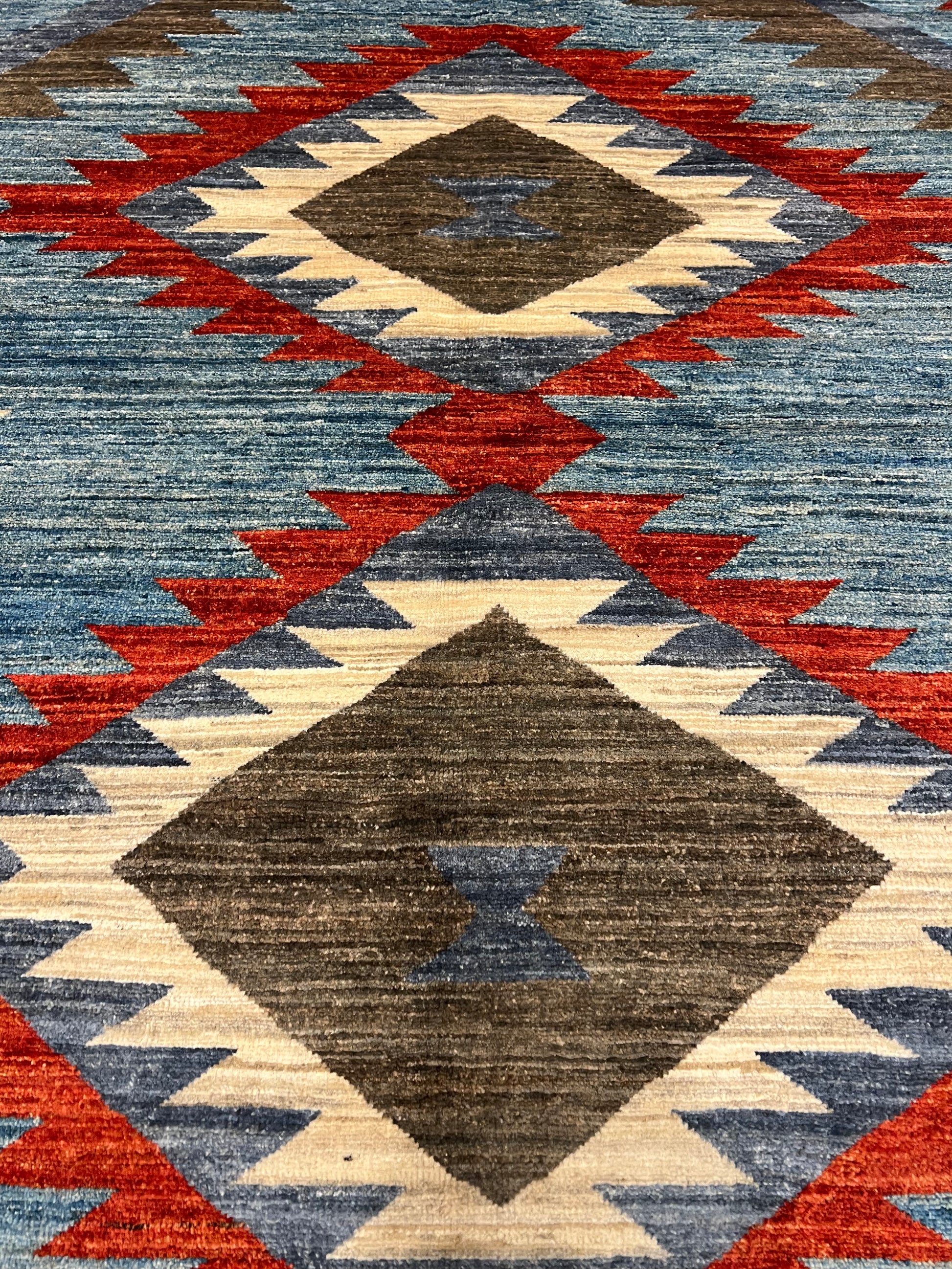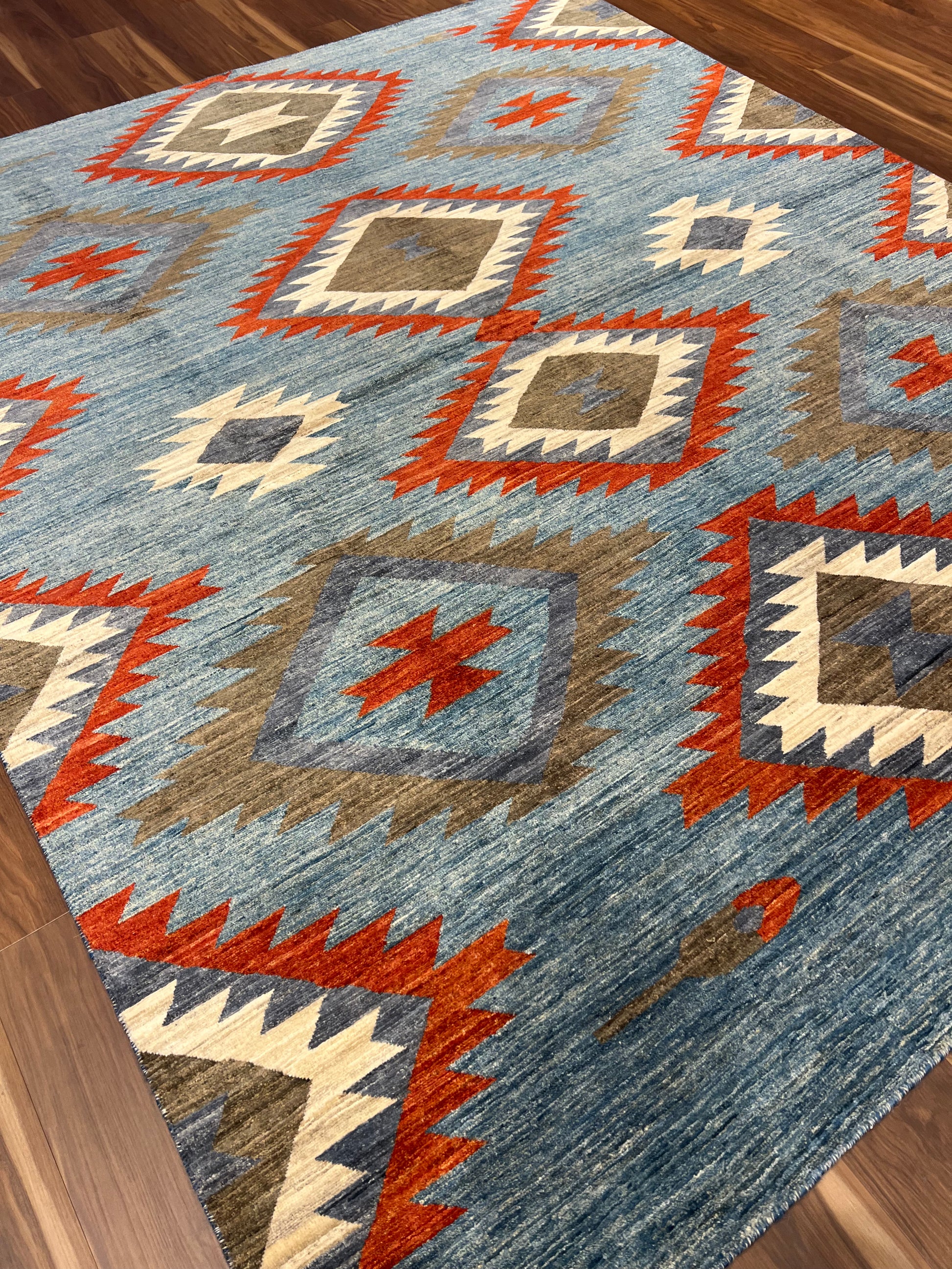 This exquisite Novajo rug showcases a unique Southwestern style that embodies both tradition and modernity. The wool material ensures durability and comfort. Patterned with diamonds and other geometric shapes, this piece radiates warmth through its earthy tones and vibrant red accents, making it an ideal addition to any room seeking a touch of rustic elegance.