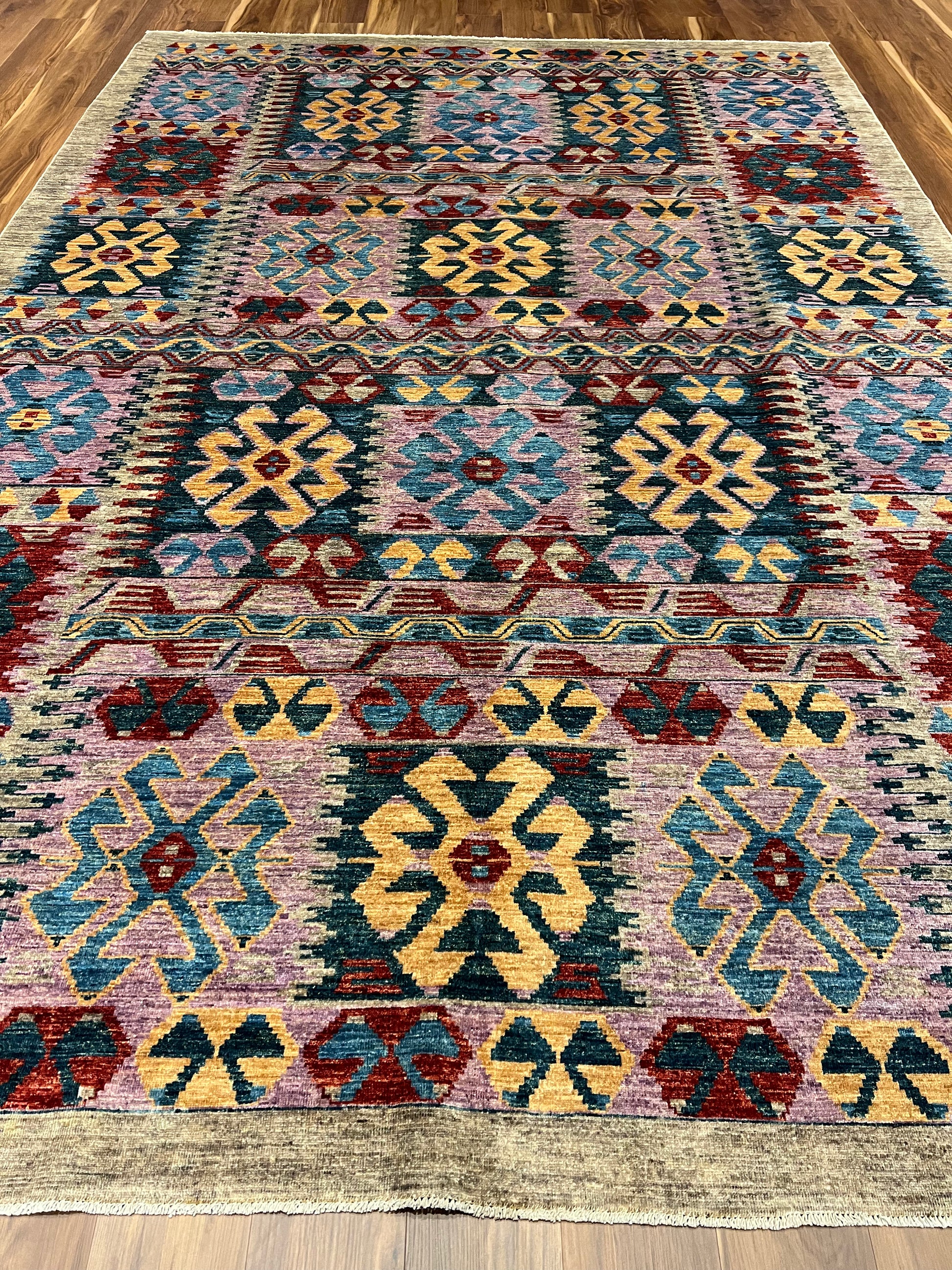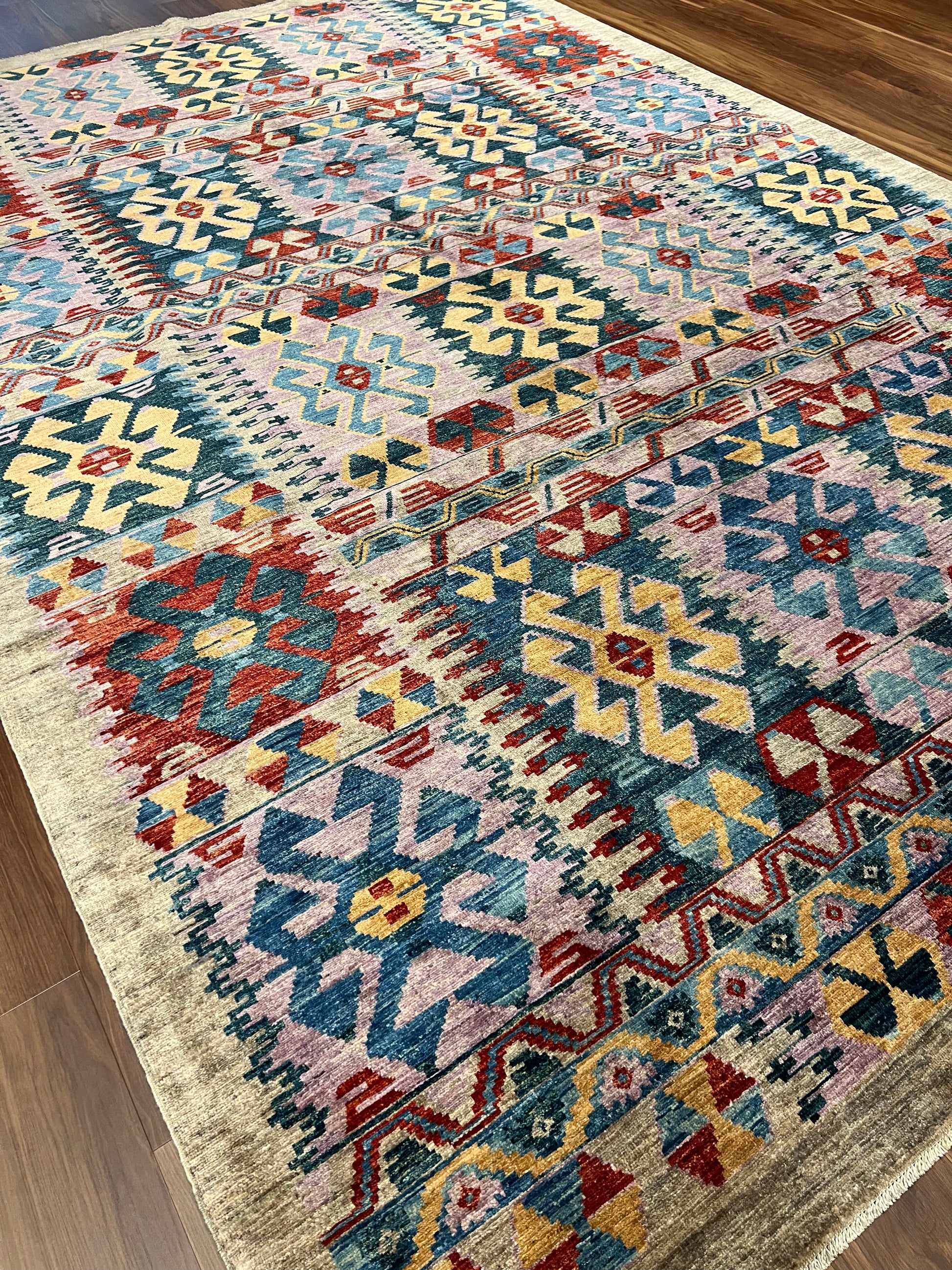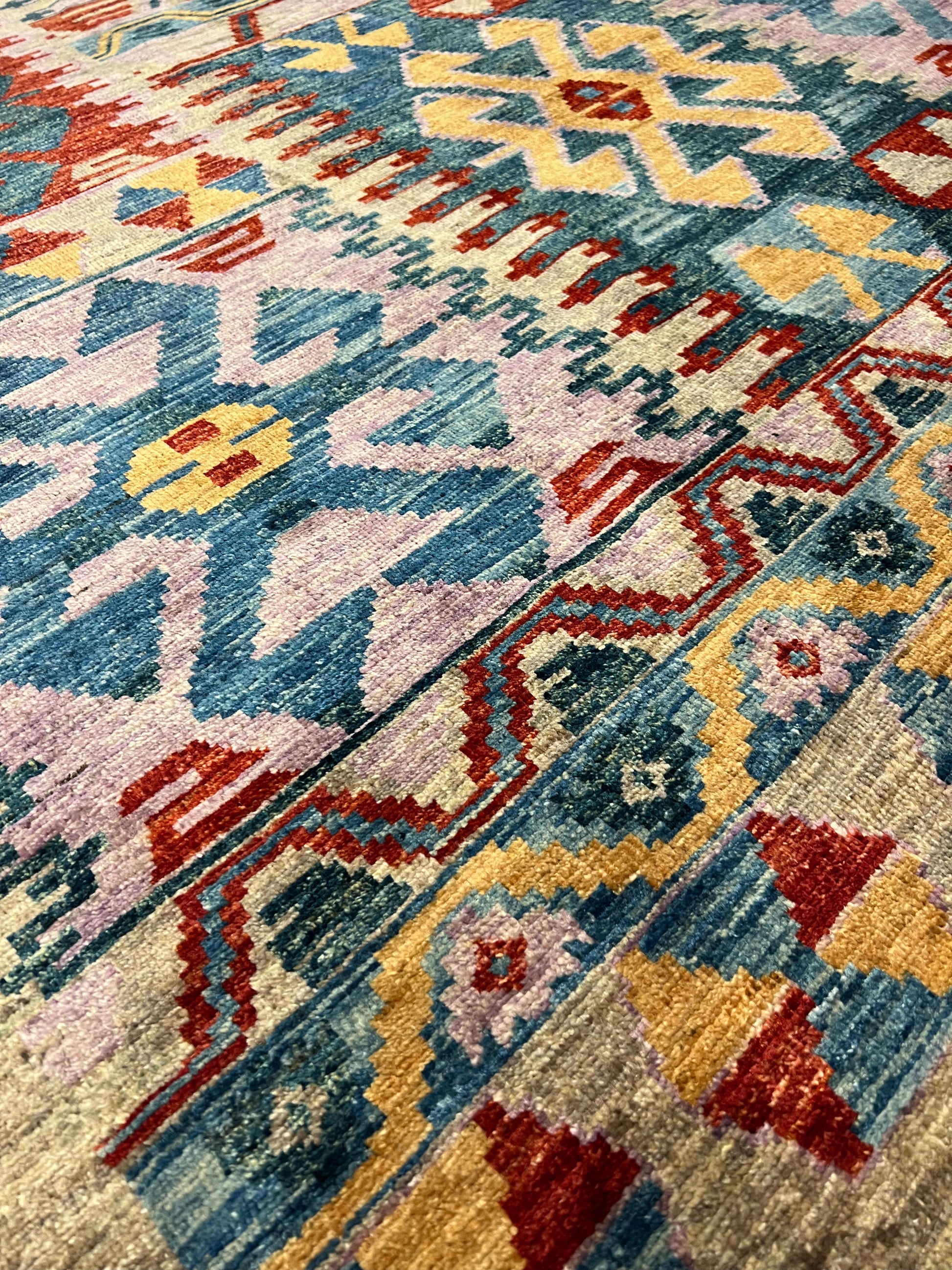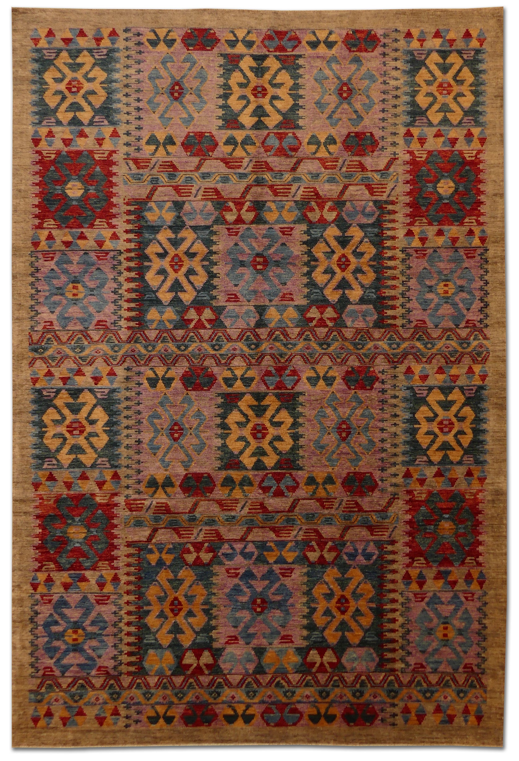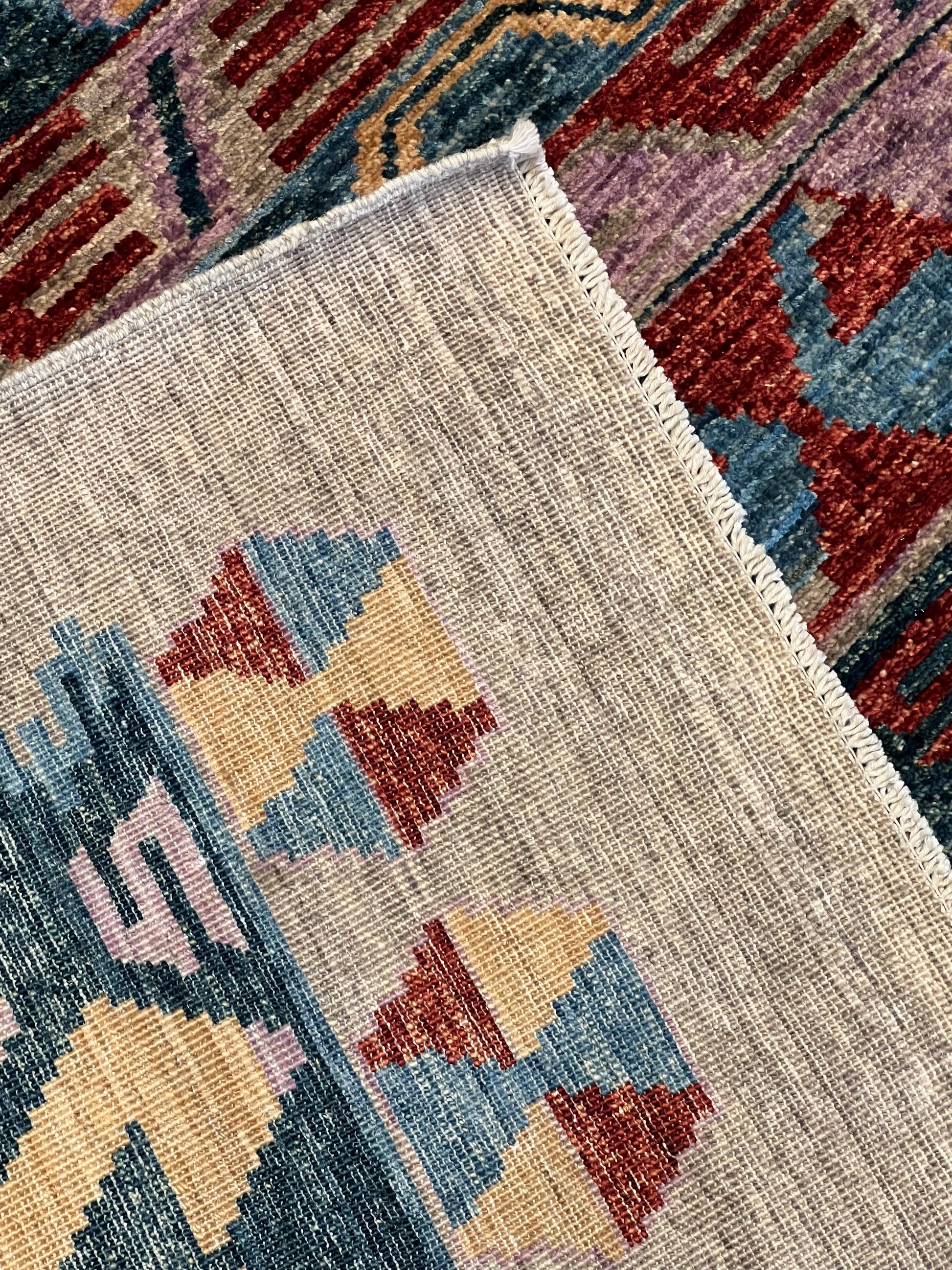 The 'Navajo' Wool Rug showcases a warm beige base adorned with vibrant red and blue traditional motifs. Its design is inspired by Native American art, featuring richly symbolic geometric patterns that represent various natural elements and storytelling. Each section is meticulously crafted, producing a harmonious balance of color and form that captures the essence of Navajo weaving. Perfect for adding a touch of timeless elegance and cultural richness to any room.