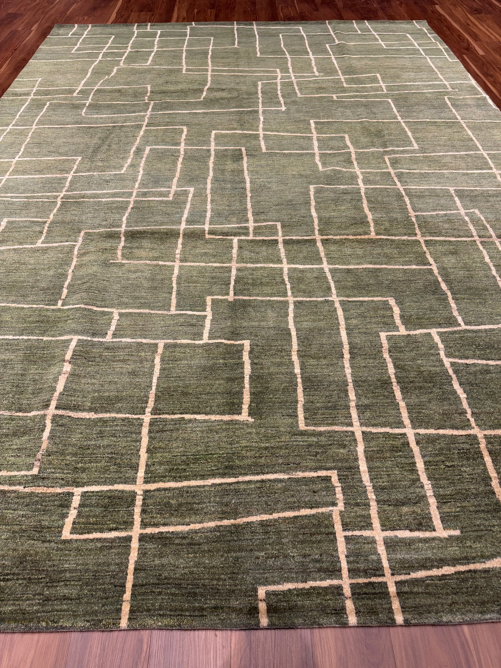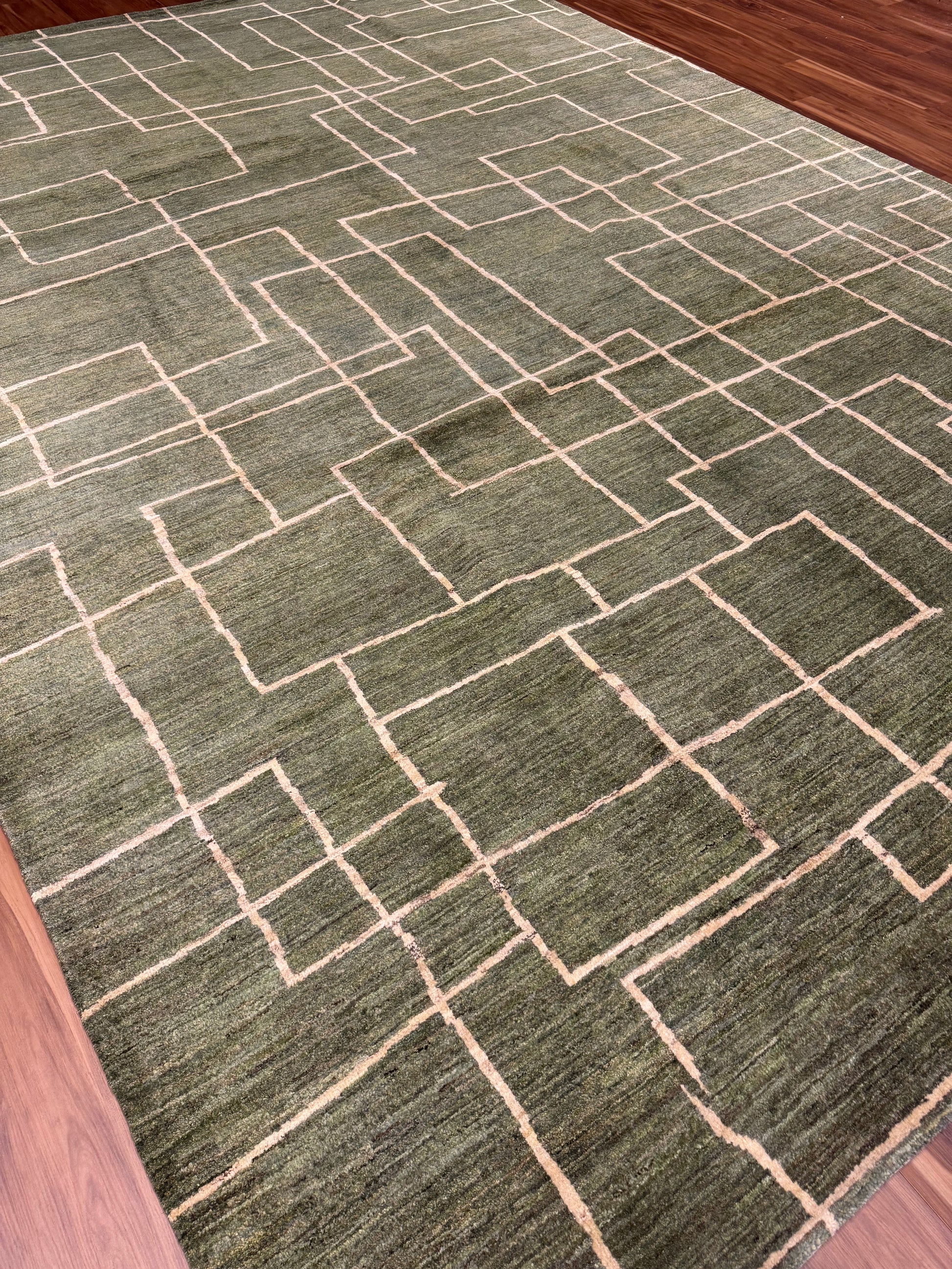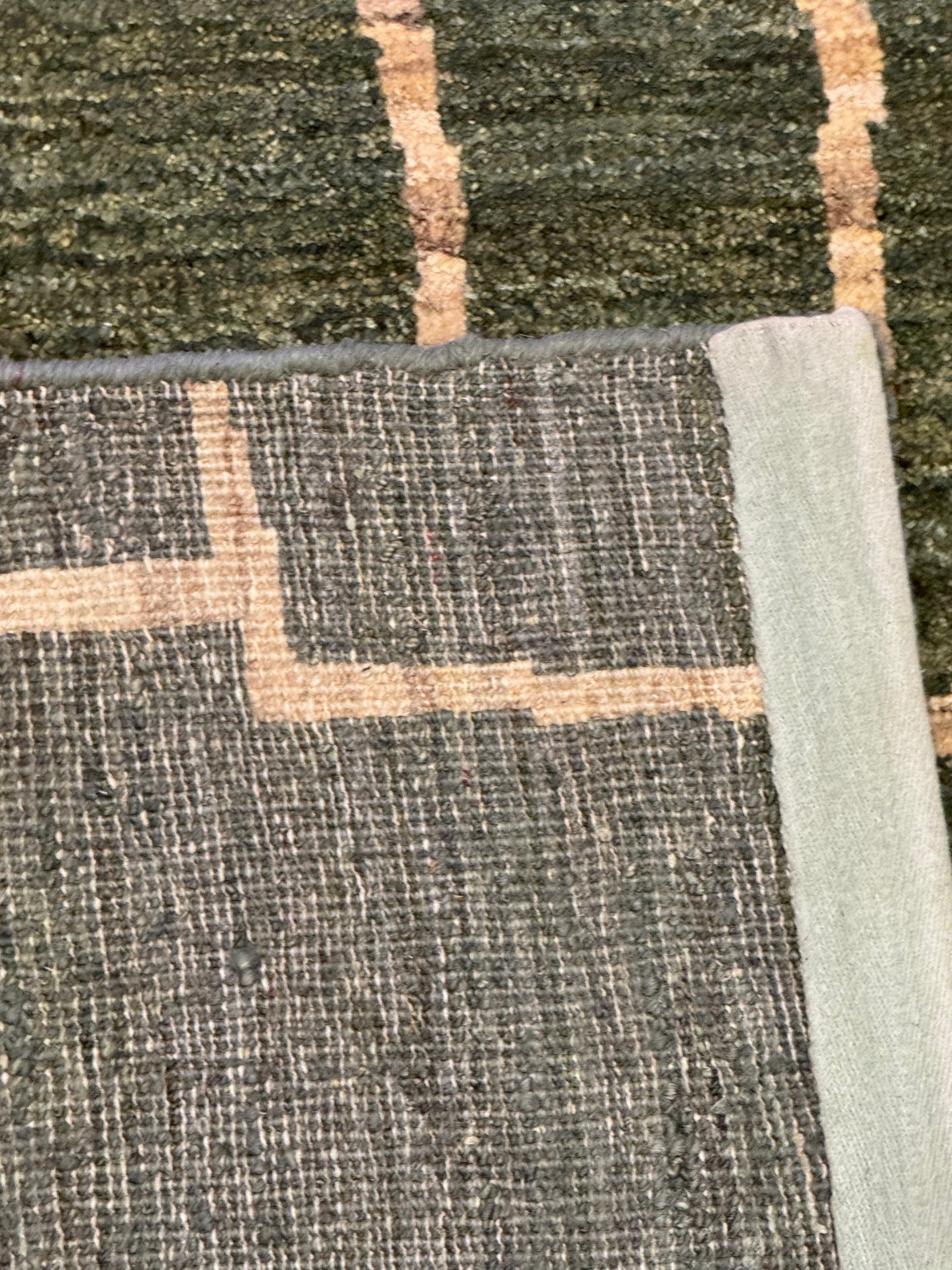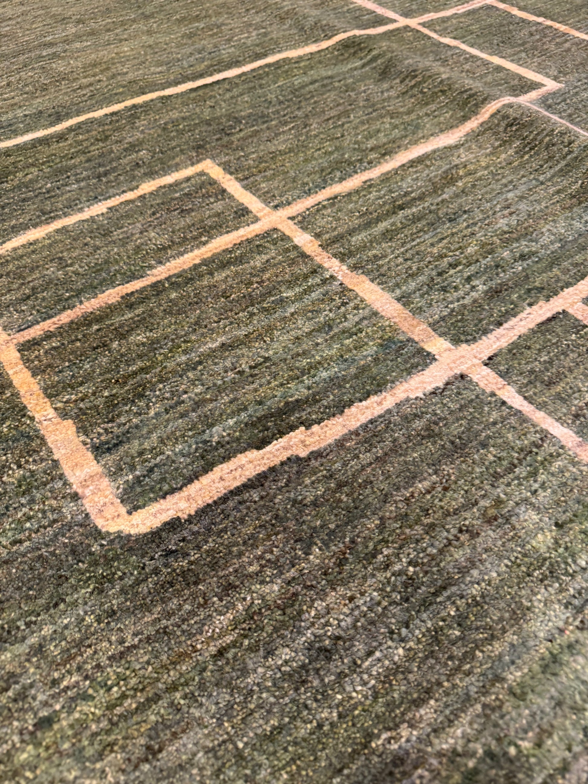 This Modern Gabbeh rug exudes contemporary elegance with its olive green background and contrasting beige geometric pattern. Hand-knotted with the utmost care, it boasts a high-quality wool construction that promises durability and comfort underfoot. The simplistic yet striking abstract design makes it a versatile piece for any modern or transitional interior. At once bold and understated, this rug is sure to be a conversation starter and elevate the aesthetics of any room.