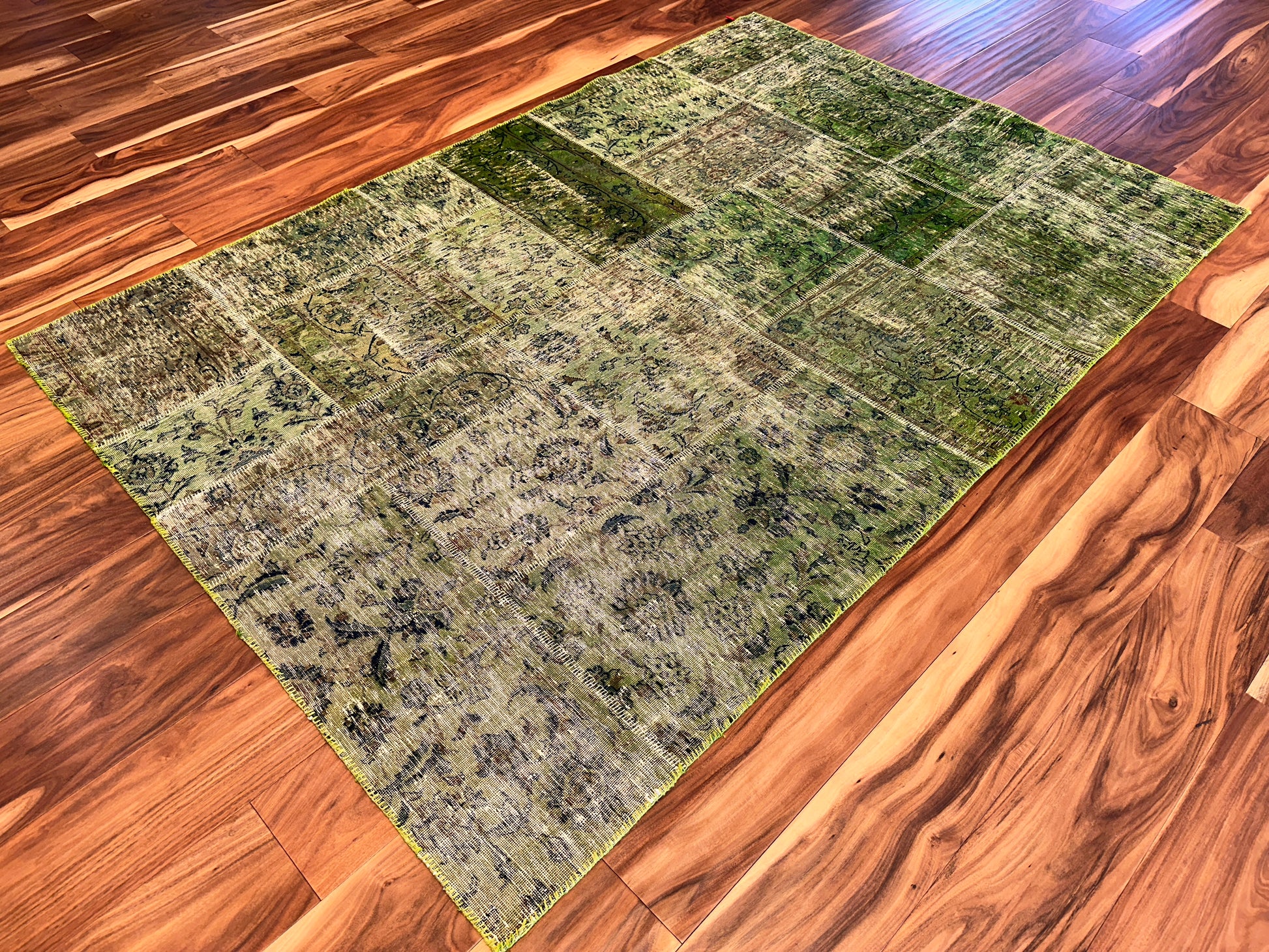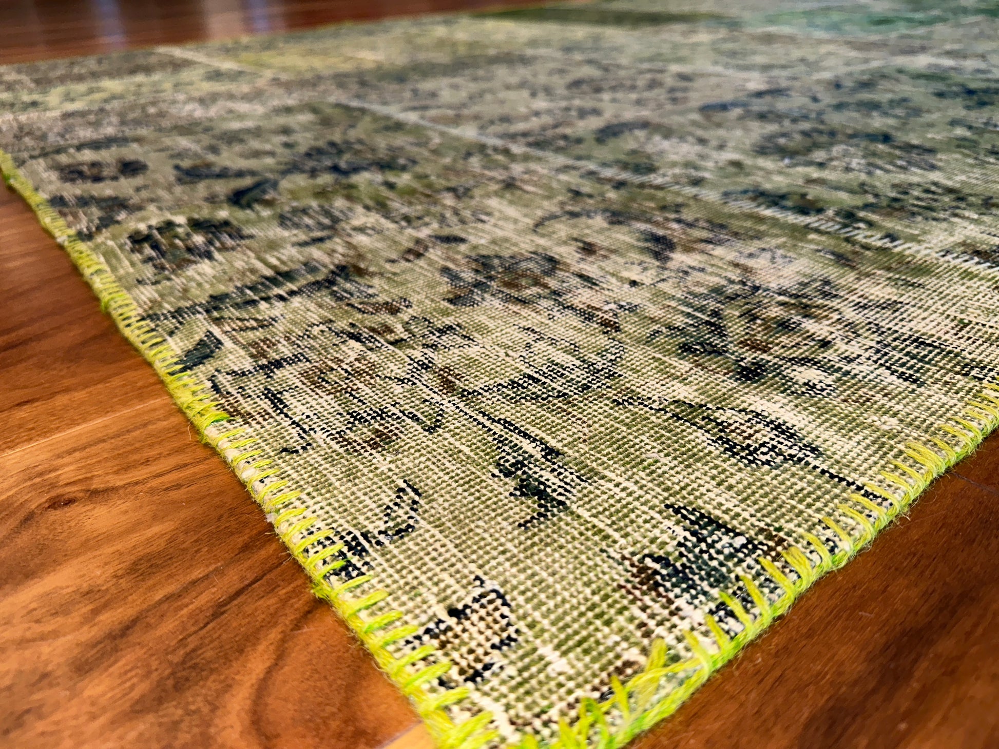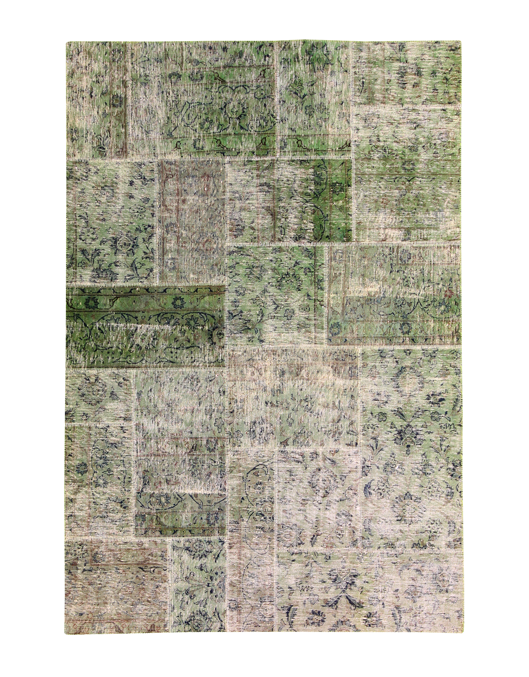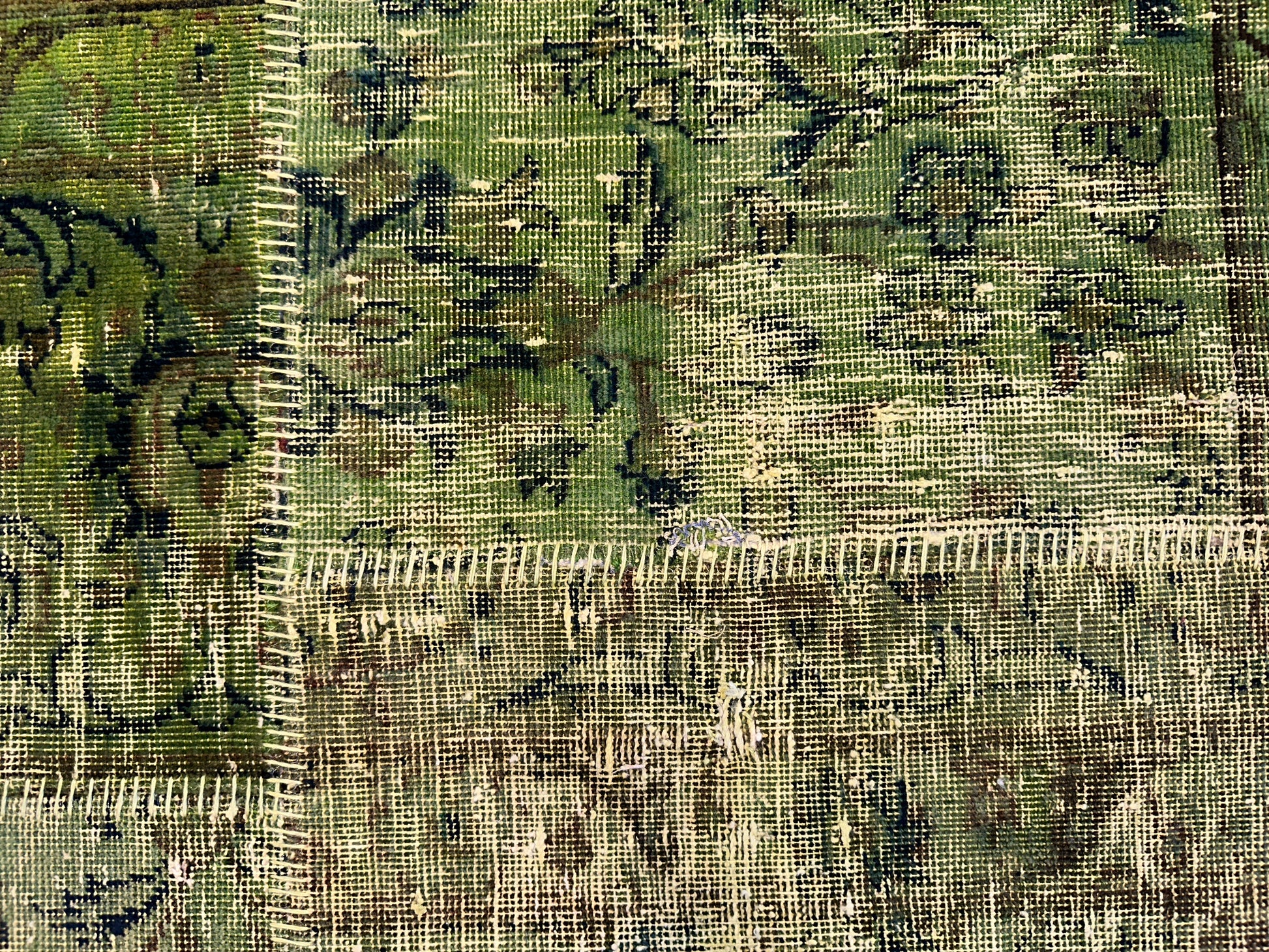 This unique handmade wool rug features a softly distressed patchwork of traditional floral motifs, reimagined in a fresh palette of pale green, sage, and faded charcoal. Each panel retains its own faint ornamental structure, offering subtle texture and character across the entire surface. The overall impression is one of quiet sophistication, where old-world charm meets modern artistry.