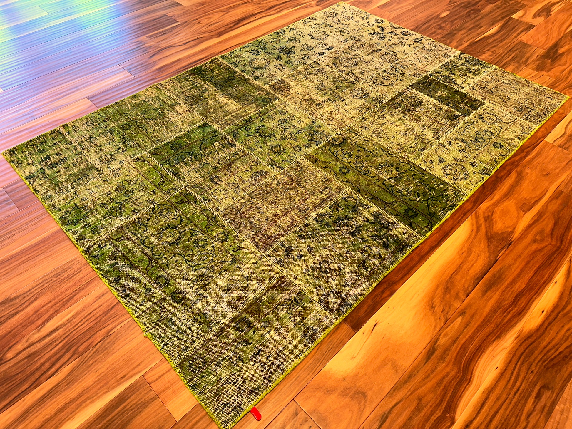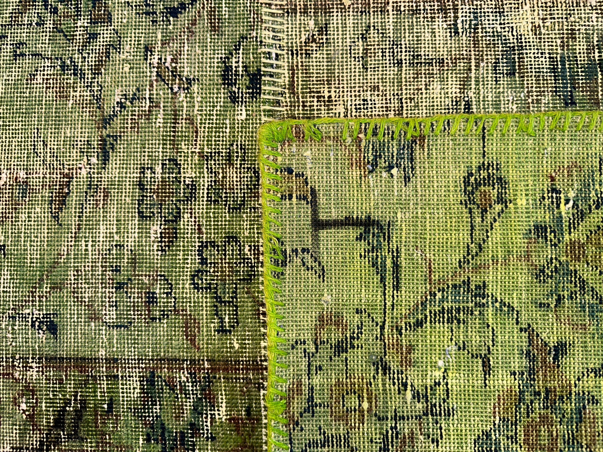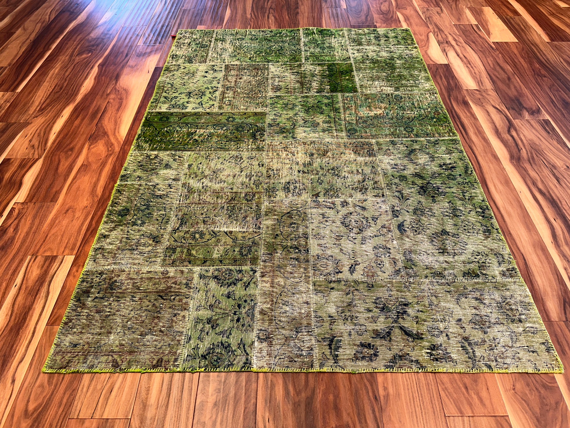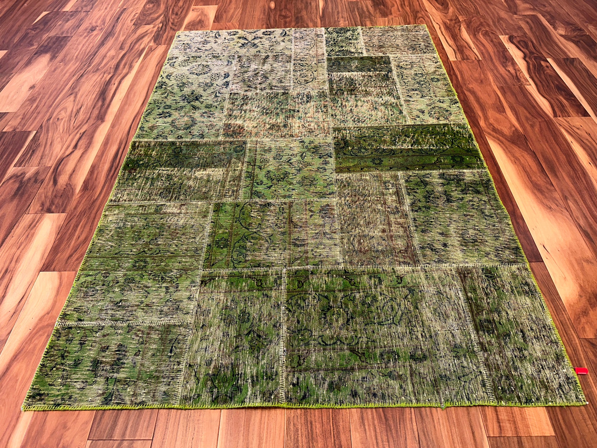 This unique handmade wool rug features a softly distressed patchwork of traditional floral motifs, reimagined in a fresh palette of pale green, sage, and faded charcoal. Each panel retains its own faint ornamental structure, offering subtle texture and character across the entire surface. The overall impression is one of quiet sophistication, where old-world charm meets modern artistry.