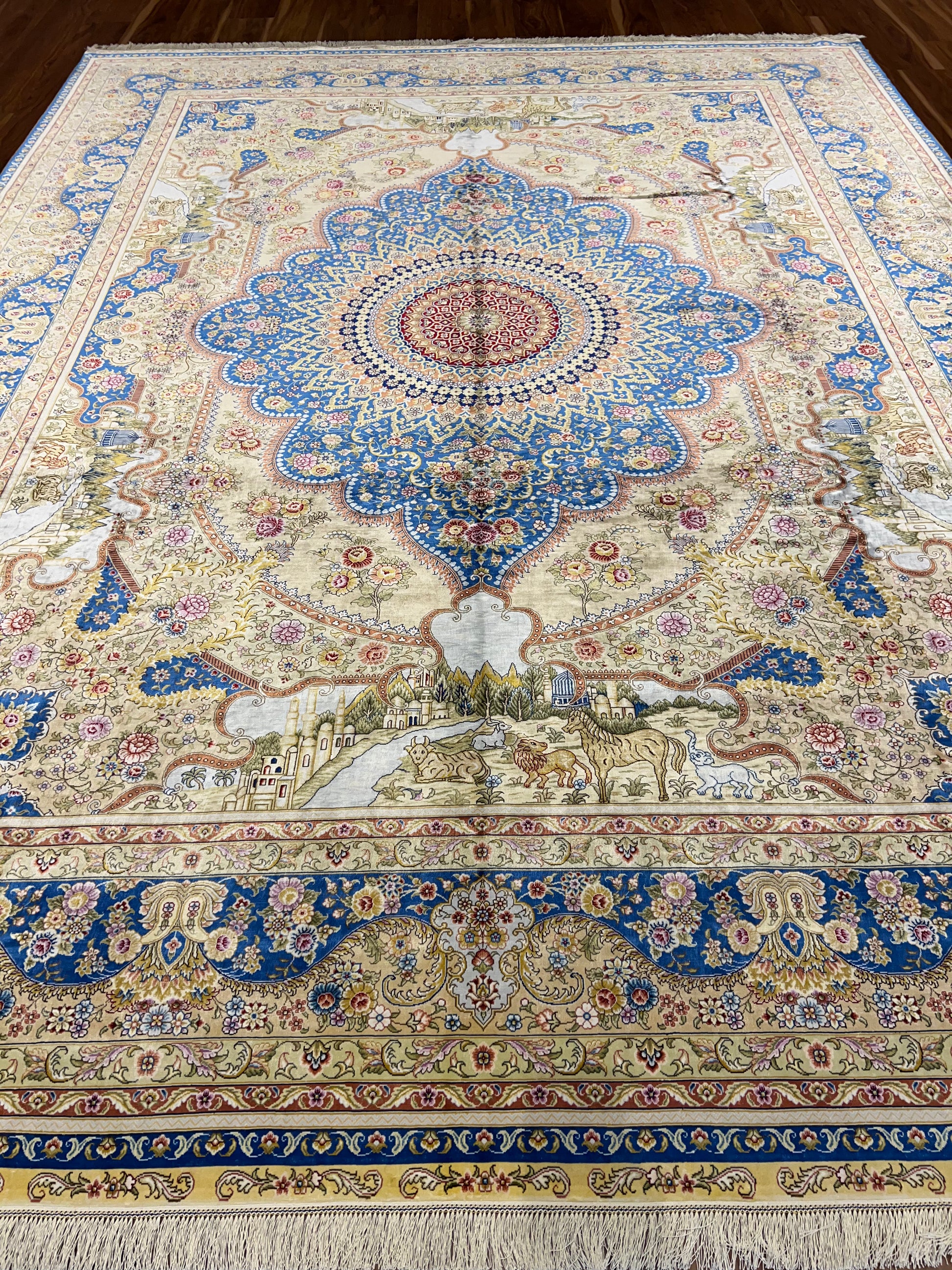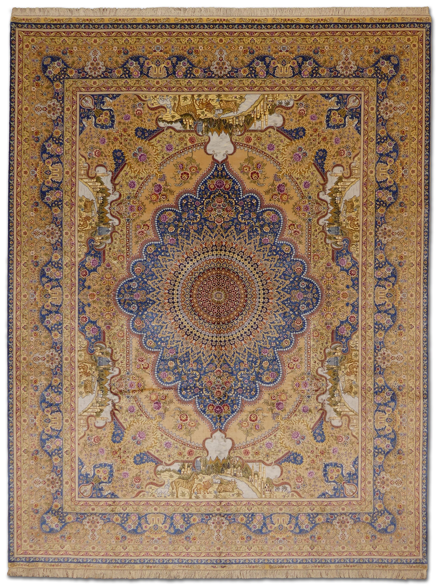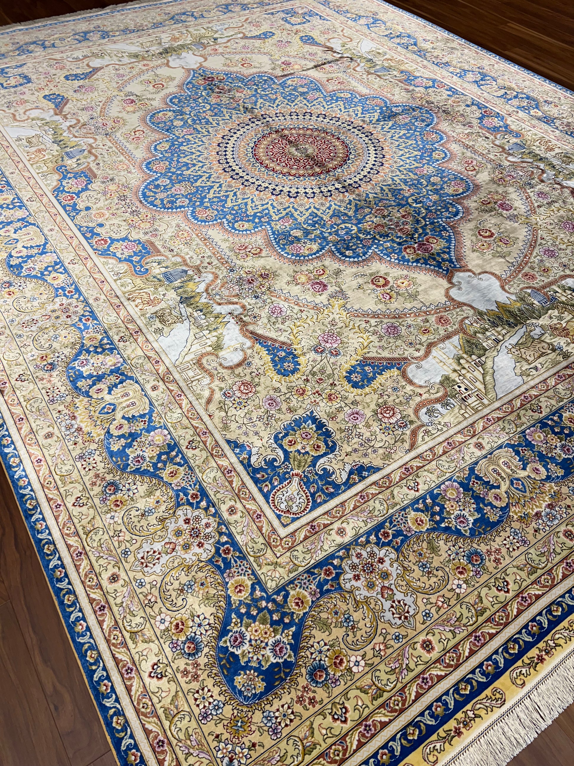 This exquisite Pictorial Silk rug is a masterpiece of traditional craftsmanship. Made from fine silk, it exemplifies luxury and sophistication. The central medallion design, surrounded by intricate floral motifs and a richly decorated border, creates a sense of grandeur. Its detailed pictorial elements depict serene landscapes and architecture, giving it a sense of culture and history. Ideal for enhancing the elegance of any living space, this rug is not only a floor covering but a piece of art.