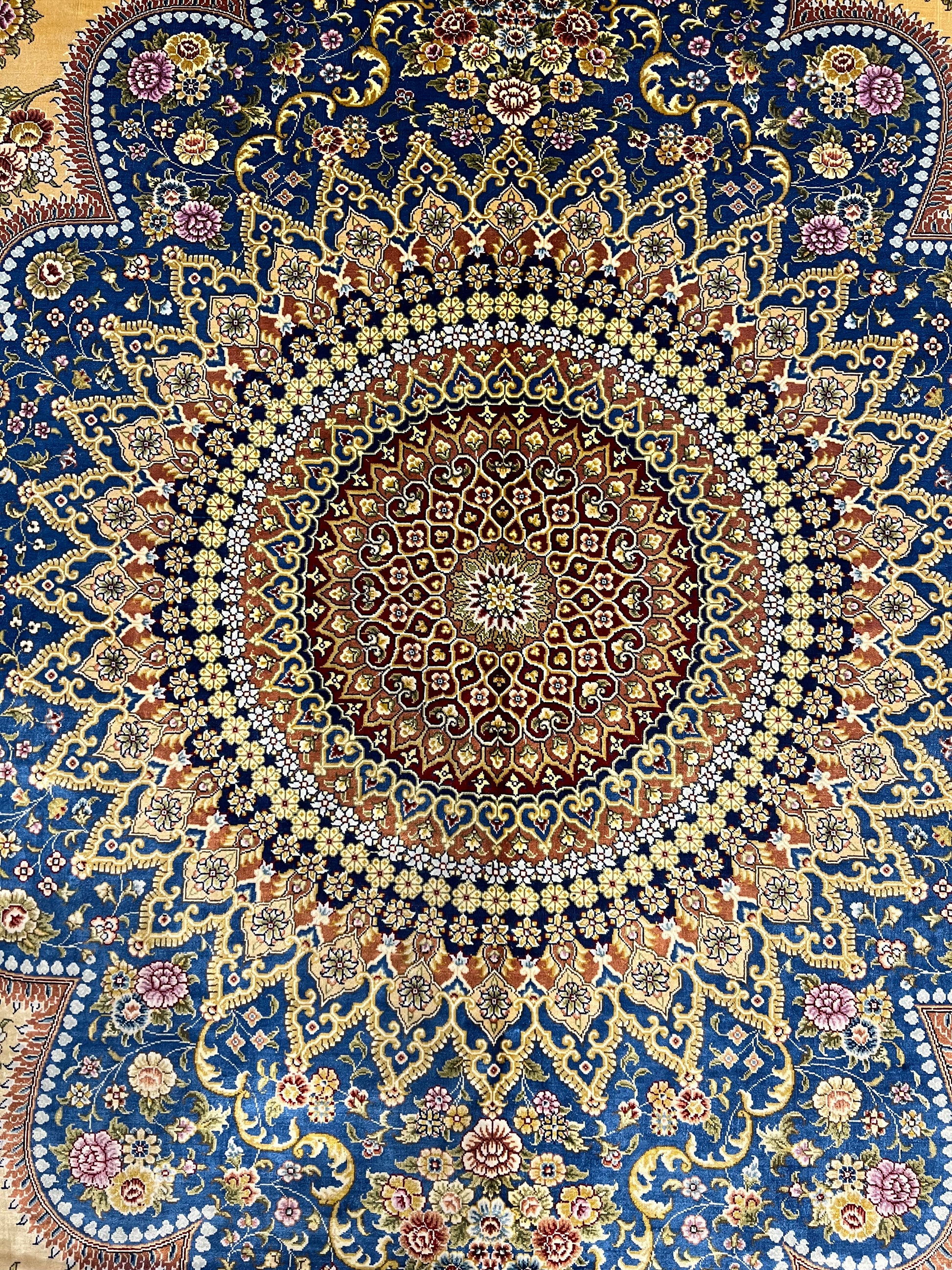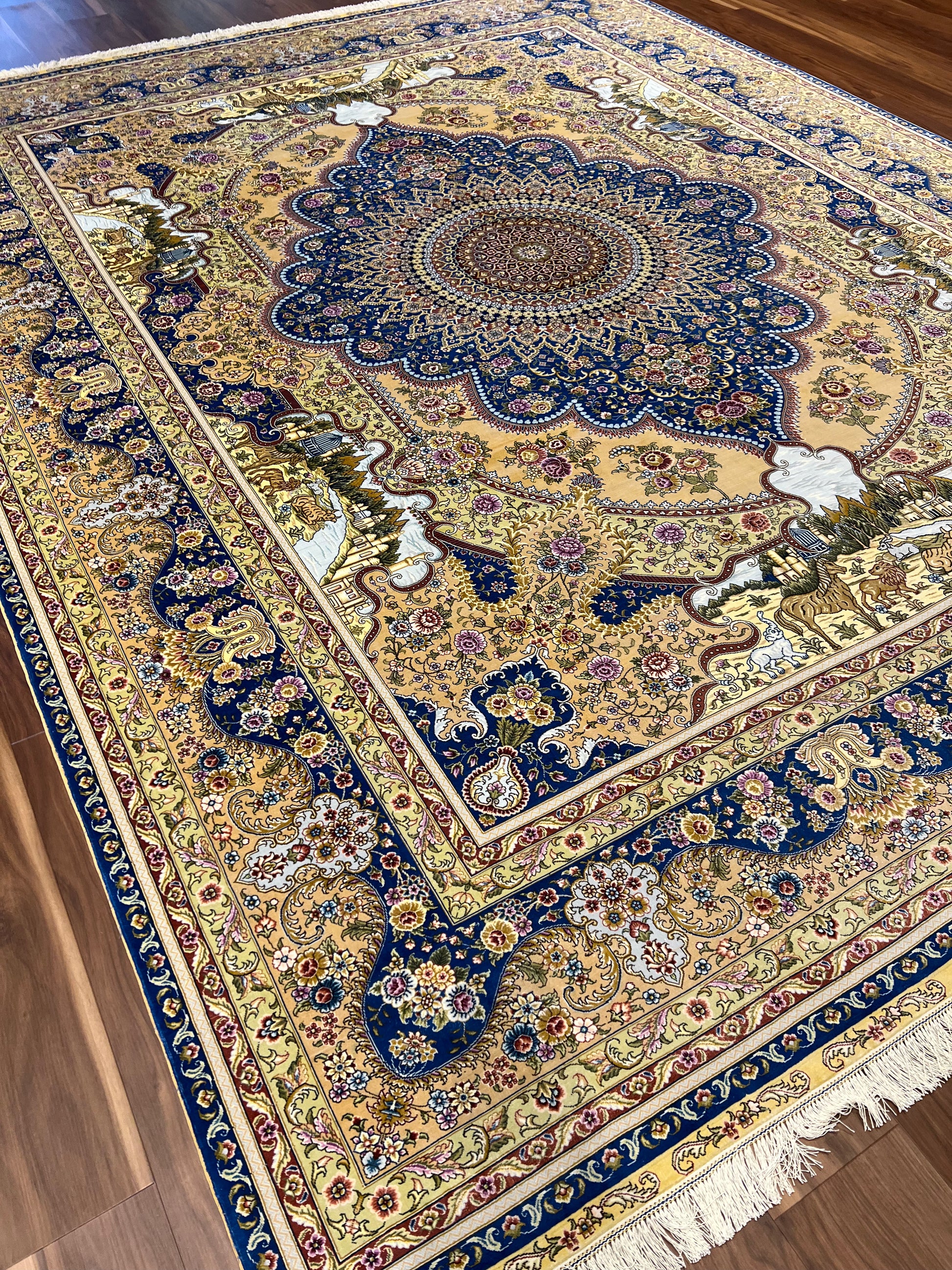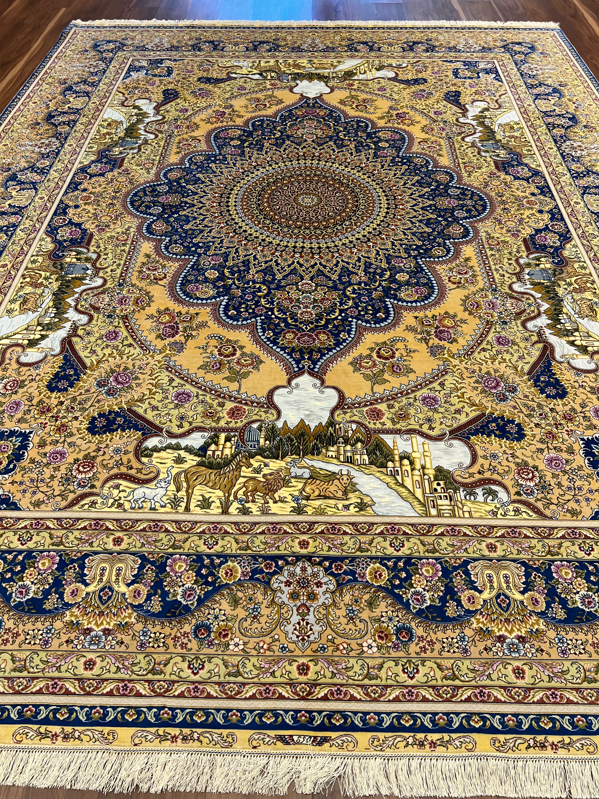 This exquisite Pictorial Silk rug is a masterpiece of traditional craftsmanship. Made from fine silk, it exemplifies luxury and sophistication. The central medallion design, surrounded by intricate floral motifs and a richly decorated border, creates a sense of grandeur. Its detailed pictorial elements depict serene landscapes and architecture, giving it a sense of culture and history. Ideal for enhancing the elegance of any living space, this rug is not only a floor covering but a piece of art.