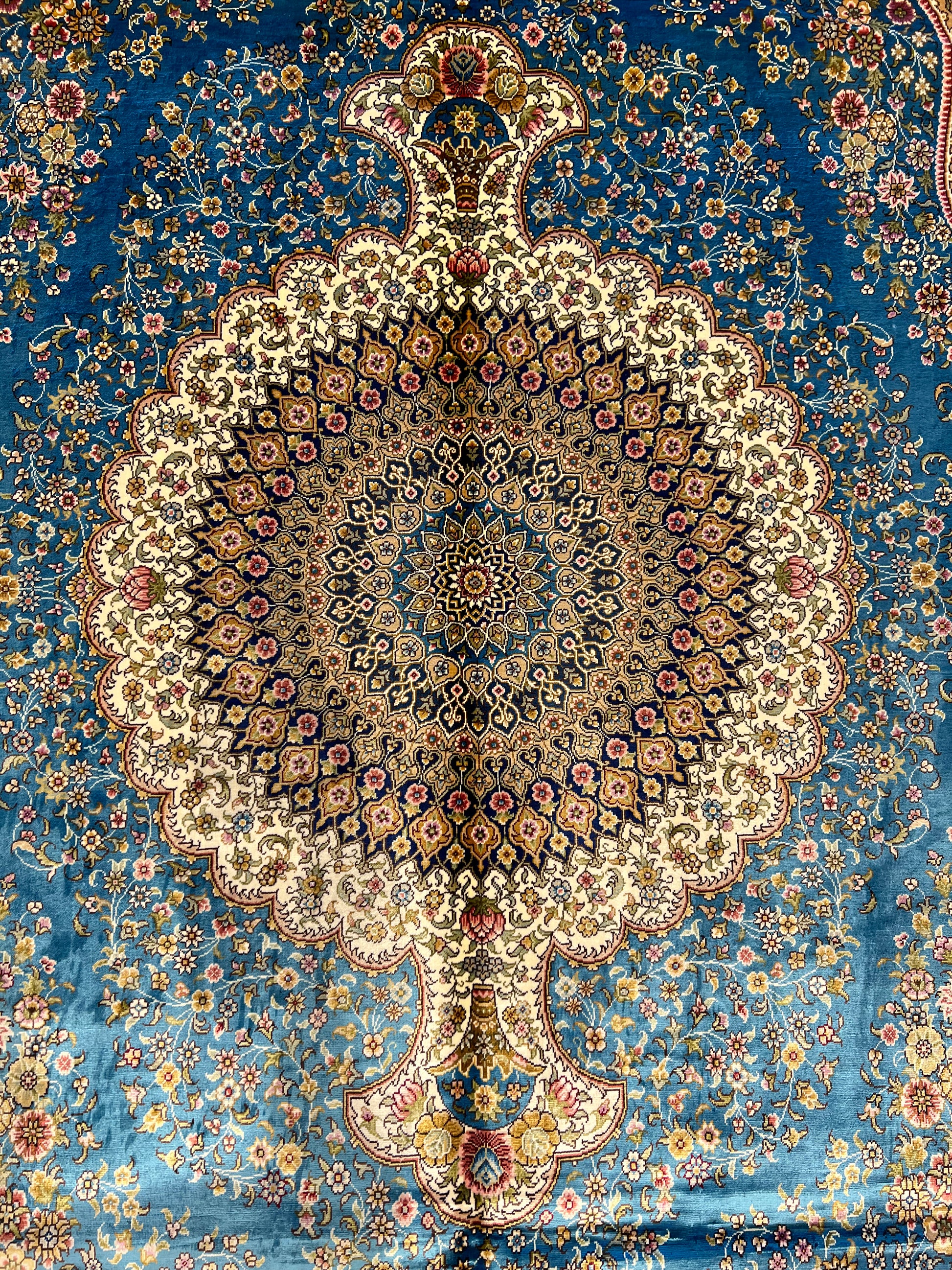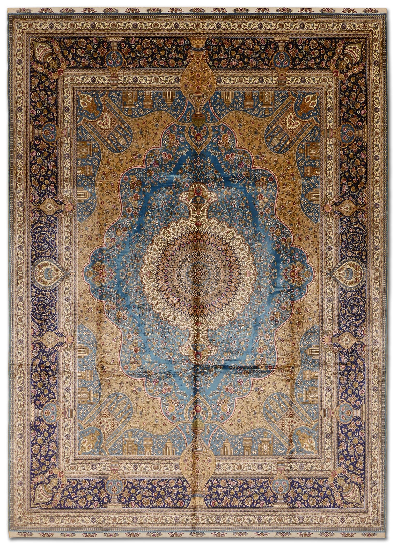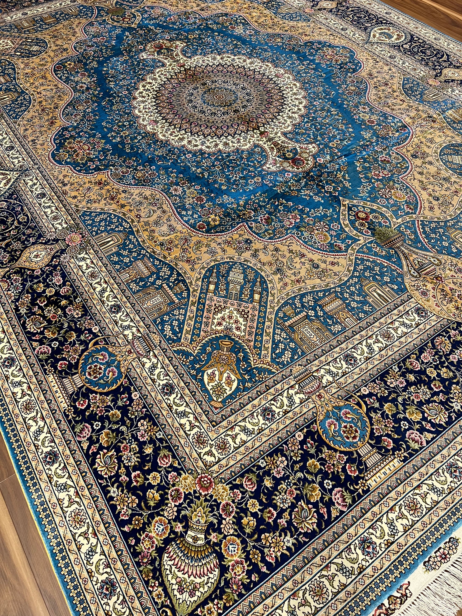 This exquisite Qum Design rug features a harmonious blend of elegance and sophistication achieved through intricate patterns and a soothing color palette. The meticulous silk weaving showcases classic motifs, such as the central medallion, floral patterns, and ornate borders, reflecting master craftsmanship. Perfect for adding a touch of luxury and timeless style to any interior space.