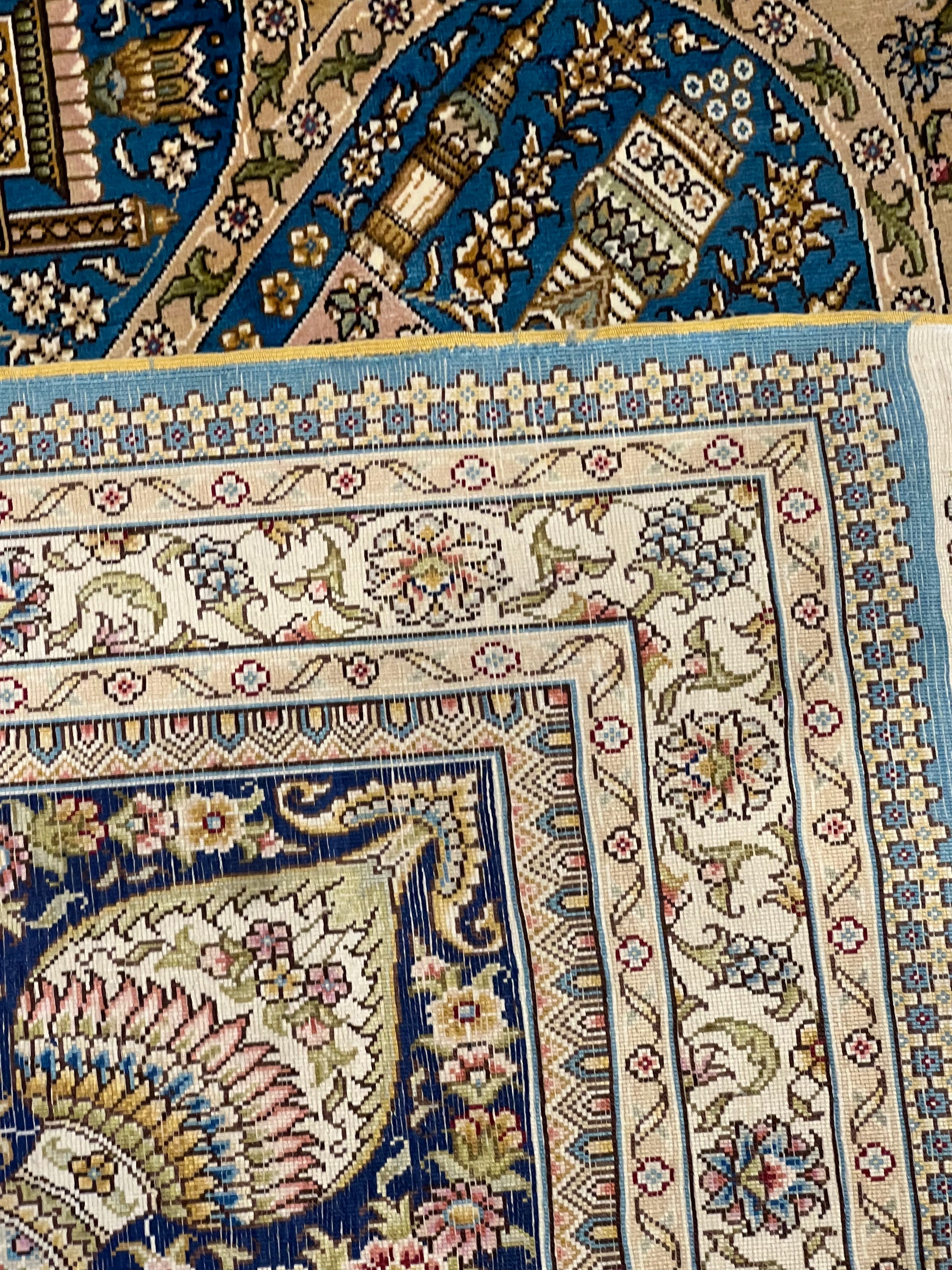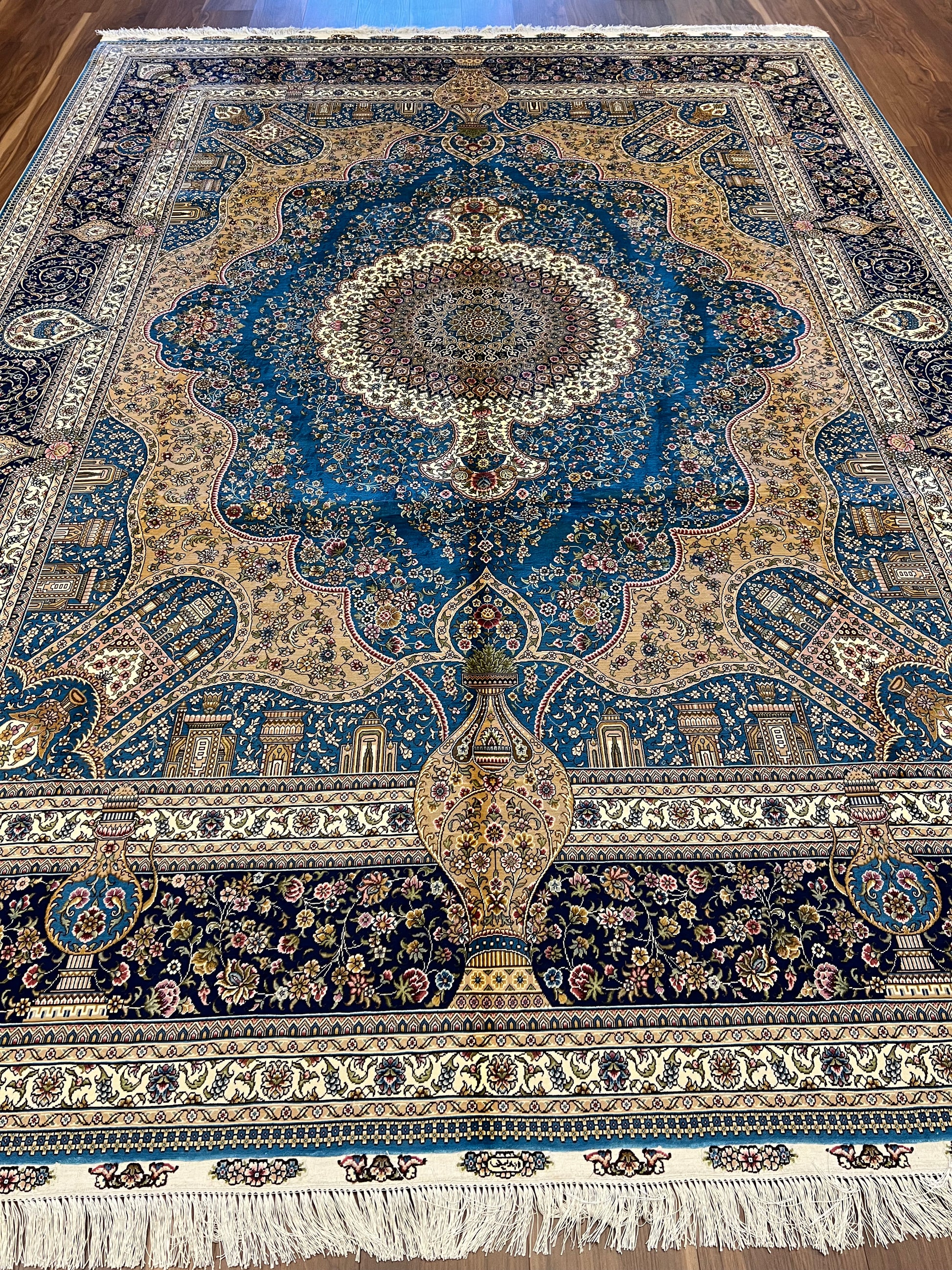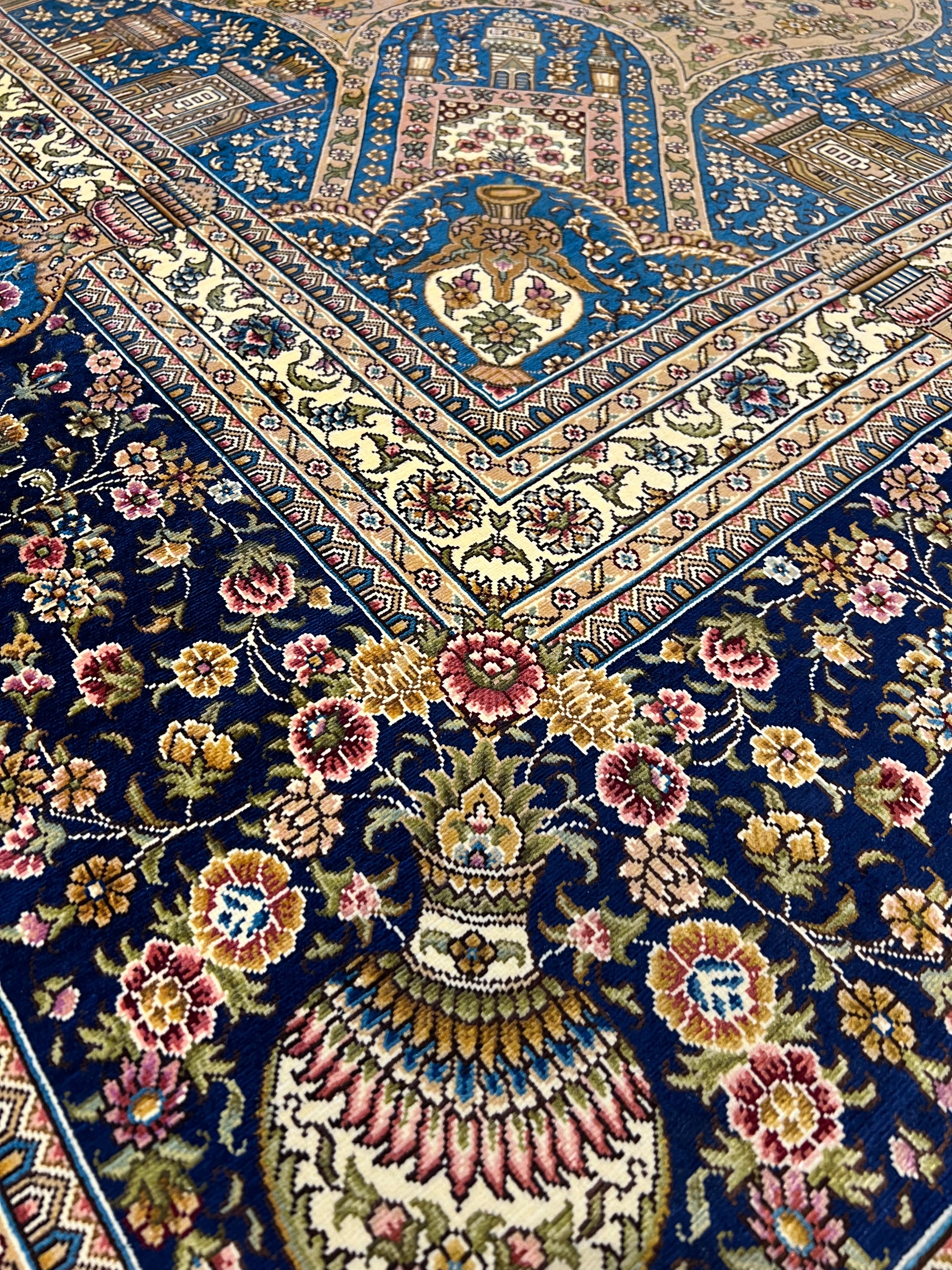 This exquisite Qum Design rug features a harmonious blend of elegance and sophistication achieved through intricate patterns and a soothing color palette. The meticulous silk weaving showcases classic motifs, such as the central medallion, floral patterns, and ornate borders, reflecting master craftsmanship. Perfect for adding a touch of luxury and timeless style to any interior space.