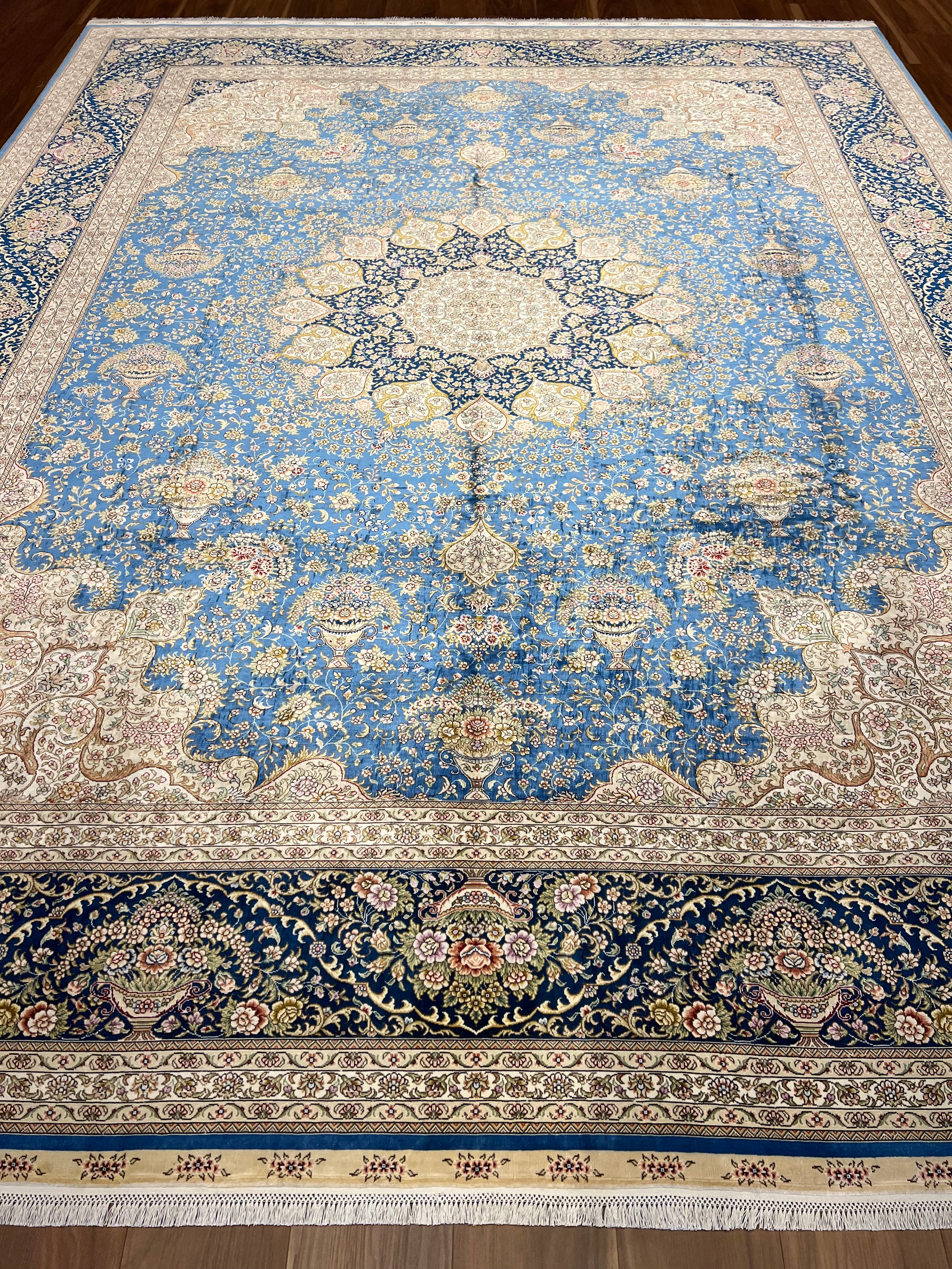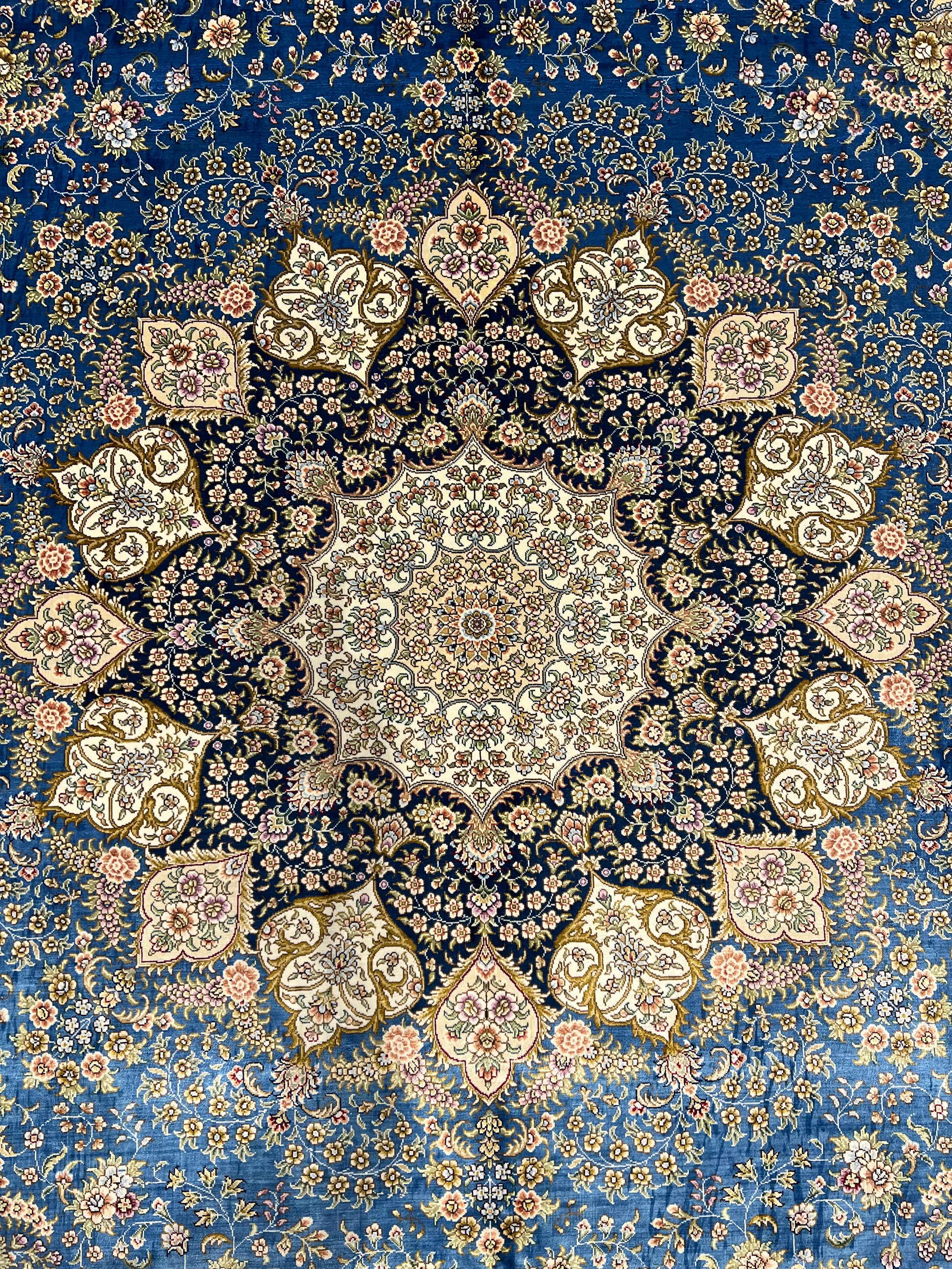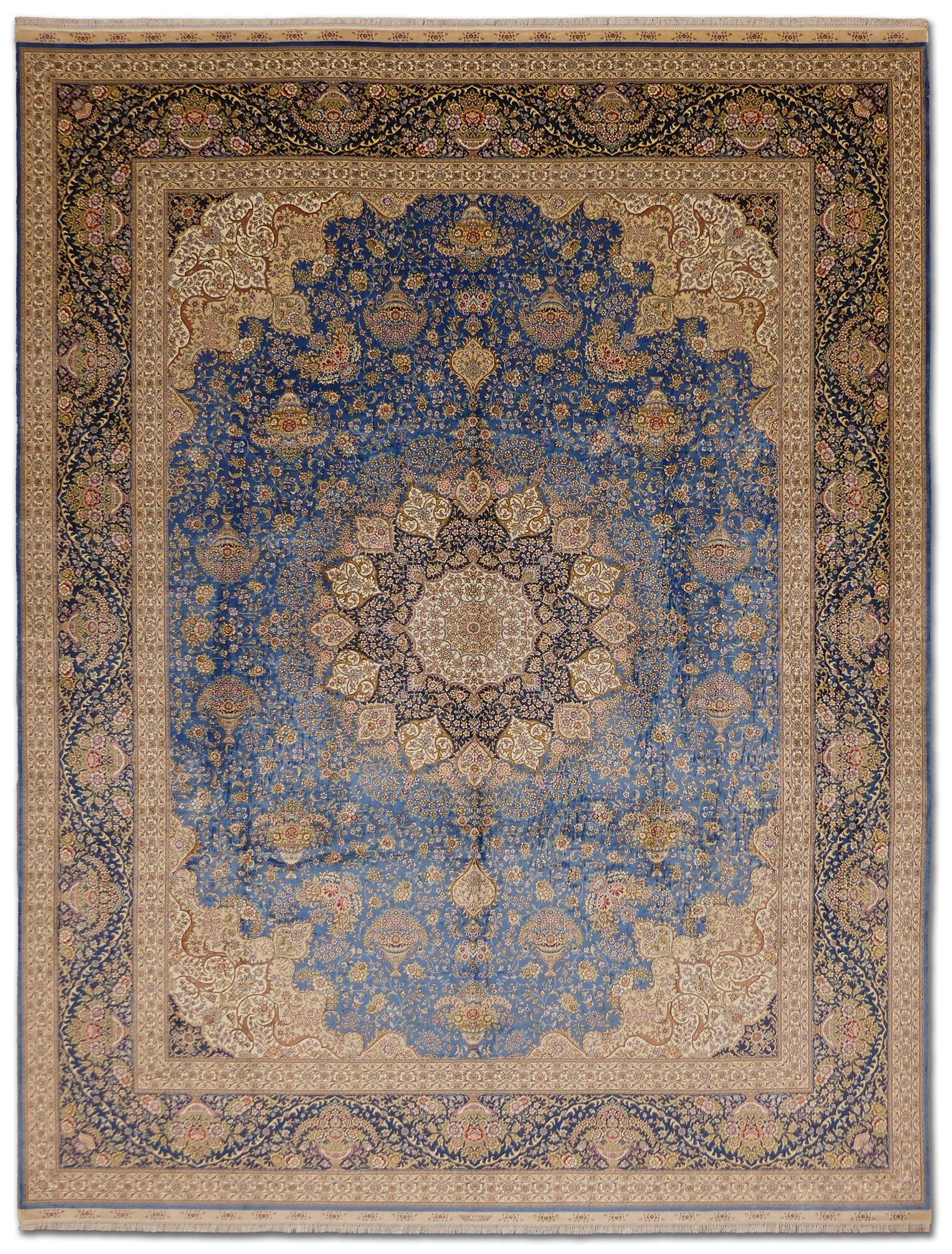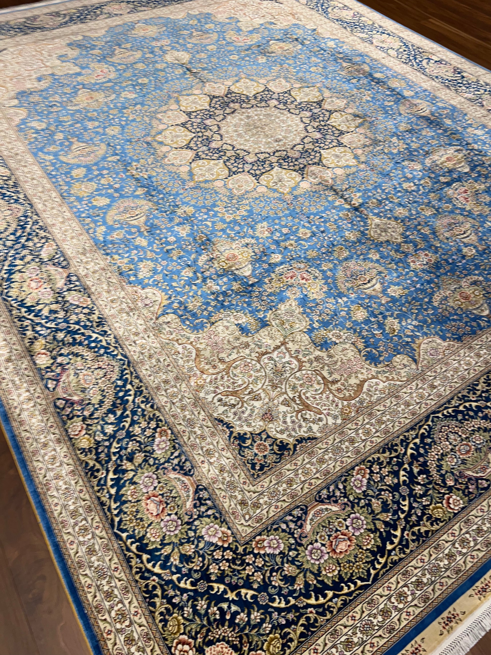 This exquisite Qum Design Silk rug is a masterpiece of craftsmanship, showcasing a traditional Persian pattern with intricate detailing. Woven entirely from silk, which gives it an opulent sheen and a luxurious feel underfoot, the rug's design features a central medallion surrounded by a field of elaborate motifs and bordered with an ornate perimeter. The dominant blue hue exudes calm and elegance, complemented by beige and gold accents that add a touch of regality. This rug is ideal for those who appreciate the finesse of classic decor and seek to add a touch of sophistication to their living space.