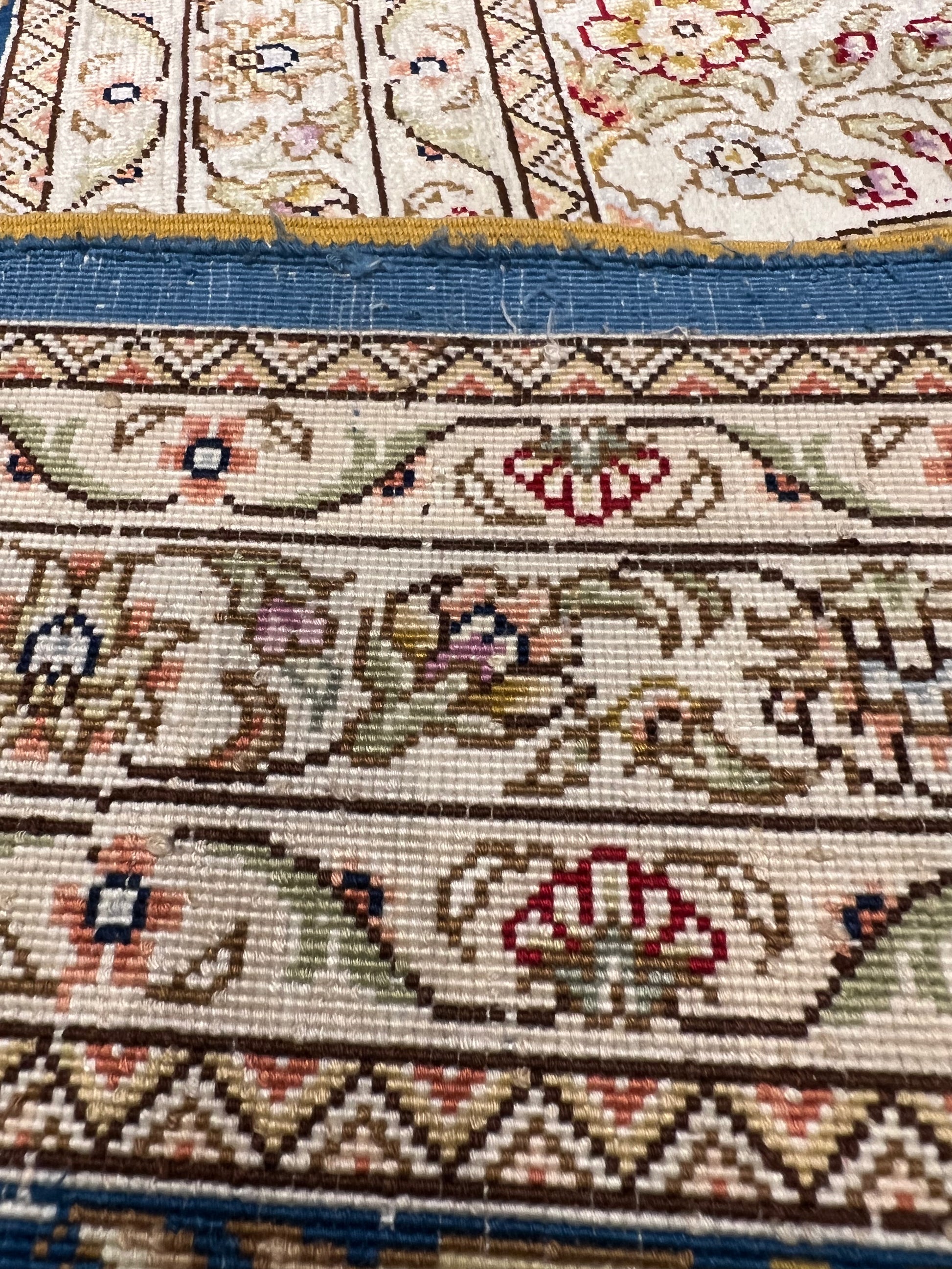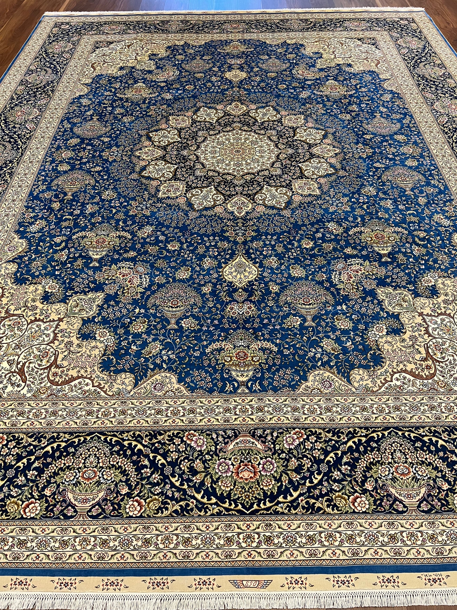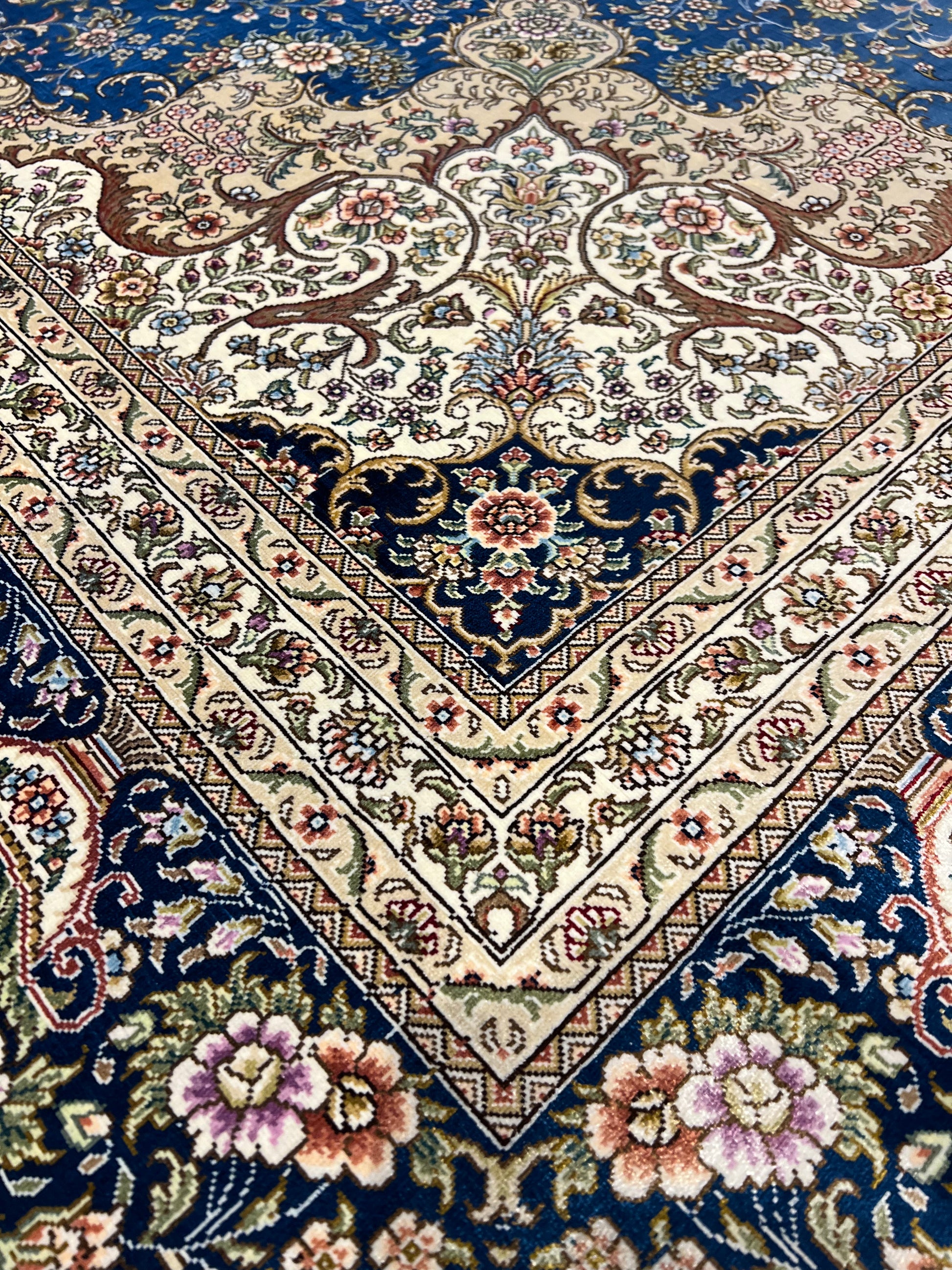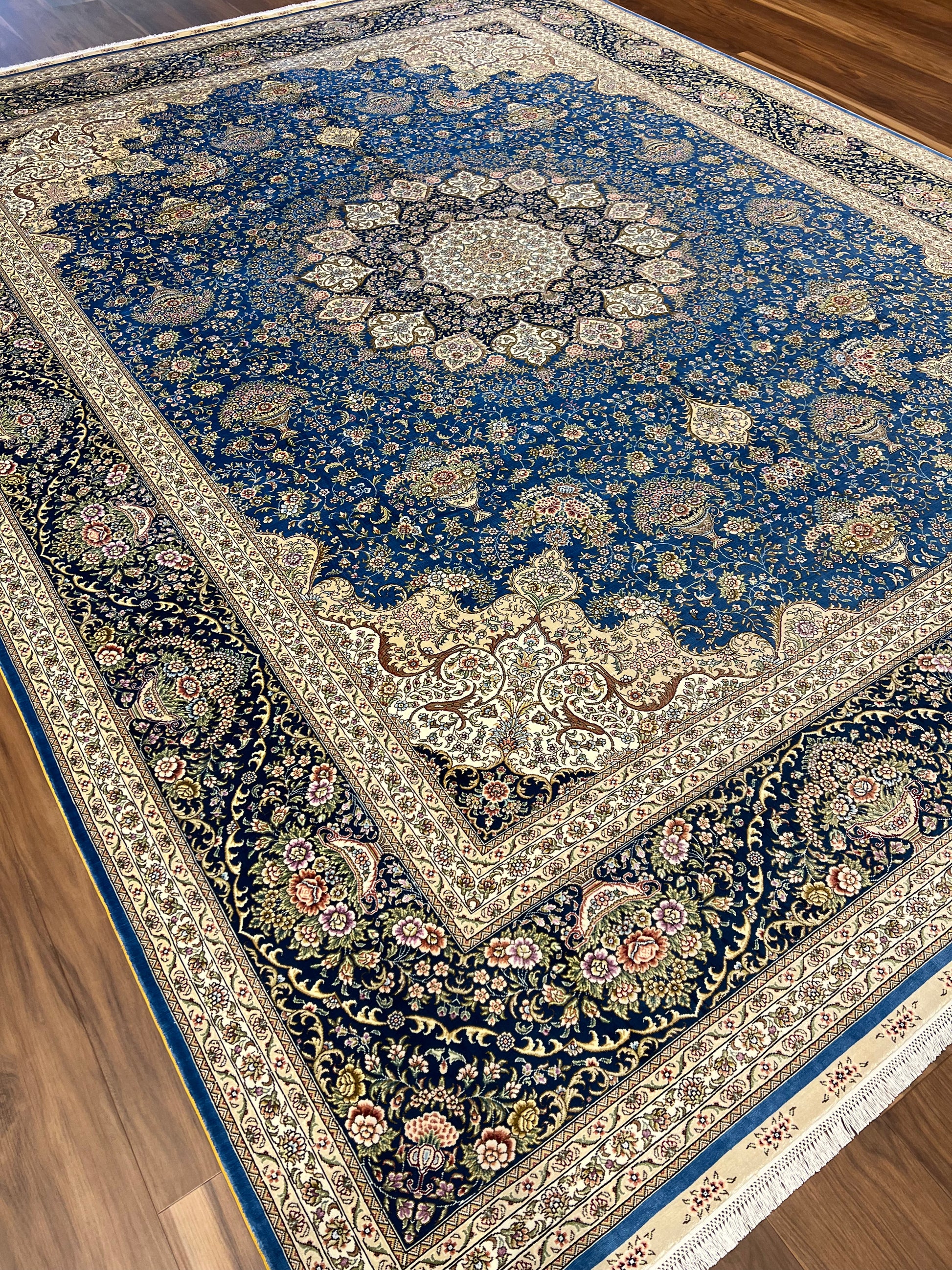 This exquisite Qum Design Silk rug is a masterpiece of craftsmanship, showcasing a traditional Persian pattern with intricate detailing. Woven entirely from silk, which gives it an opulent sheen and a luxurious feel underfoot, the rug's design features a central medallion surrounded by a field of elaborate motifs and bordered with an ornate perimeter. The dominant blue hue exudes calm and elegance, complemented by beige and gold accents that add a touch of regality. This rug is ideal for those who appreciate the finesse of classic decor and seek to add a touch of sophistication to their living space.