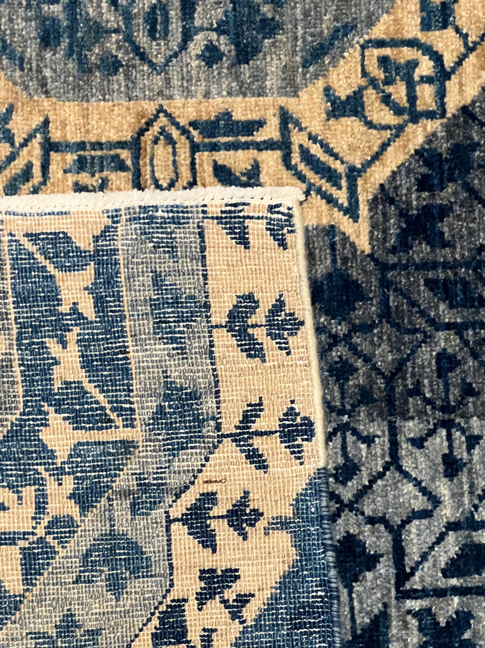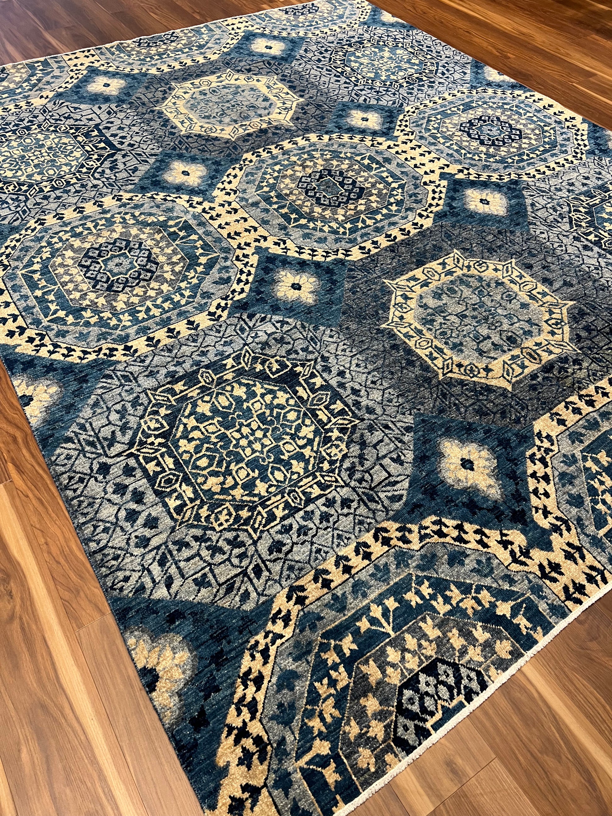 This Repeating Mamluk rug, made of high-quality wool, features intricate geometric patterns that evoke the grandeur of Islamic art. Each panel harbors meticulous detail, presenting a harmonious design steeped in historical significance. The deep navy blue and gold hues exude a regal presence, while touches of beige lighten the composition, making it versatile for traditional and contemporary interiors.