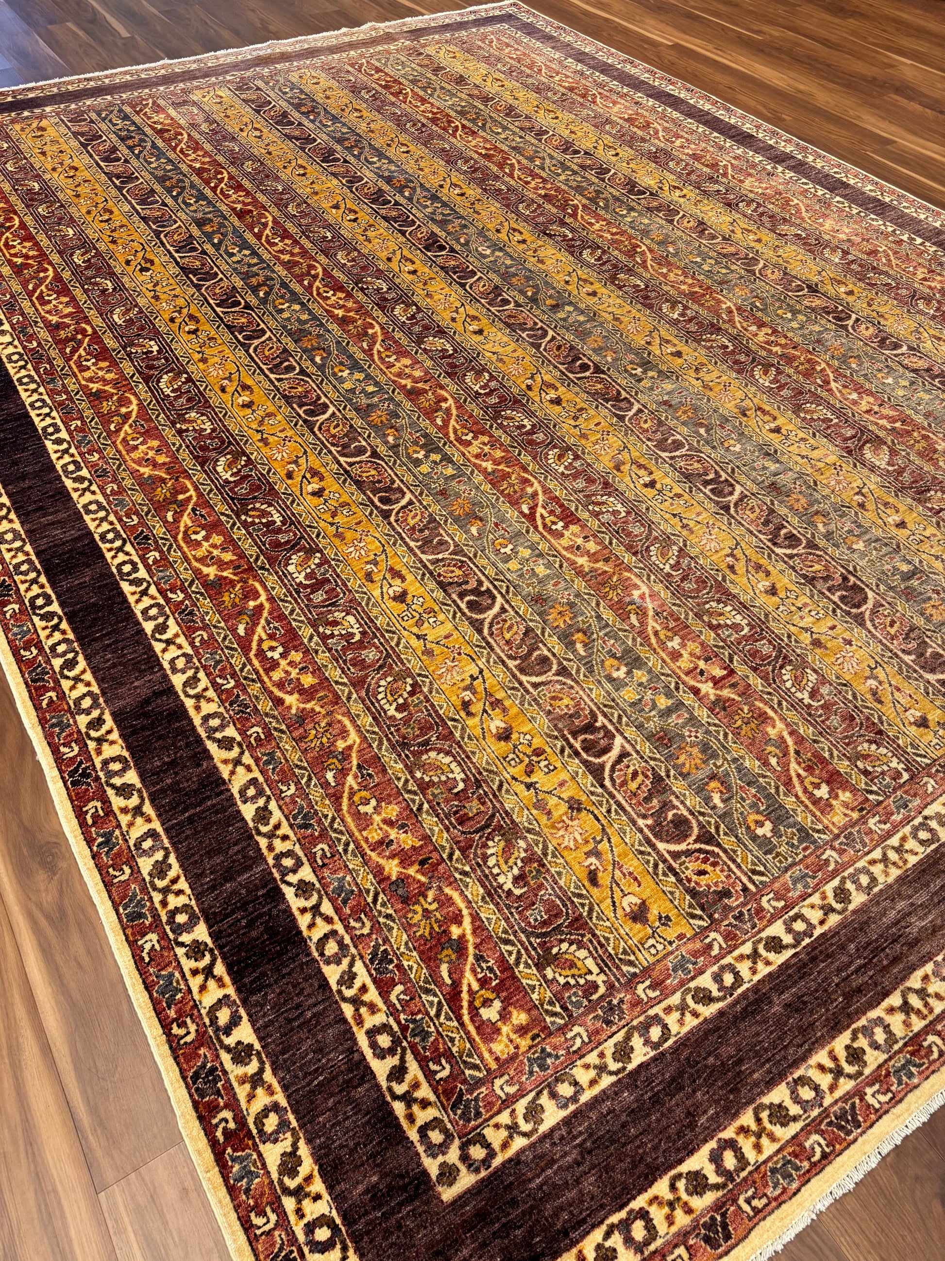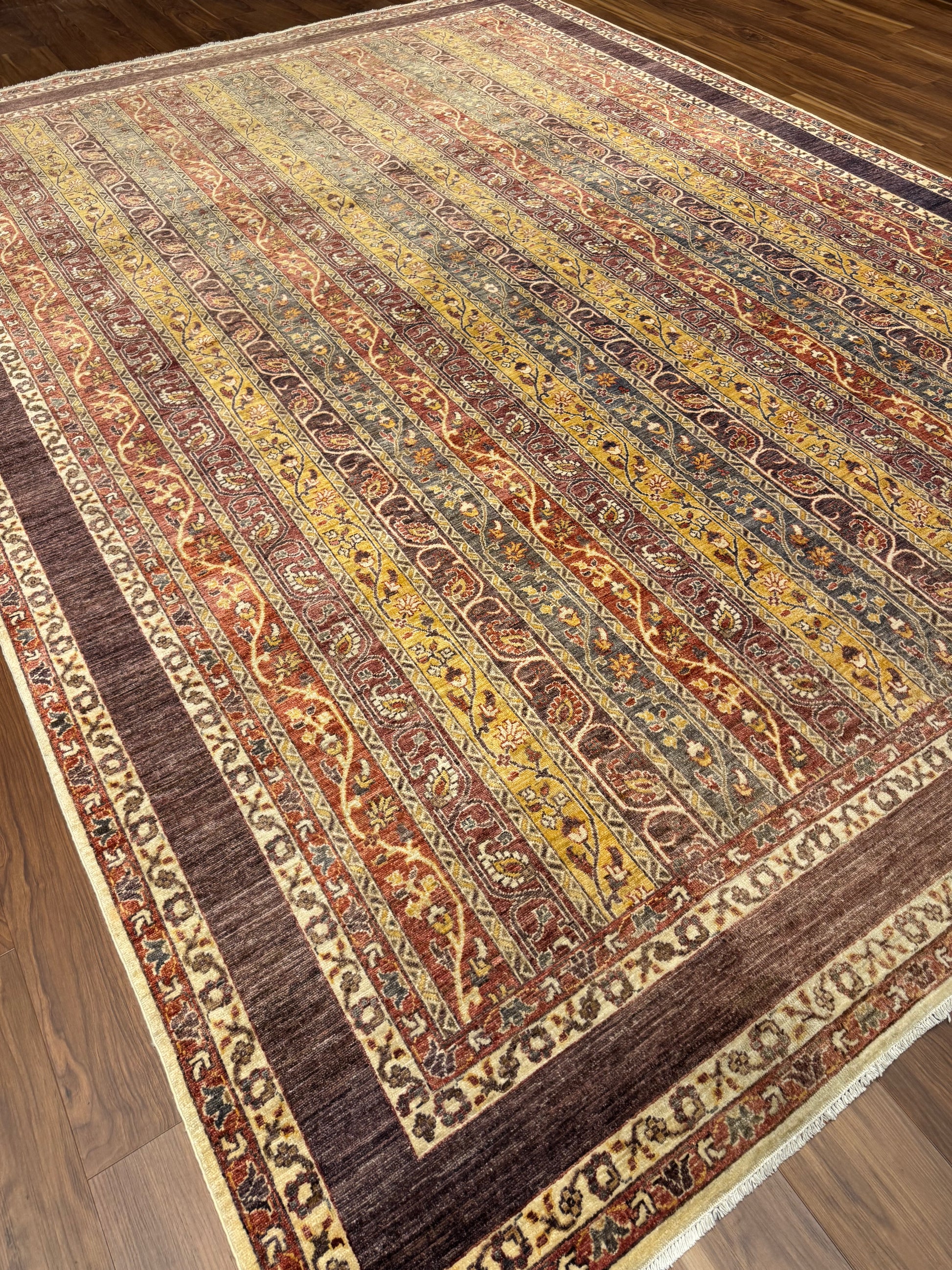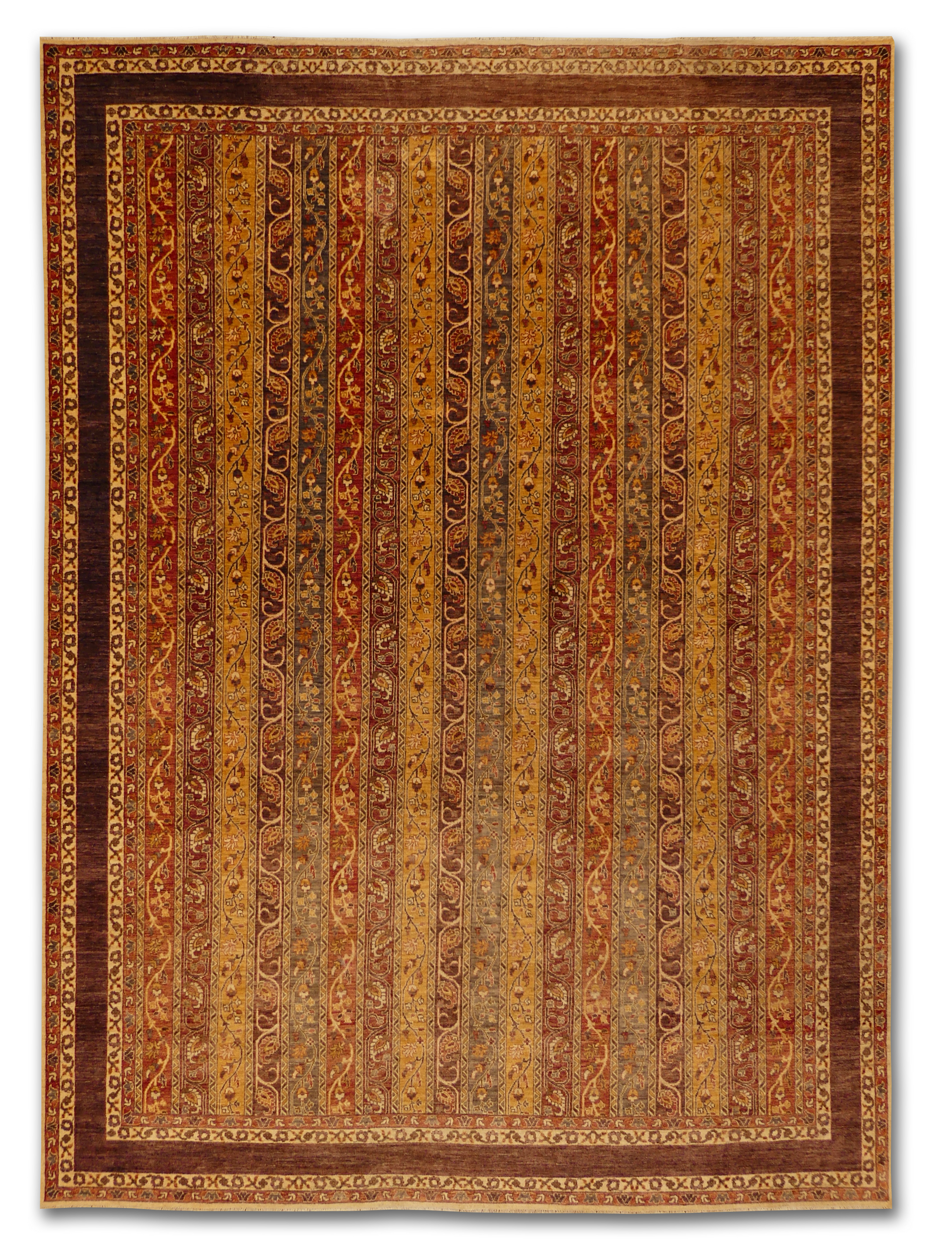 The Sal Ariana rug is a magnificent piece that boasts a harmonious blend of rust, gold, beige, and brown hues, presenting a traditional aesthetic with a touch of elegance. It features intricate patterns that resemble classic oriental designs, making it a timeless addition to any setting. Handcrafted from the finest wool, this rug promises durability alongside luxurious comfort underfoot. Its detailed borders and symmetrically patterned stripes reflect a disciplined artistry suitable for conventional and contemporary decors.