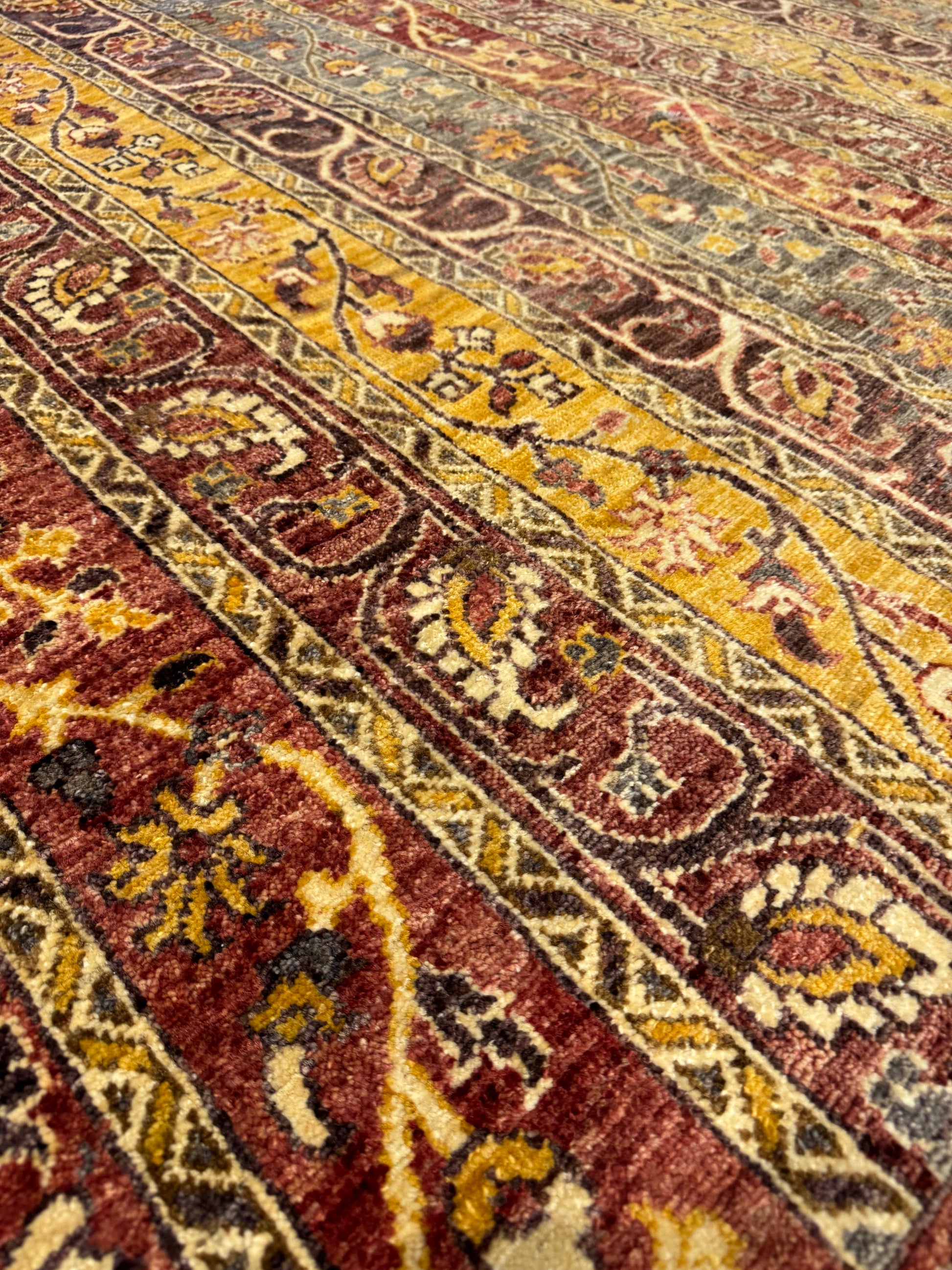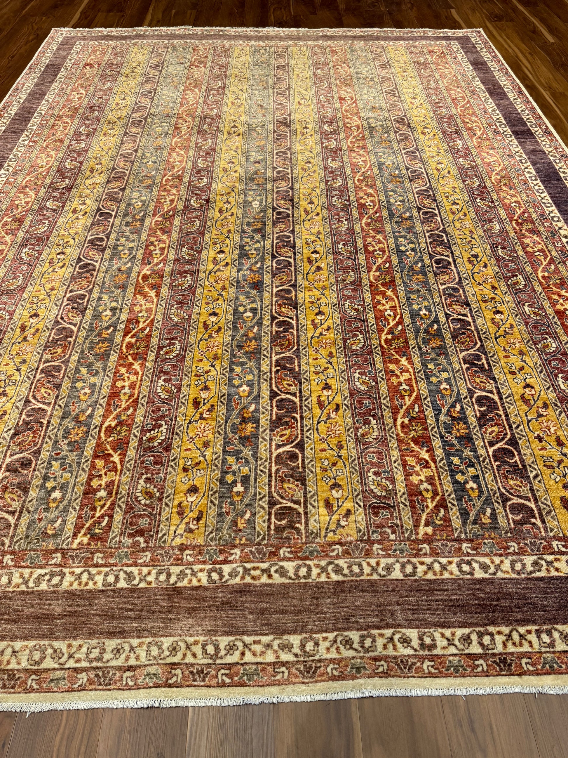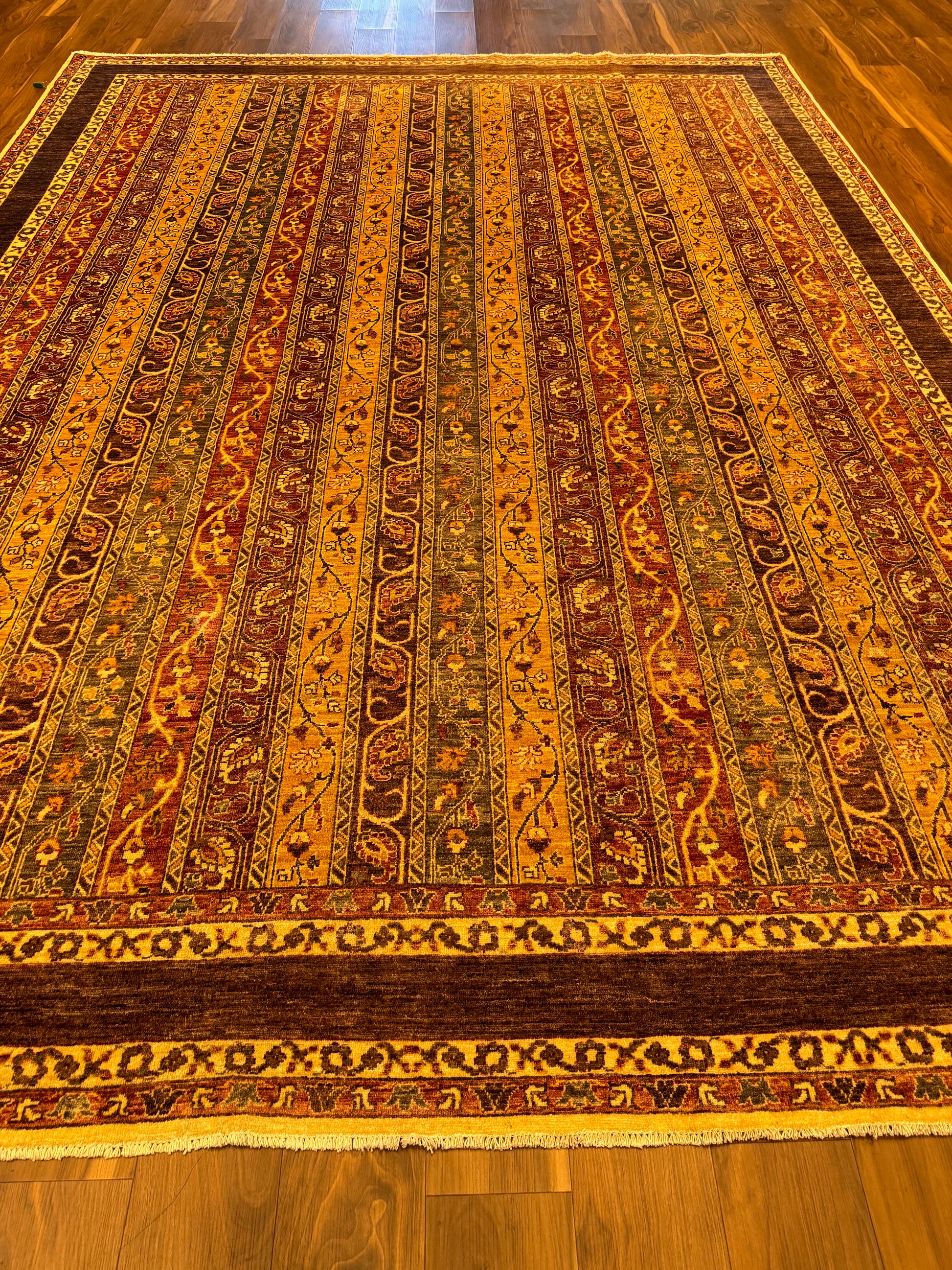 The Sal Ariana rug is a magnificent piece that boasts a harmonious blend of rust, gold, beige, and brown hues, presenting a traditional aesthetic with a touch of elegance. It features intricate patterns that resemble classic oriental designs, making it a timeless addition to any setting. Handcrafted from the finest wool, this rug promises durability alongside luxurious comfort underfoot. Its detailed borders and symmetrically patterned stripes reflect a disciplined artistry suitable for conventional and contemporary decors.