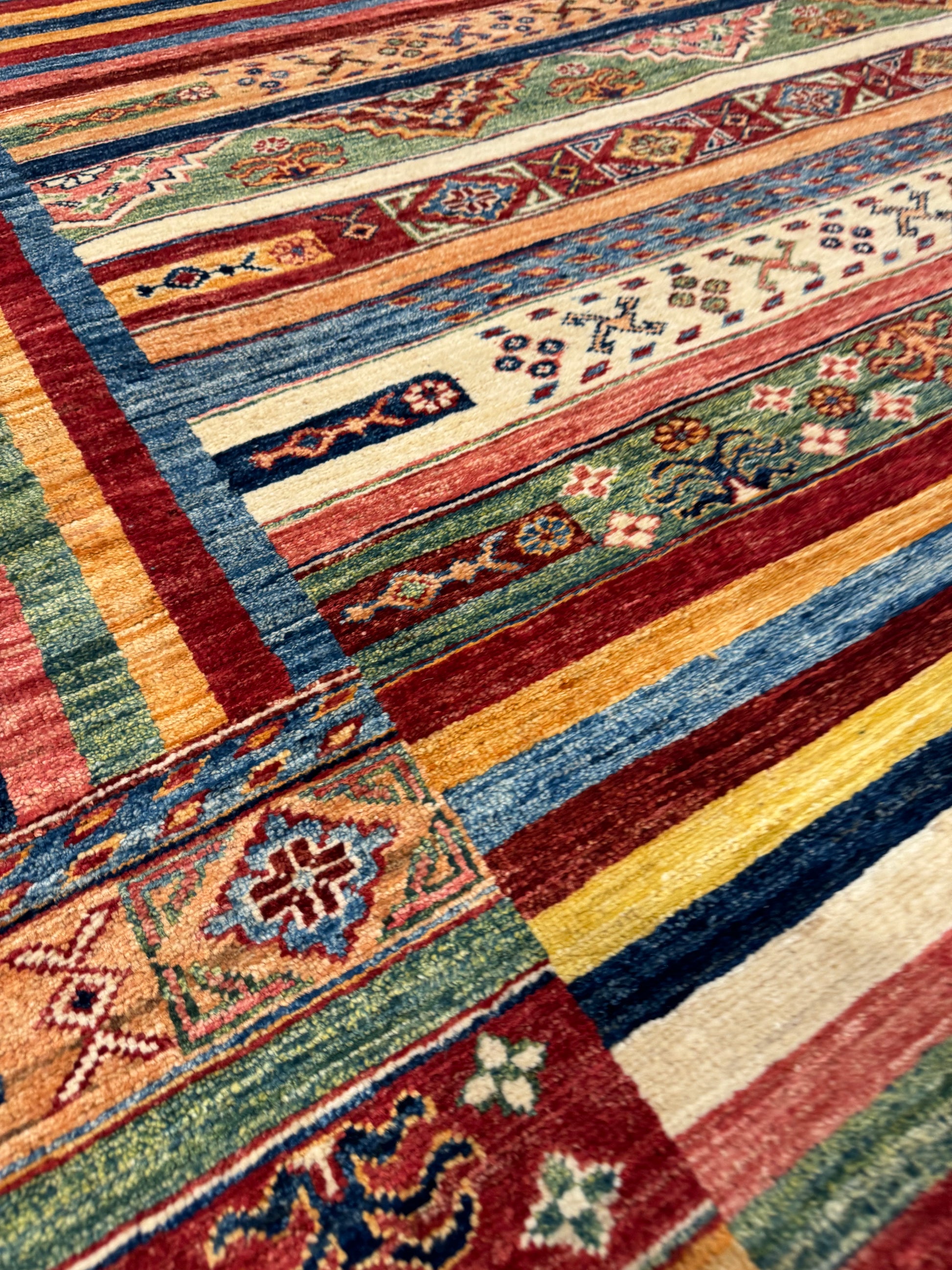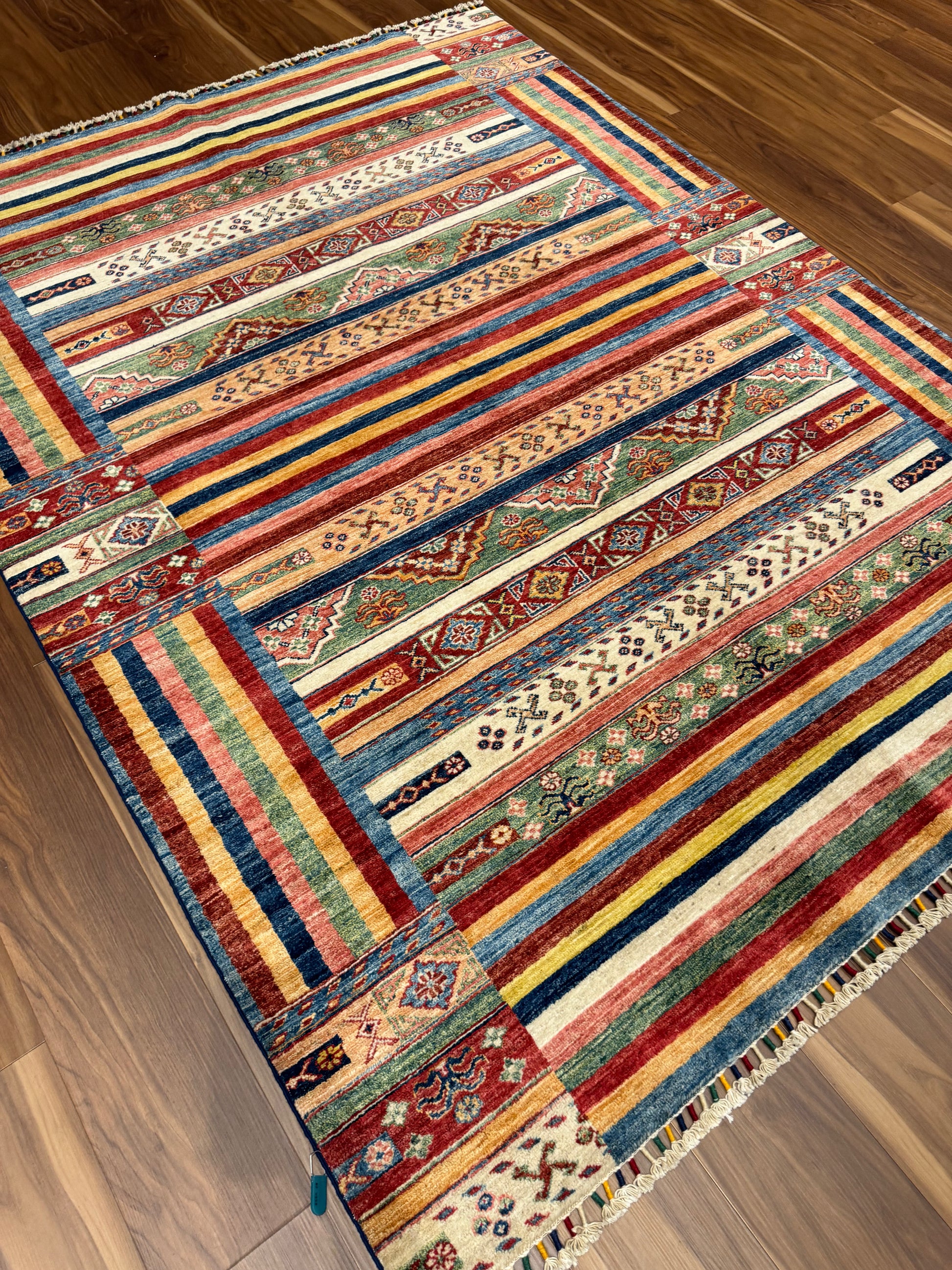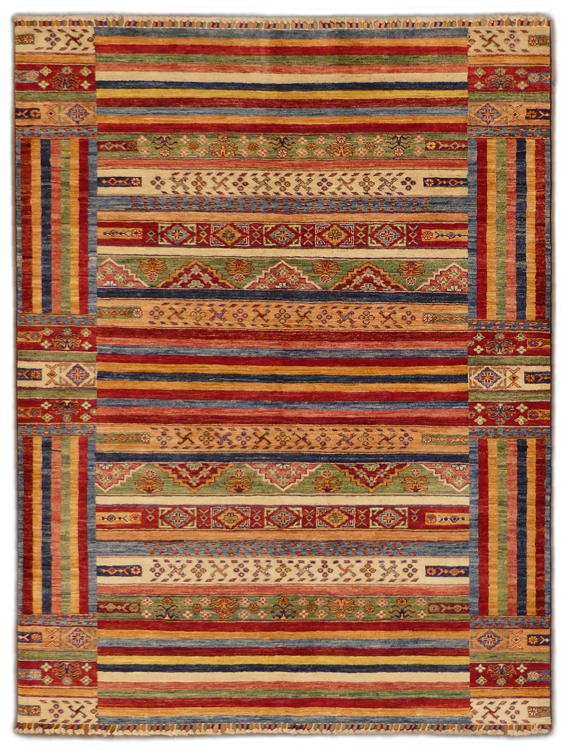 Introducing the 'Sal' woolen rug, a traditional masterpiece woven with a symphony of rich reds, deep blues, and neutral beige tones. Showcasing a harmonious combination of intricate geometric patterns and timeless stripes, 'Sal' embodies an antique charm with a robust palette suitable for a variety of decors. Its natural wool construction ensures durability and a soft underfoot experience. Perfect for adding a touch of elegance and warmth to any living space.