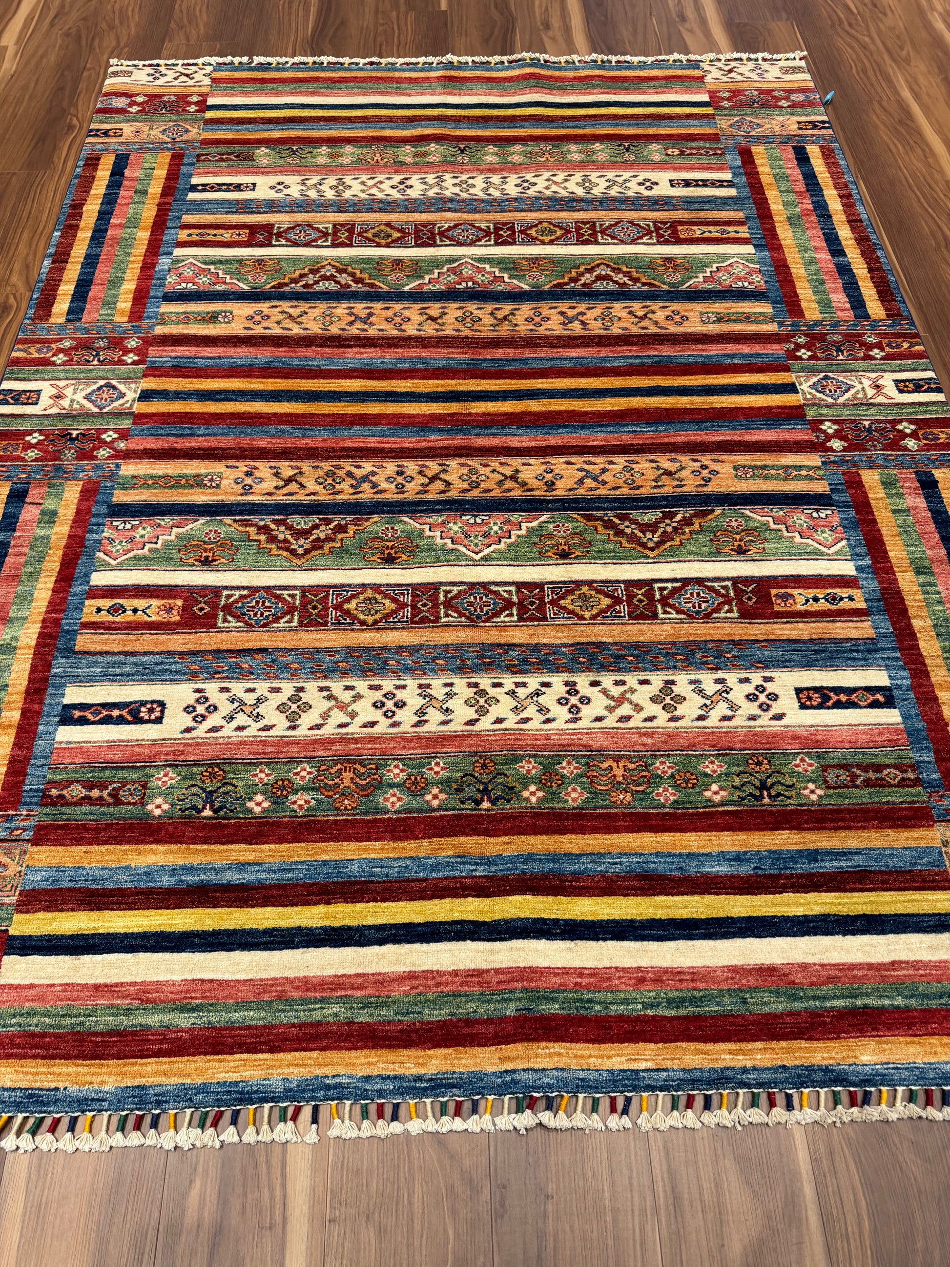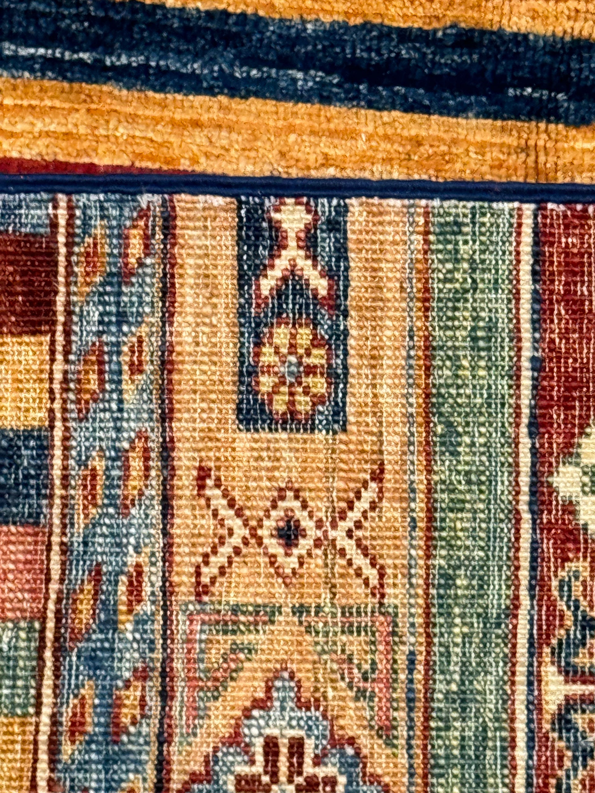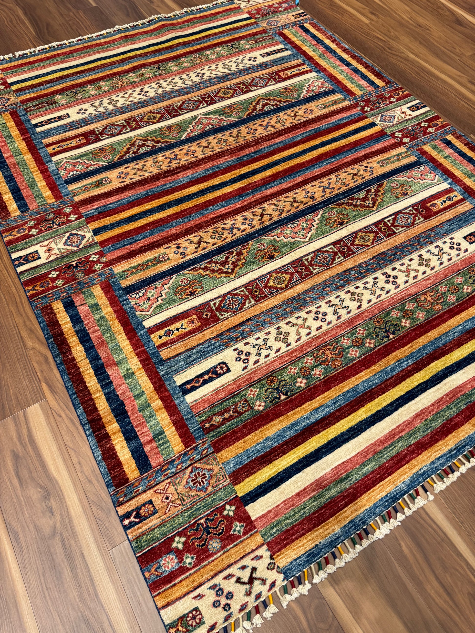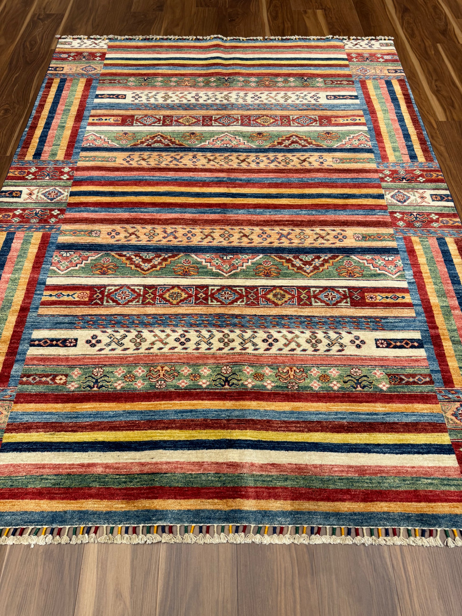 Introducing the 'Sal' woolen rug, a traditional masterpiece woven with a symphony of rich reds, deep blues, and neutral beige tones. Showcasing a harmonious combination of intricate geometric patterns and timeless stripes, 'Sal' embodies an antique charm with a robust palette suitable for a variety of decors. Its natural wool construction ensures durability and a soft underfoot experience. Perfect for adding a touch of elegance and warmth to any living space.