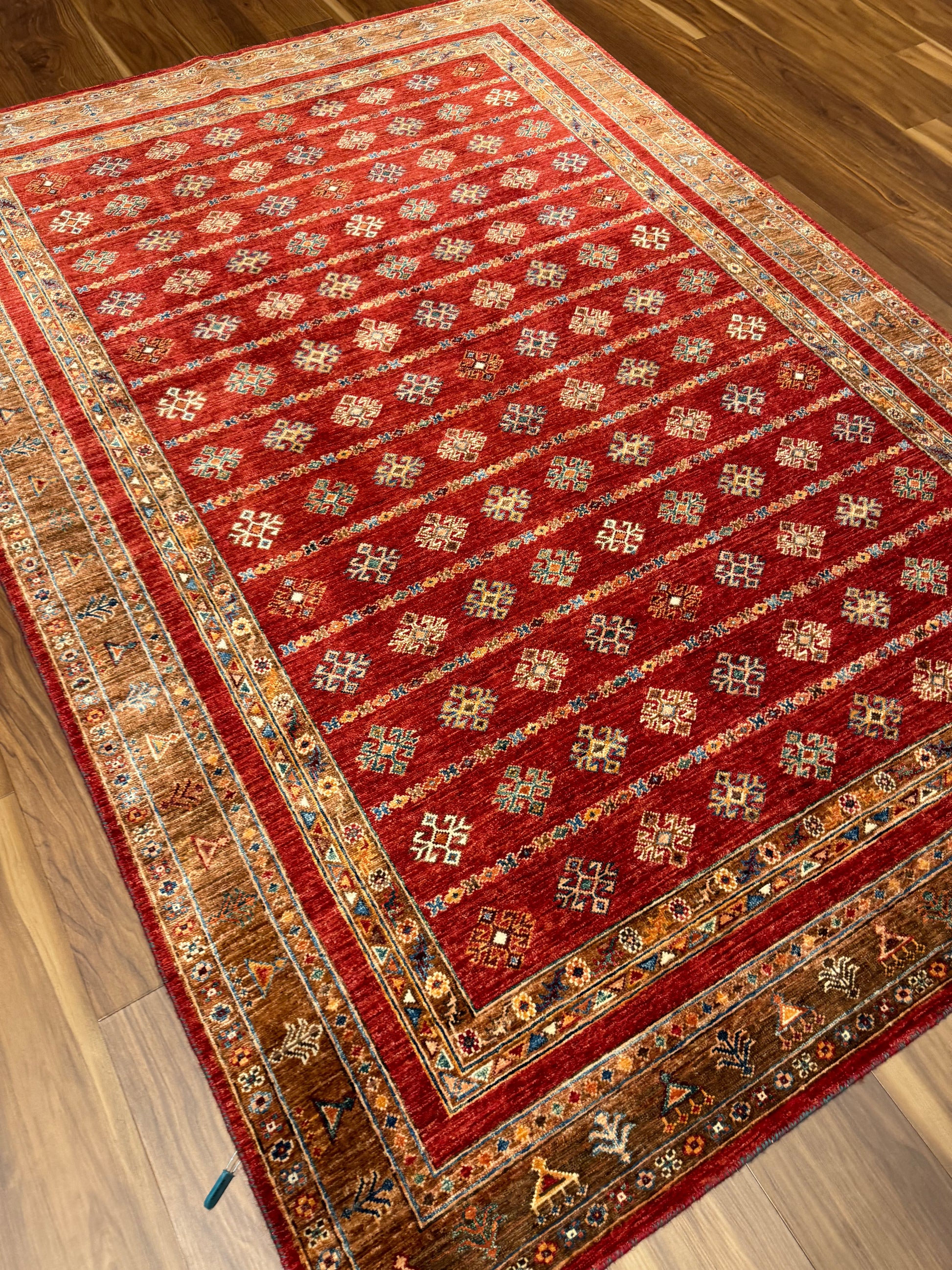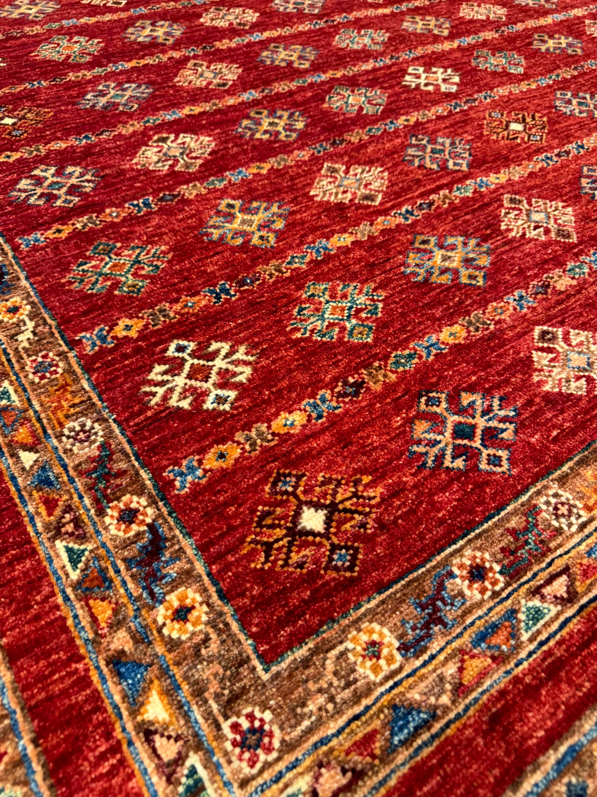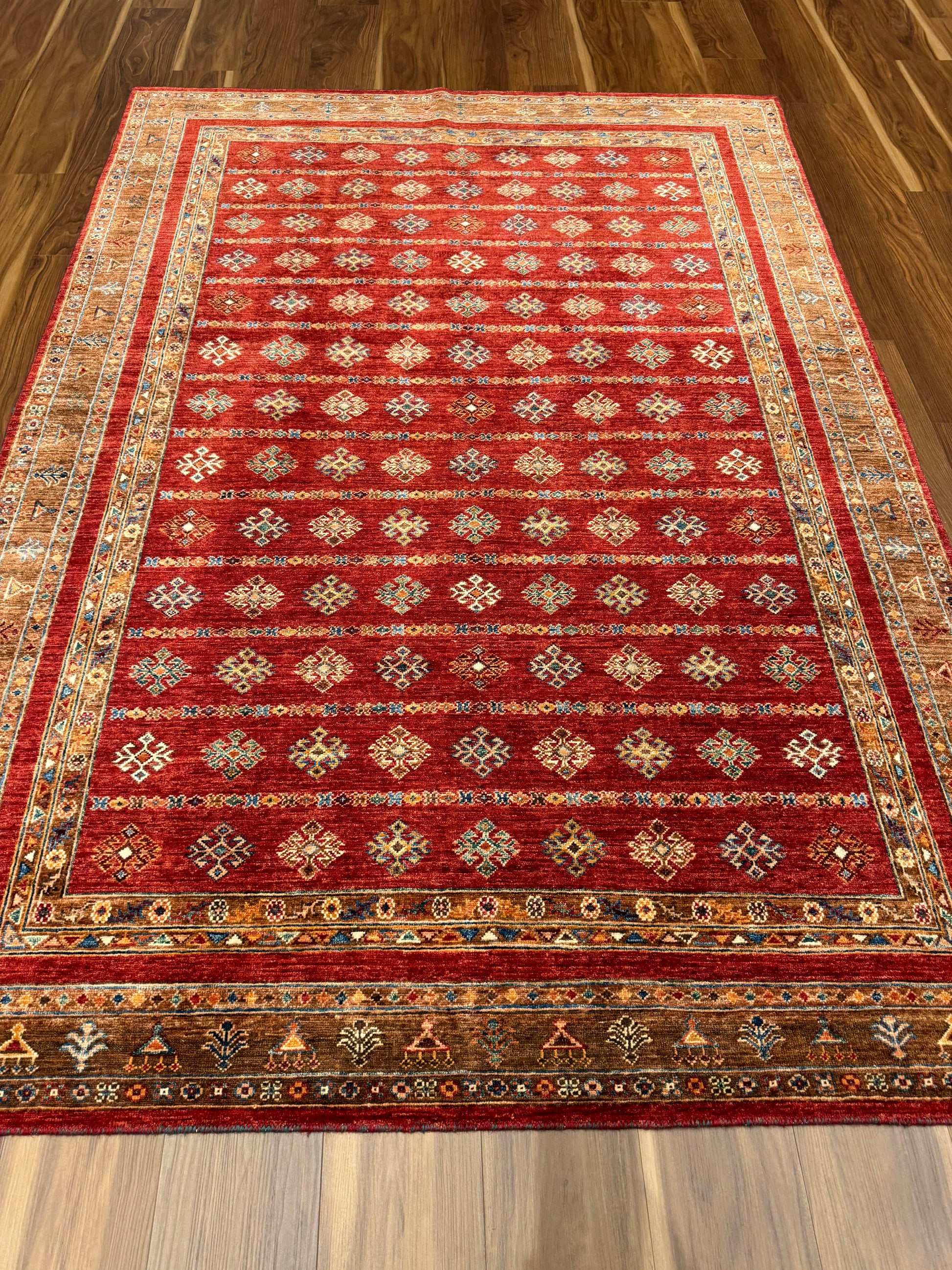 This 'Sal' rug exudes a traditional elegance that can anchor any room with its warm red field and intricate patterns. Crafted from high-quality wool, the rug features repetitive geometric motifs and detailed borders in complementary hues of beige, orange, and hints of blue. It is designed to offer both comfort and timeless charm, making it an ideal choice for those who appreciate classic décor.