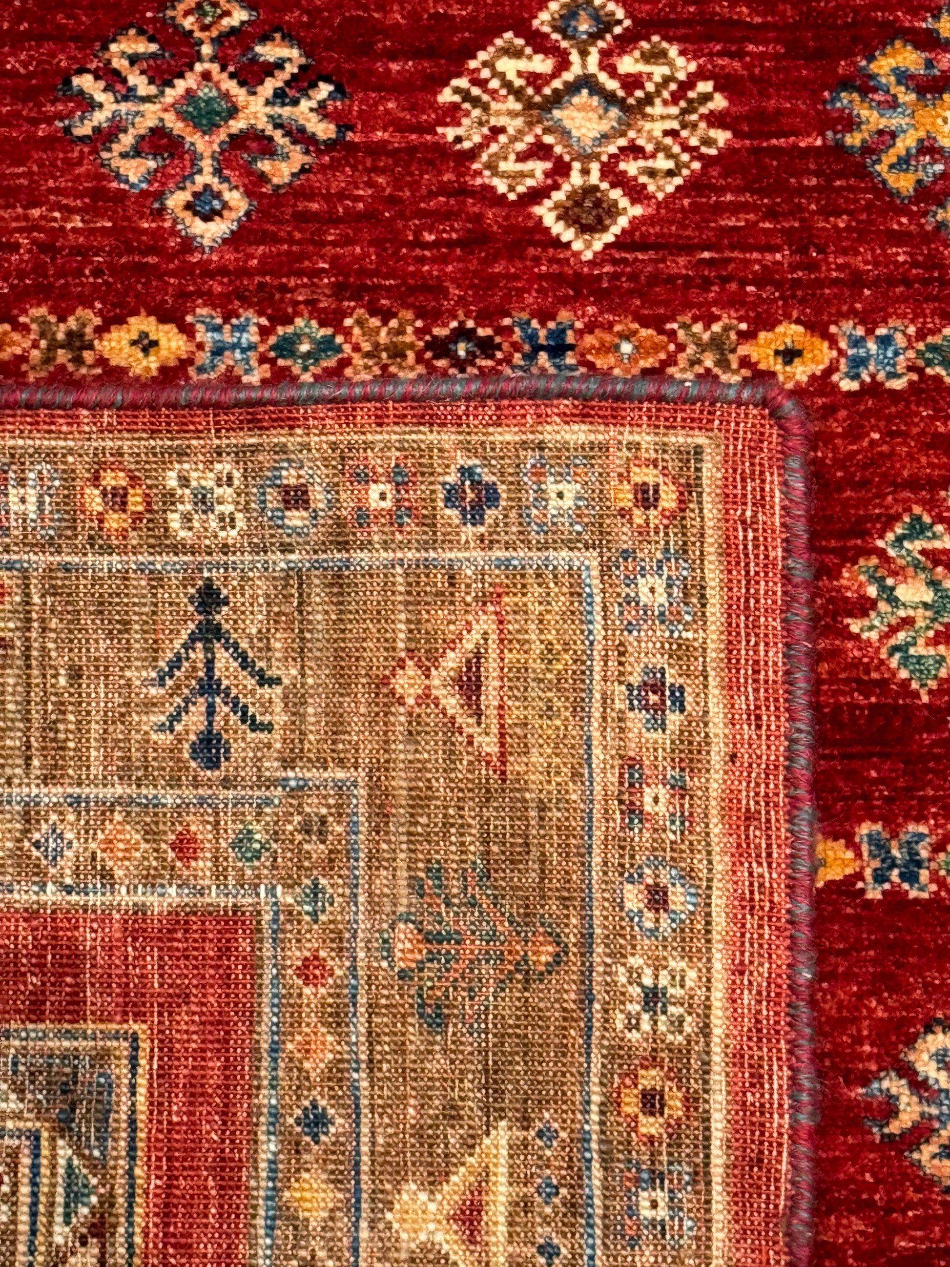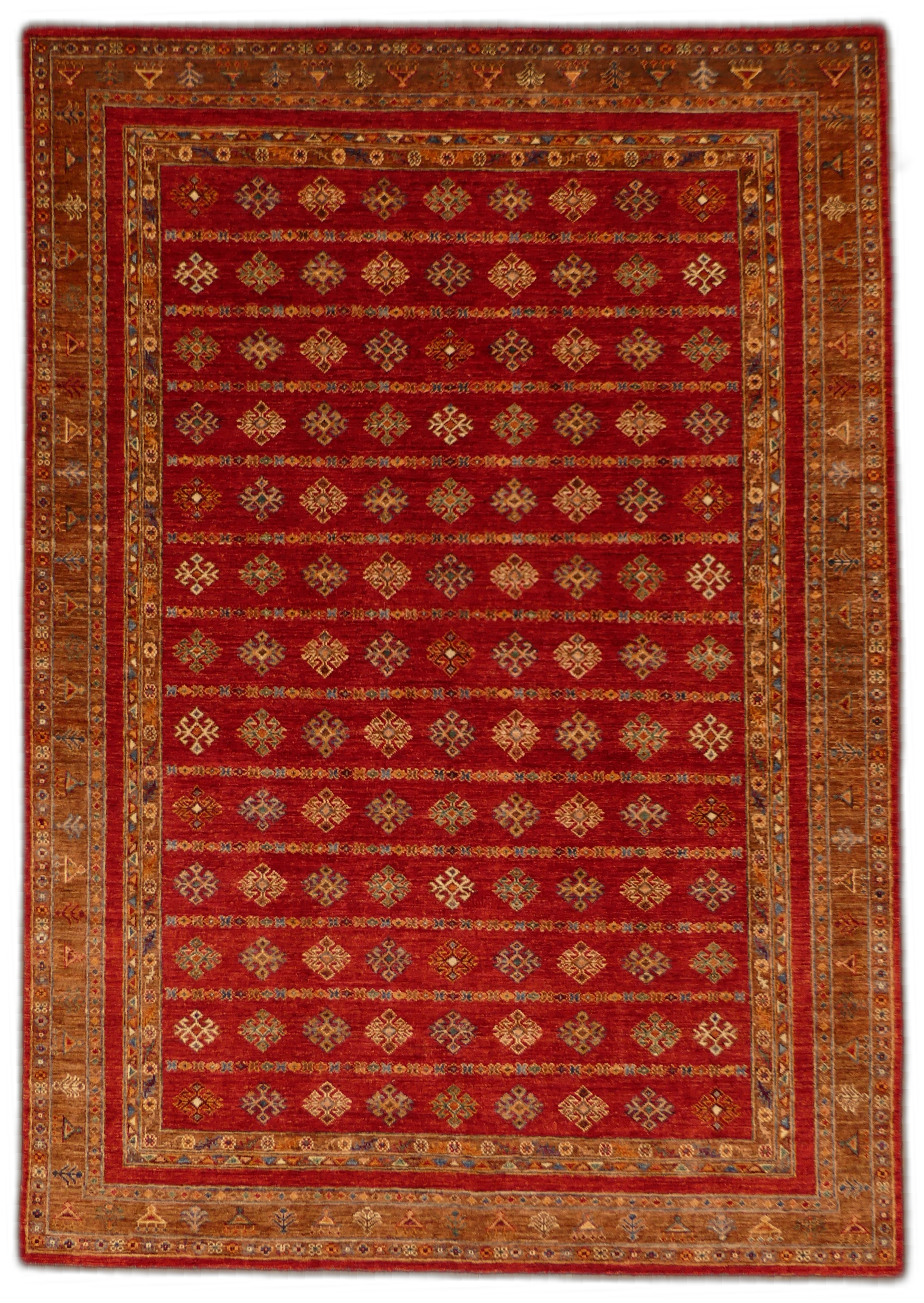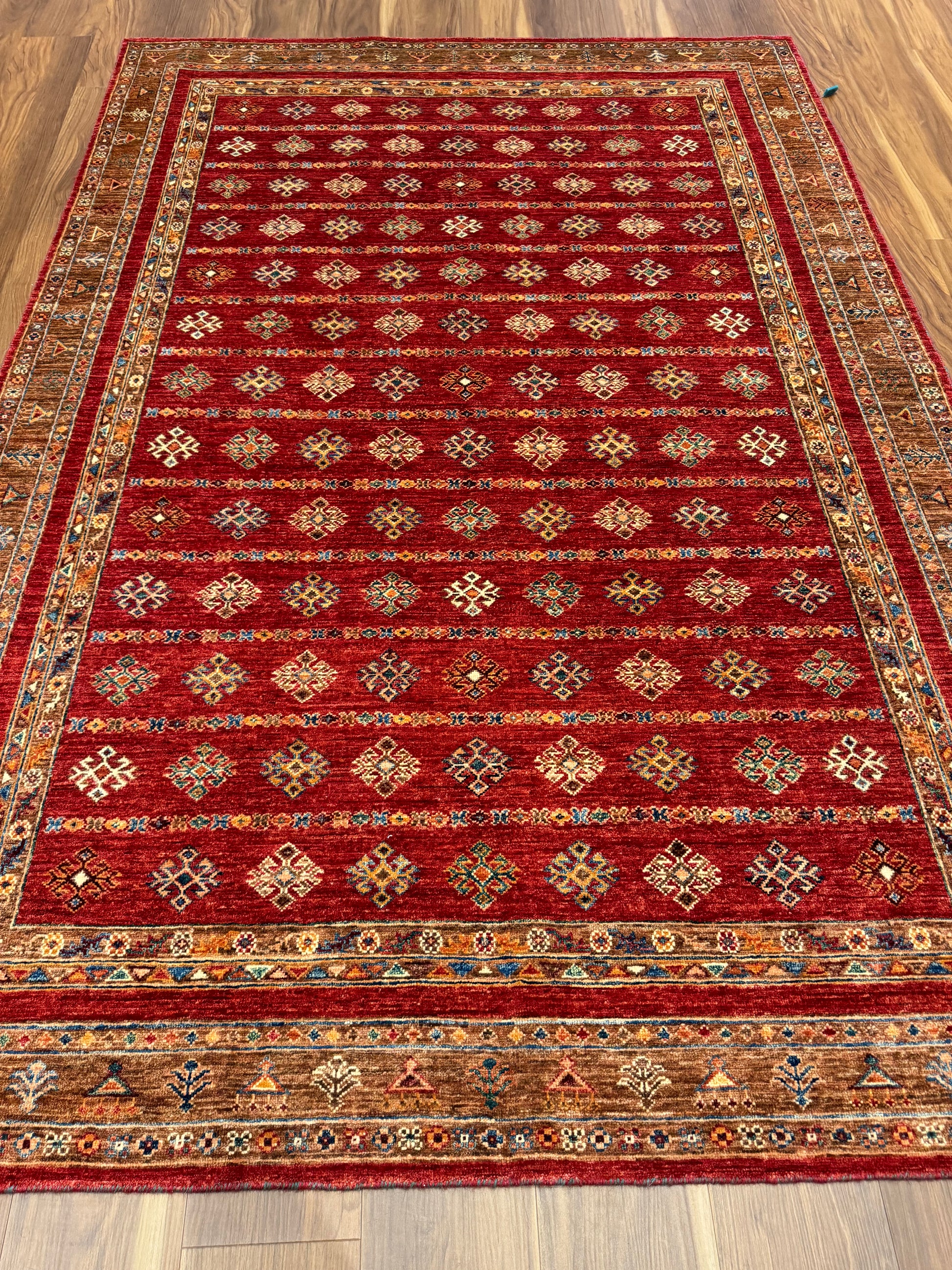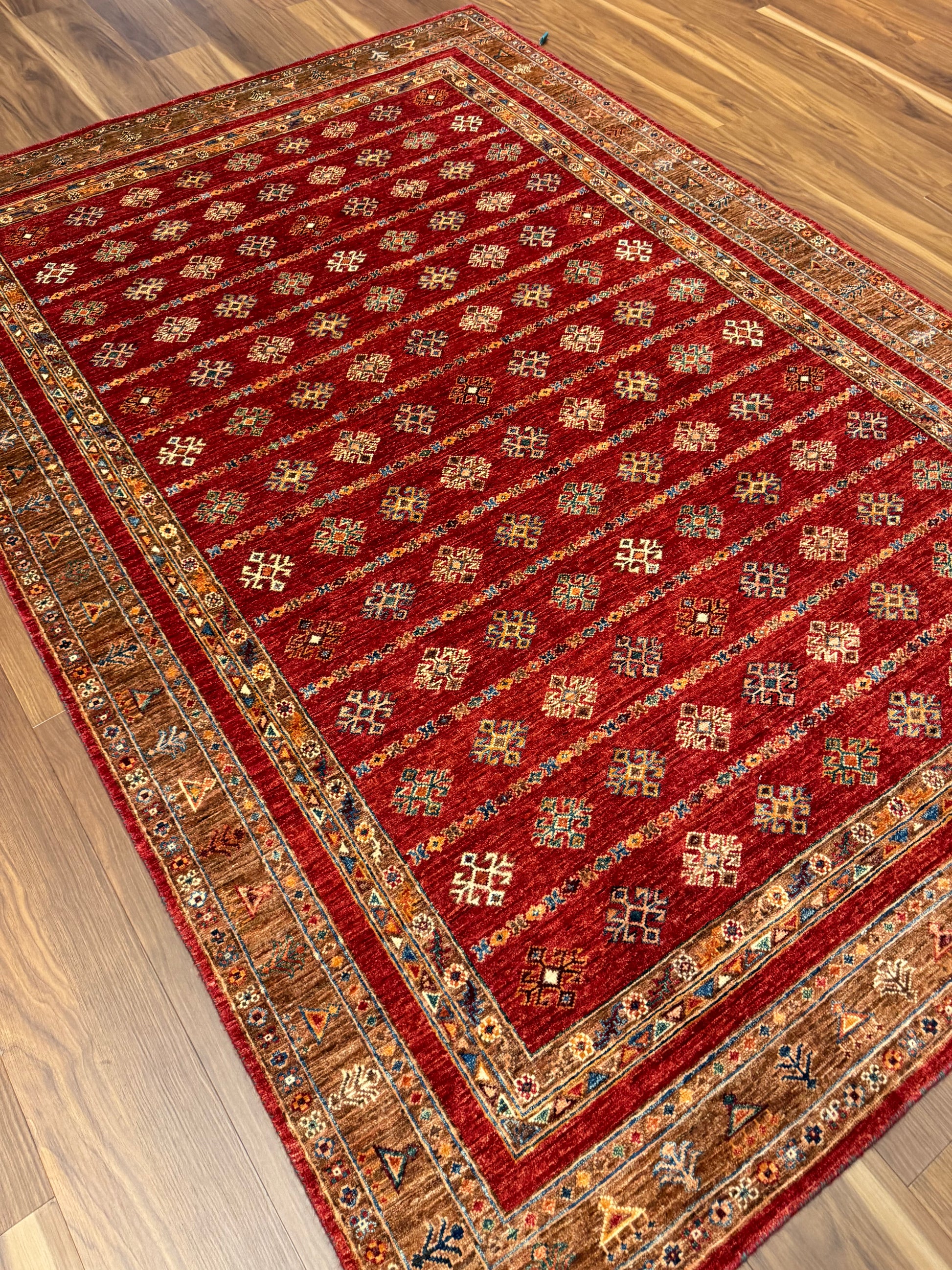 This 'Sal' rug exudes a traditional elegance that can anchor any room with its warm red field and intricate patterns. Crafted from high-quality wool, the rug features repetitive geometric motifs and detailed borders in complementary hues of beige, orange, and hints of blue. It is designed to offer both comfort and timeless charm, making it an ideal choice for those who appreciate classic décor.