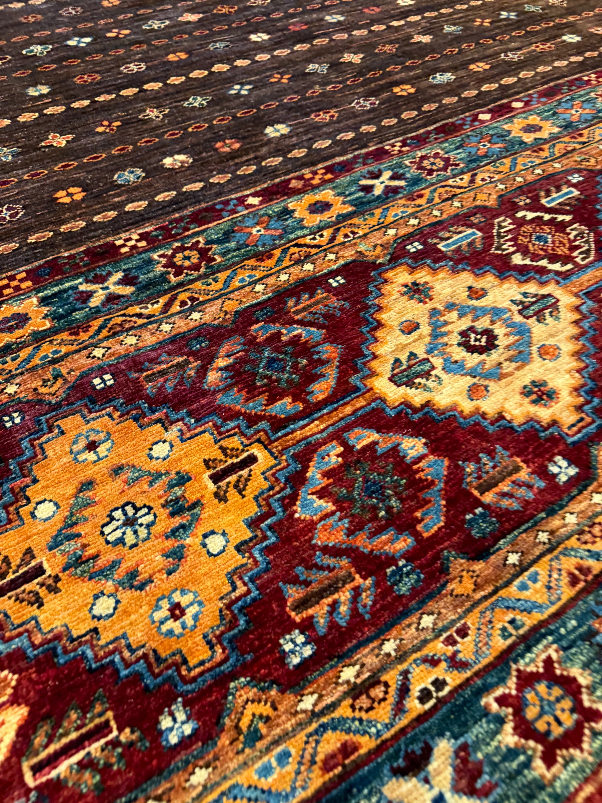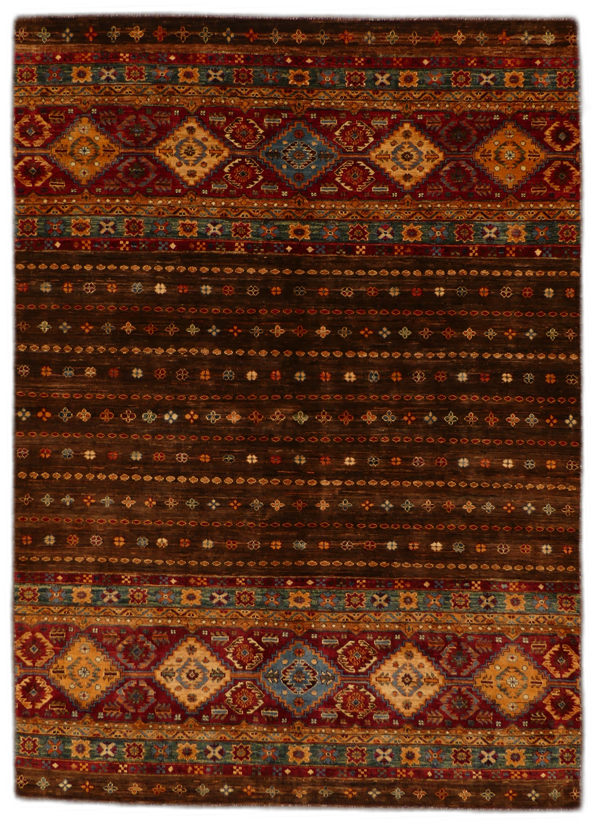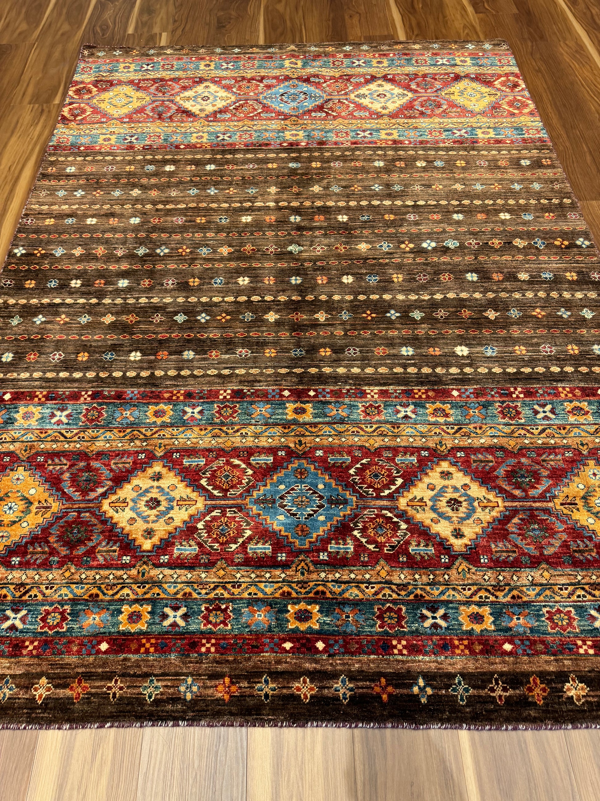 The 'Sal' rug is a traditional woolen masterpiece that weaves together an exquisite selection of rich, warm colors and intricate patterns. With its repeating geometric motifs and border accents, this rug embodies a sense of timeless elegance. Its deep reds, browns, and touches of blue and orange create a welcoming and cohesive design suitable for classic and contemporary interiors alike.