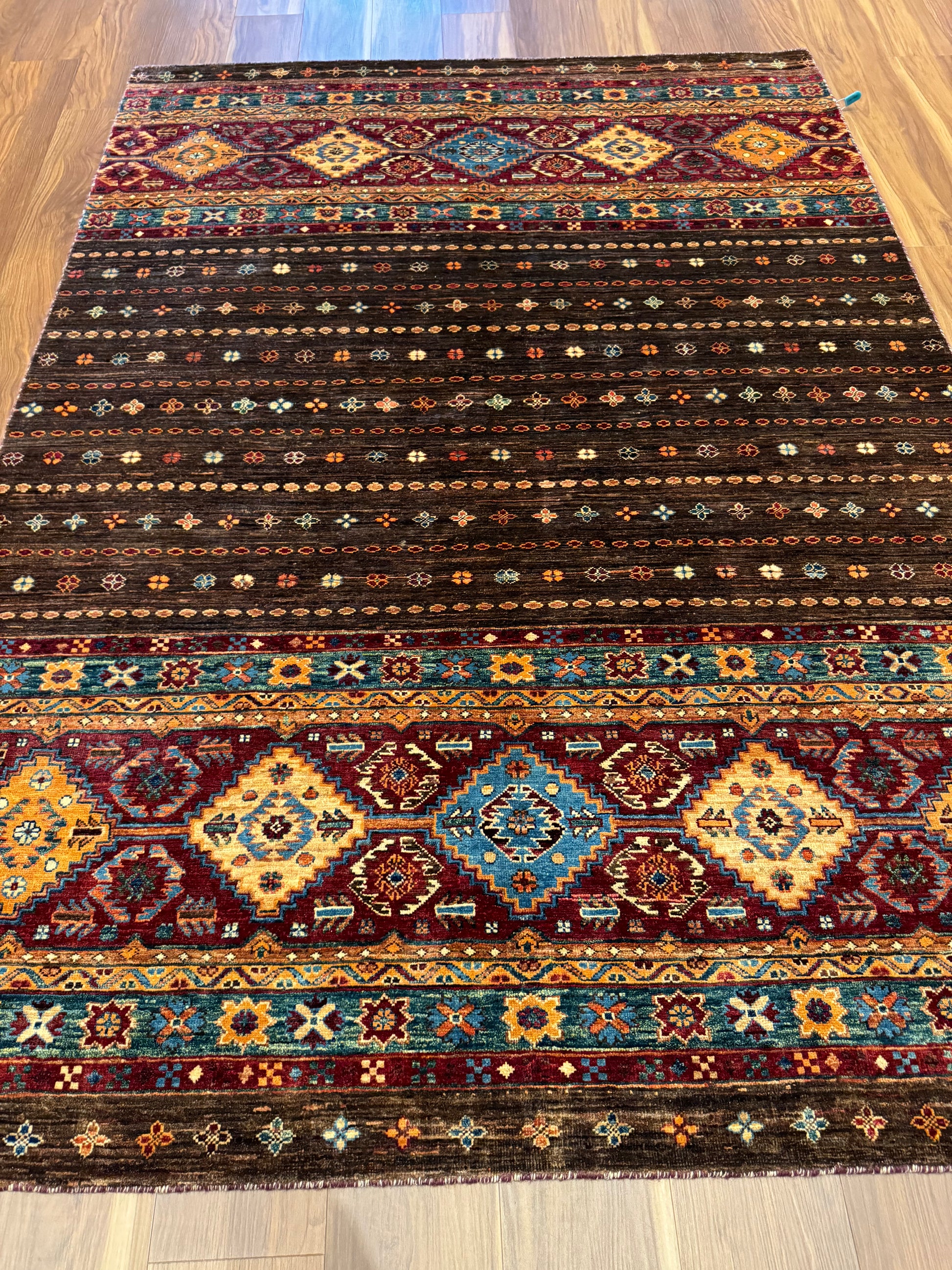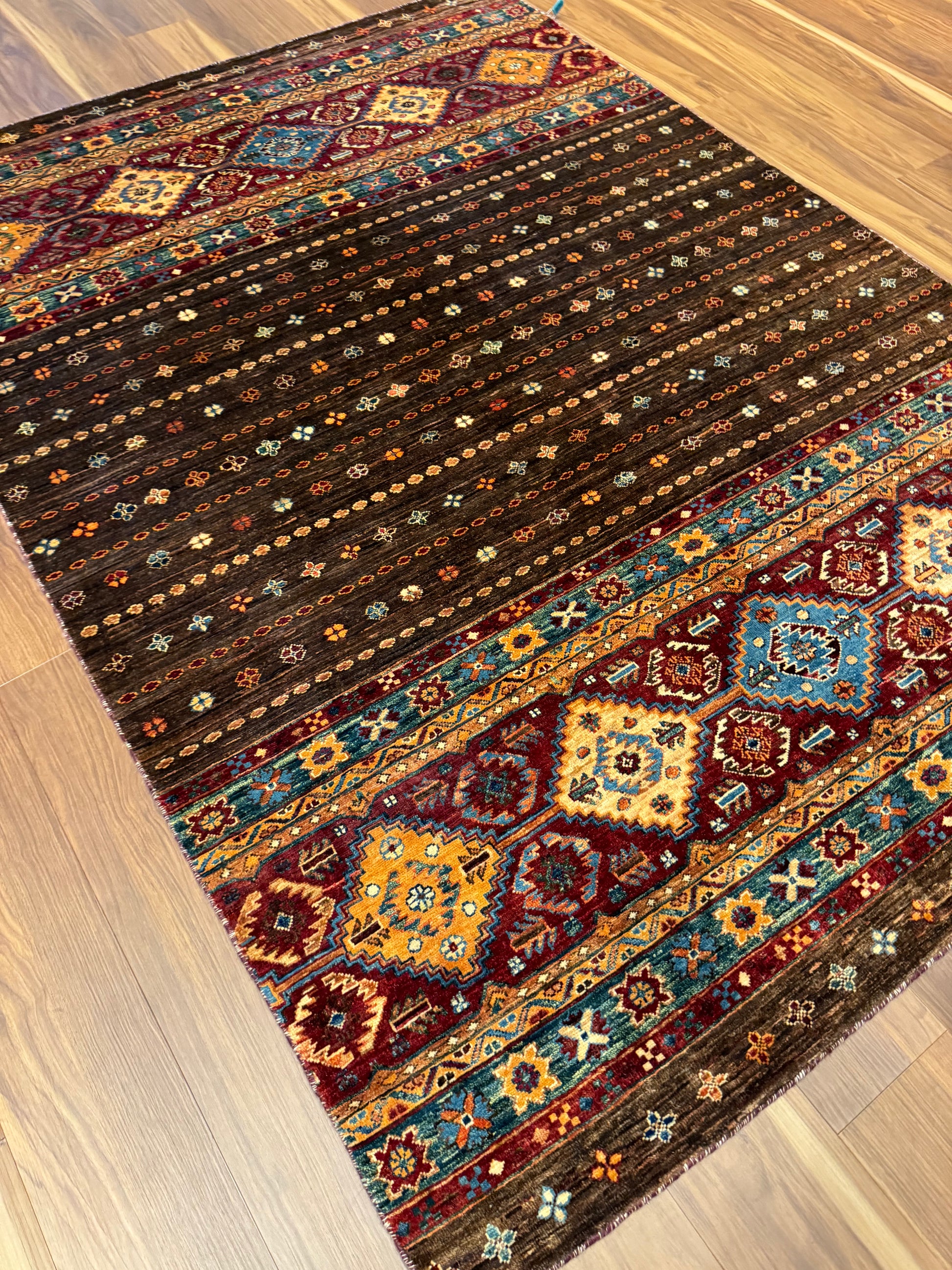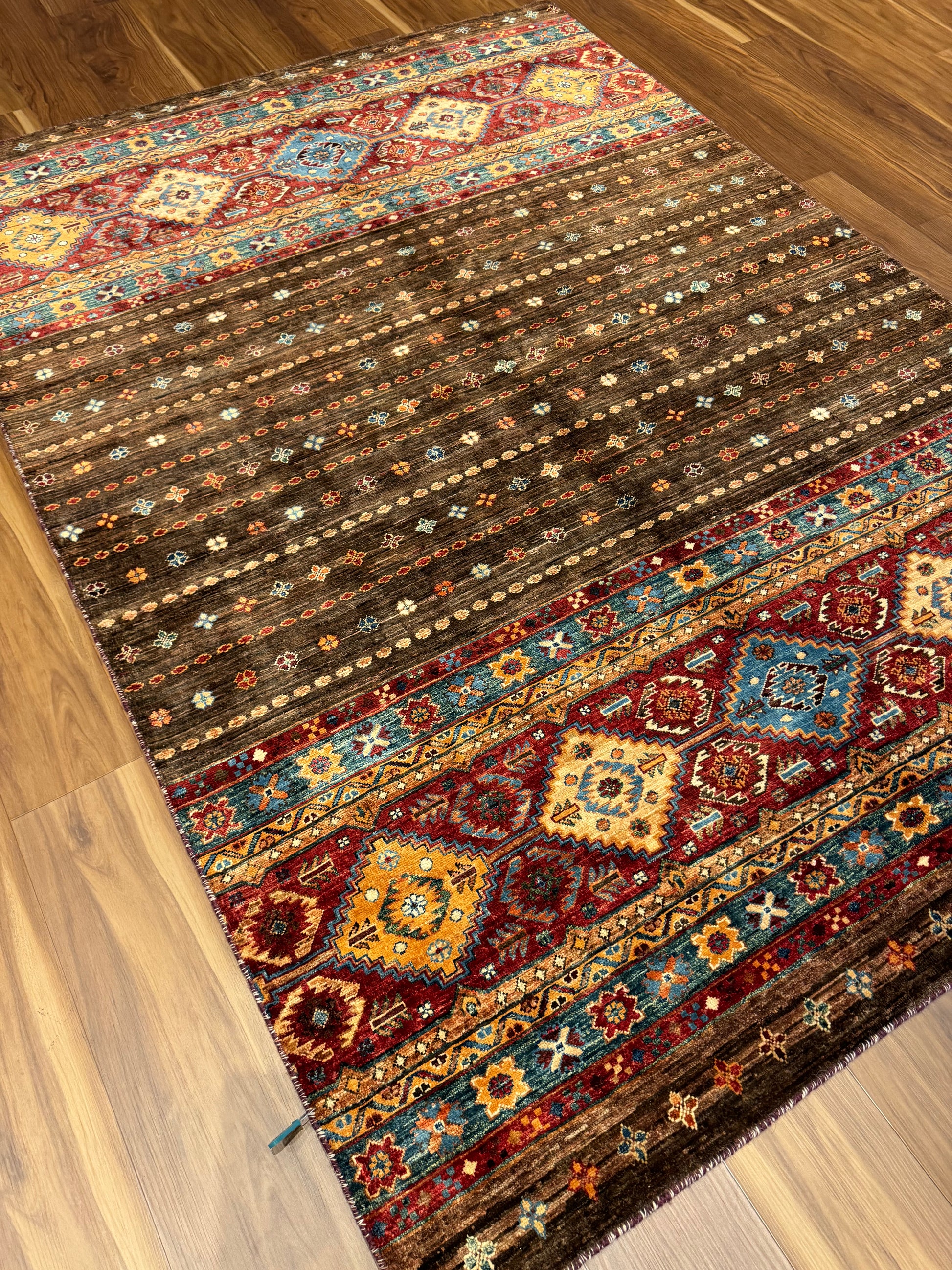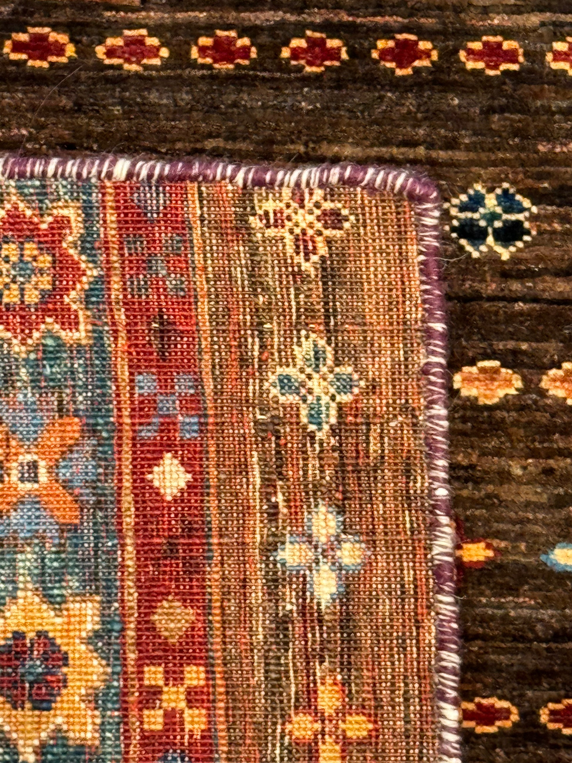 The 'Sal' rug is a traditional woolen masterpiece that weaves together an exquisite selection of rich, warm colors and intricate patterns. With its repeating geometric motifs and border accents, this rug embodies a sense of timeless elegance. Its deep reds, browns, and touches of blue and orange create a welcoming and cohesive design suitable for classic and contemporary interiors alike.