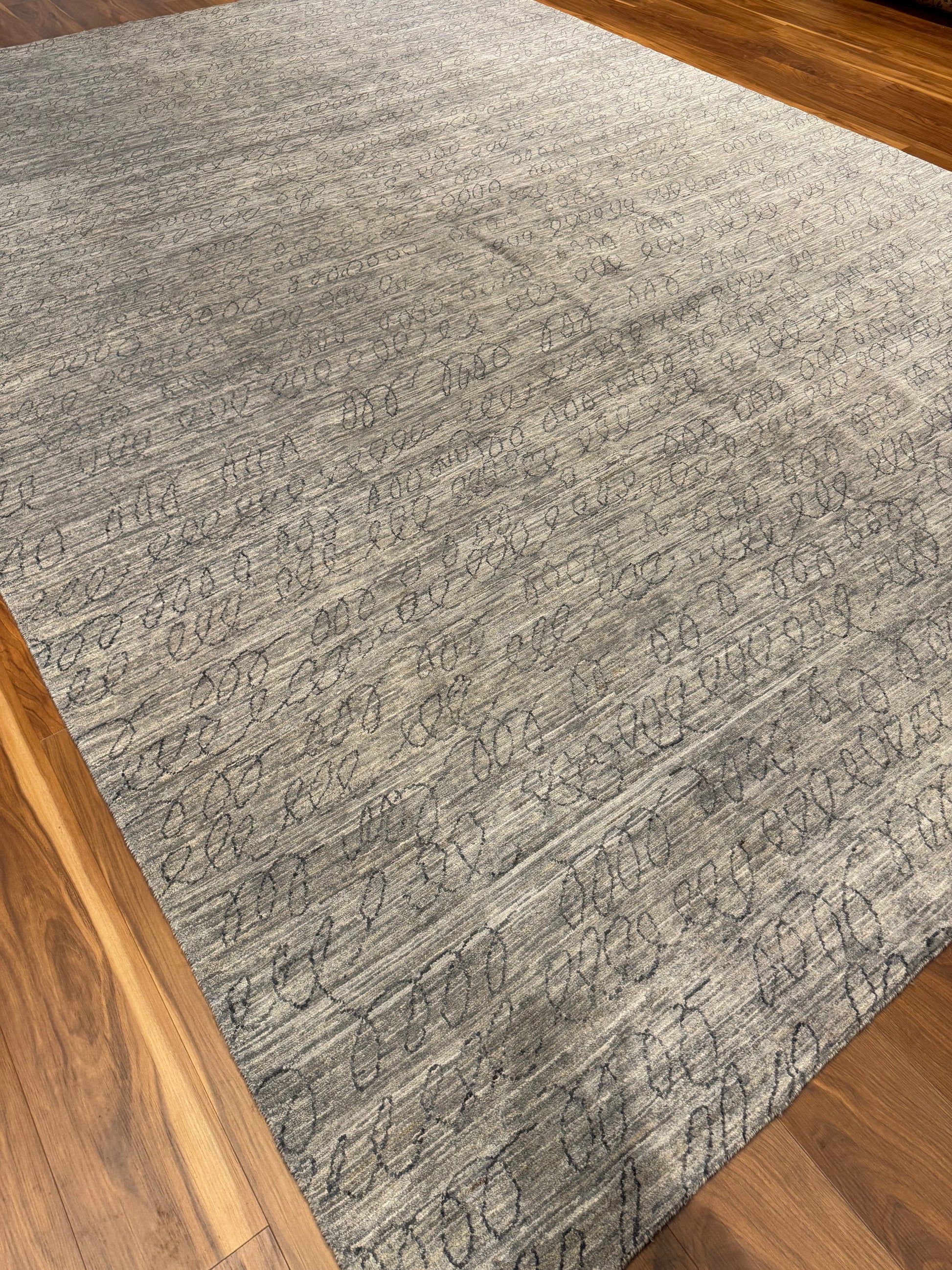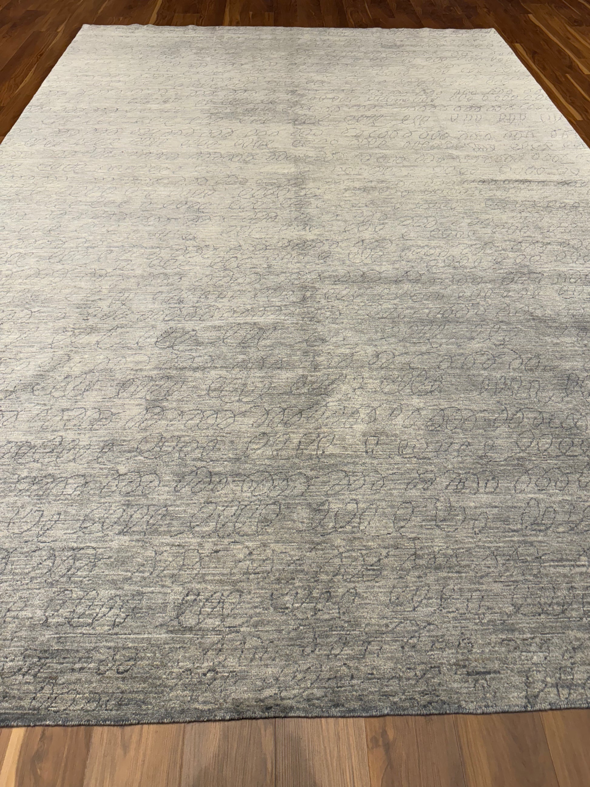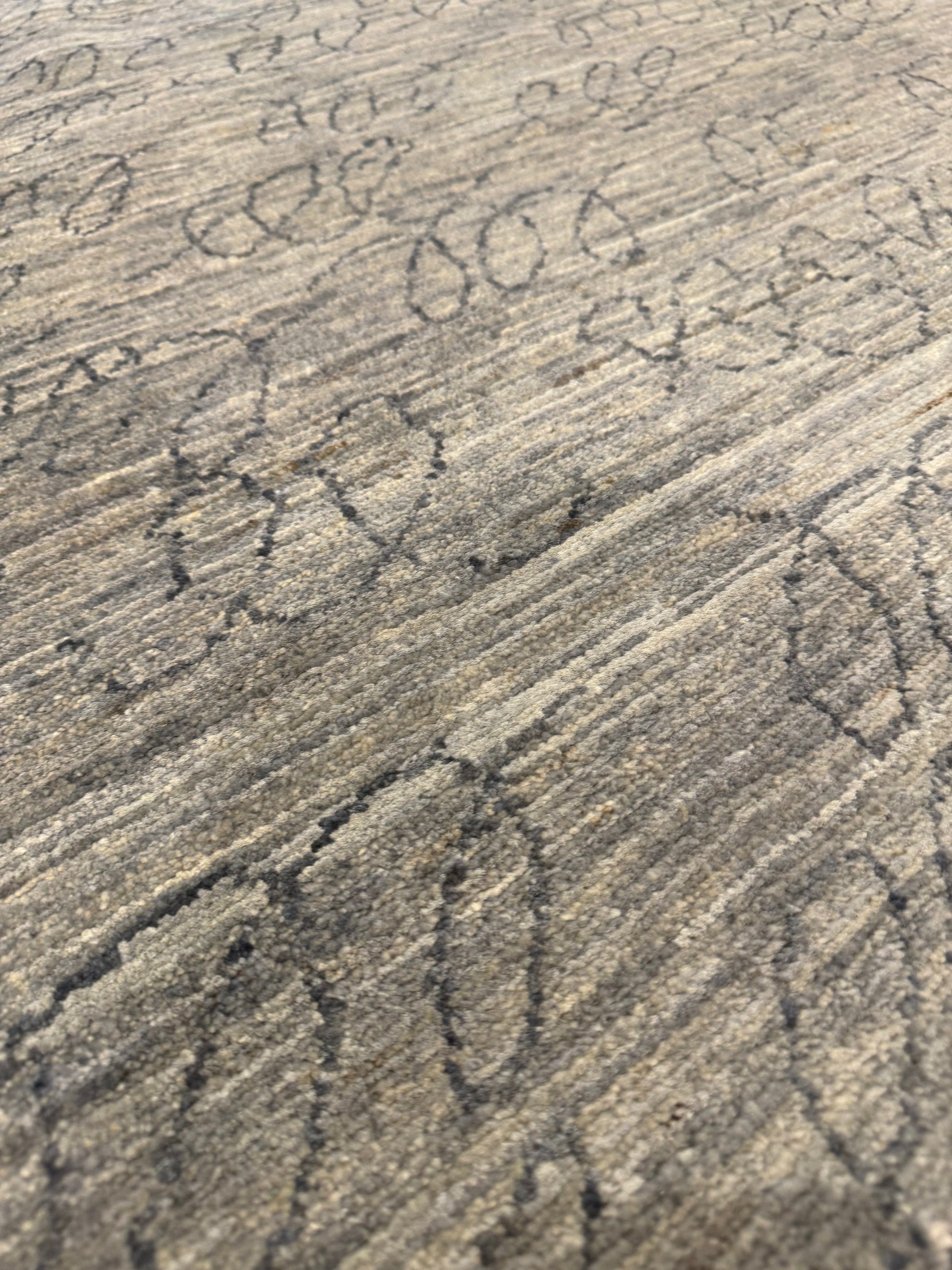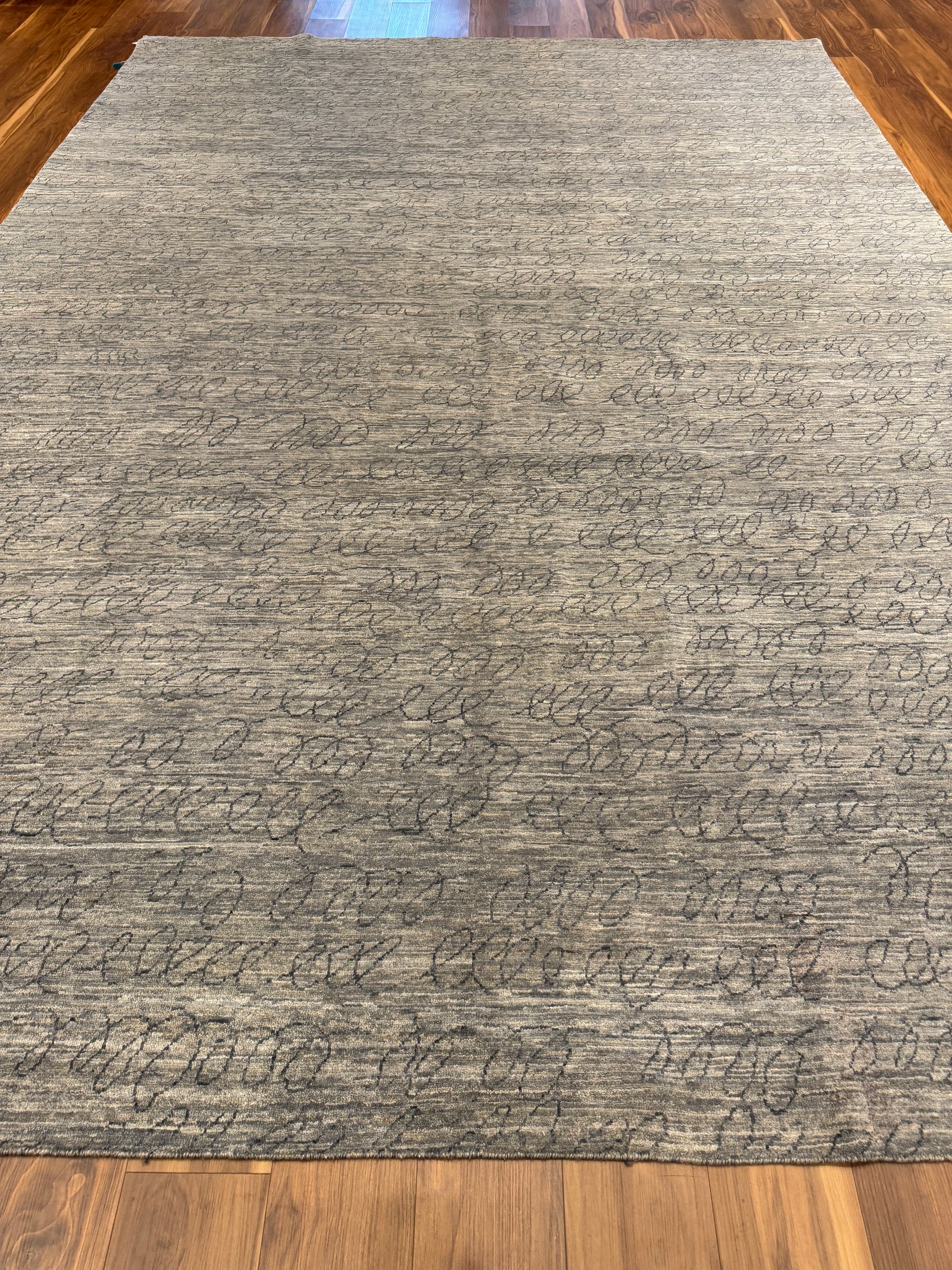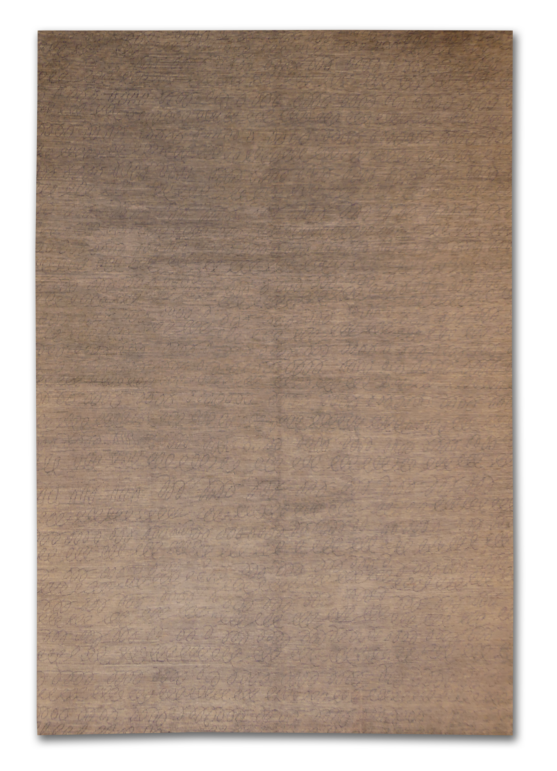 This elegantly crafted contemporary rug features a sophisticated gradation of brown to beige hues, imbued with a subtle taupe script-like pattern. Made of the finest wool, it offers both comfort and durability. Perfect for adding a modern yet cozy touch to any room.