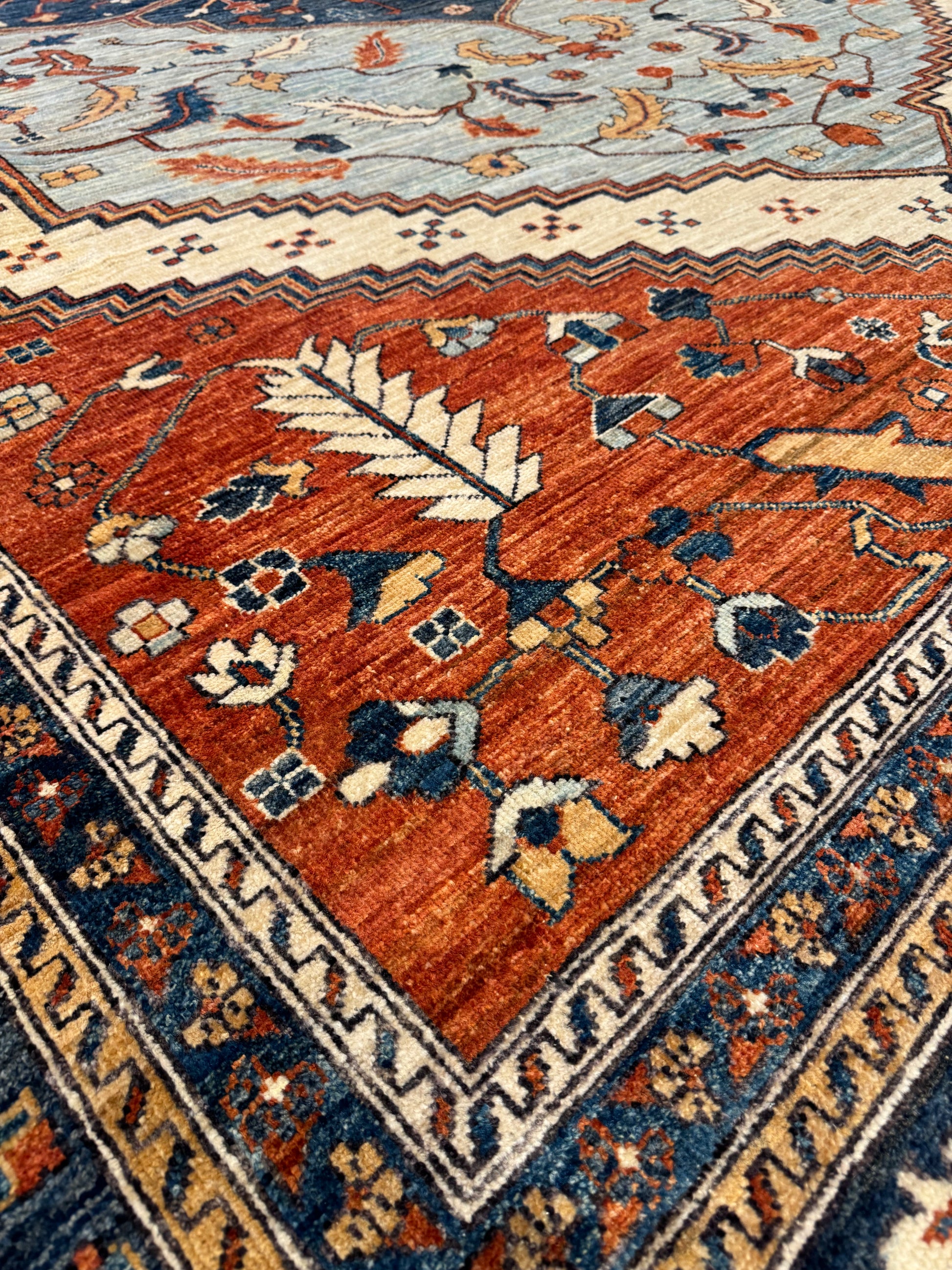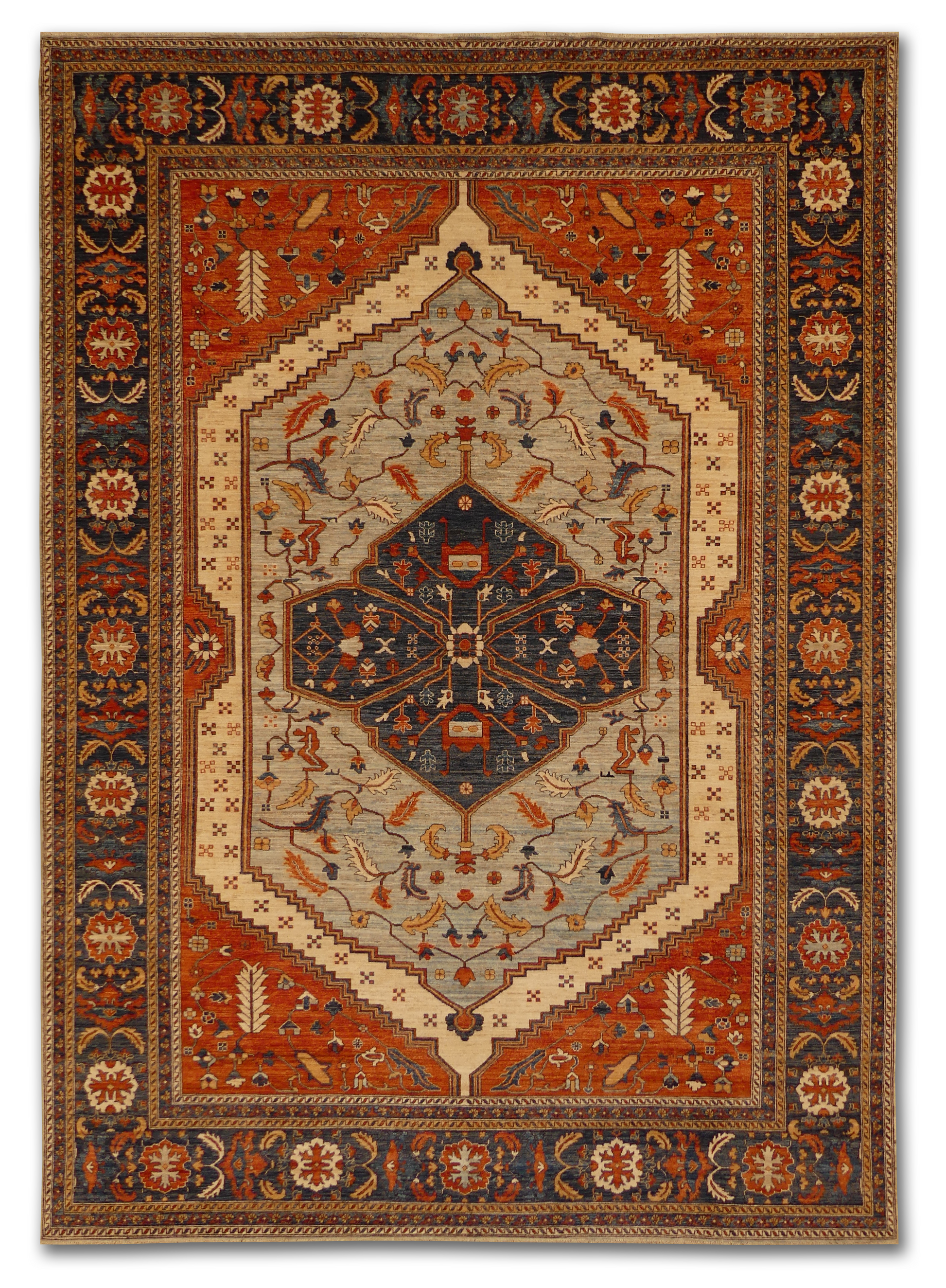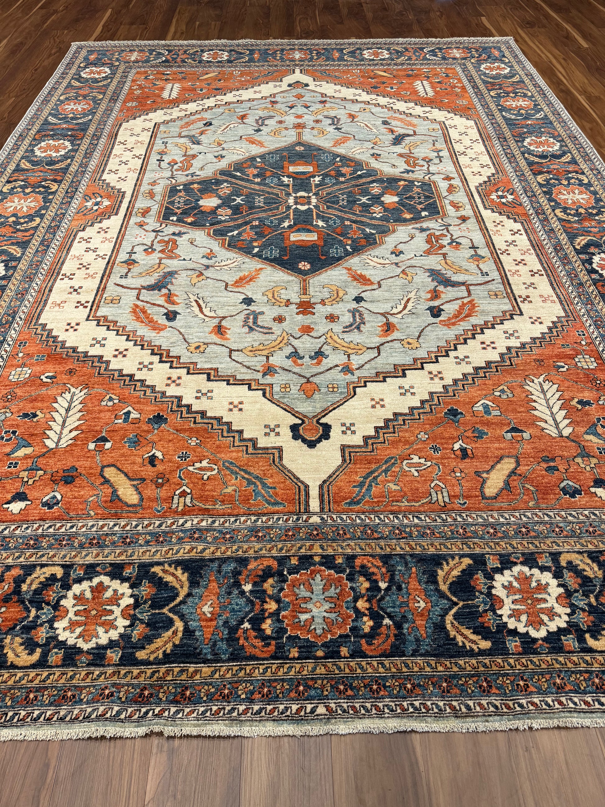 This exquisite Serapi (Ariana) rug boasts a timeless elegance, with a rich burnt orange field complemented by deep navy blue and beige accents. Its intricate geometric and botanical motifs are masterfully woven, reflecting a heritage of skilled craftsmanship. The wool construction promises durability and a plush feel underfoot, making it a luxurious addition to any interior.