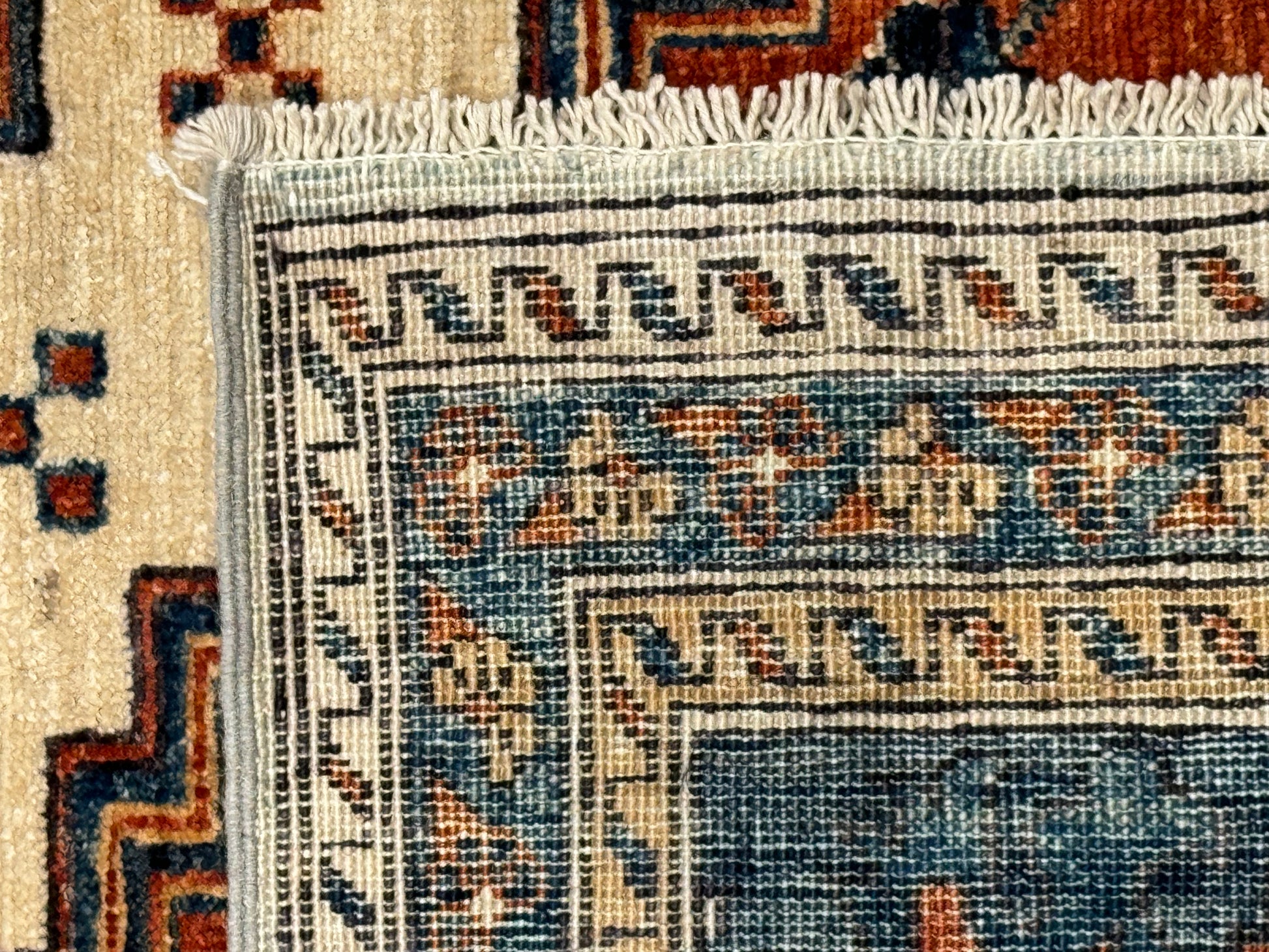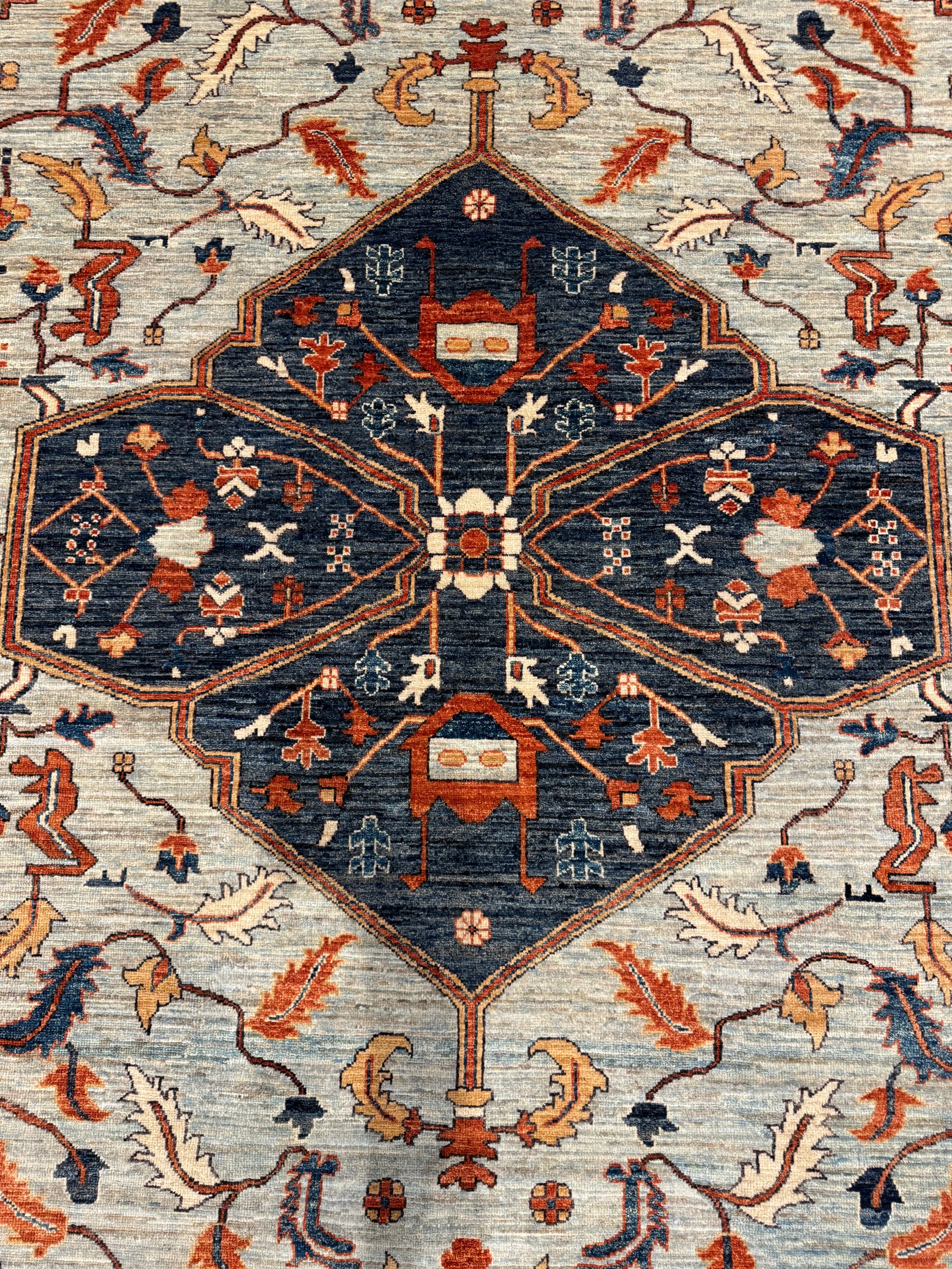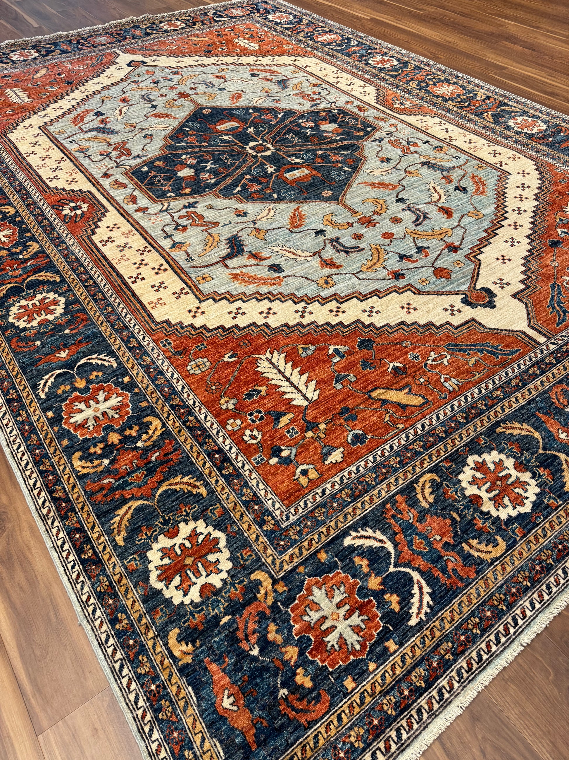 This exquisite Serapi (Ariana) rug boasts a timeless elegance, with a rich burnt orange field complemented by deep navy blue and beige accents. Its intricate geometric and botanical motifs are masterfully woven, reflecting a heritage of skilled craftsmanship. The wool construction promises durability and a plush feel underfoot, making it a luxurious addition to any interior.