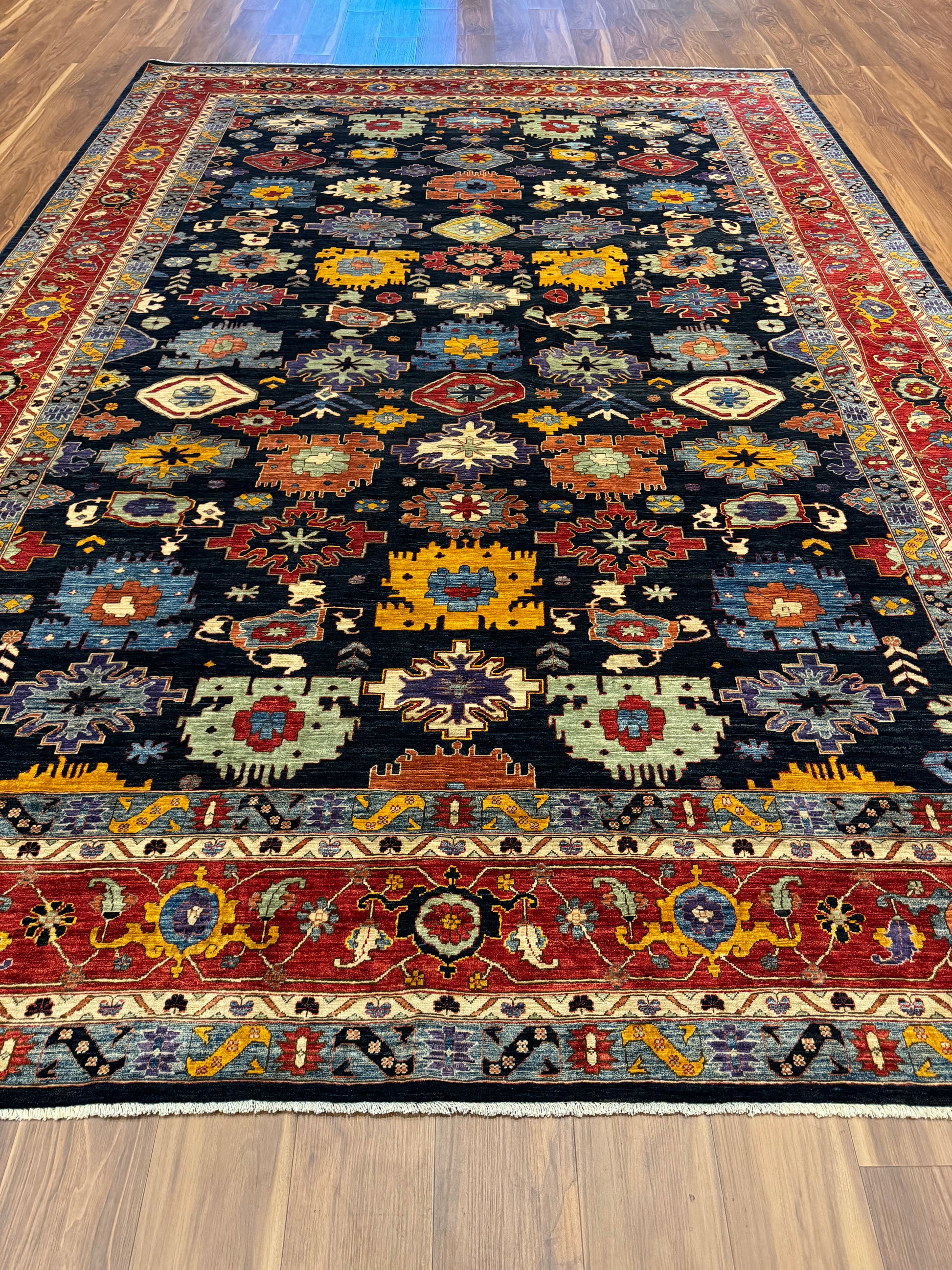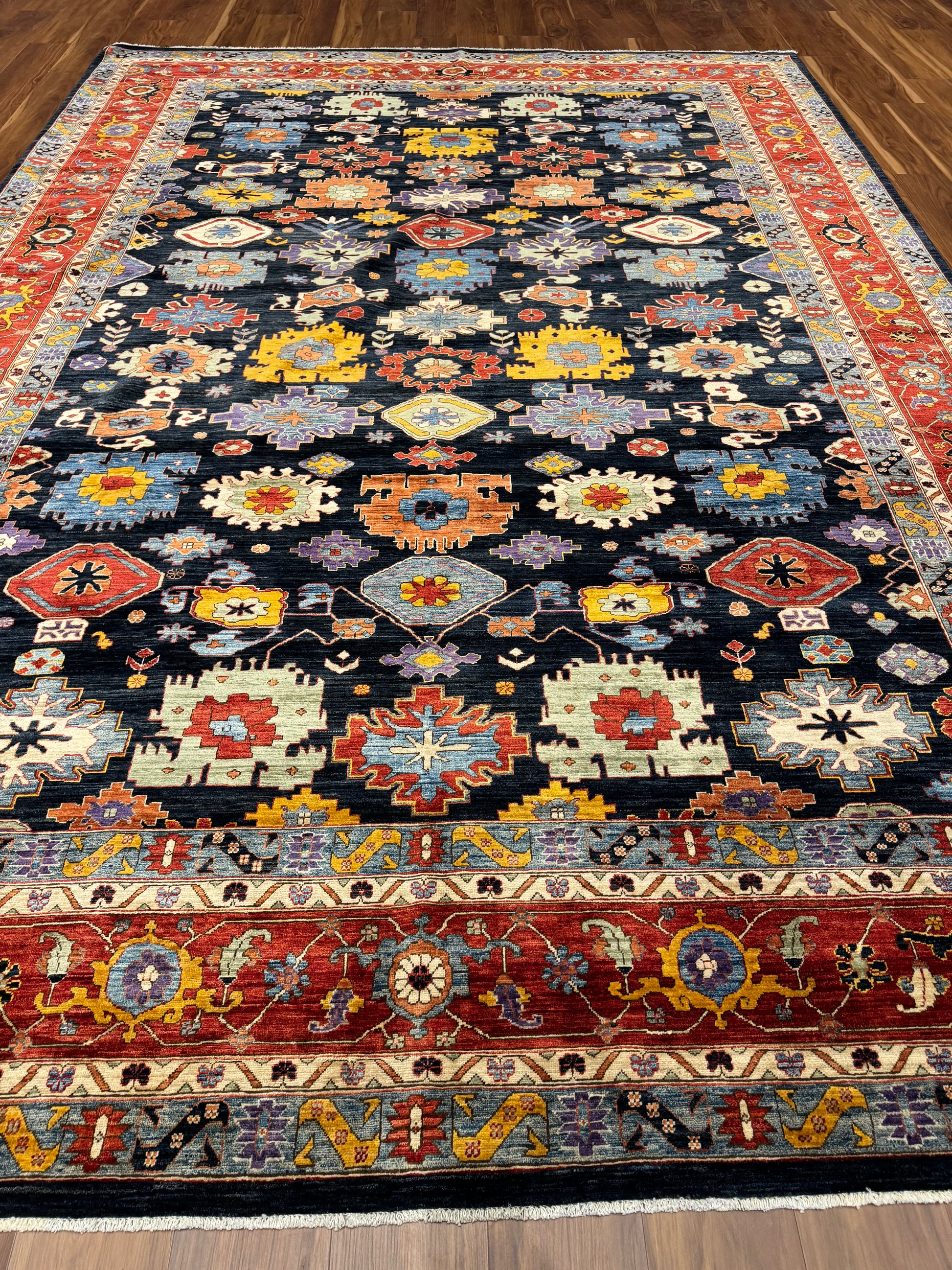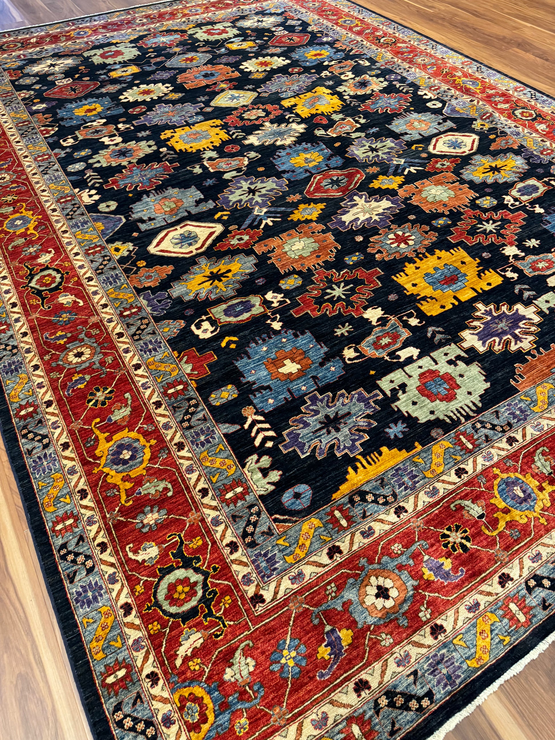 This exquisite Serapi rug is a masterpiece of traditional design, handwoven with the finest quality wool. Featuring a rich black backdrop, the rug is adorned with vibrant motifs in red, gold, and blue tones. Each detailed emblem is carefully crafted to create a sense of depth and luxury. The border is an intricate display of complementing colors and patterns, which frame this artwork magnificently. It is a timeless piece that exudes elegance and is sure to be the focal point of any room.