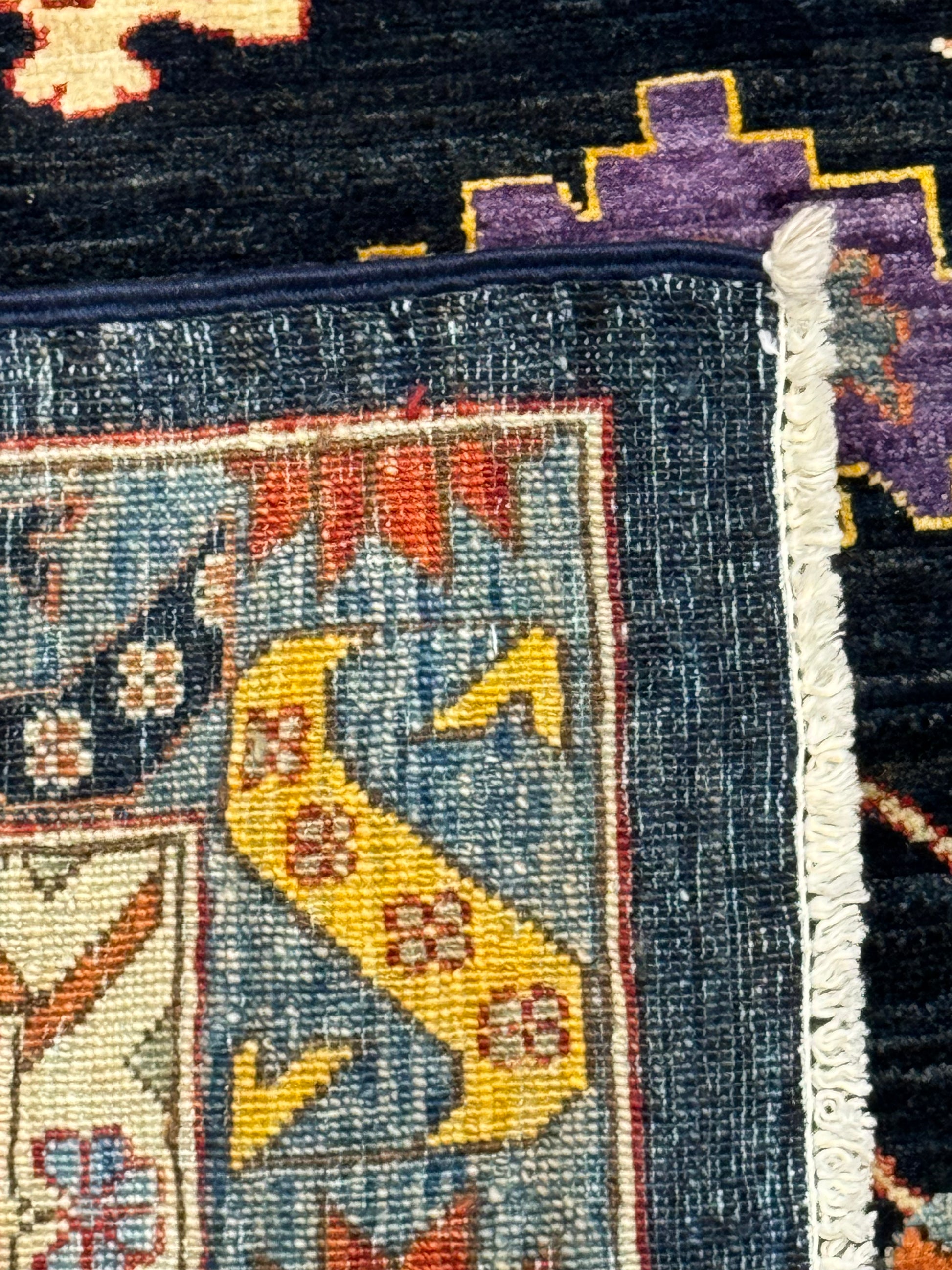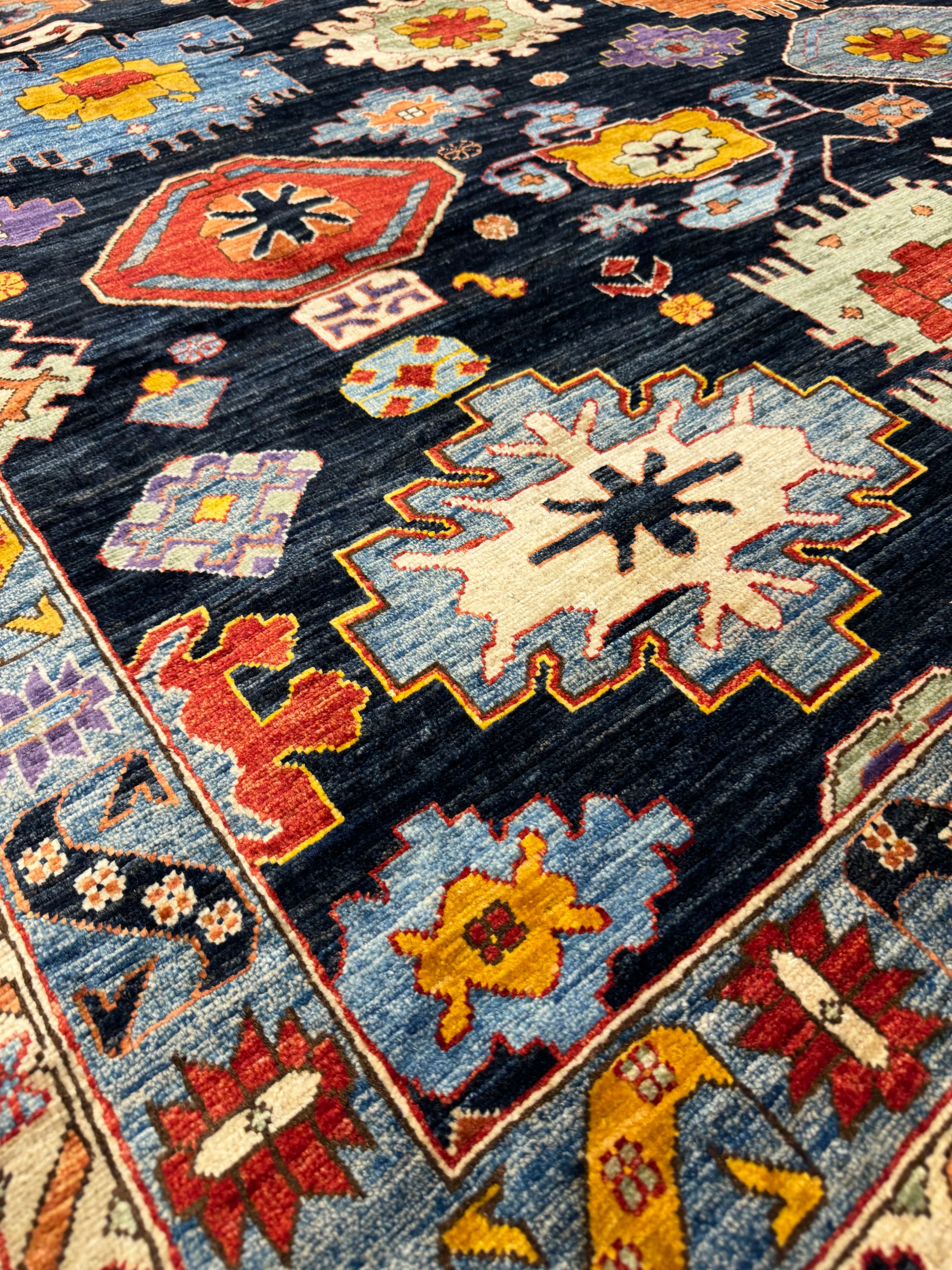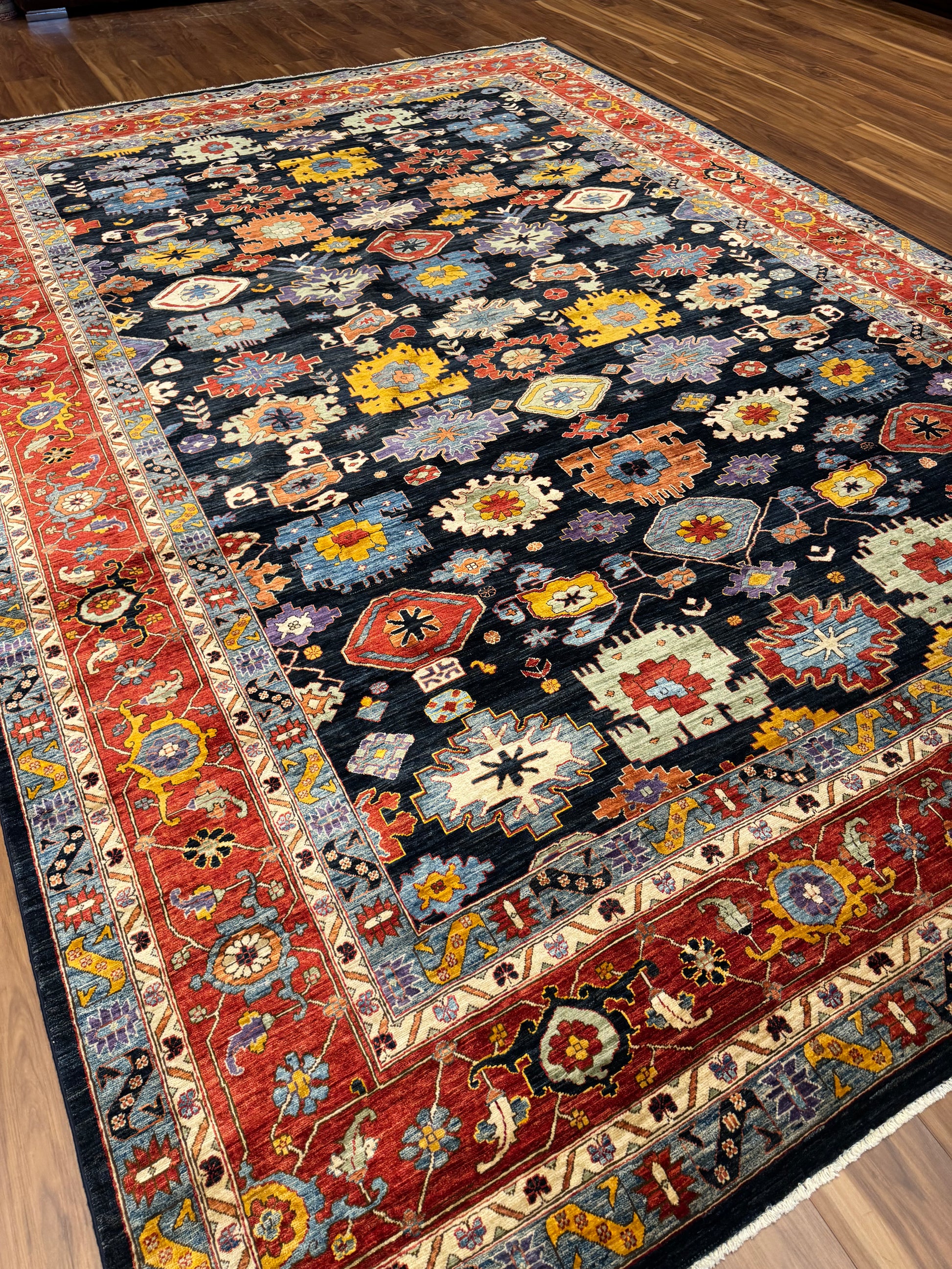 This exquisite Serapi rug is a masterpiece of traditional design, handwoven with the finest quality wool. Featuring a rich black backdrop, the rug is adorned with vibrant motifs in red, gold, and blue tones. Each detailed emblem is carefully crafted to create a sense of depth and luxury. The border is an intricate display of complementing colors and patterns, which frame this artwork magnificently. It is a timeless piece that exudes elegance and is sure to be the focal point of any room.