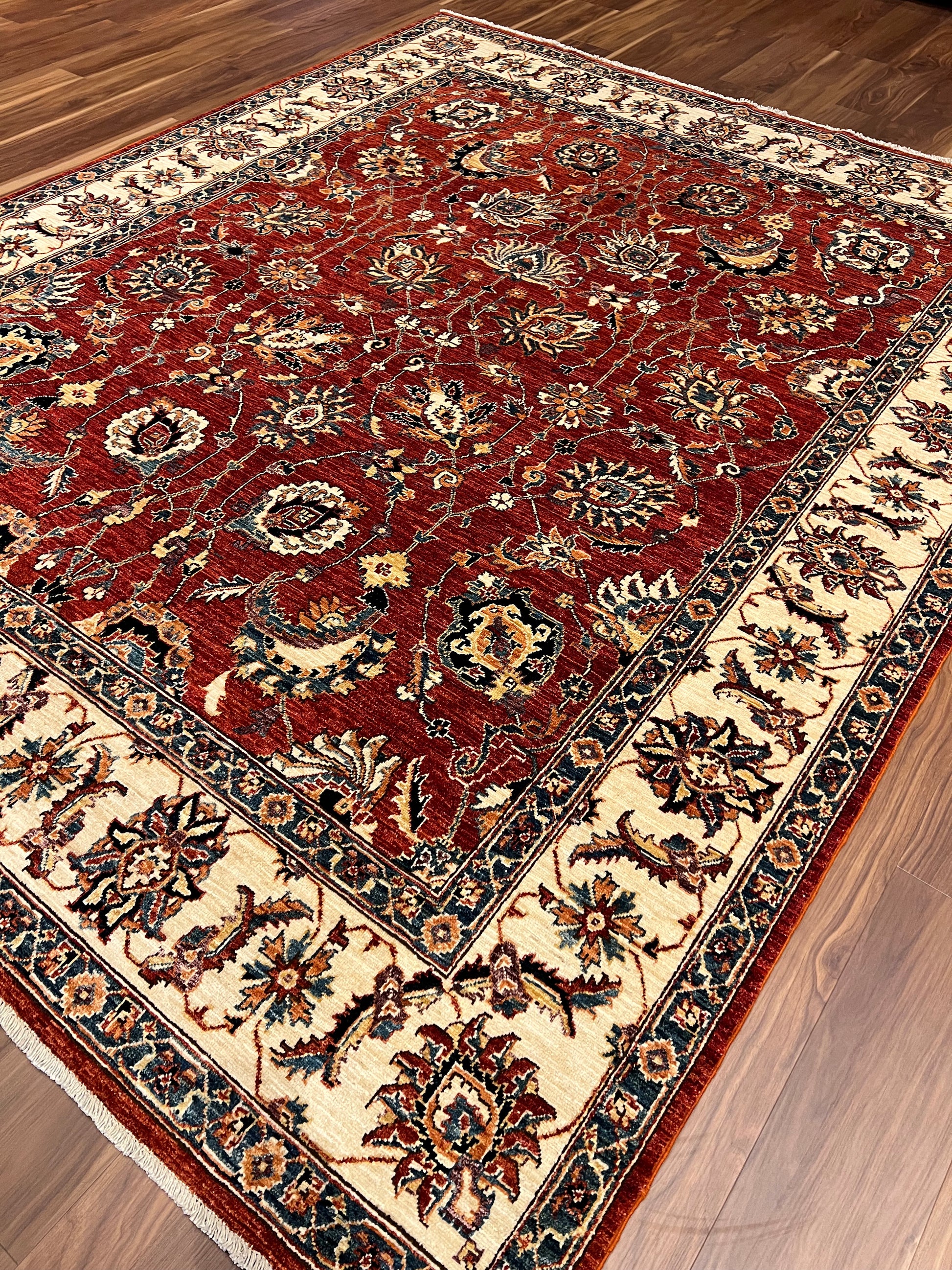 This distinguished Serapi rug boasts a traditional design, featuring a rich red field complemented by an intricate navy blue and gold medallion and corner patterns, accented with touches of beige. It's crafted from high-quality wool, offering both luxury and durability. The elaborate border contains a succession of detailed floral motifs, creating an elegant framework. Perfect for adding a touch of timeless sophistication to any room.