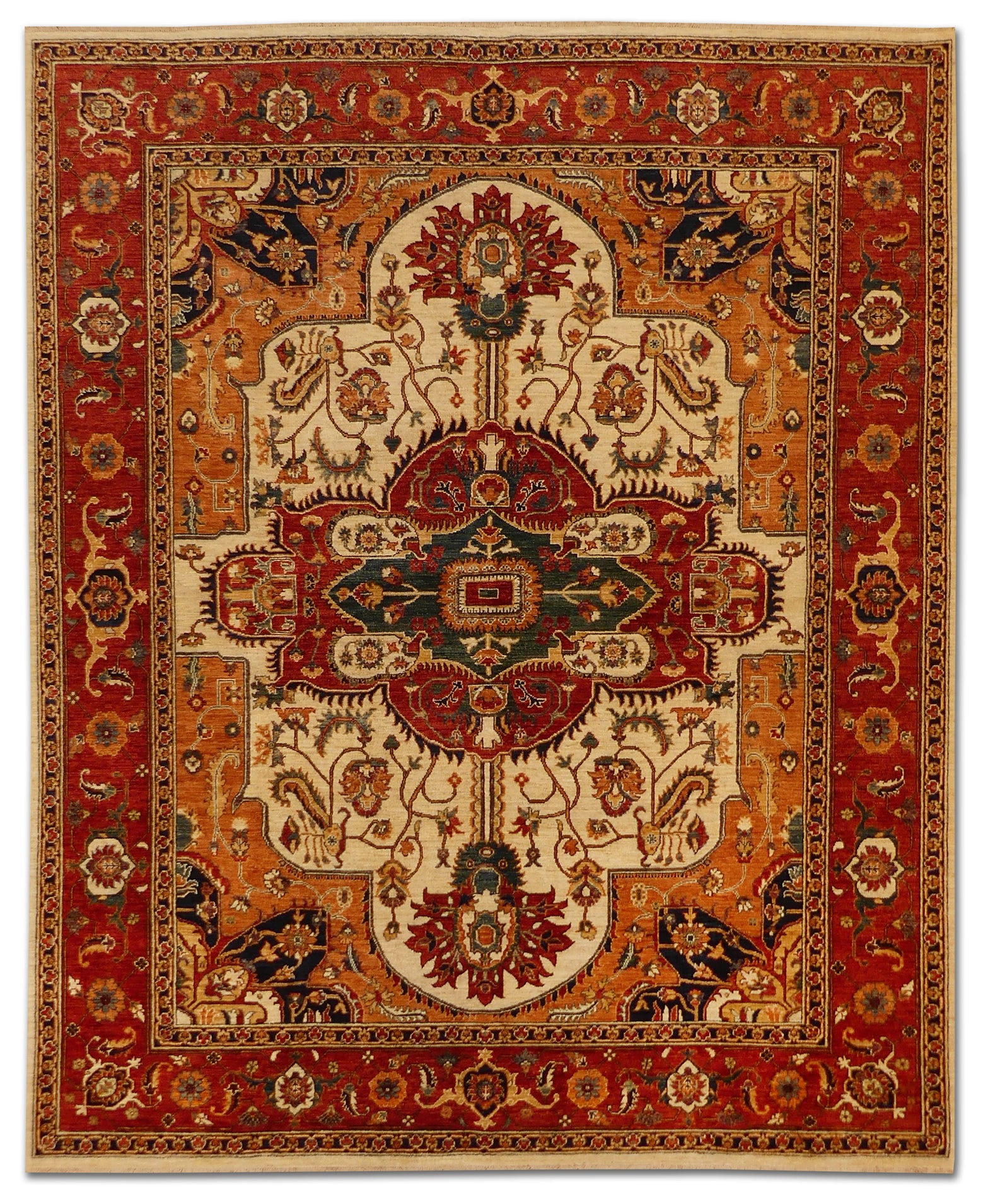 This exquisitely crafted Serapi rug showcases a traditional Persian design rich in history and elegance. The centerpiece is a striking medallion surrounded by intricate floral motifs, set against a warm beige field. Bold borders with repeating patterns frame the central design, encapsulating the artistry. Made from quality wool, this rug combines durability with luxurious texture, perfectly suited for both formal and casual interiors. The harmonious blend of earthy and vibrant colors will complement a myriad of home decors.